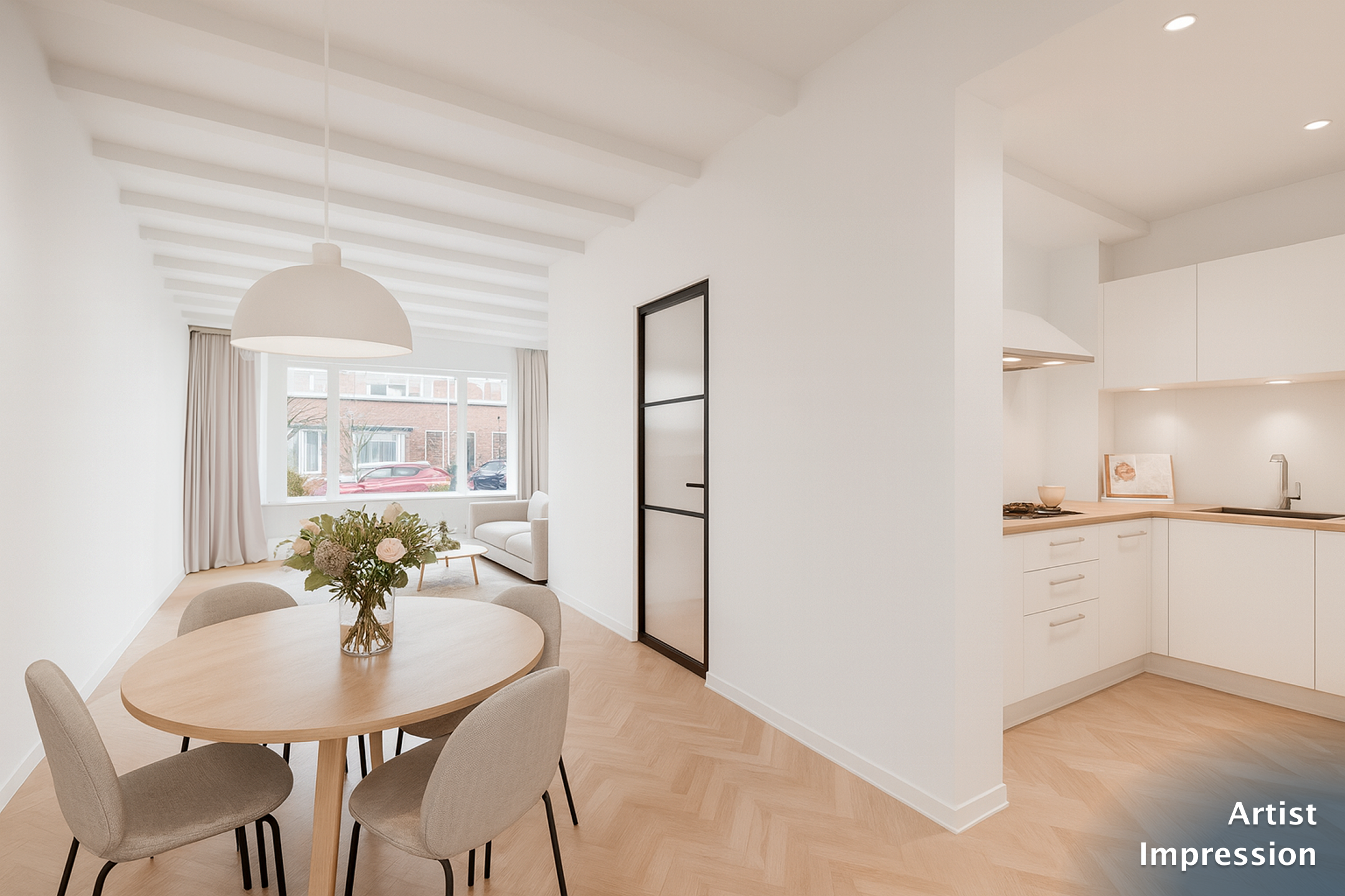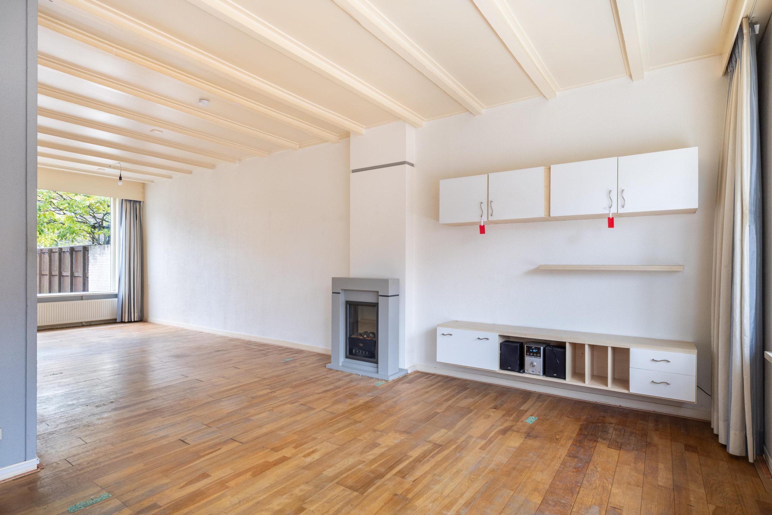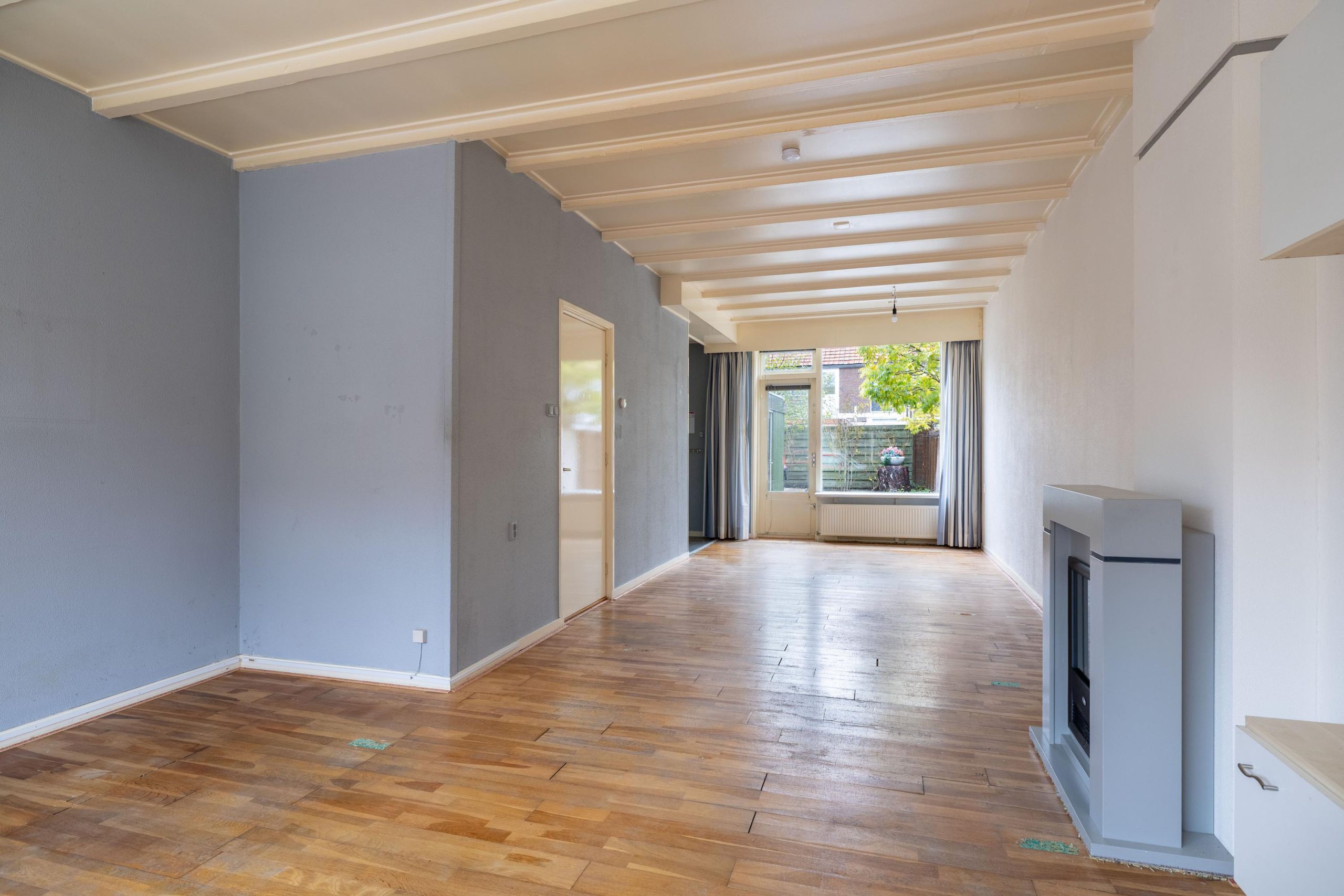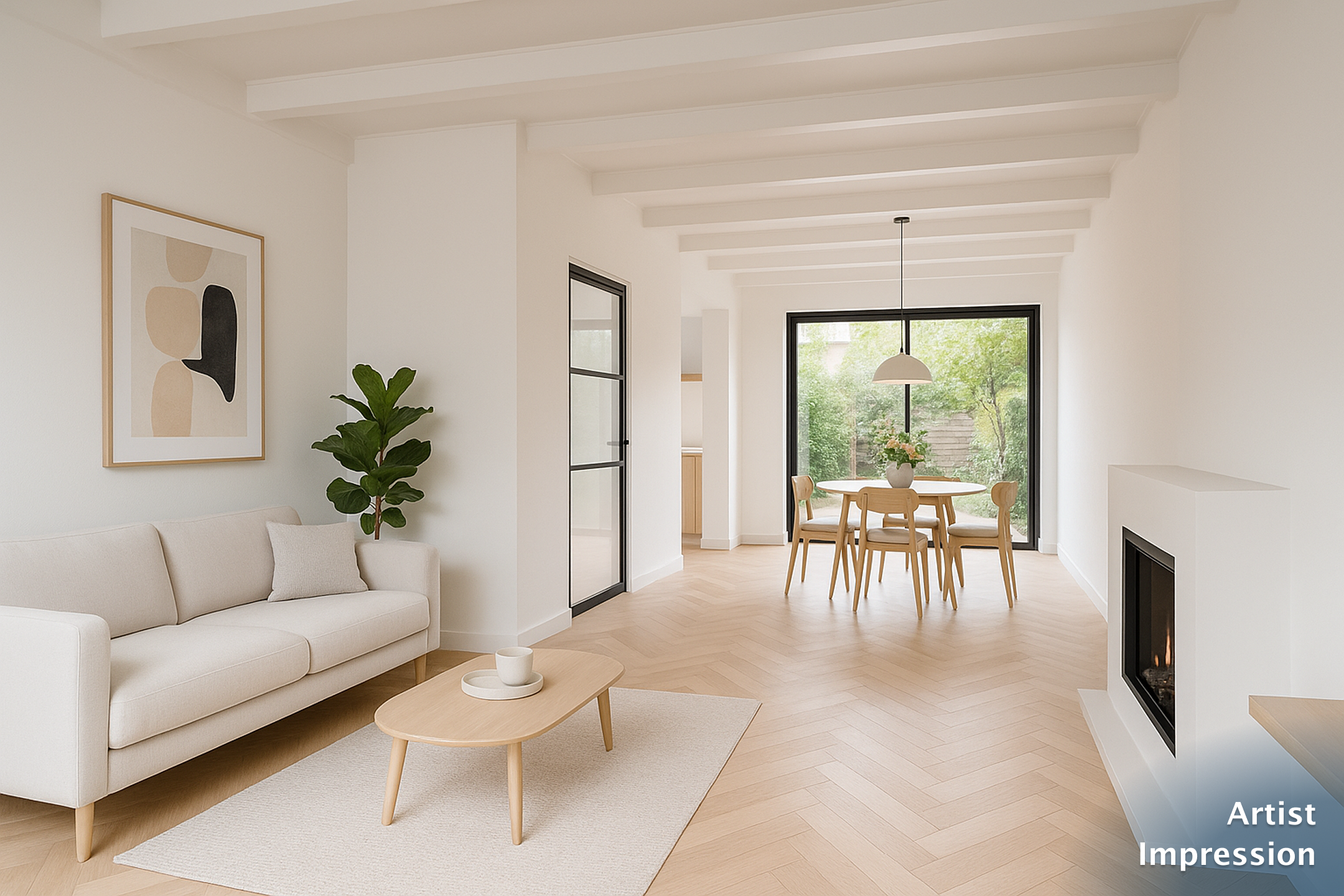 De woonkamer voelt warm en uitnodigend aan, met een sfeervolle elektrische haard als blikvanger. De karakteristieke erker laat het daglicht rijkelijk binnenstromen; dankzij het dubbele glas zit je hier comfortabel. De houten elementen geven het geheel een prettige, huiselijke uitstraling. Door de open verbinding met de keuken loopt de ruimte prettig in elkaar over — een fijne plek voor zowel dagelijkse momenten als lange avonden tafelen.