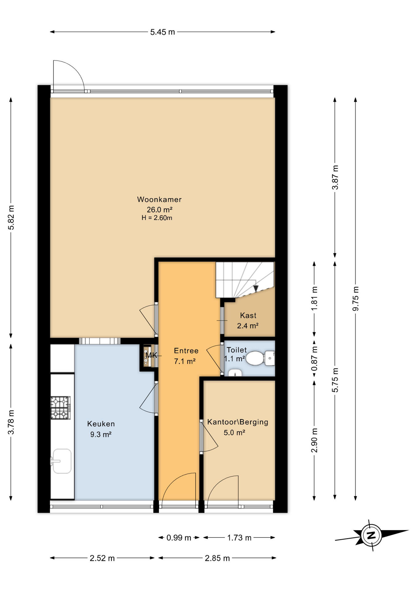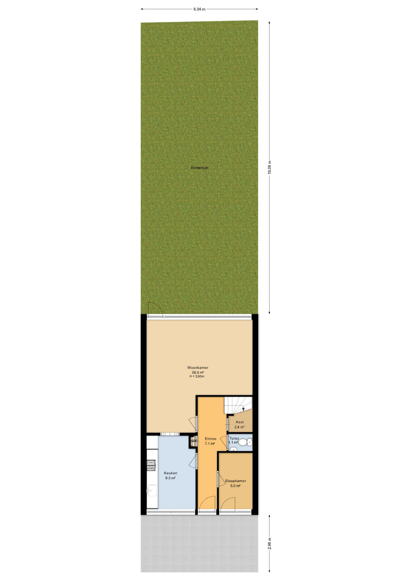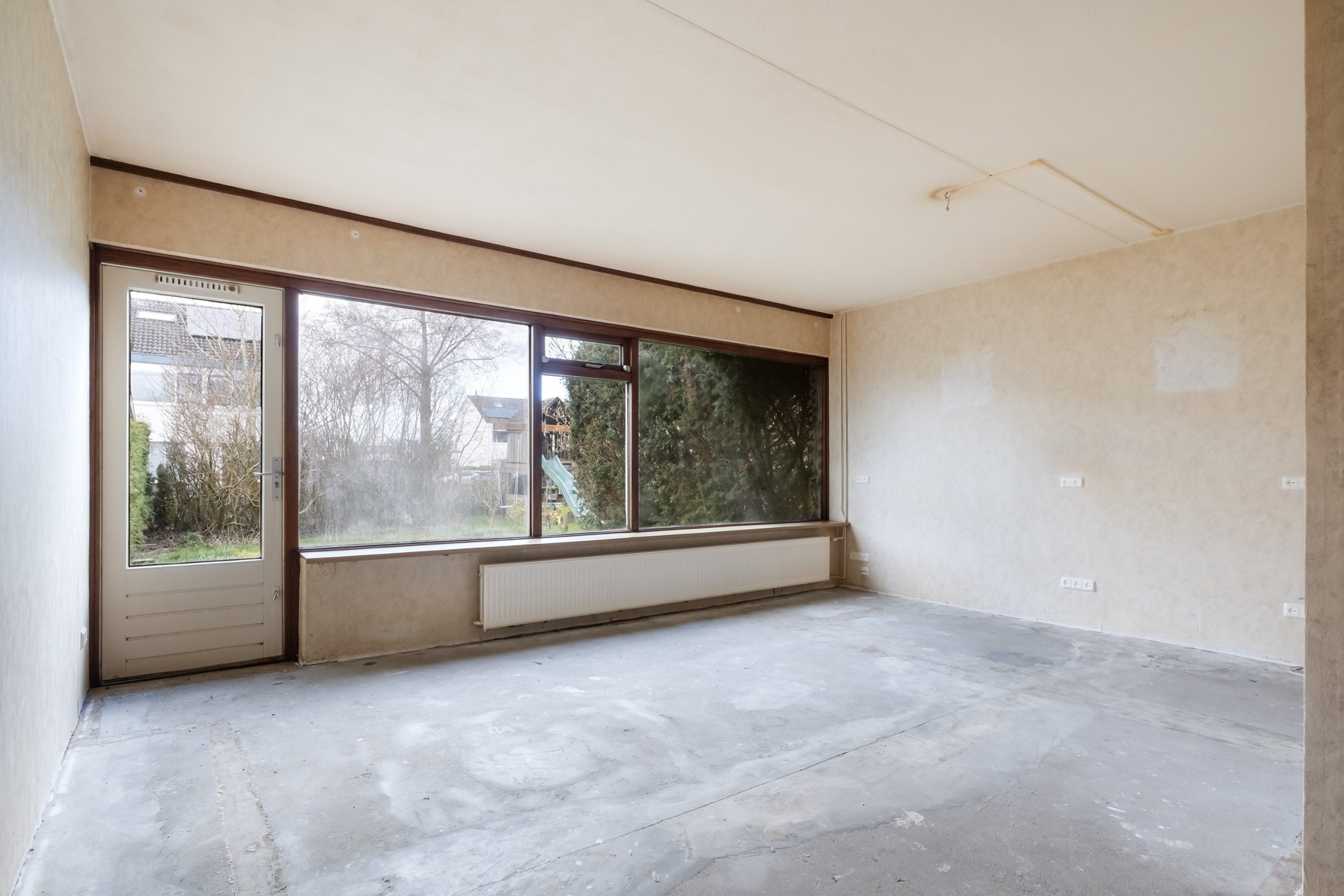 Bij binnenkomst valt direct de praktische indeling op. In de hal bevinden zich het toilet, de meterkast, een handige voorraad-/opbergkast en de trap naar boven. Aan de rechterzijde ligt een extra kamer die zich uitstekend leent als werk- of hobbyruimte, maar ook ideaal is te gebruiken als bijvoorbeeld een inpandige berging. Aan de linkerzijde vind je de gesloten keuken, die volop kansen biedt om naar eigen smaak te moderniseren of eventueel te openen richting het woongedeelte. De woonkamer ligt aan de tuinzijde en is dankzij de grote ramen heerlijk licht, met een prettig uitzicht op de groene achtertuin. Hier ervaar je rust, privacy en een fijne verbinding met buiten.