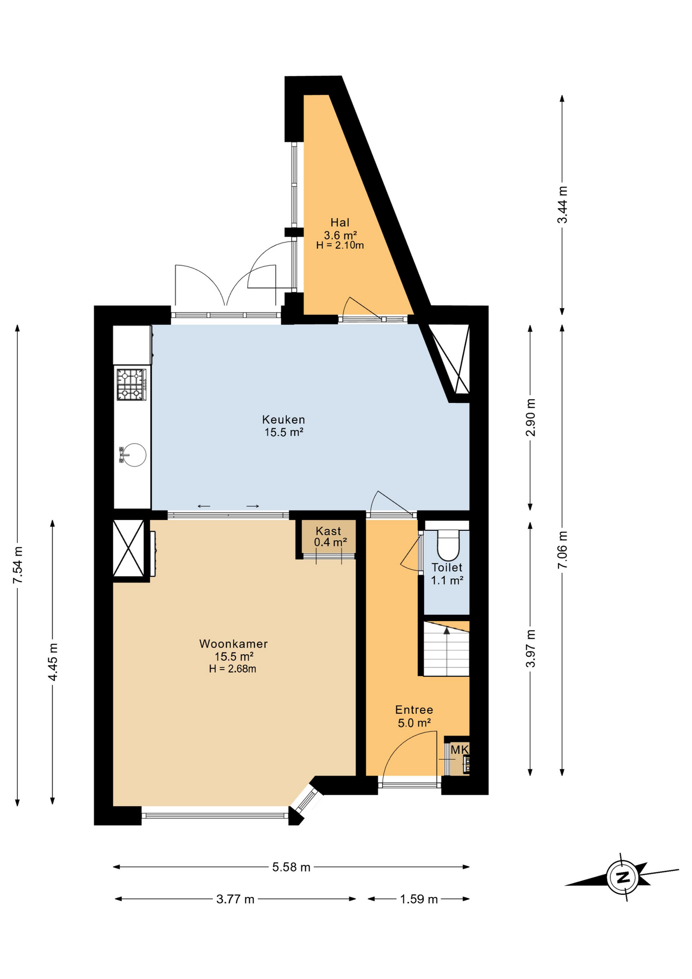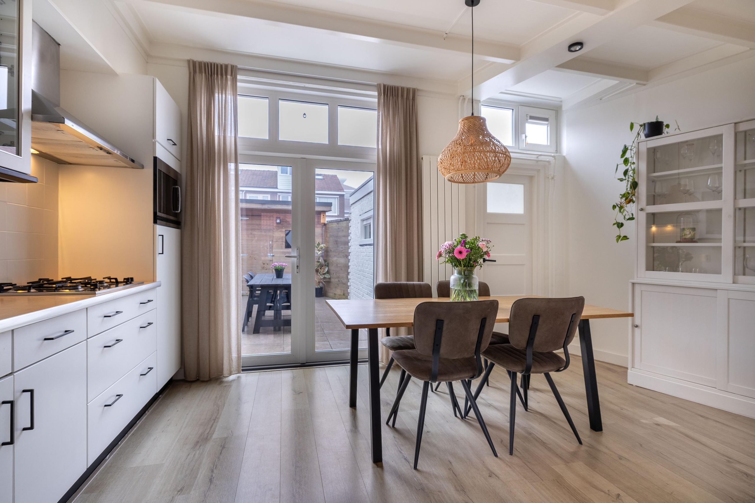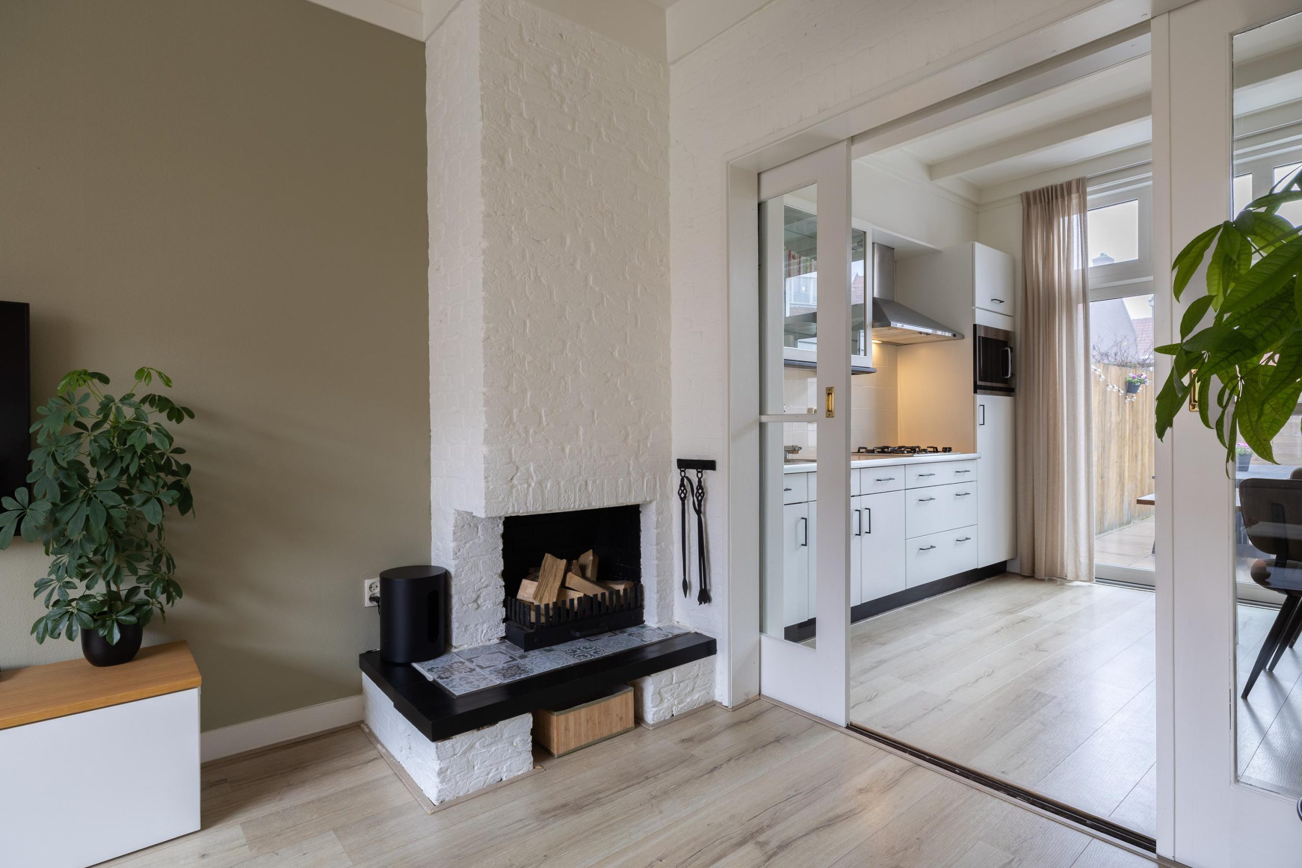Achter de nette voortuin en de charmante jaren ’30 gevel kom je binnen in de hal met hoog plafond, meterkast, trapkast en het in 2024 vernieuwde toilet. Vanuit hier loop je door naar de leefruimtes, die met elkaar verbonden zijn maar toch elk hun eigen sfeer hebben. We stappen eerst de keuken binnen. Deze royale kamer heeft een karakteristiek balkenplafond en vormt het bruisende middelpunt van de woning, waar heerlijk getafeld kan worden met zicht op de tuin door de openslaande deuren. Via de ensuite deuren stap je de sfeervolle woonkamer in, eveneens met balkenplafond en compleet met lichte erker, inbouwkast, inbouwspotjes en de voormalige houtkachel die nog als stijlaccent aanwezig is (niet meer bruikbaar). Achter de keuken ligt de praktische bijkeuken met directe toegang tot de tuin. Binnen voelt alles licht, warm en toegankelijk, precies zoals een jaren ’30 huis hoort te zijn.