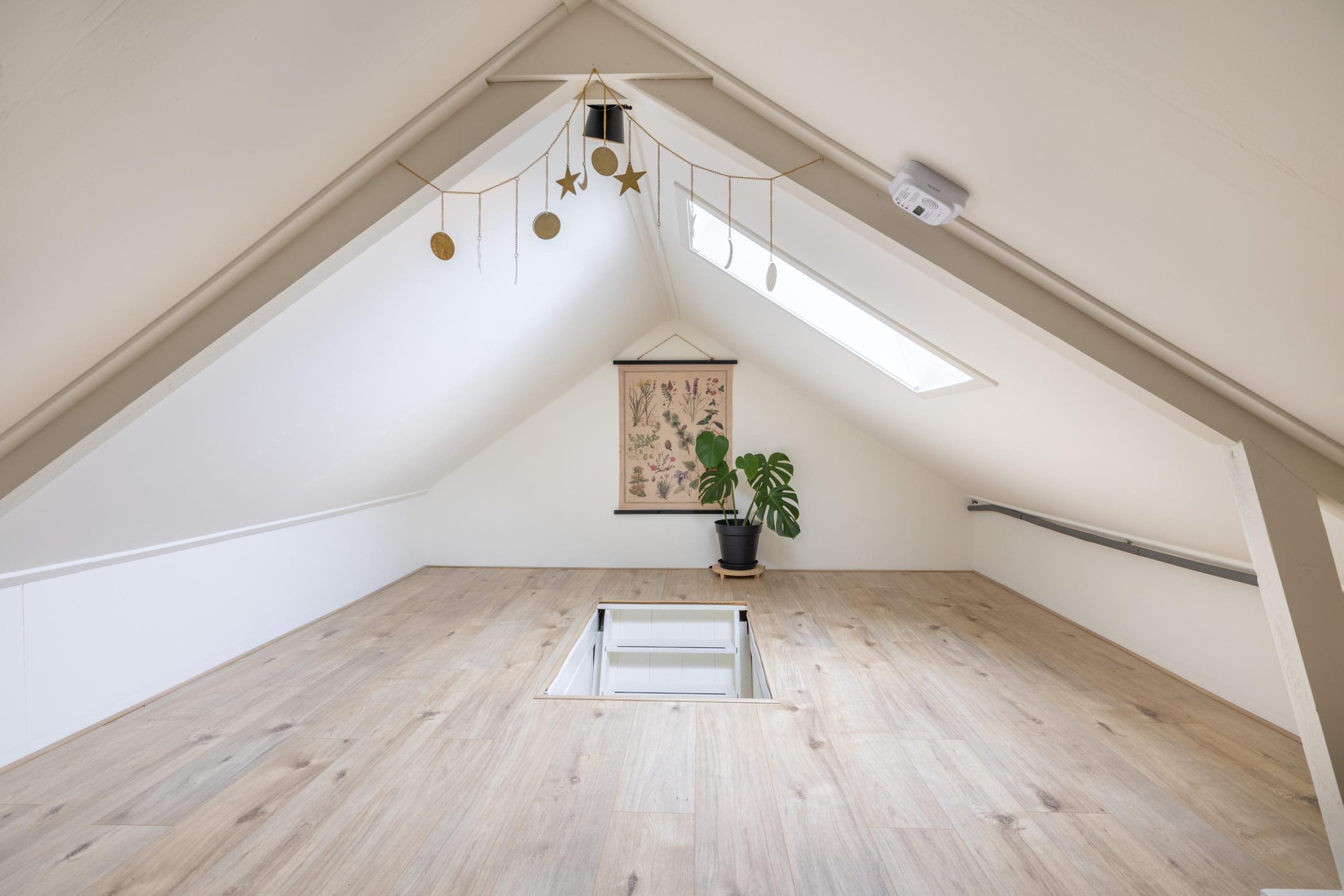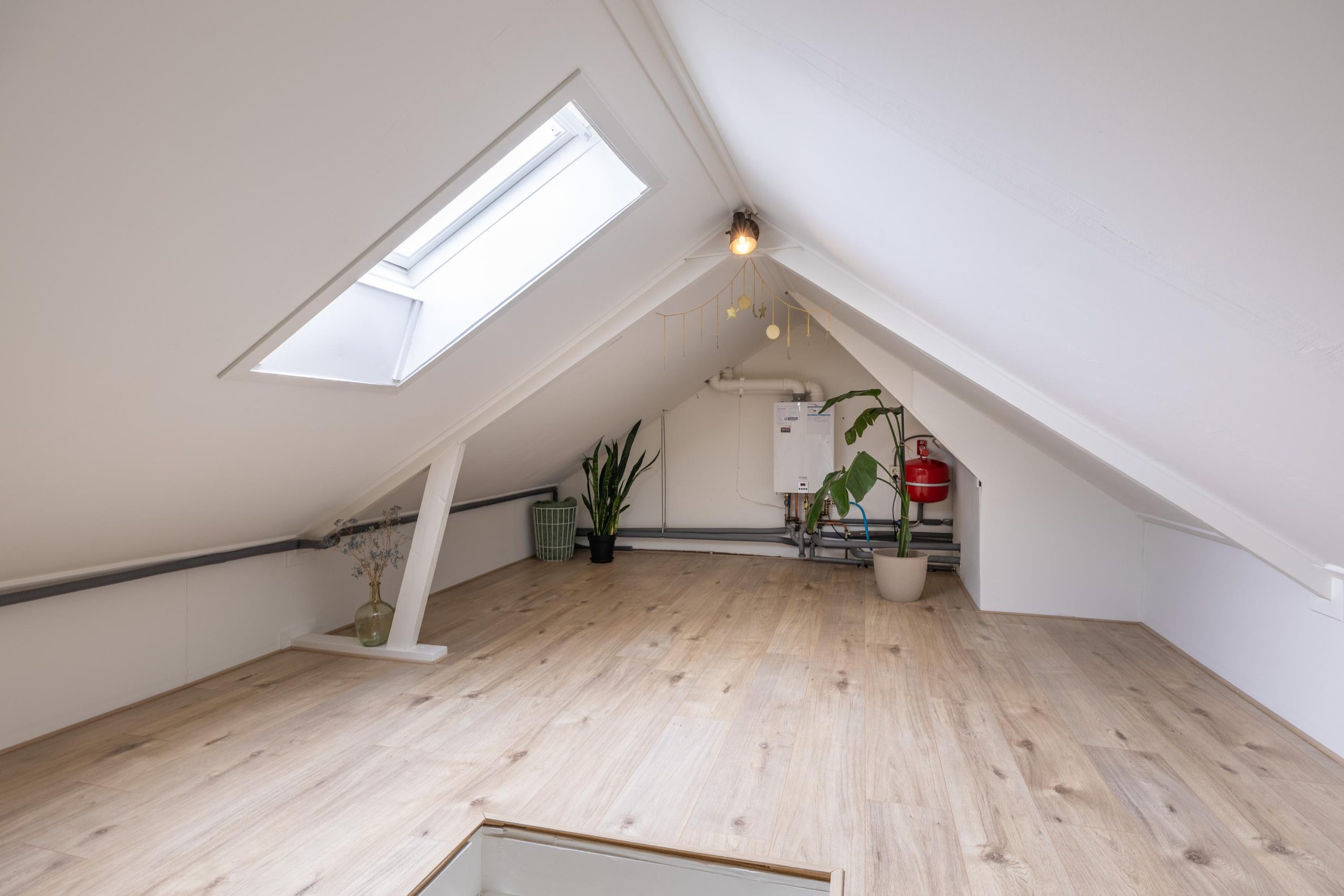 De opgeknapte zolder vormt een fijne bonusruimte voor hobby’s, werk of opslag, het dakraam zorgt voor daglicht en hier vind je tevens de C.V.-ketel (Remeha Avanta 28, 2017, eigendom).