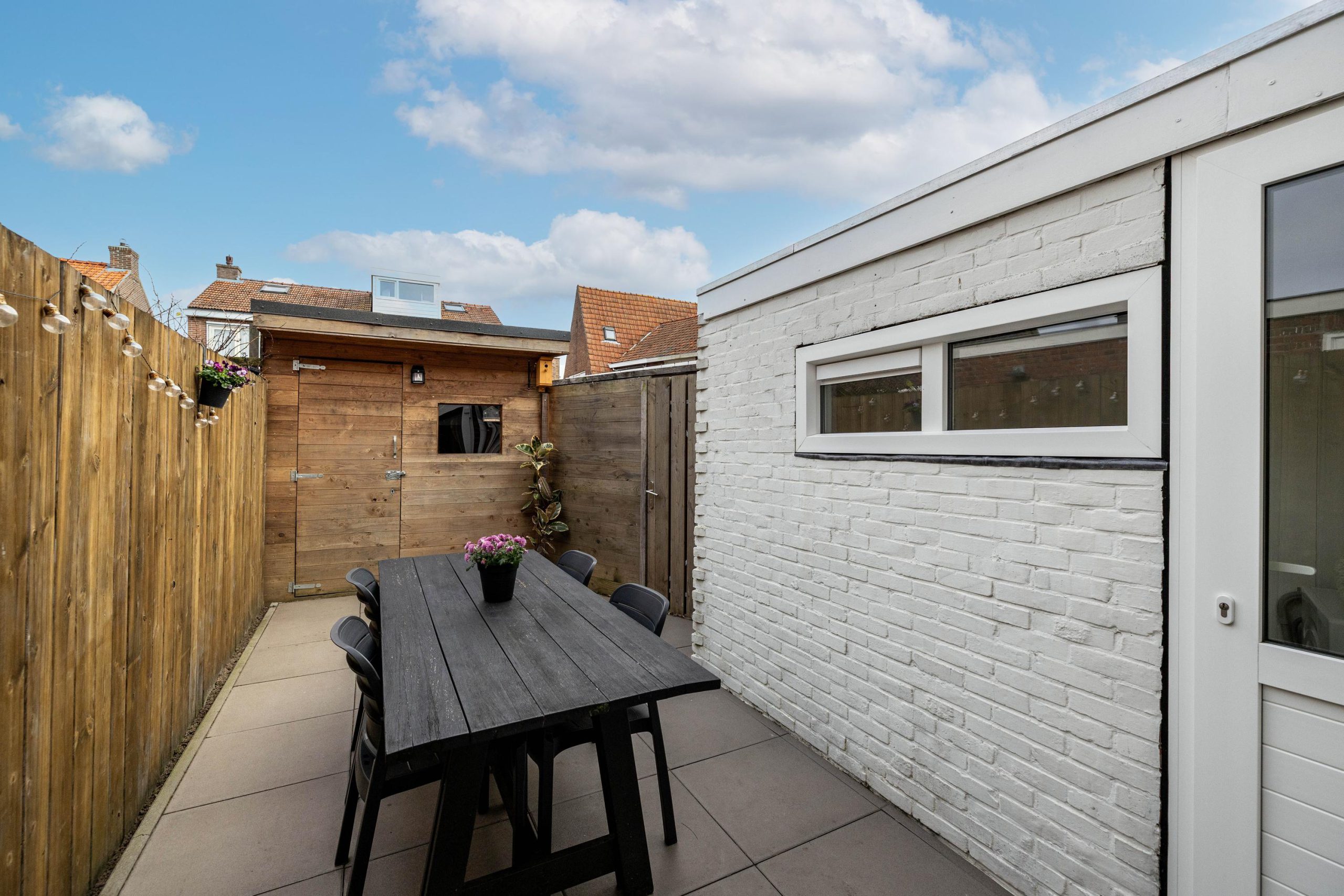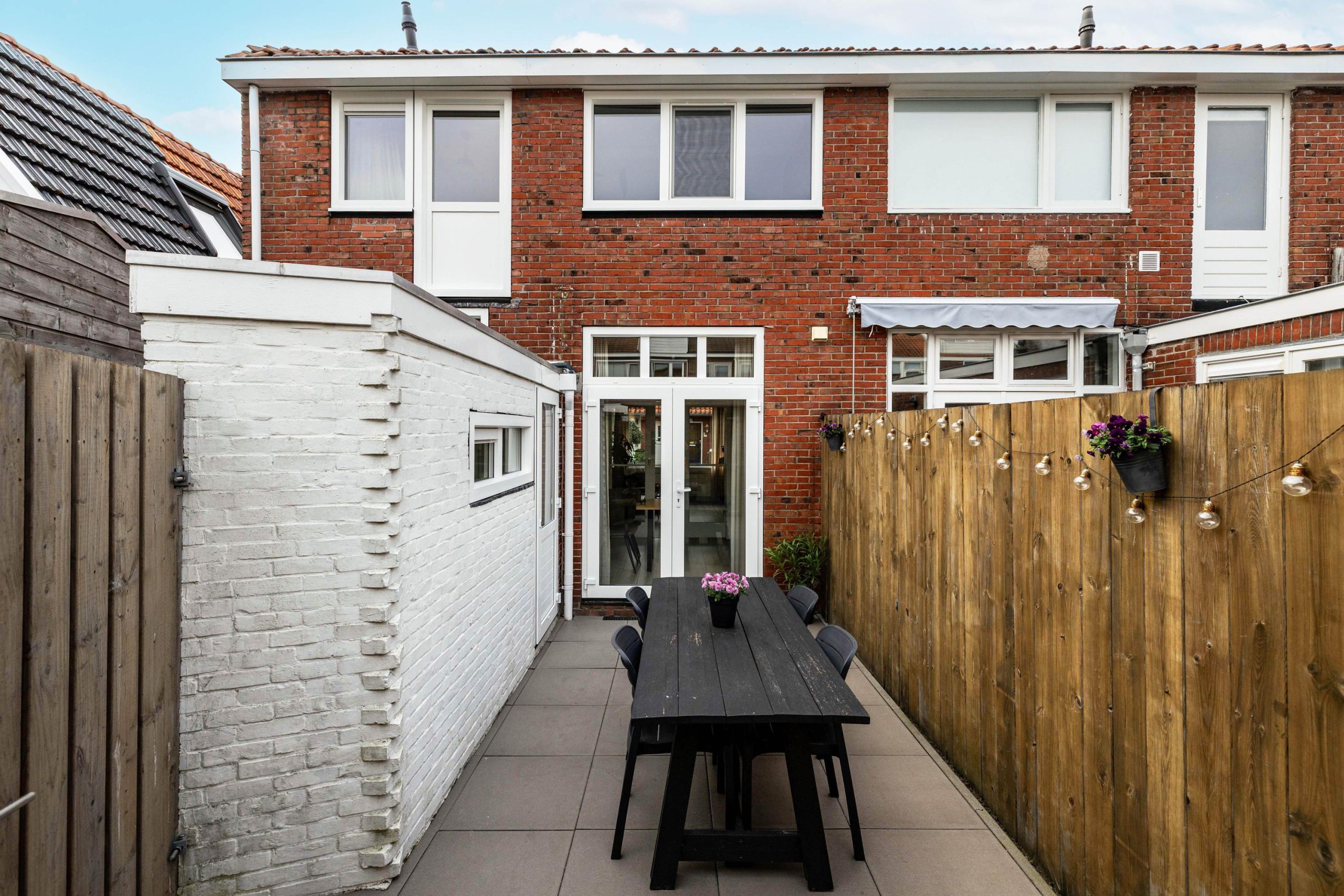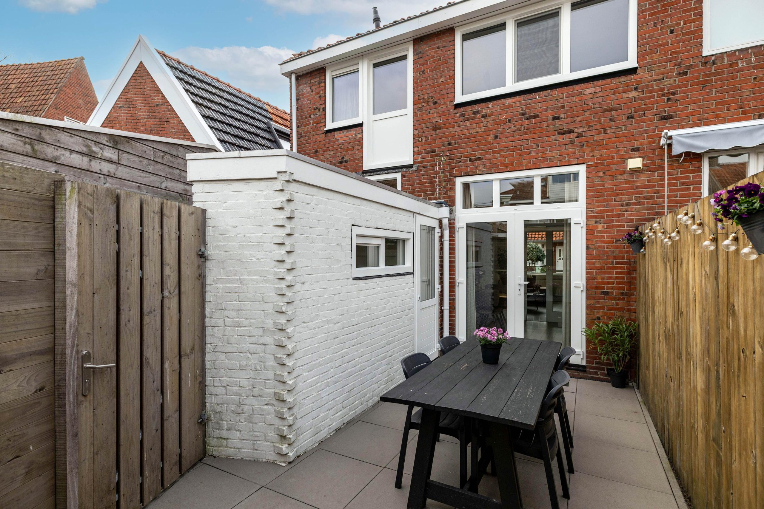 De onderhoudsvriendelijke achtertuin is strak en verzorgd, met een nette houten berging en een achterom. Via de openslaande deuren loopt de tuin mooi door vanuit de leefruimte. In de steeg kunnen de containers netjes uit het zicht worden geplaatst.