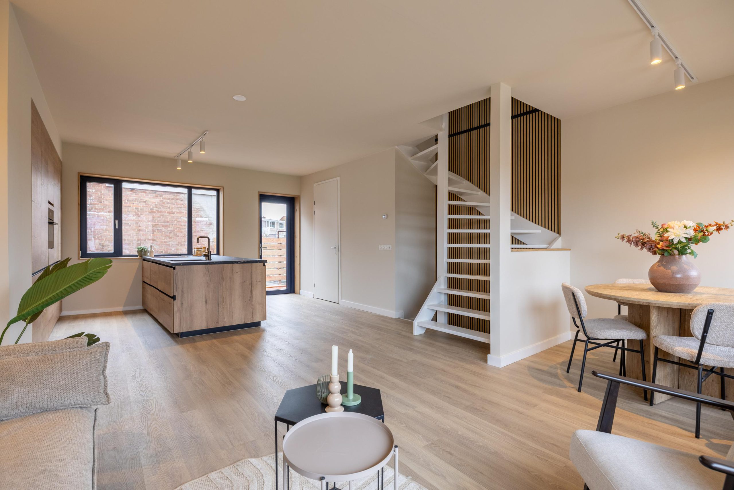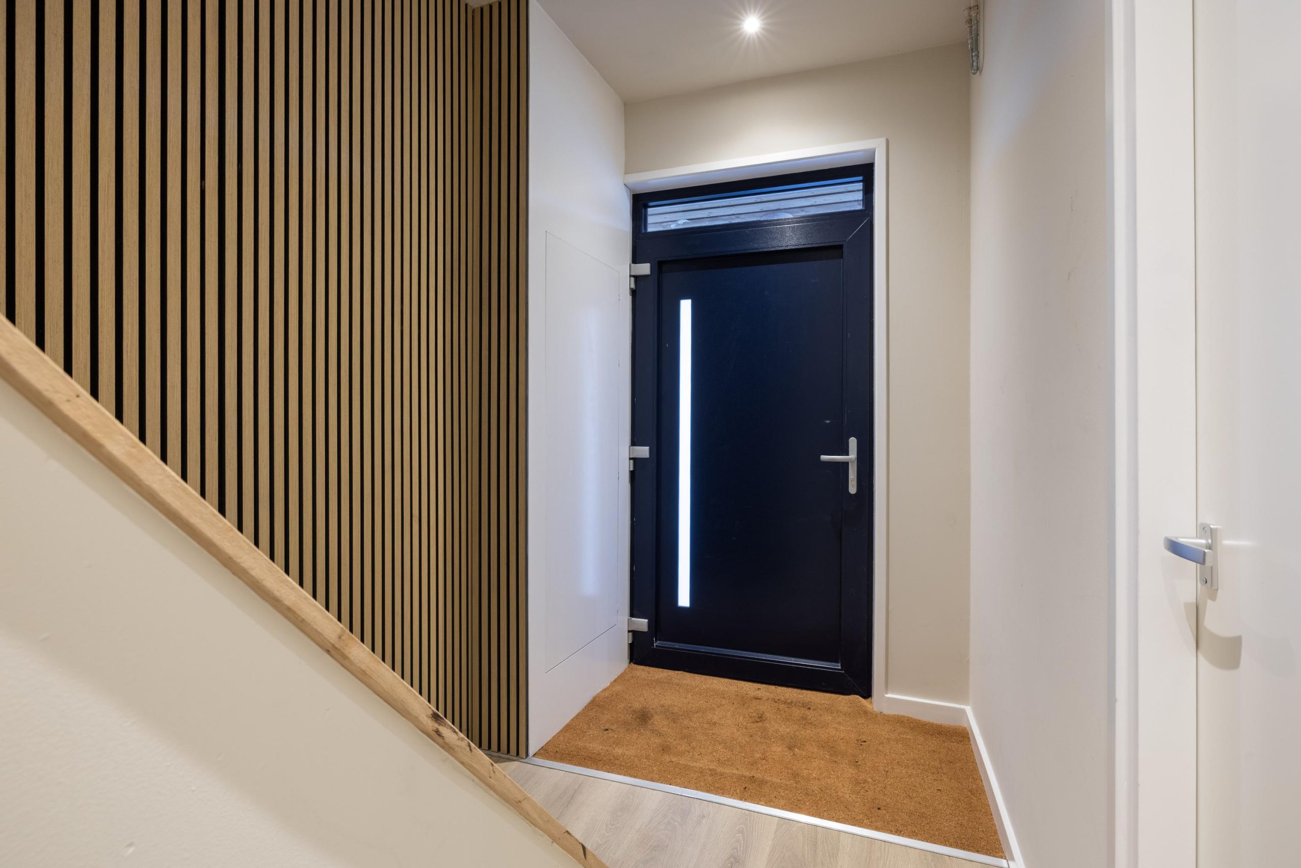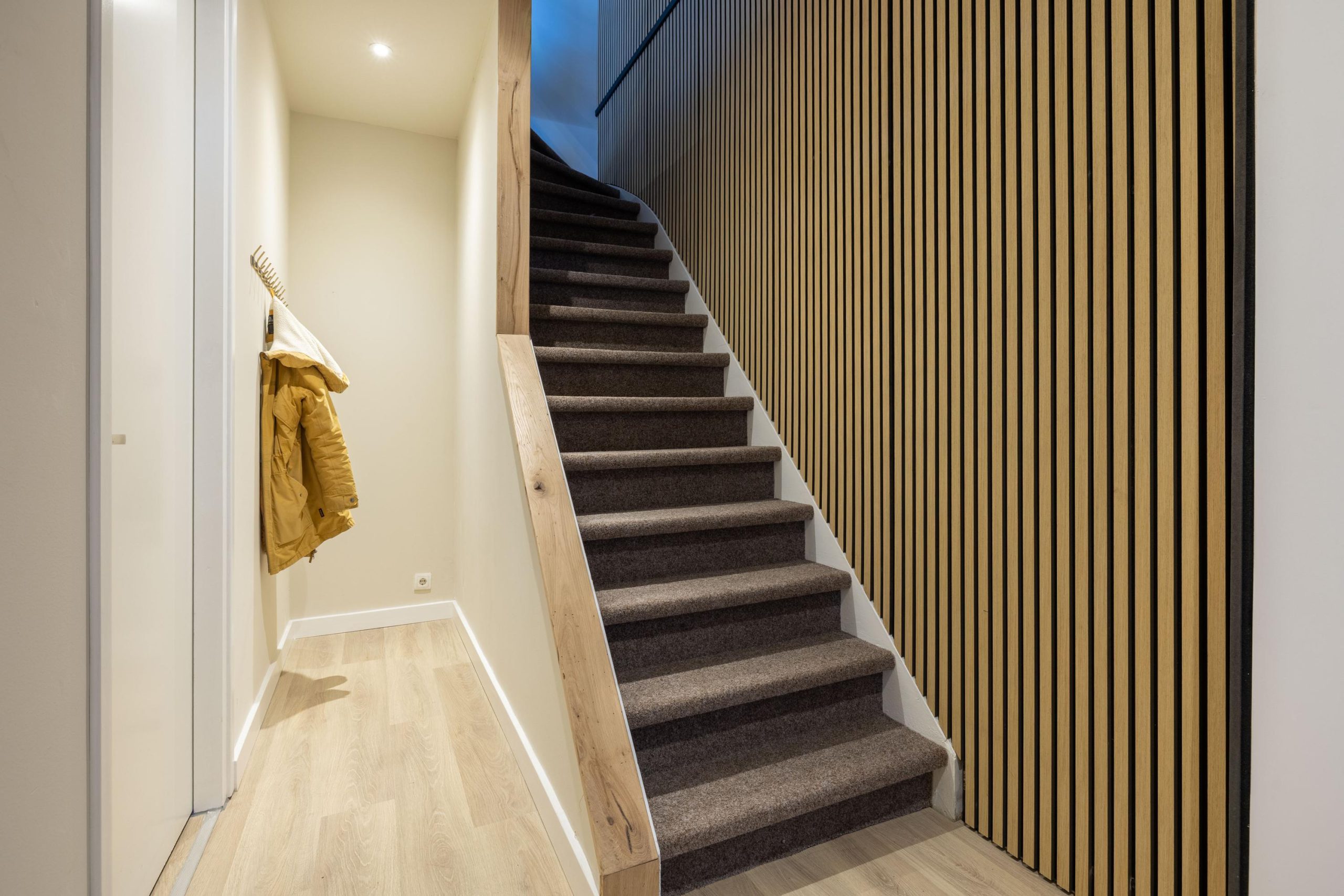 We komen aan via de voortuin en stappen binnen in de hal. Hier valt direct de verzorgde afwerking op, met als blikvanger de wand bij de trapopgang. Deze wand loopt als een rode draad door de woning en verbindt alle verdiepingen op een rustige en stijlvolle manier. De meterkast is netjes uitgevoerd en vanuit de hal ontvouwt het huis zich verder.