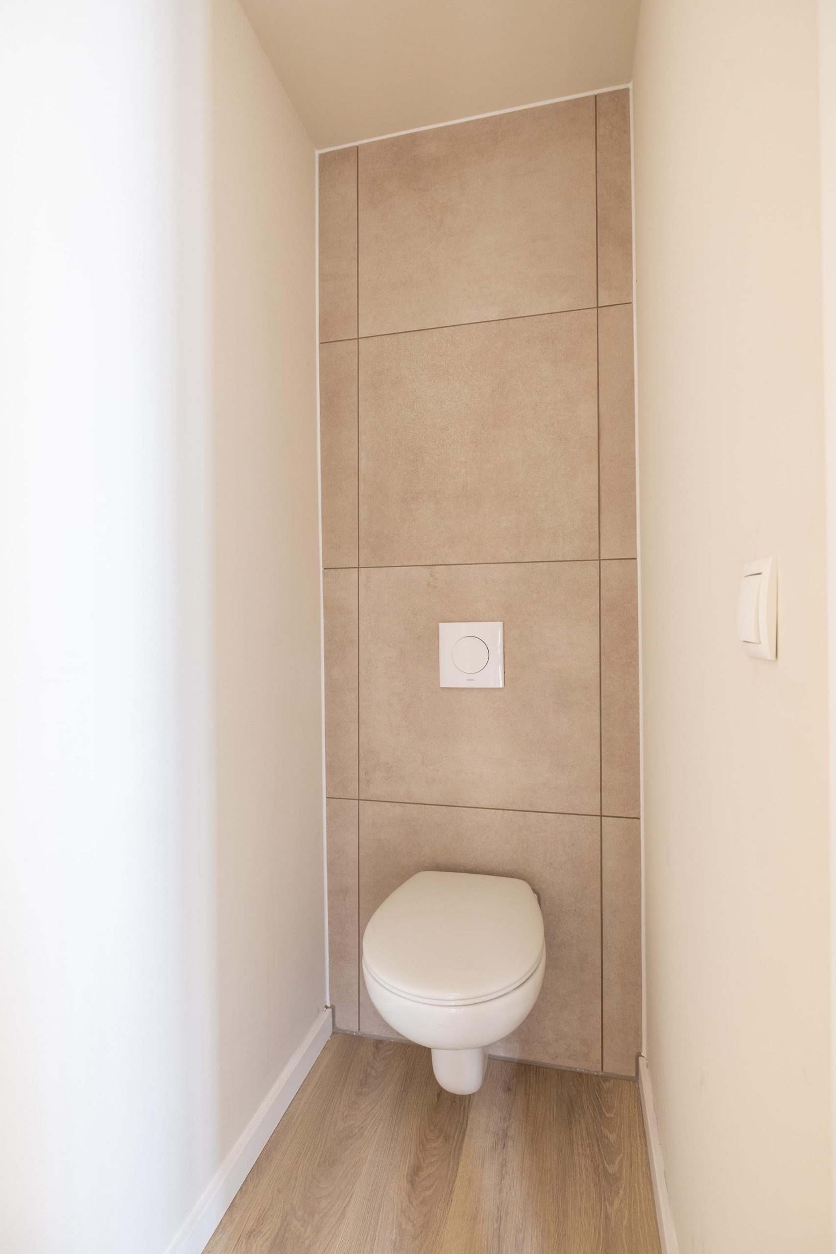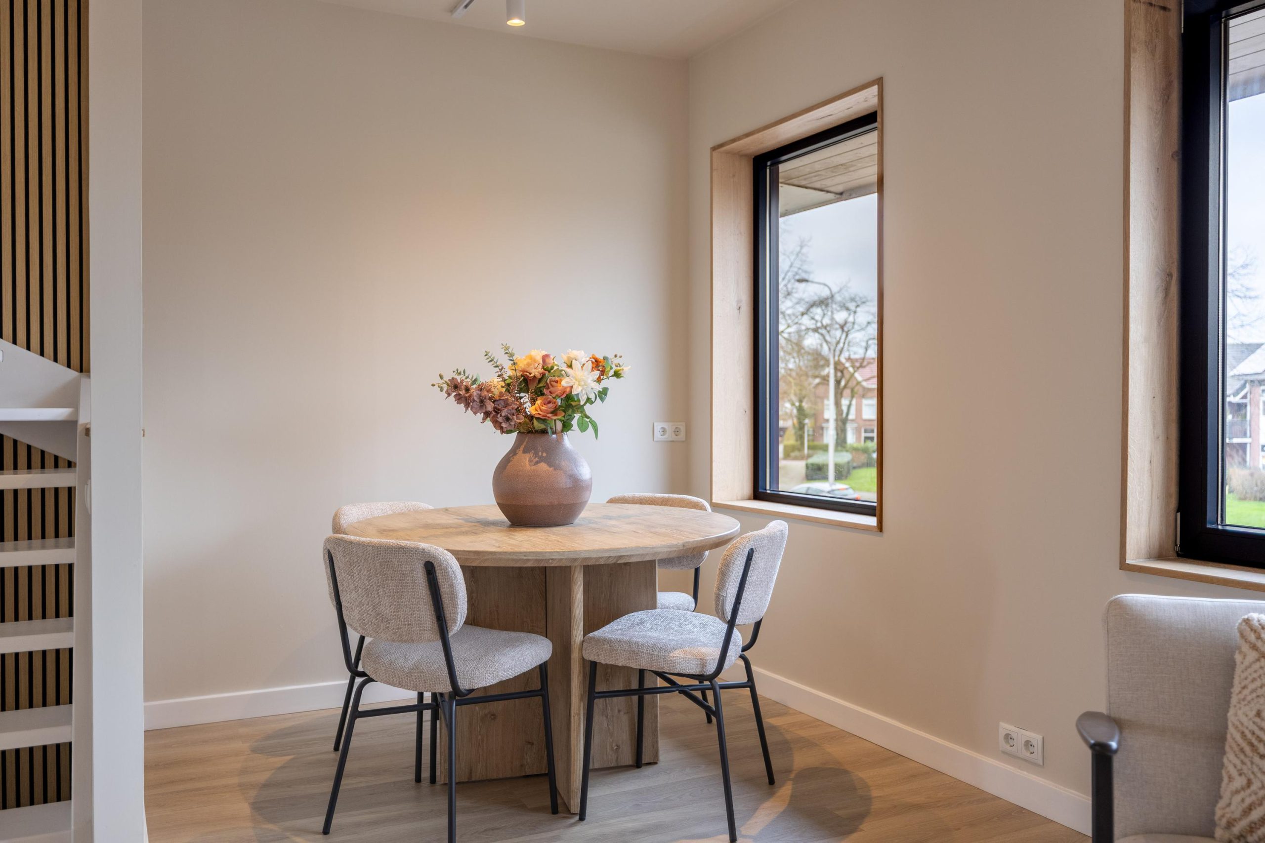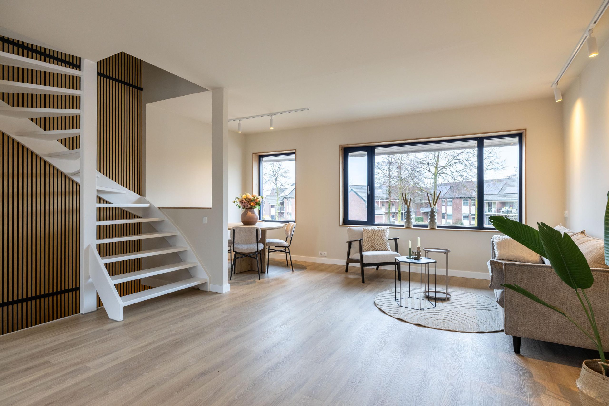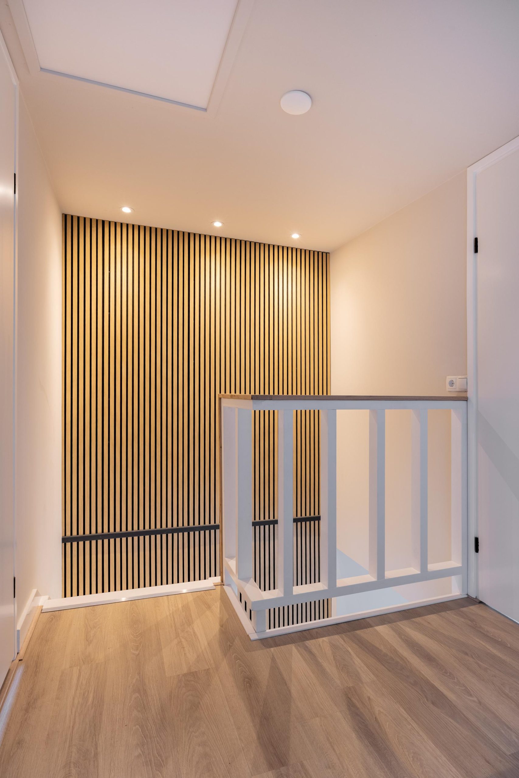 We komen aan via de voortuin en stappen binnen in de hal. Hier valt direct de verzorgde afwerking op, met als blikvanger de wand bij de trapopgang. Deze wand loopt als een rode draad door de woning en verbindt alle verdiepingen op een rustige en stijlvolle manier. De meterkast is netjes uitgevoerd en vanuit de hal ontvouwt het huis zich verder.
