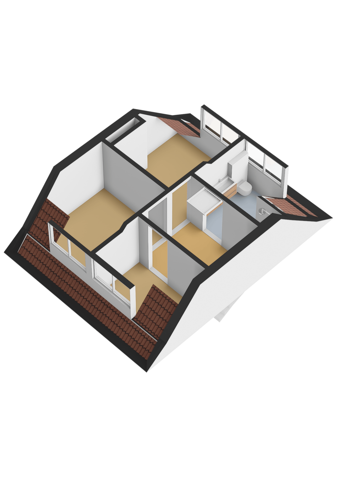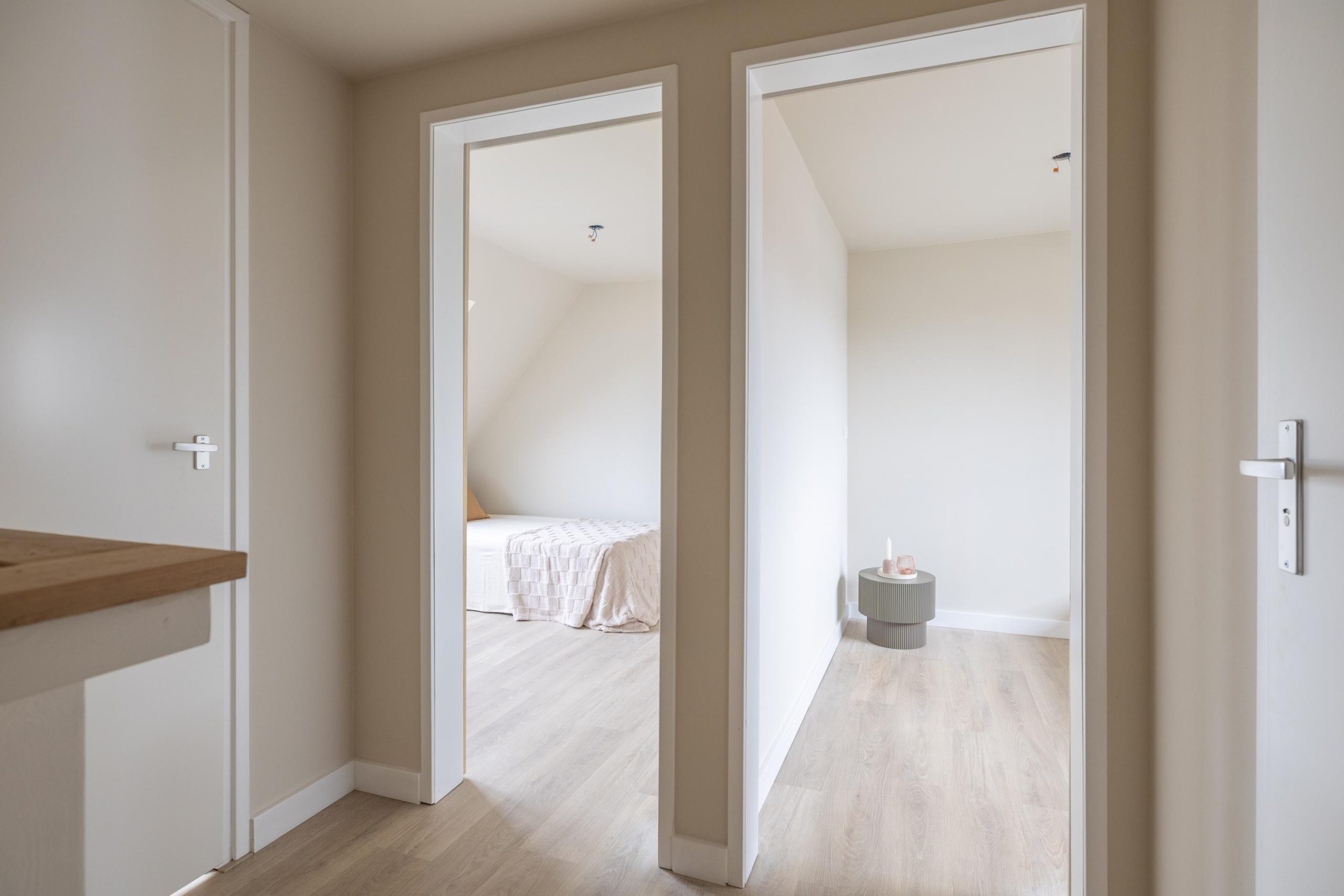 Op de tweede verdieping vinden we nog eens drie slaapkamers. Twee ruime kamers en een extra kamer die perfect is als kinderkamer of werkkamer. De moderne badkamer is strak en comfortabel uitgevoerd met een douche, toilet en een dubbel wastafelmeubel. Aangrenzend ligt de bergruimte met de cv-ketel, praktisch en netjes weggewerkt.