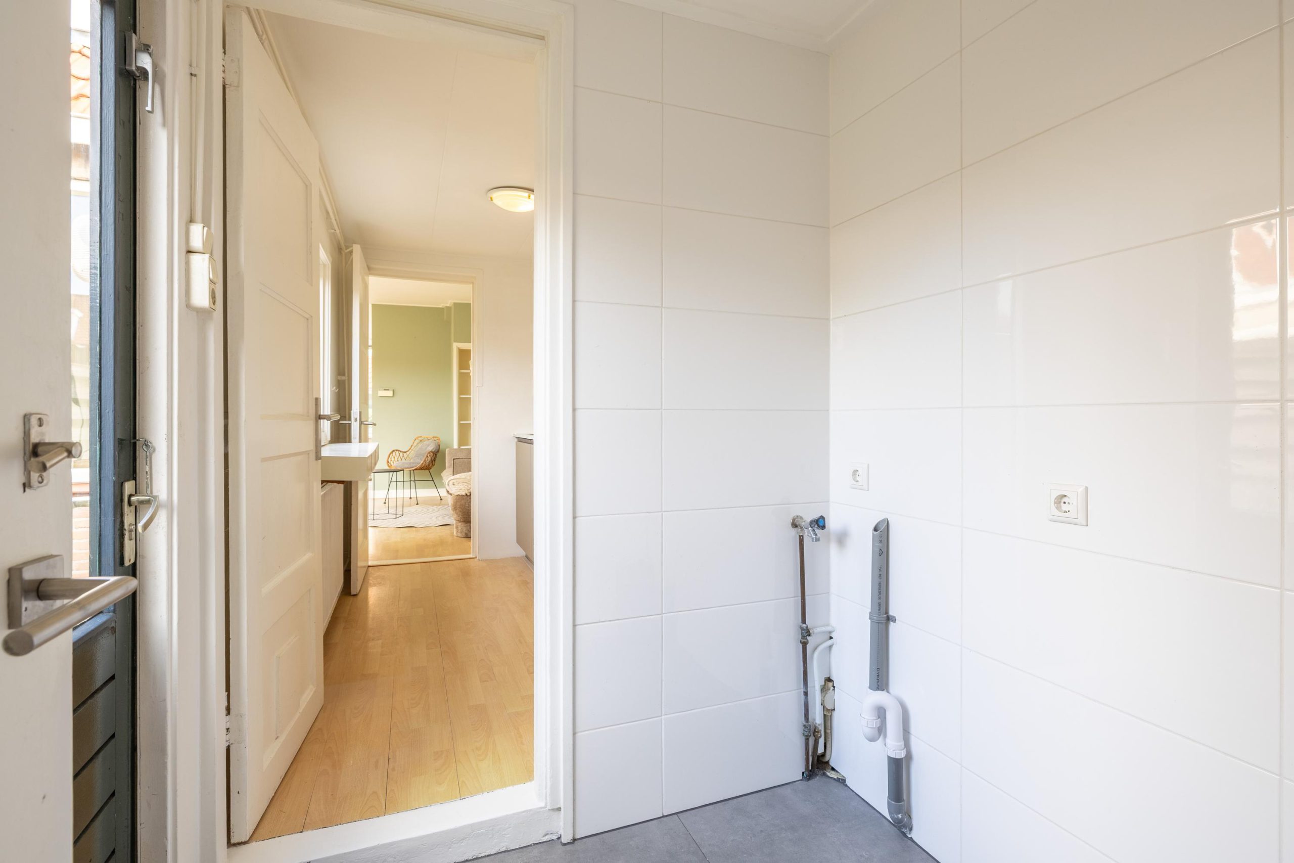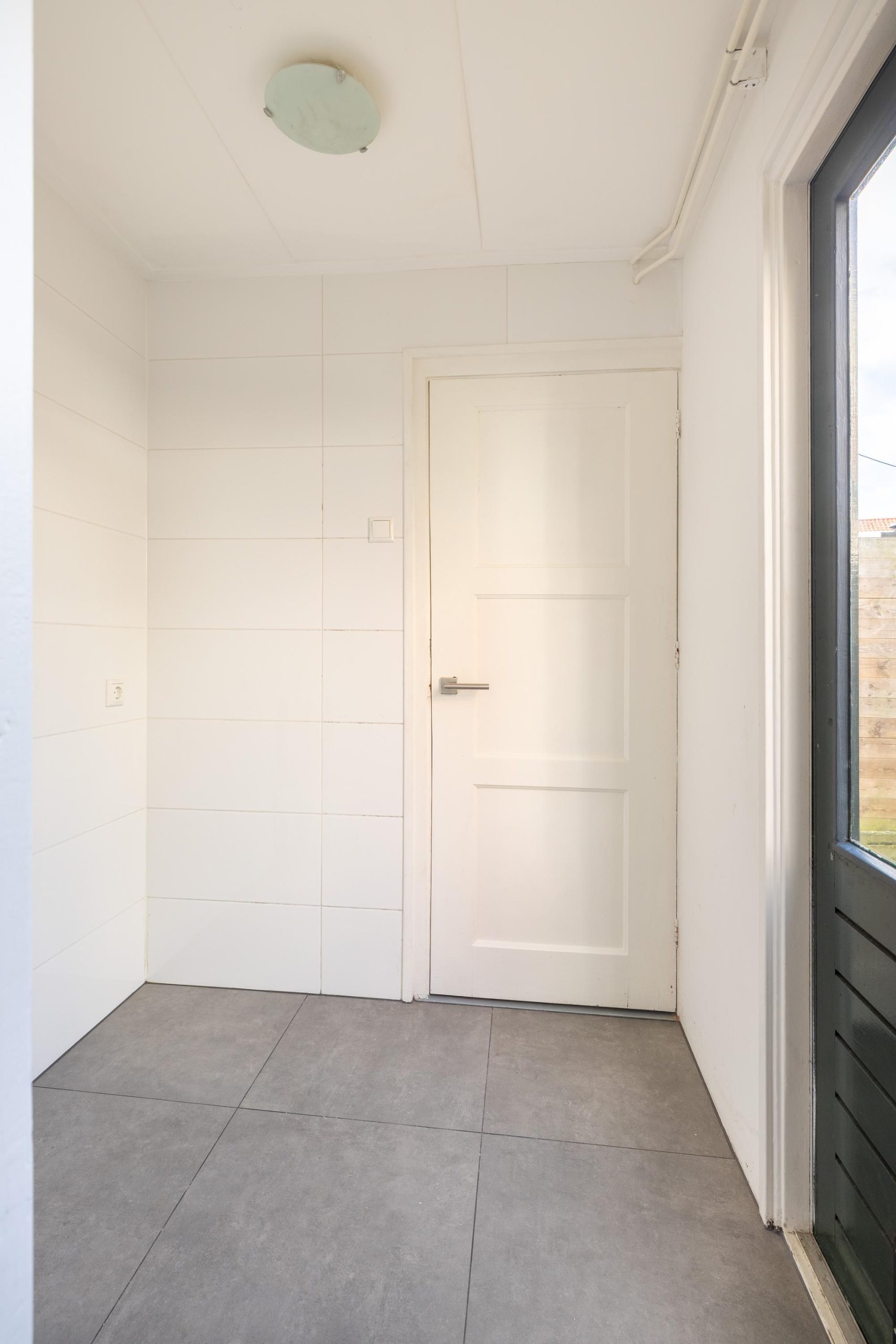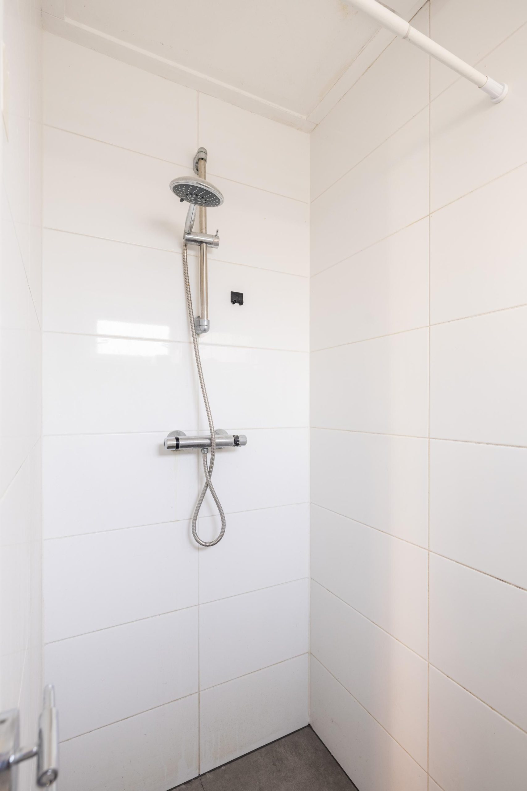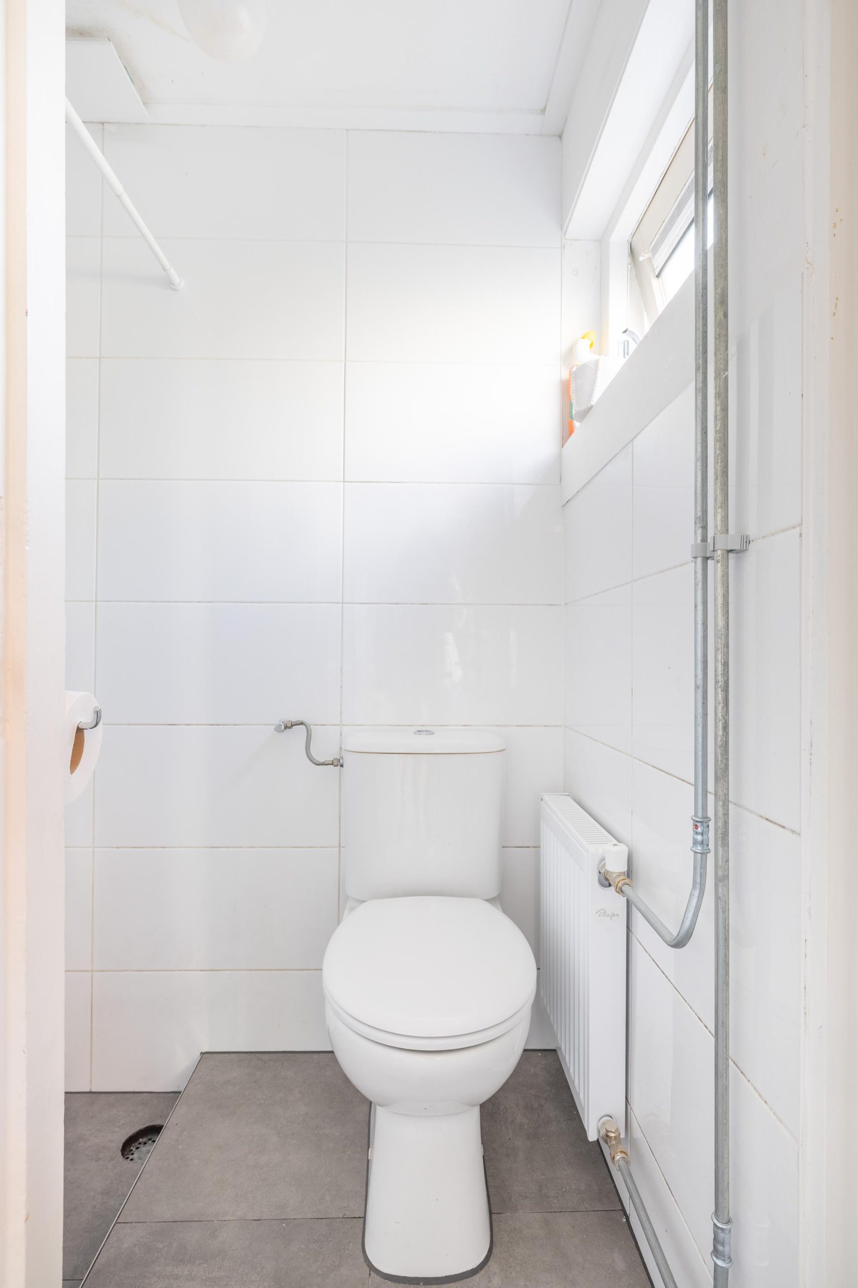 Aansluitend vind je de bijkeuken opnieuw betegeld en voorzien van aansluiting voor de wasmachine. Hier bevindt zich ook de deur naar buiten. Achterin de woning ligt een badkamer met toilet en douche, verzorgd en licht uitgevoerd.