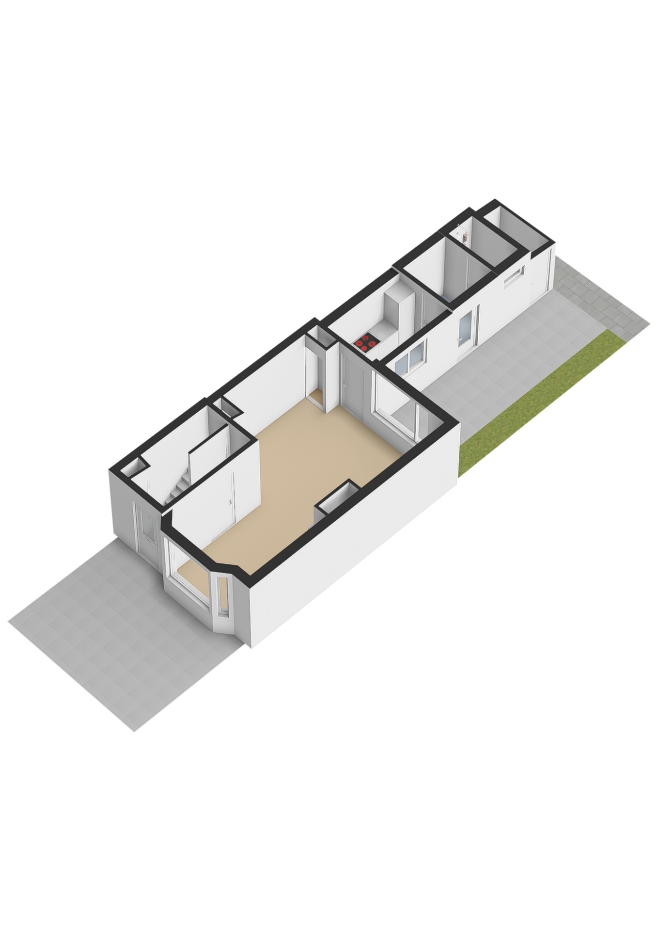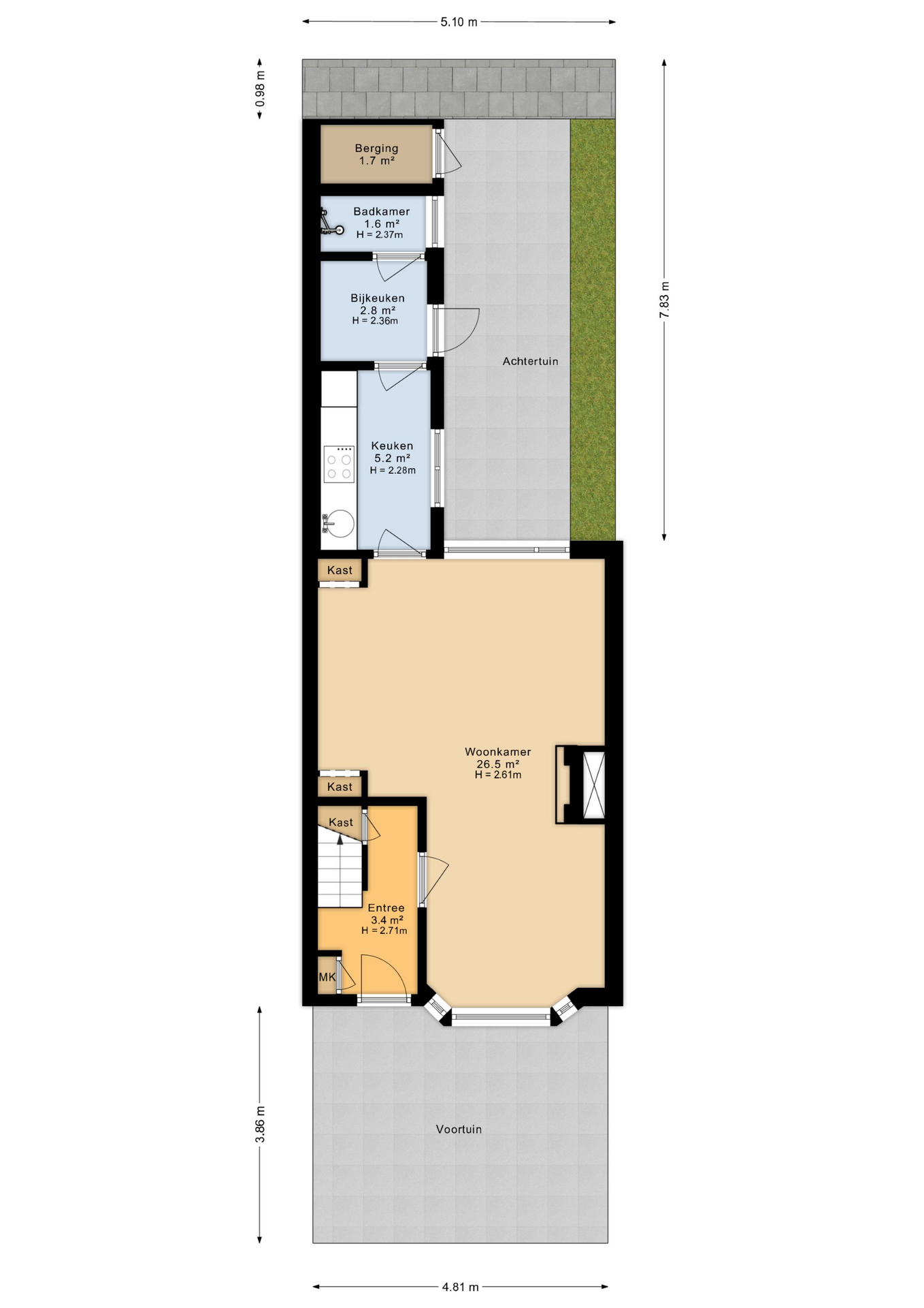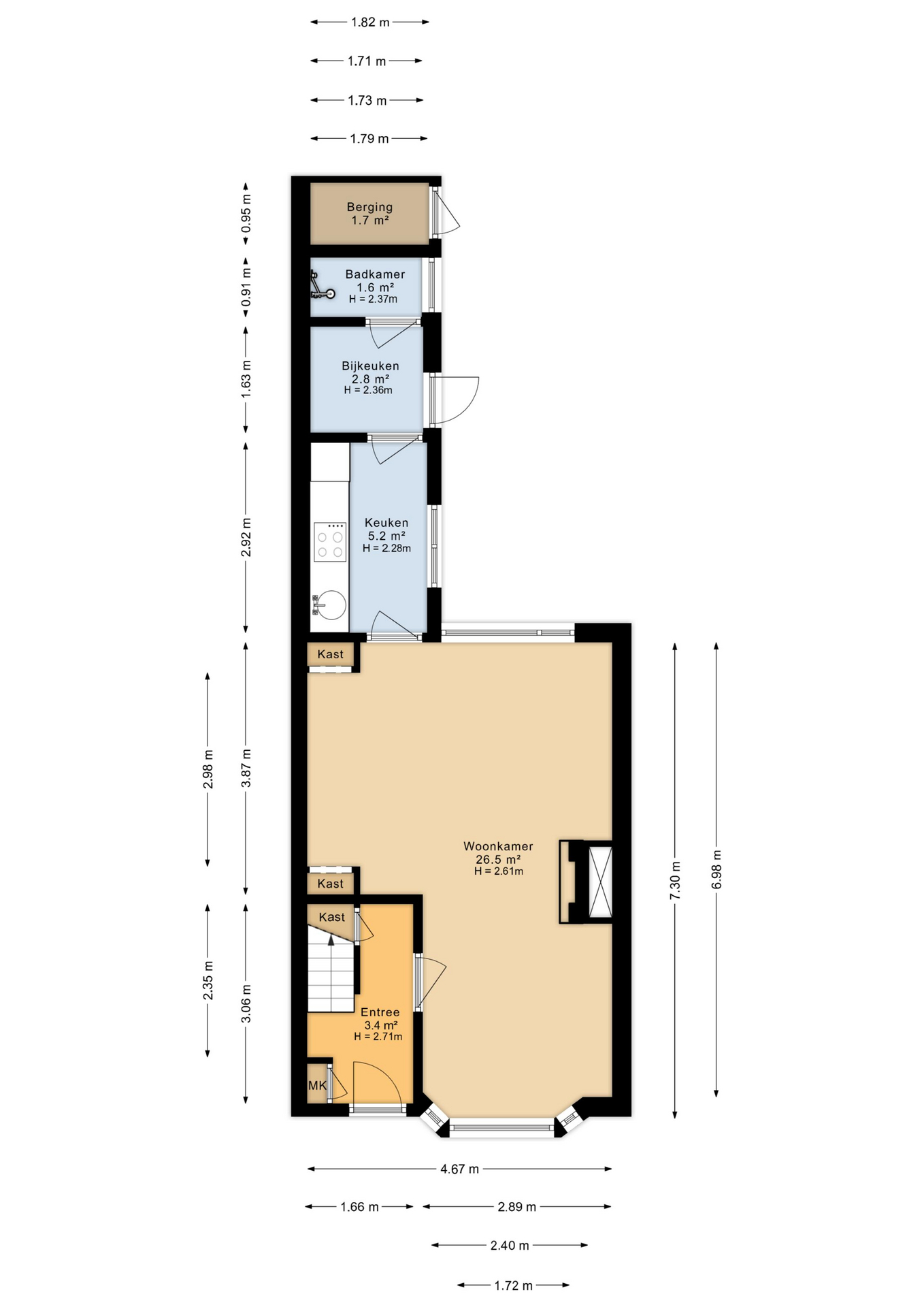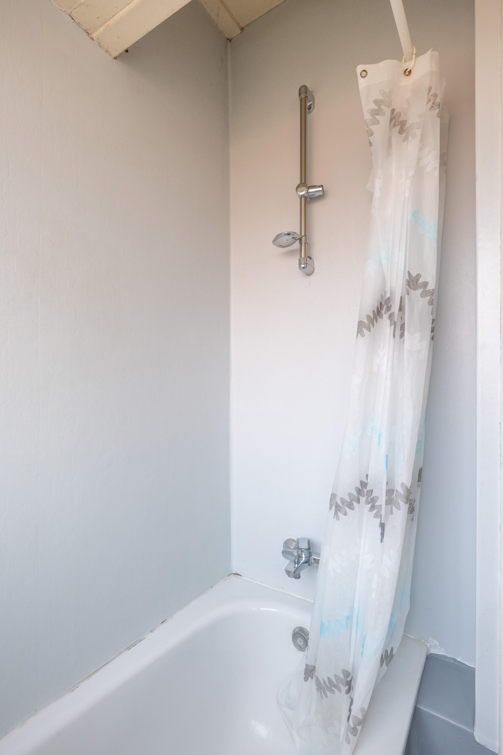 Aansluitend vind je de bijkeuken opnieuw betegeld en voorzien van aansluiting voor de wasmachine. Hier bevindt zich ook de deur naar buiten. Achterin de woning ligt een badkamer met toilet en douche, verzorgd en licht uitgevoerd.