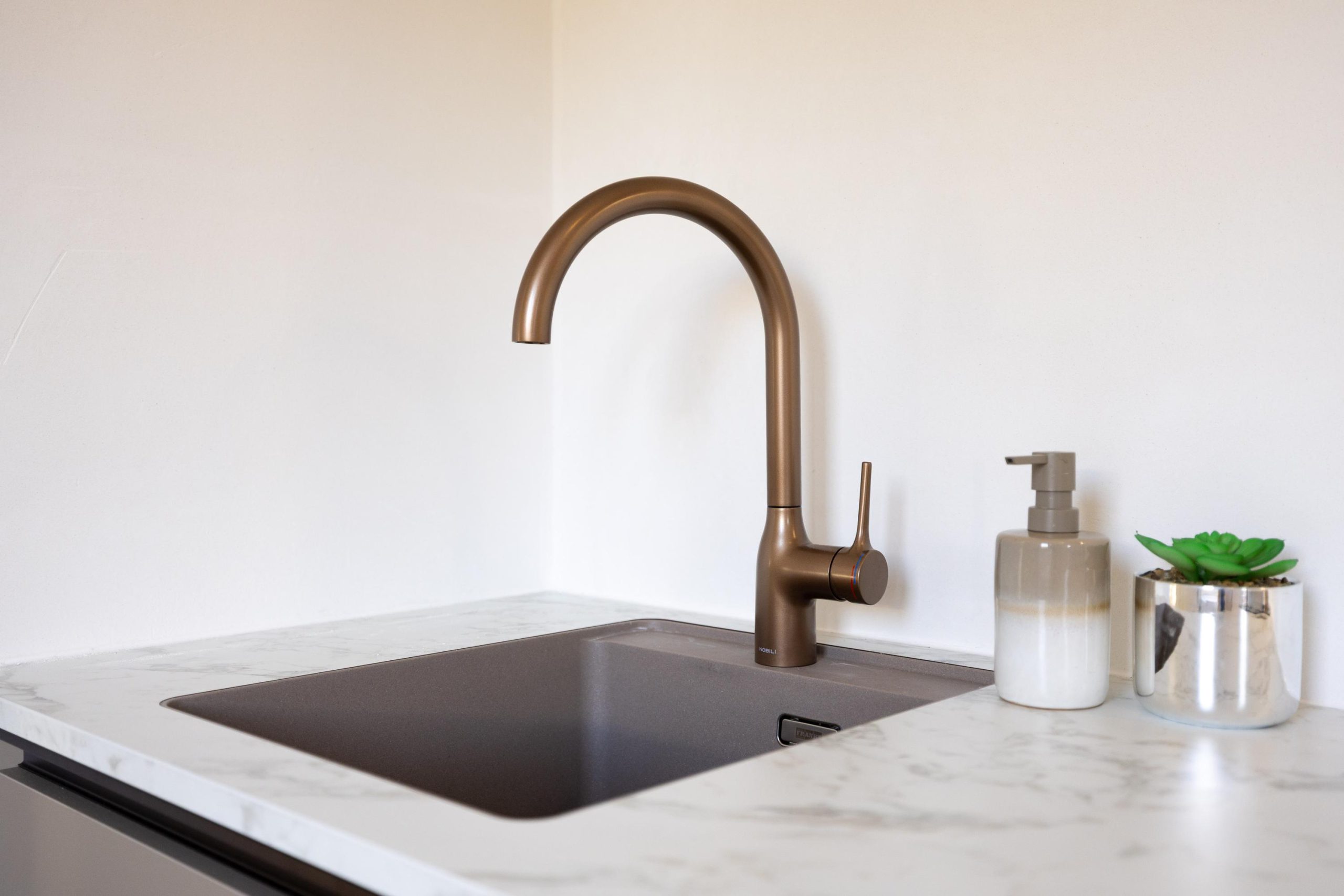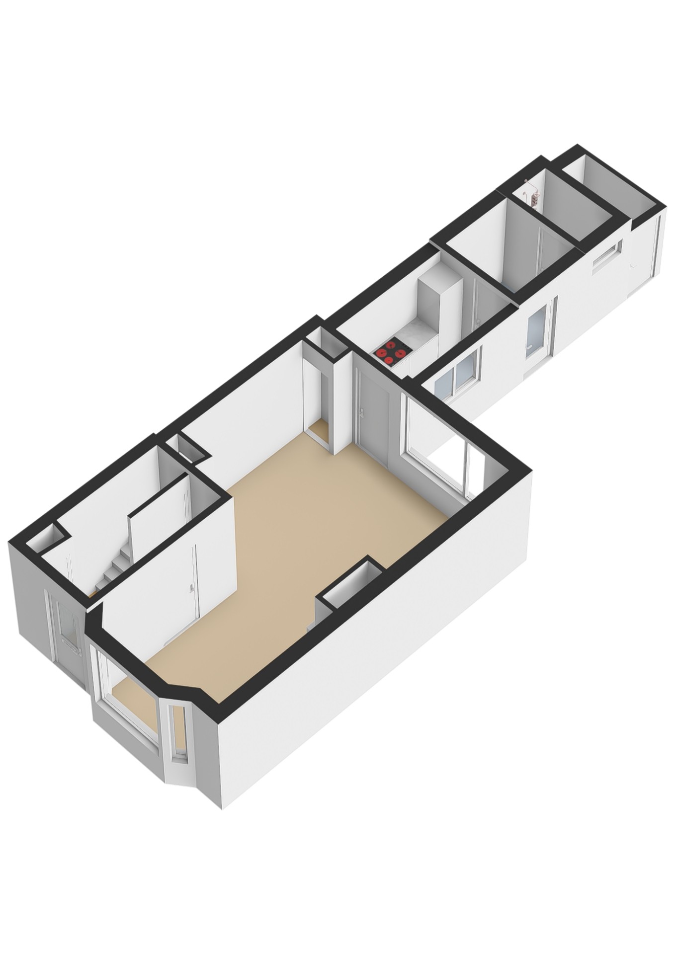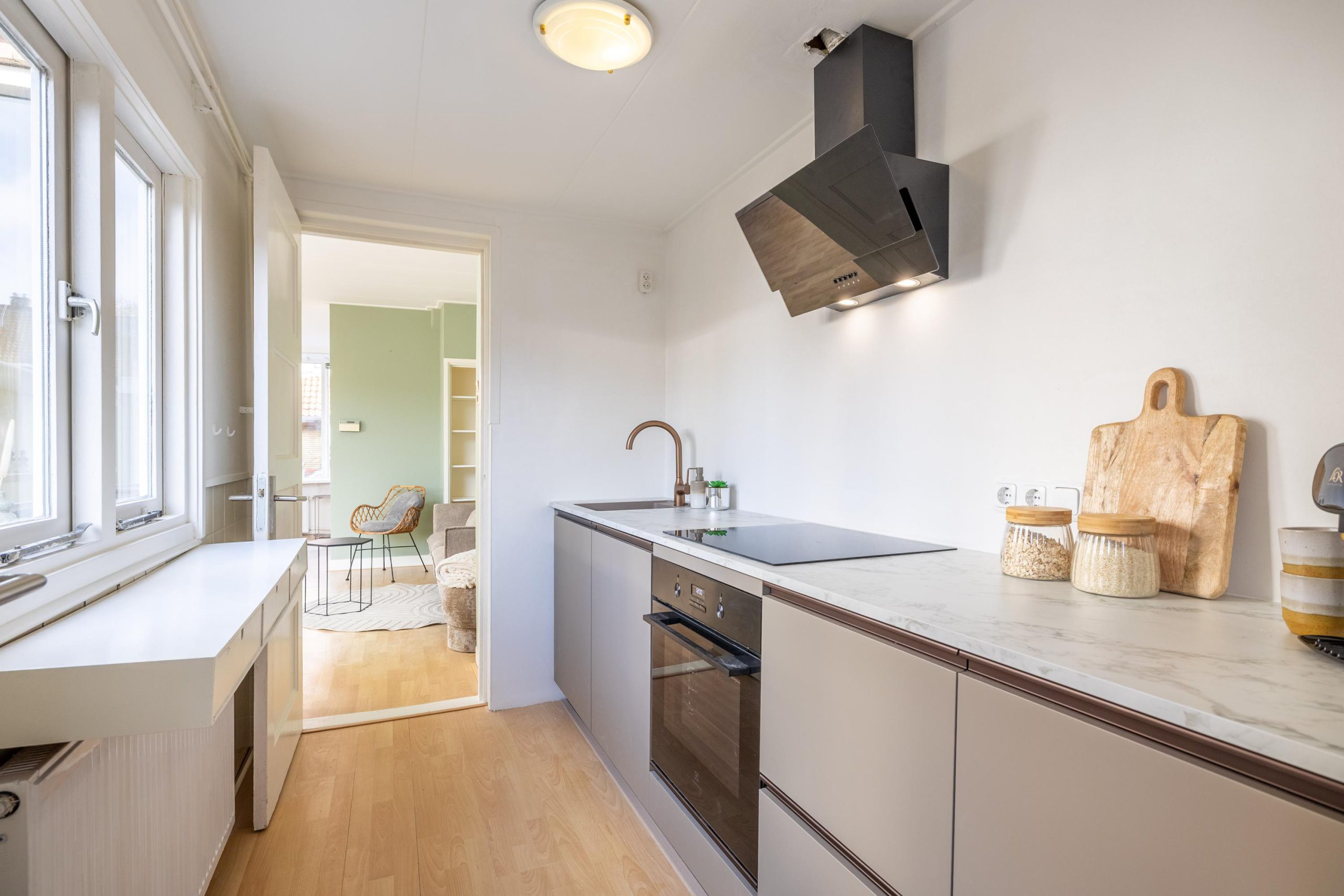 De woonkamer loopt vloeiend over in de keuken, wat zorgt voor een open en ruimtelijk gevoel. De keuken is recent geplaatst en is voorzien van inbouwapparatuur zoals een vaatwasser, oven, inductiekookplaat en afzuigkap. Strak, praktische en helemaal van nu.