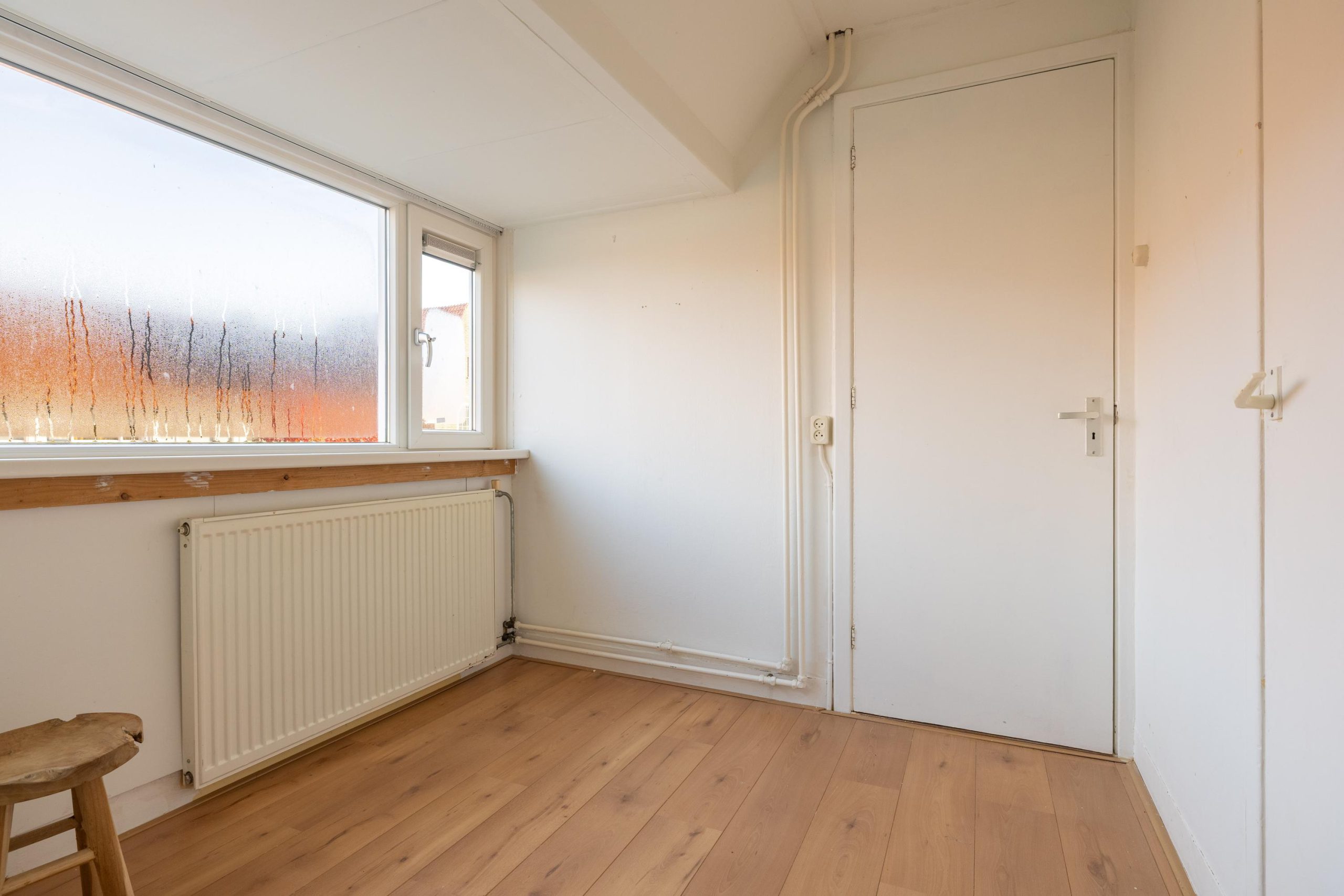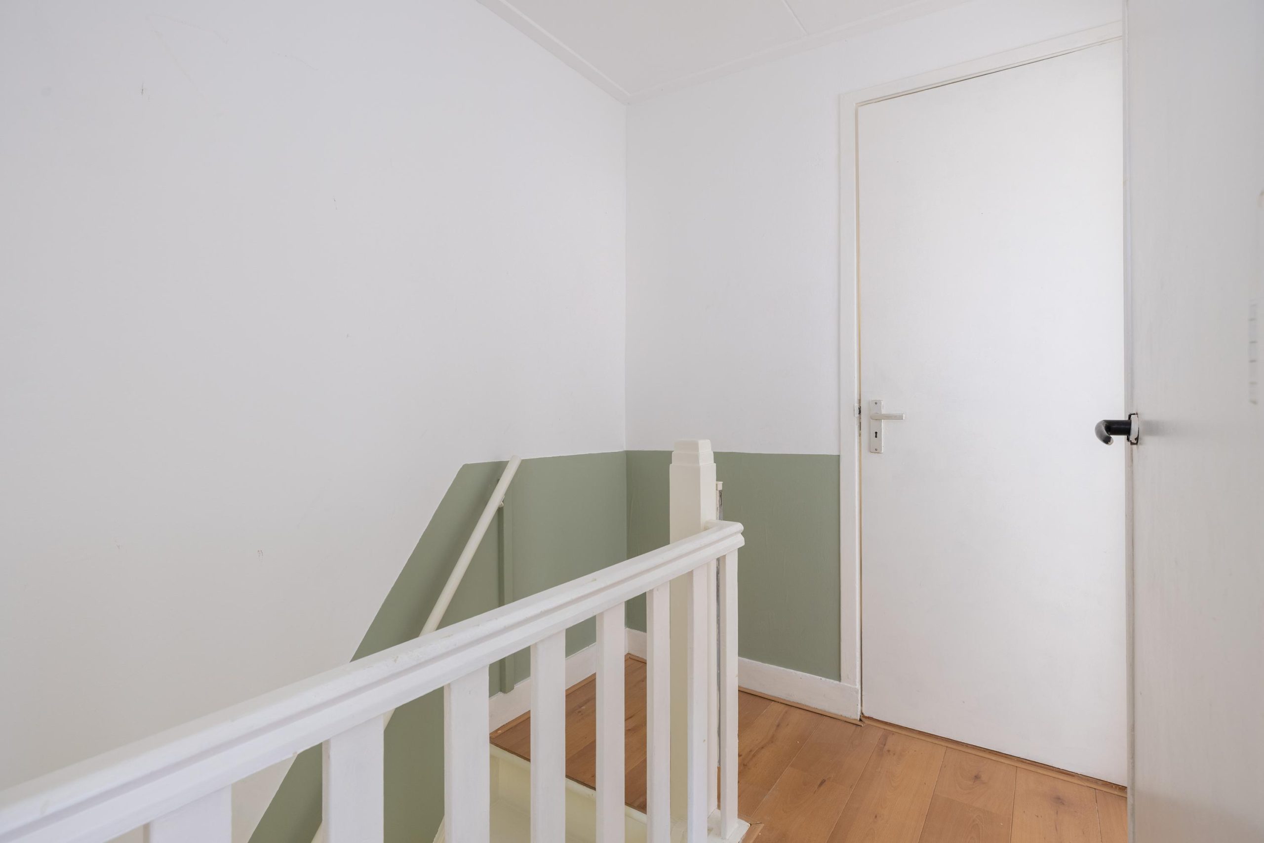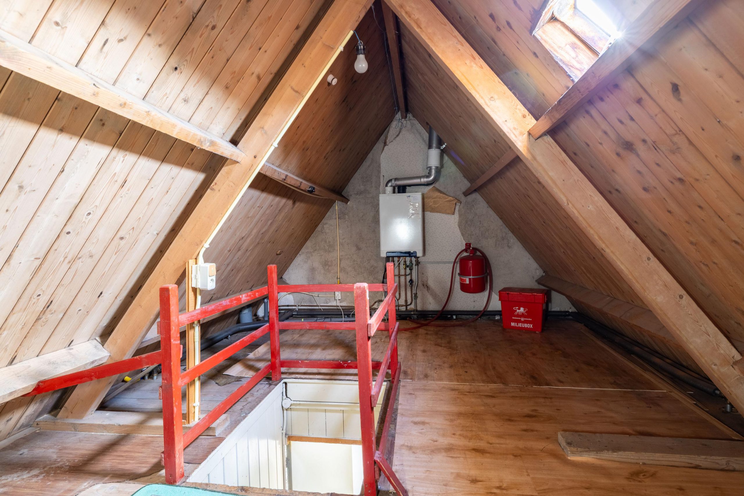Via de vaste trap die achter een deur verstopt zit bereik je de zolder: een praktische bergzolder met mogelijkheden voor een extra kamer.