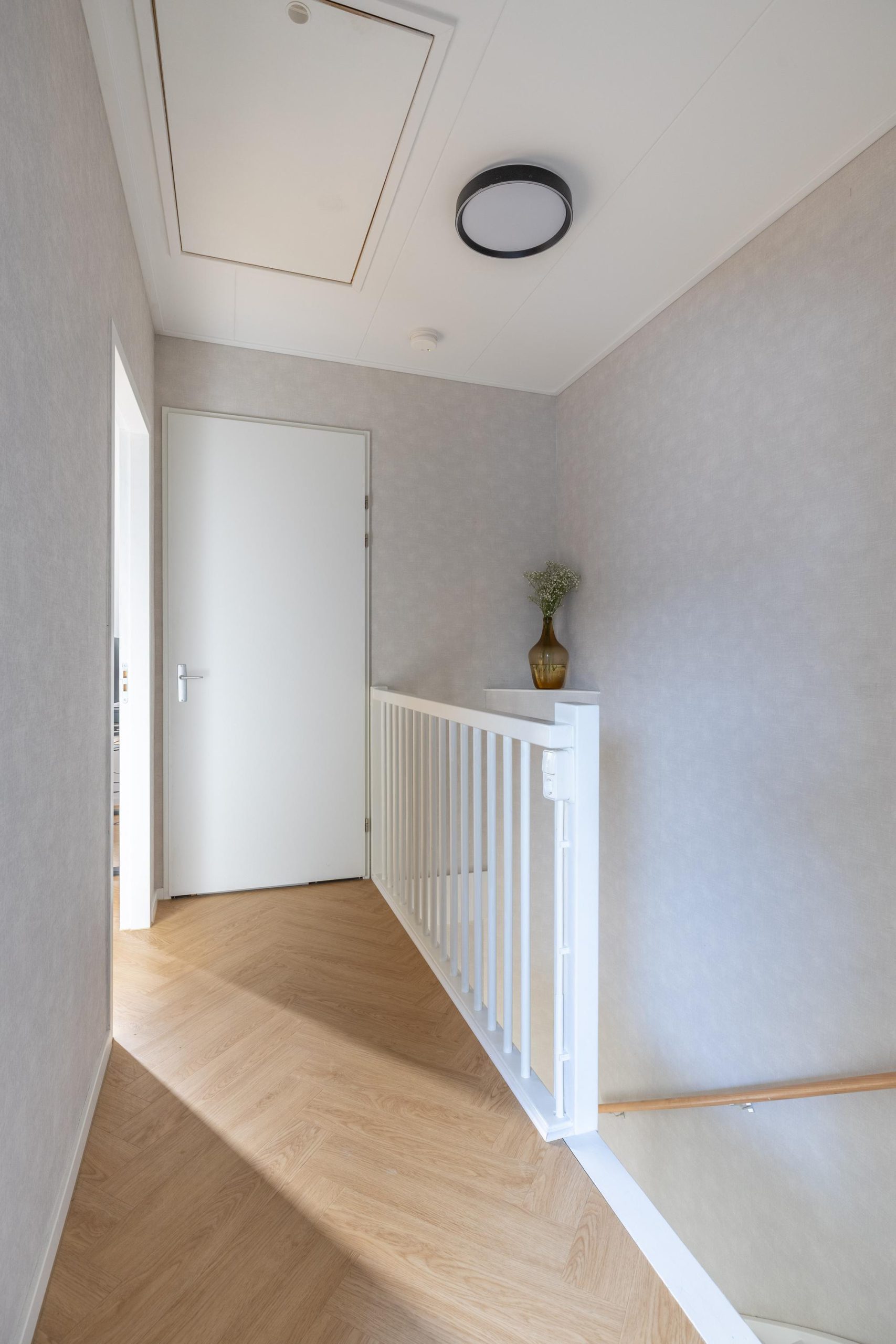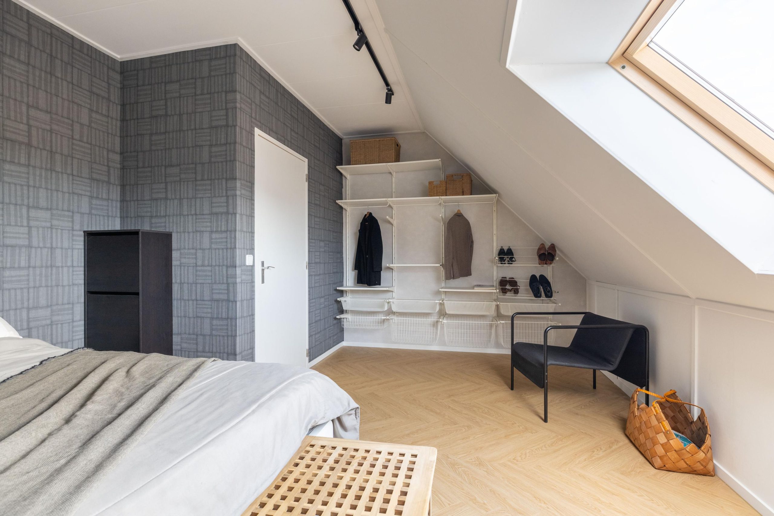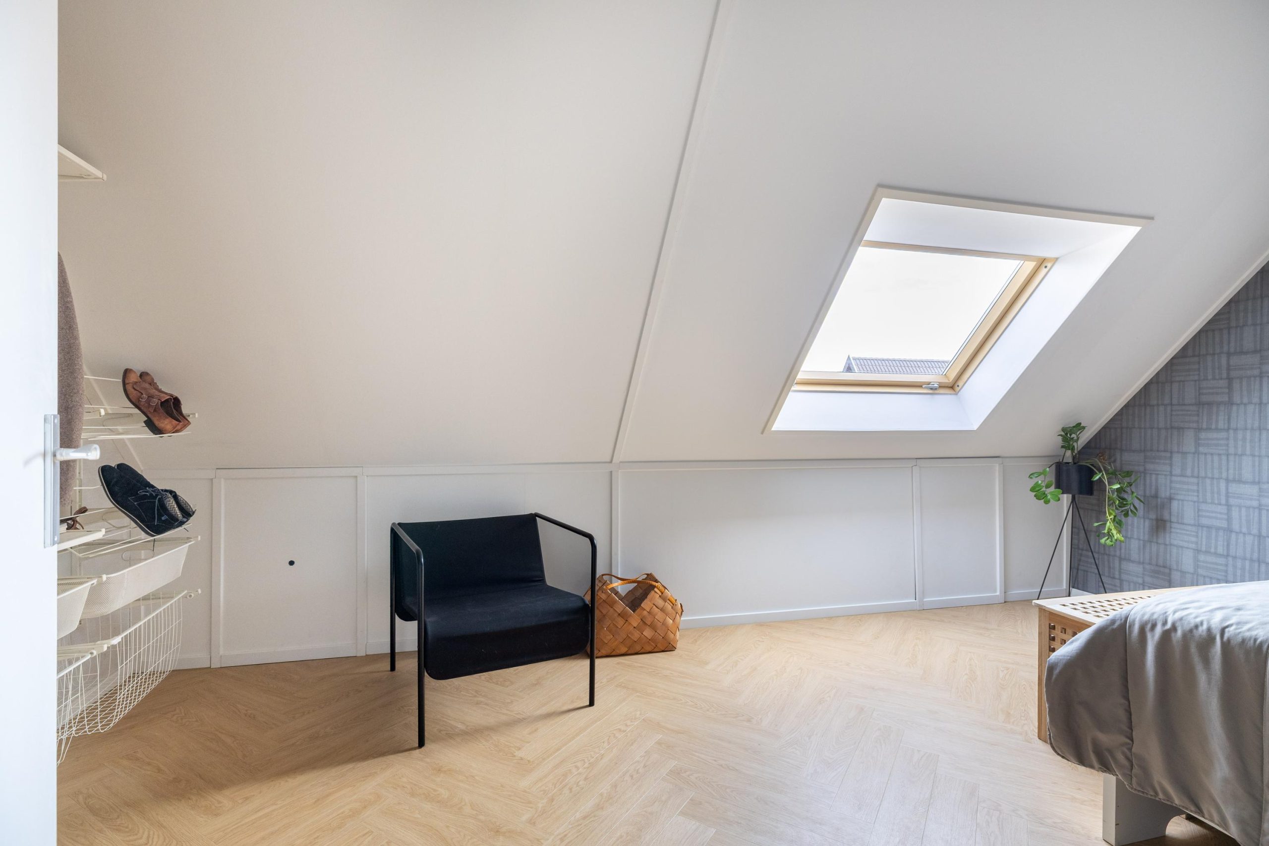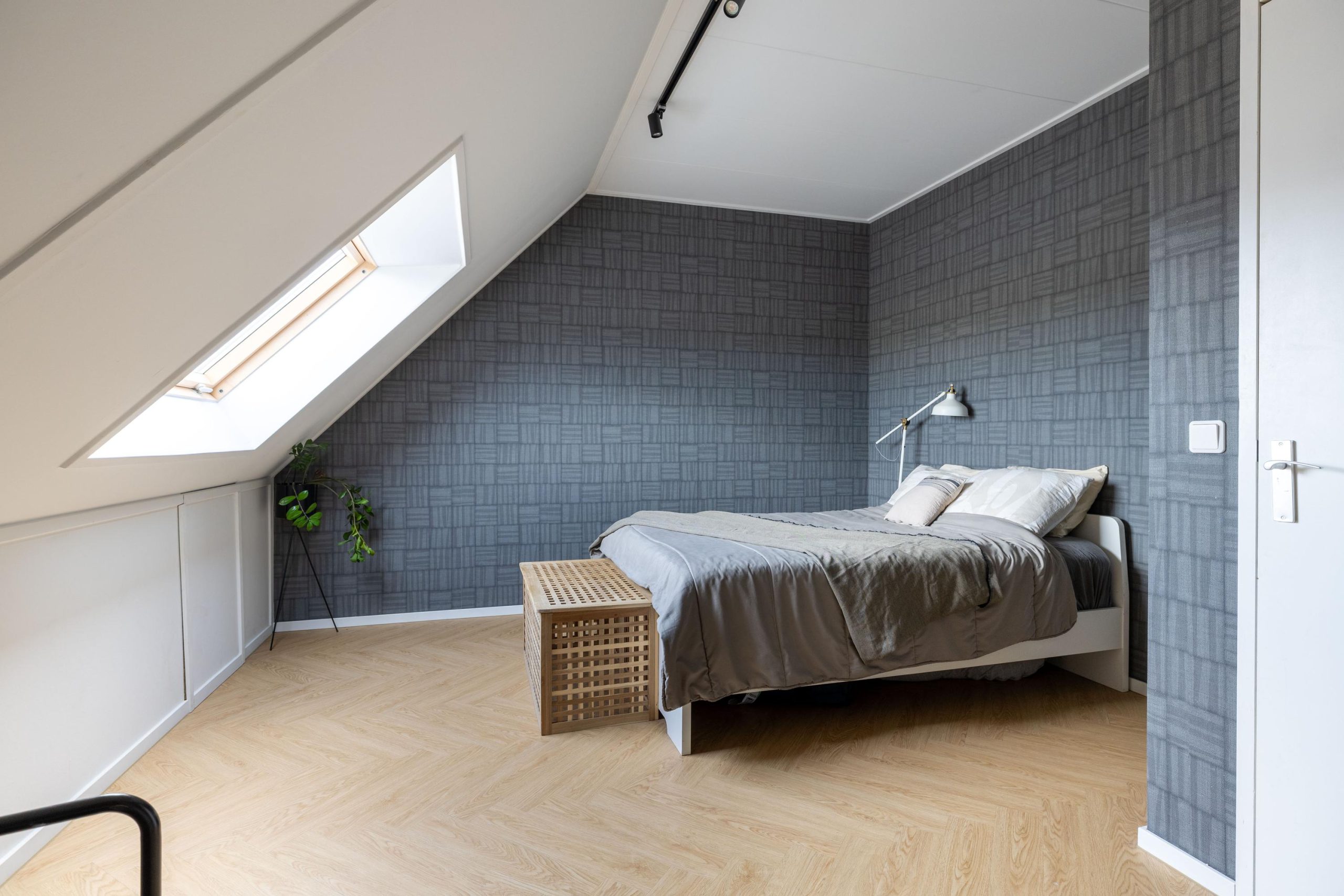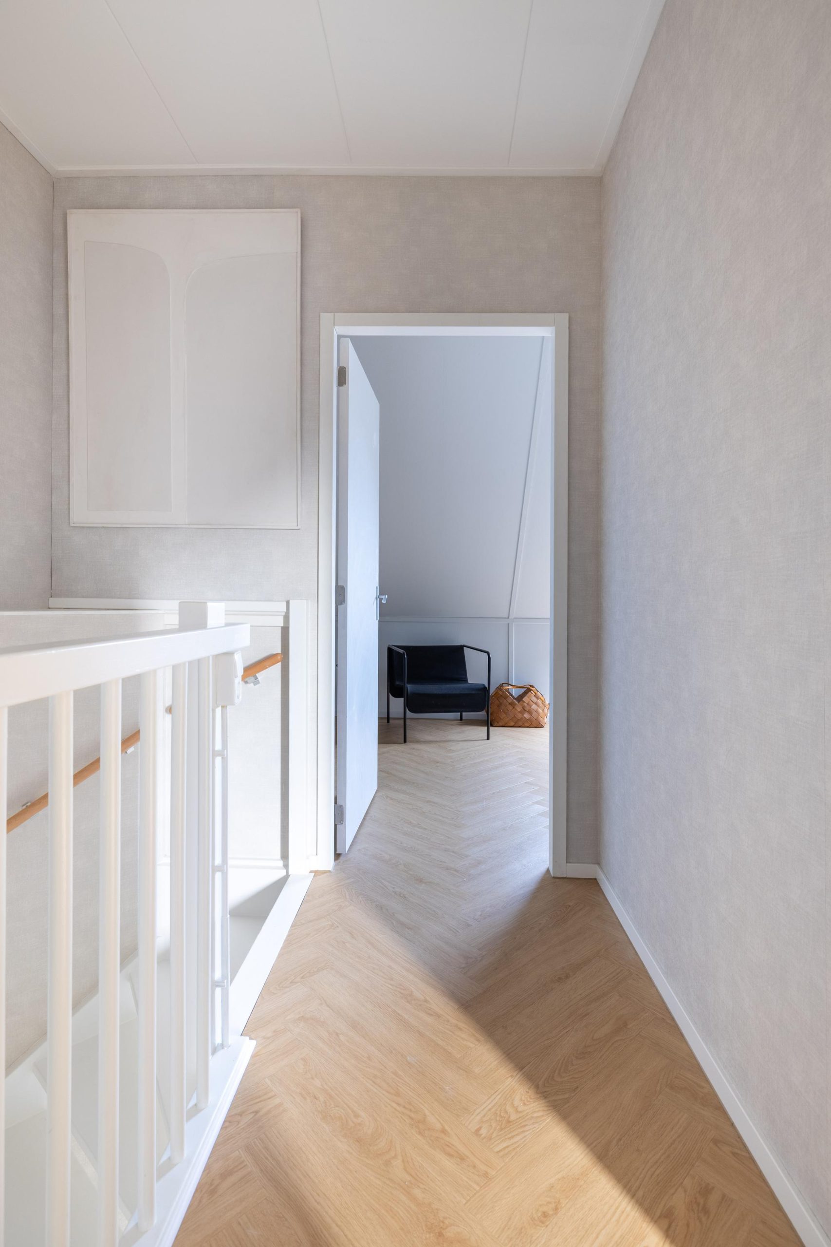 Ook hier is aan alles gedacht. Deze verdieping is volledig afgetimmerd en tot in detail afgewerkt, met twee extra slaapkamers en een berging waar de warmtepomp en het witgoed netjes zijn weggewerkt. De vloer is afgewerkt in visgraatmotief – een subtiele verwijzing naar de benedenverdieping en een mooi geheel door de hele woning.