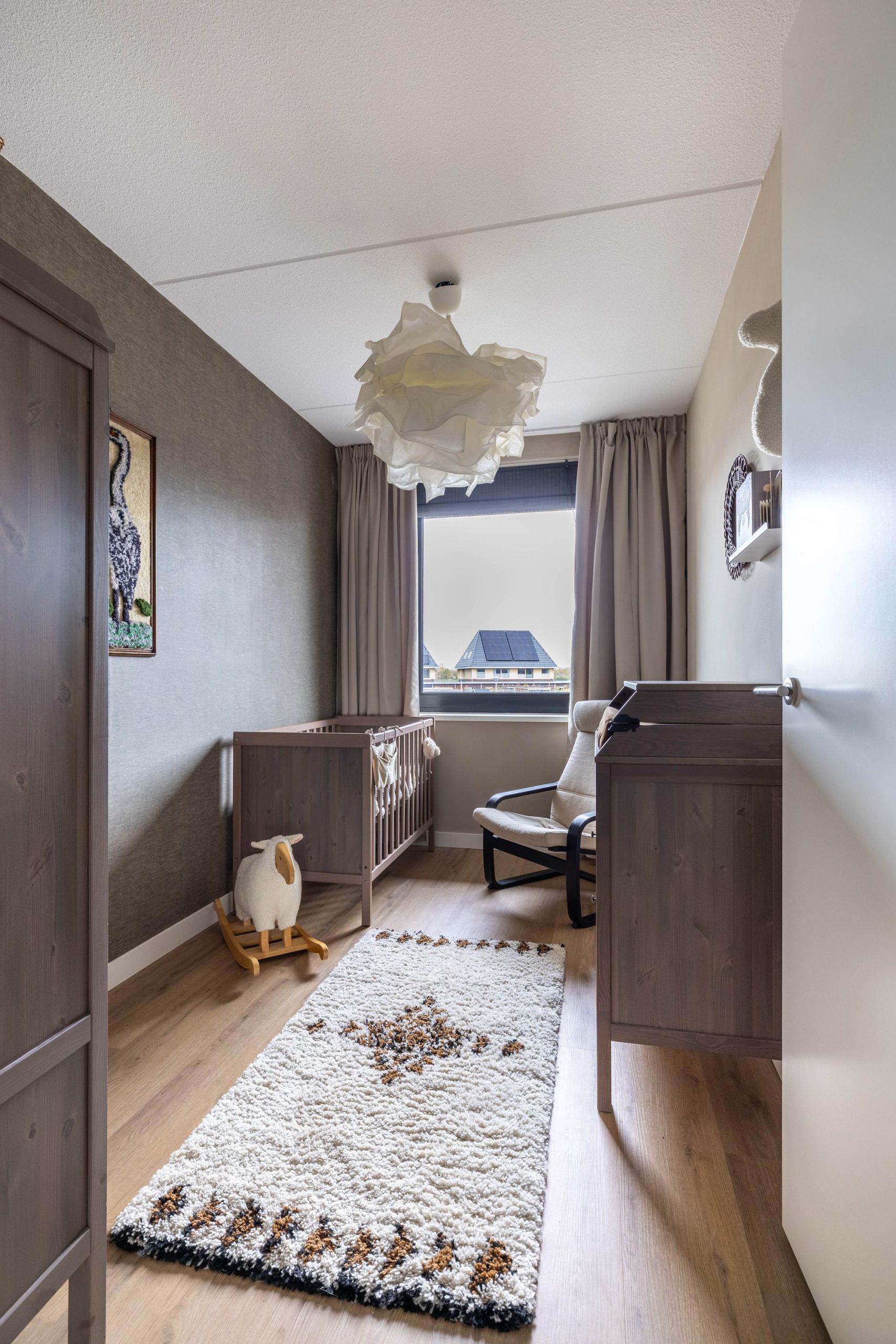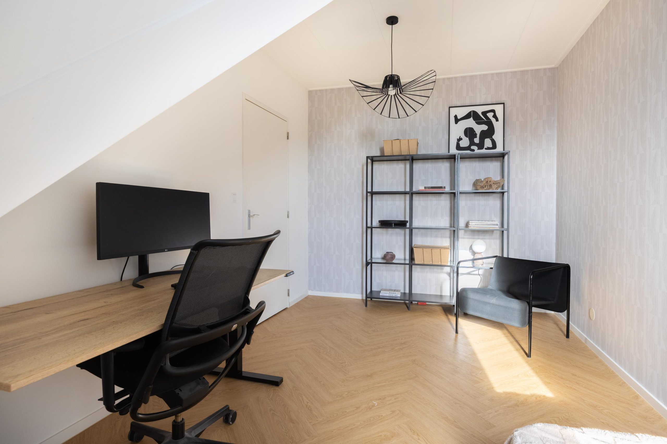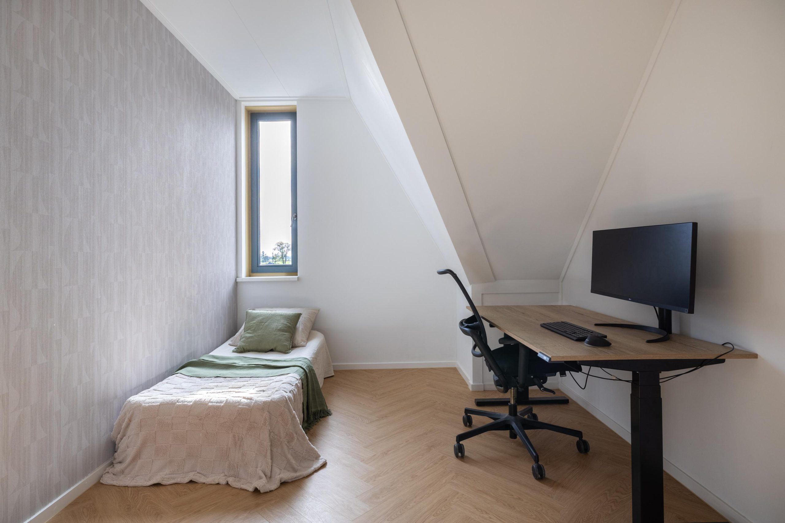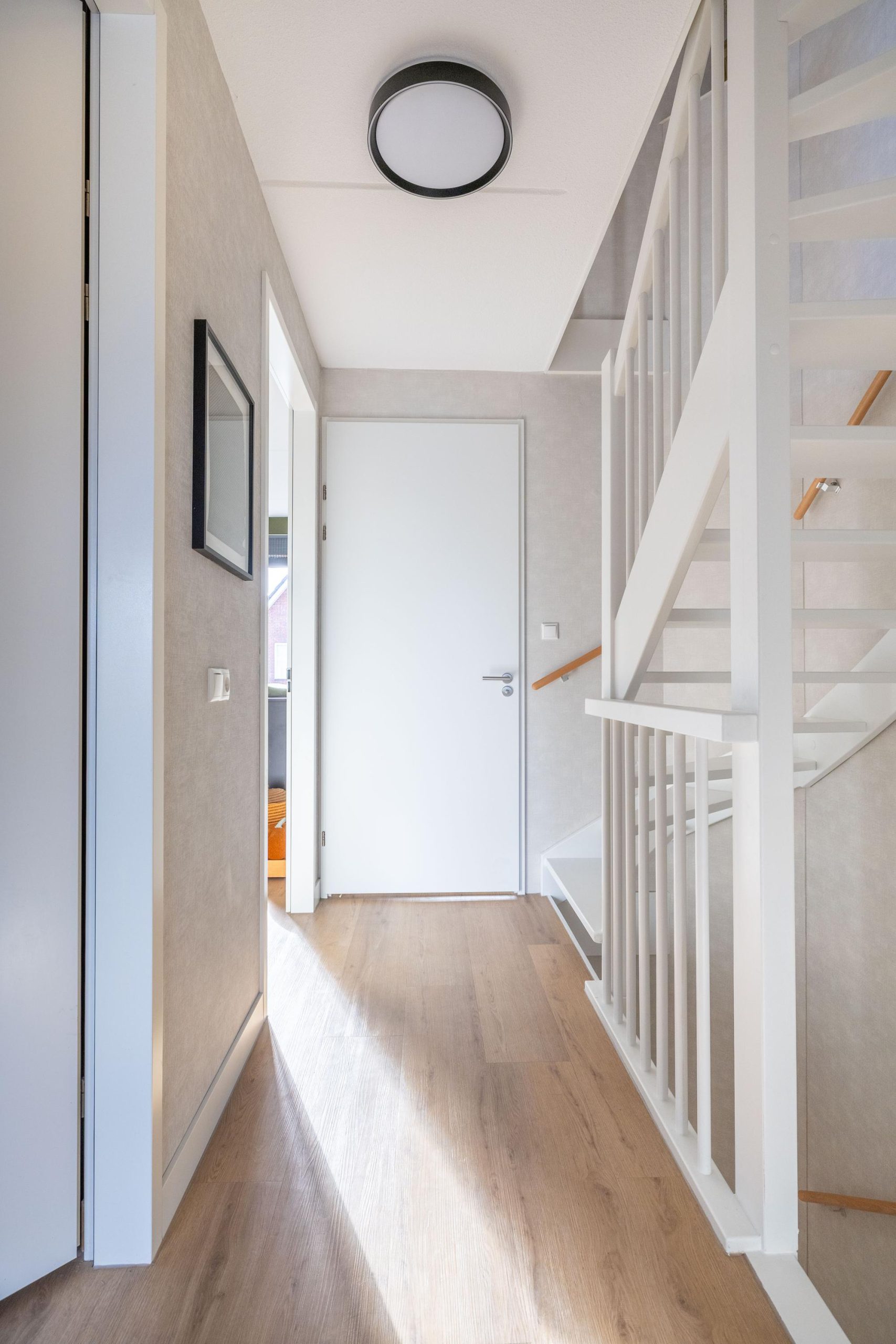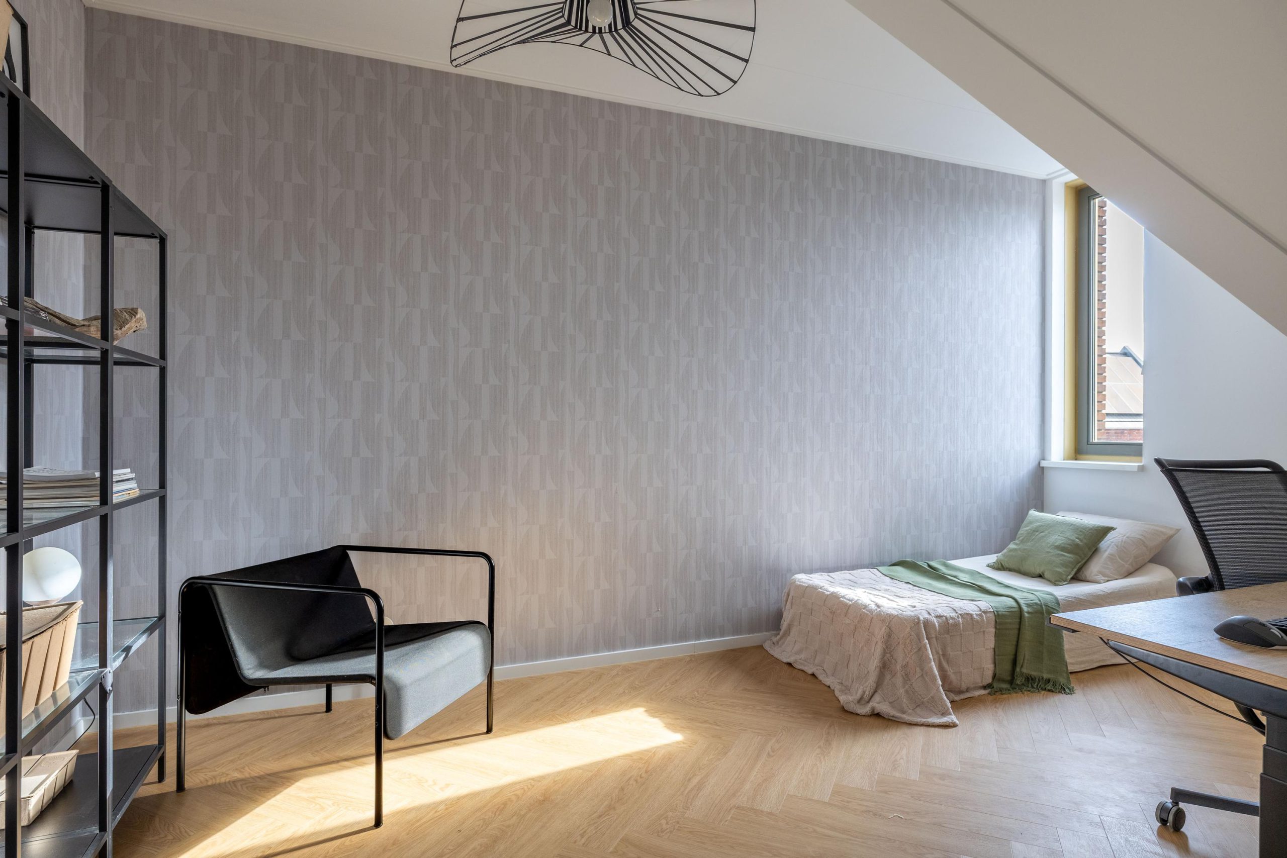 Ook hier is aan alles gedacht. Deze verdieping is volledig afgetimmerd en tot in detail afgewerkt, met twee extra slaapkamers en een berging waar de warmtepomp en het witgoed netjes zijn weggewerkt. De vloer is afgewerkt in visgraatmotief – een subtiele verwijzing naar de benedenverdieping en een mooi geheel door de hele woning.