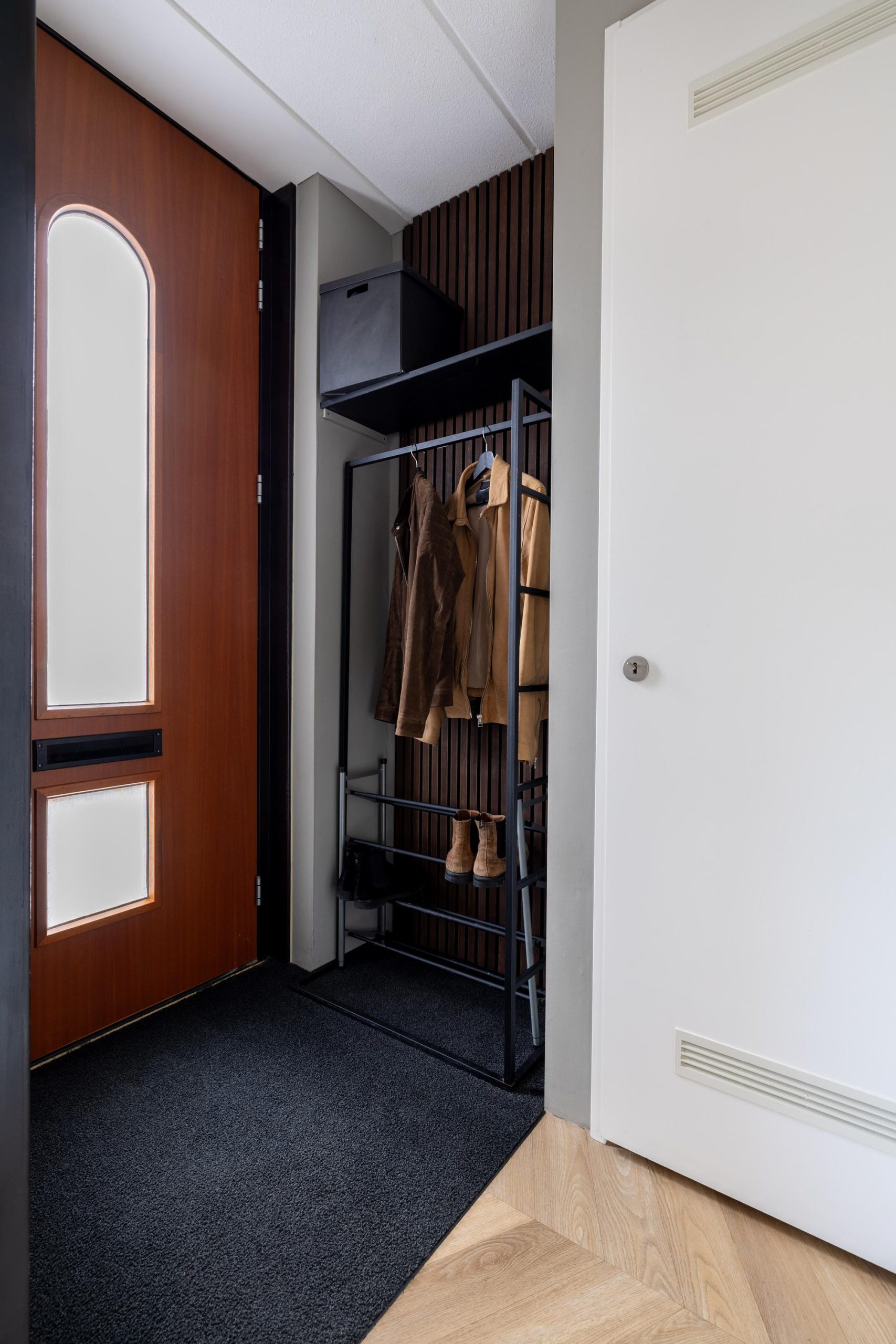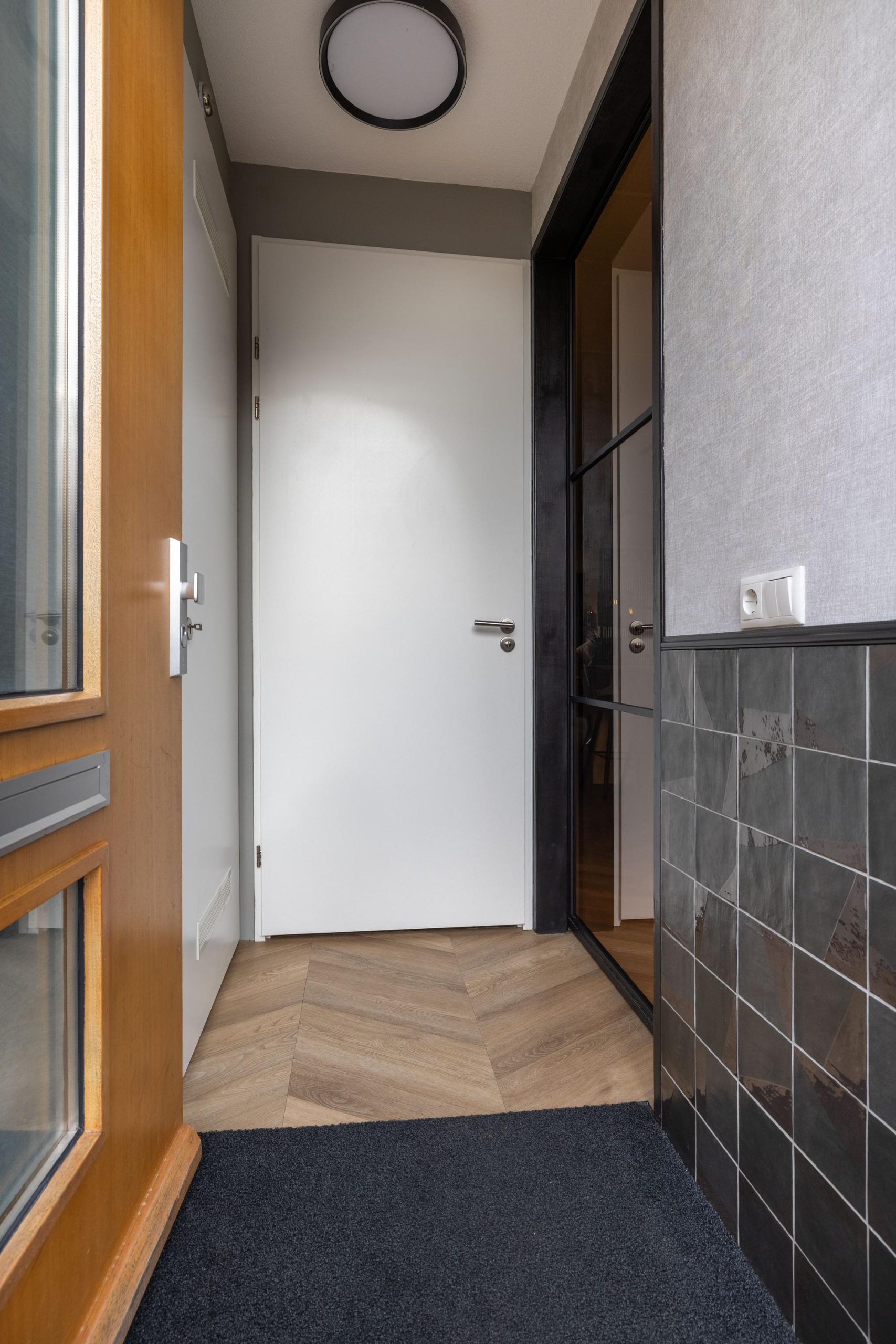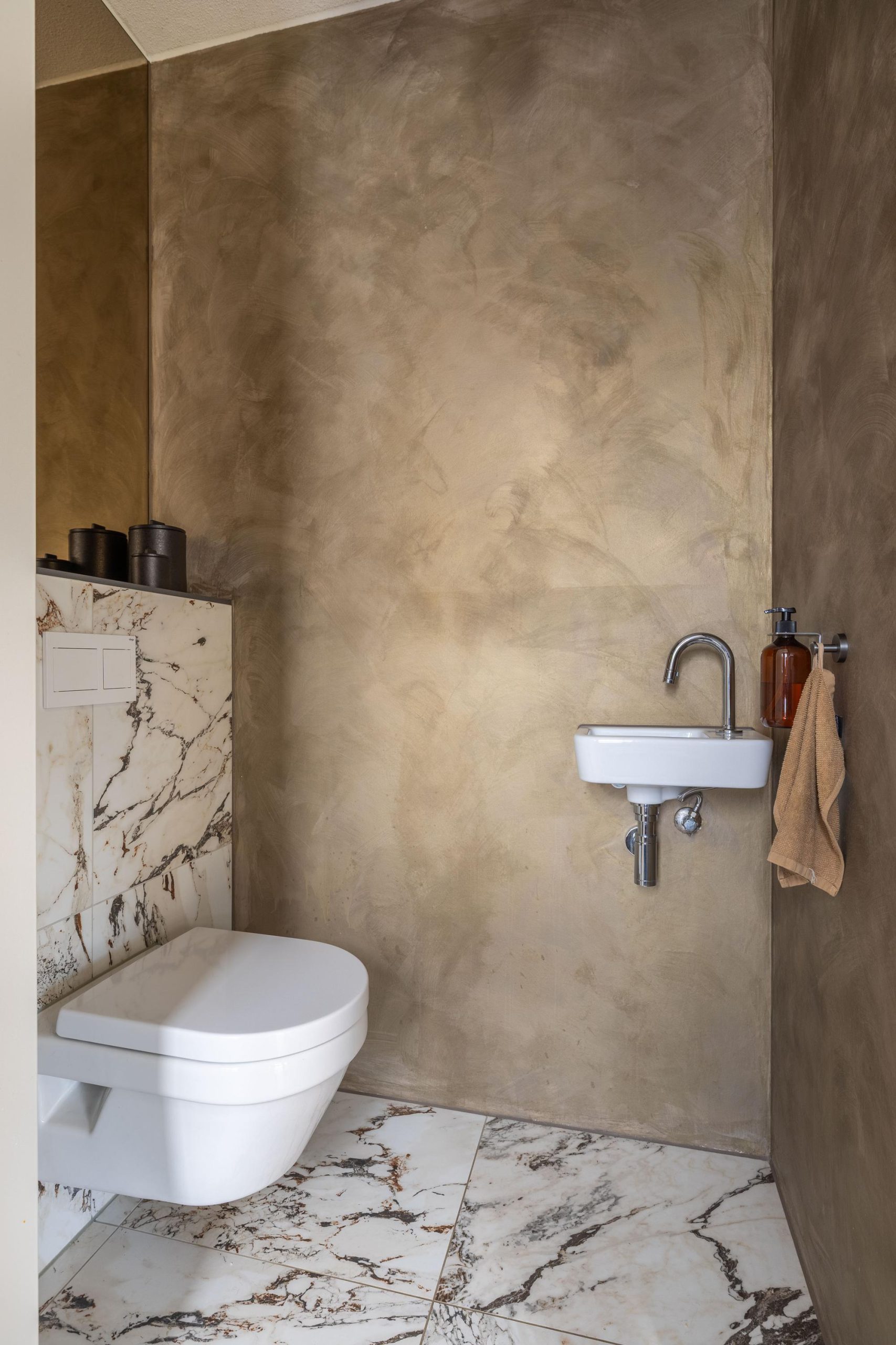 De afwerking is hoogwaardig, met een pvc-vloer in Hongaarse punt en een stoere stalen schuifdeur die de ruimte karakter geeft. De stijl laat zich het best omschrijven als Japandi – strak, rustgevend en verfijnd.