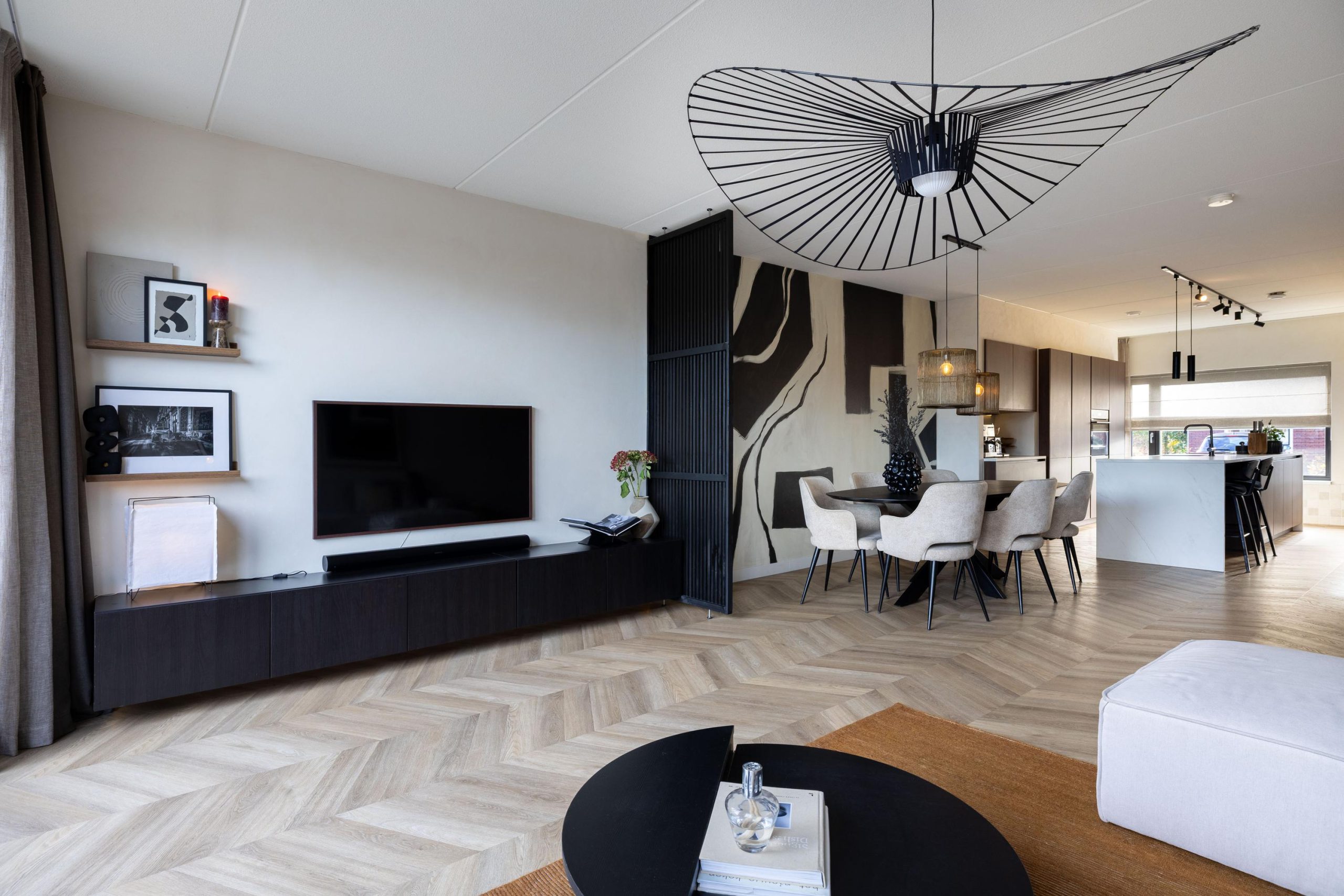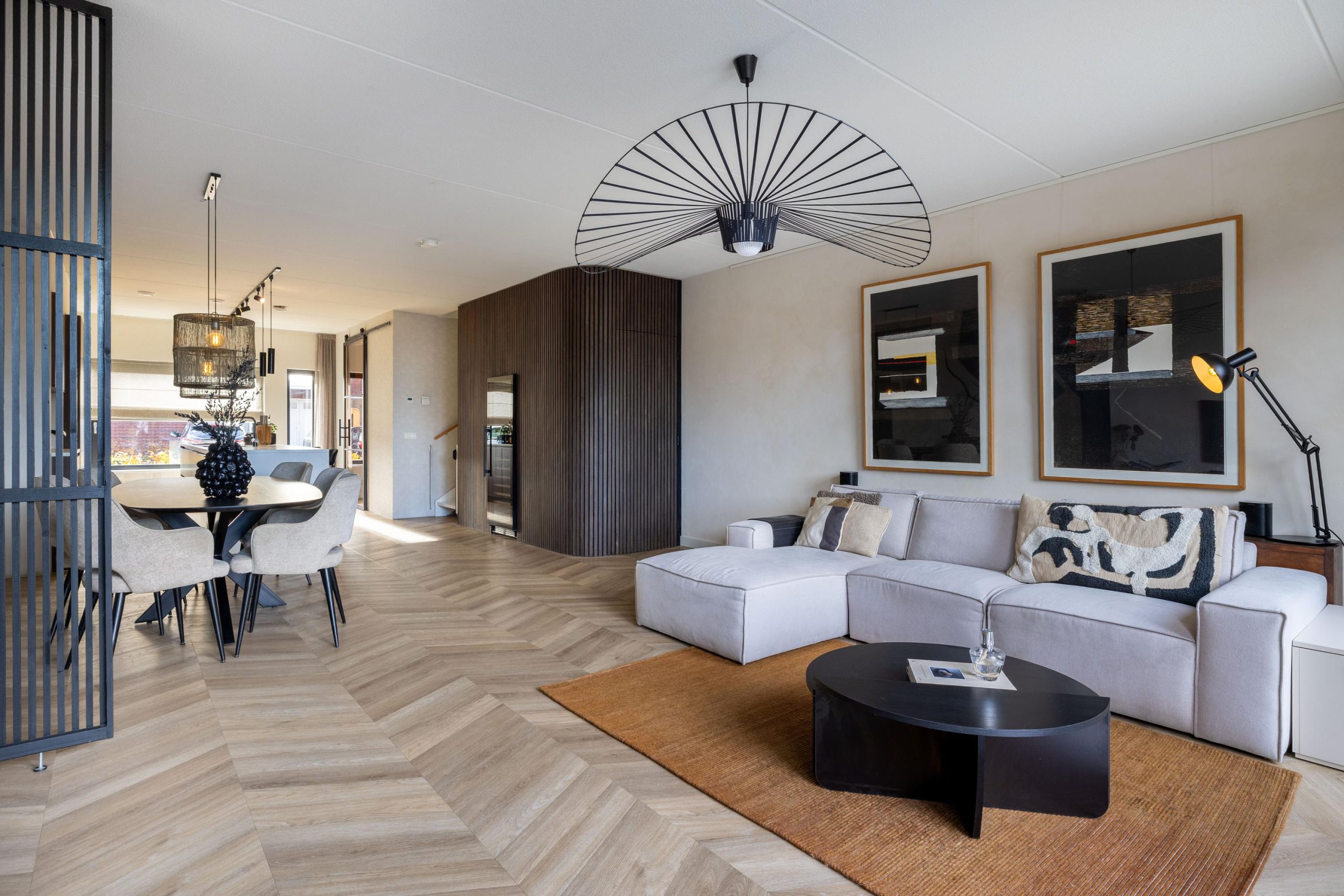 We stappen binnen in de hal met modern toilet, waarna de blik direct naar de royale woonkamer wordt getrokken. Dankzij de uitbouw van 2,40 meter en grote raampartijen aan de tuinzijde is het hier heerlijk licht. De woonkamer strekt zich meer dan 12 meter diep uit – een indrukwekkende ruimte waar wonen, koken en ontspannen naadloos in elkaar overlopen.