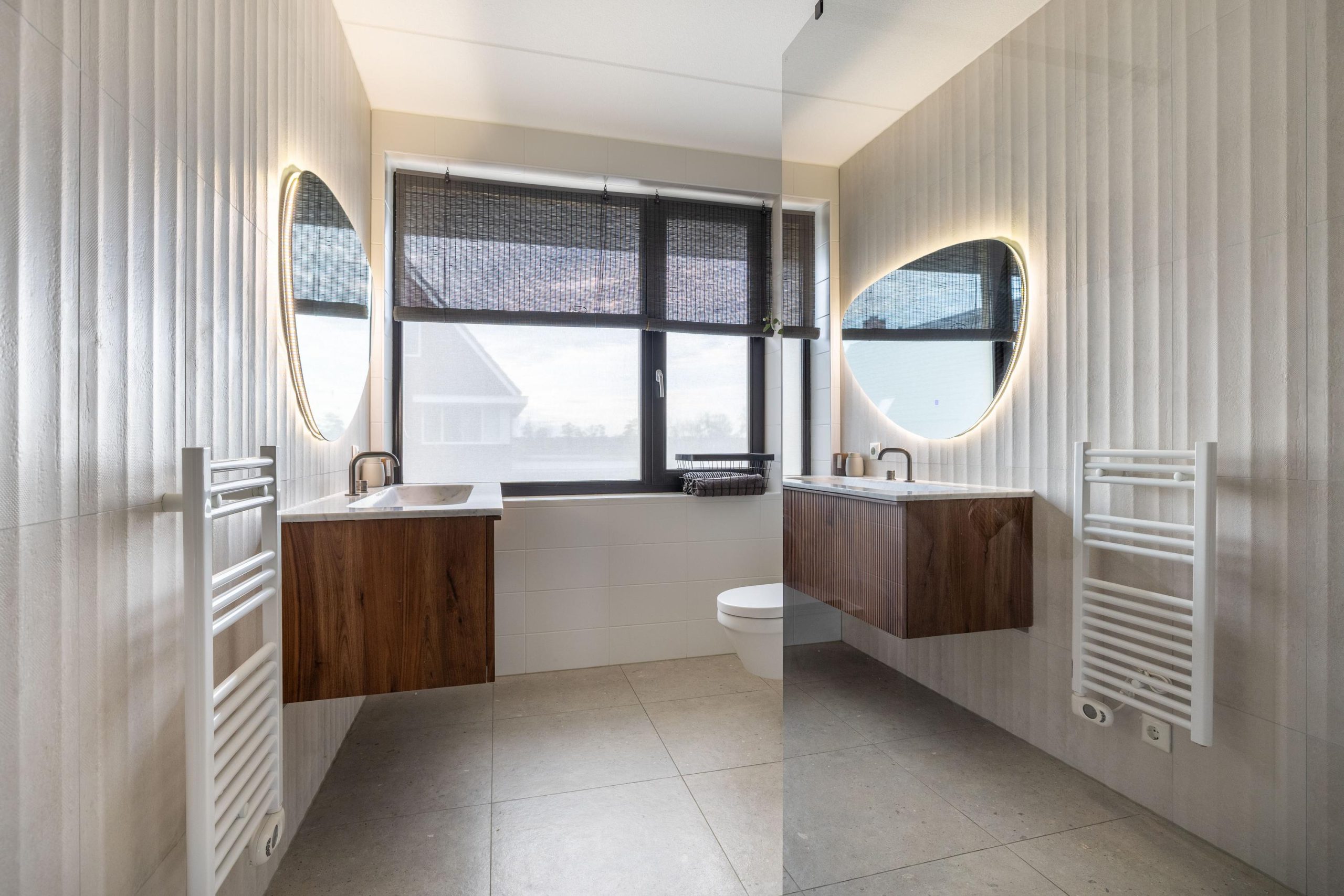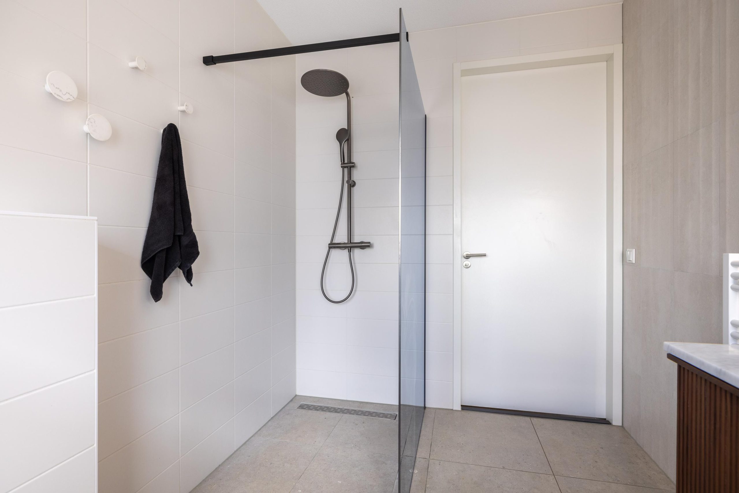 De eerste verdieping biedt drie ruime slaapkamers, allemaal strak afgewerkt met pvc-vloer in banen en vloerverwarming. De badkamer is een plaatje: modern, met inloopdouche achter smoked glas, toilet en wastafelmeubel in een stijlvol design.