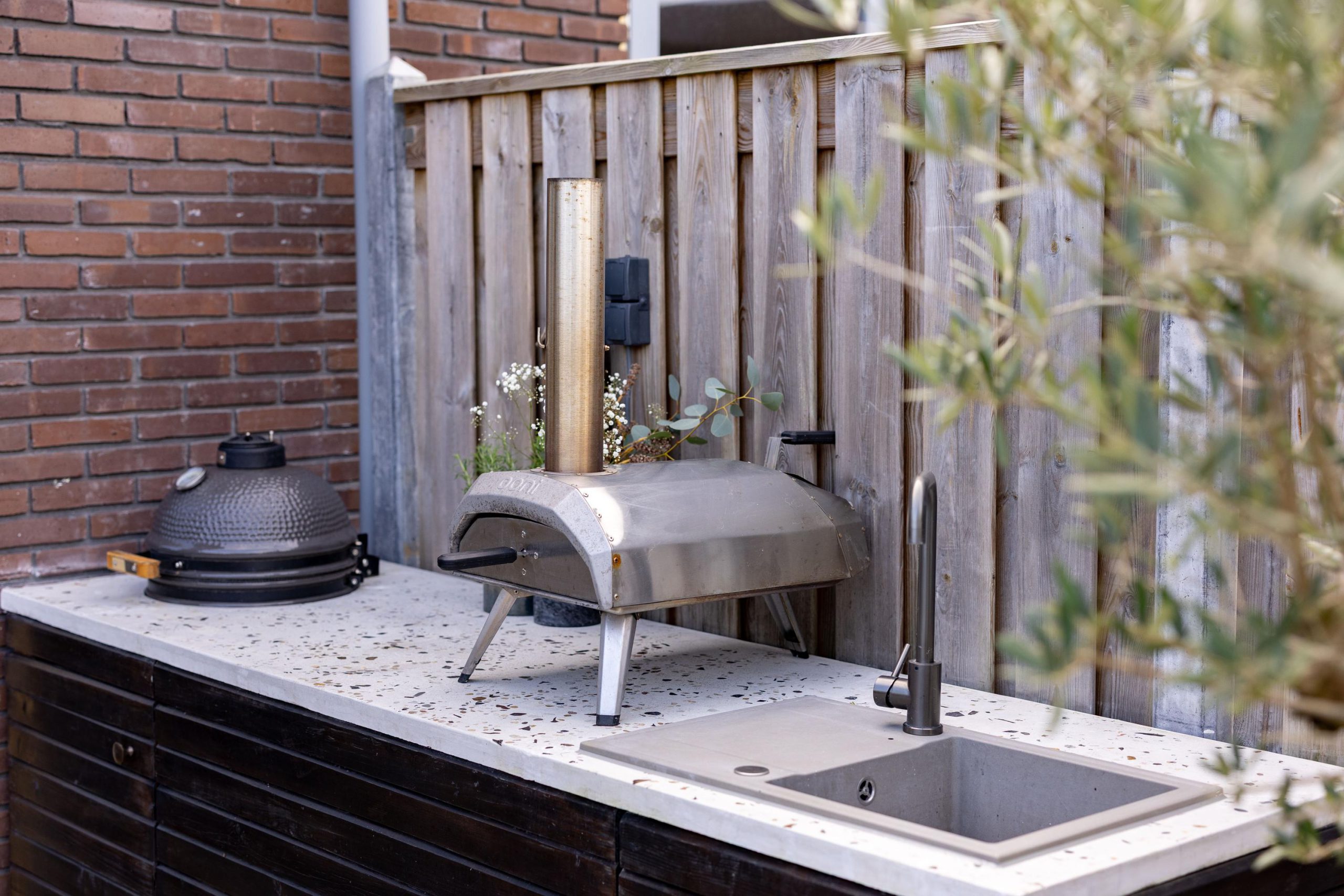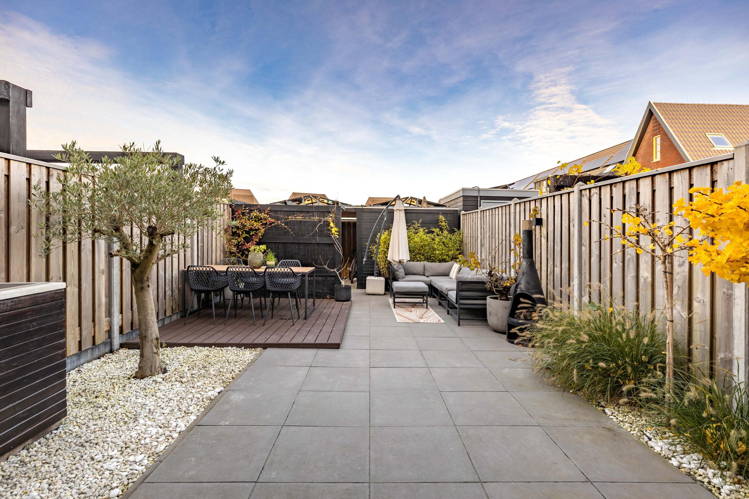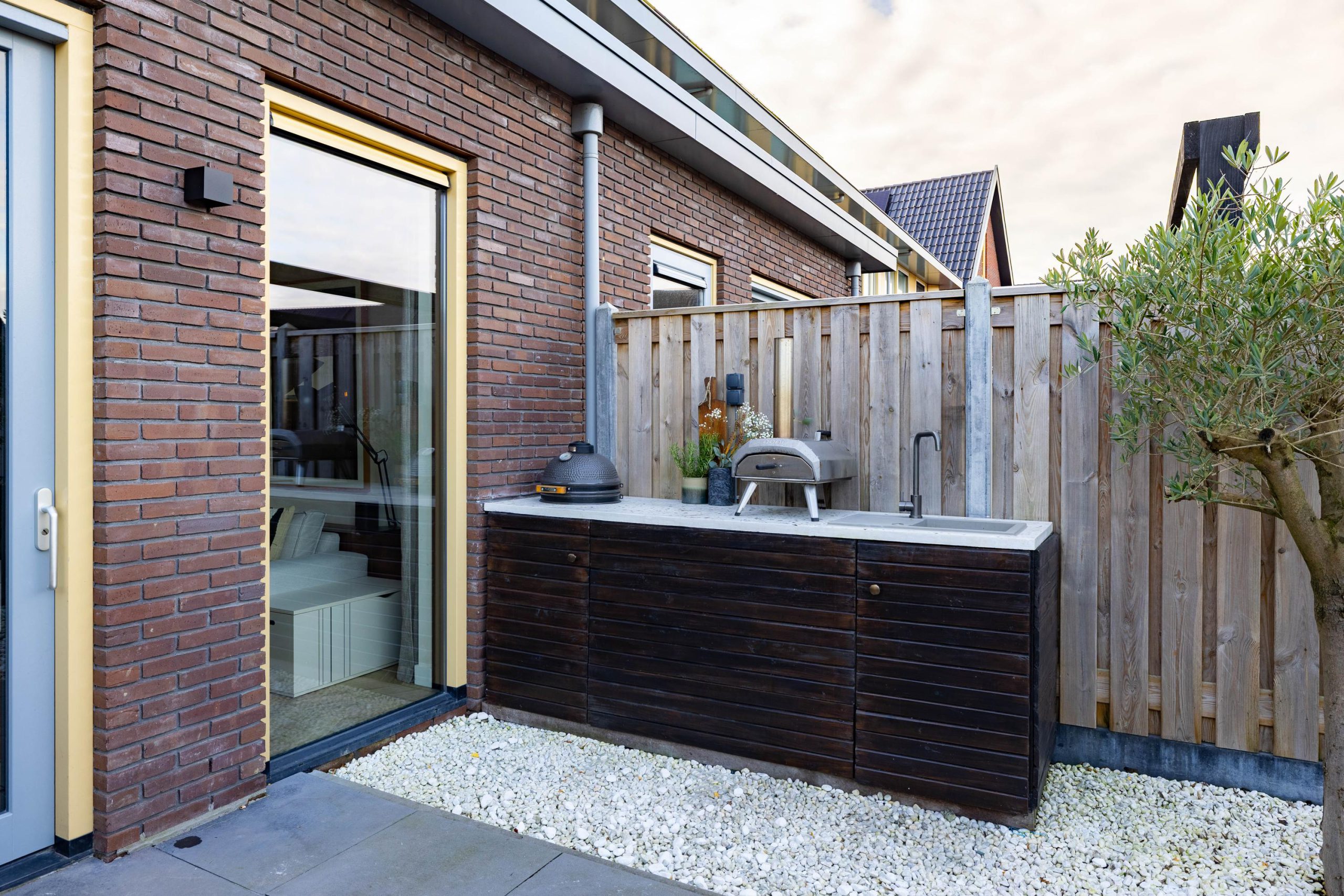 Via de achterpui loop je de tuin in, en daar wacht een echt buitenparadijs. De prachtige buitenkeuken vormt het hart van deze fijne buitenruimte: hier bereid je met gemak een zomerse maaltijd terwijl de kinderen spelen of vrienden aanschuiven met een glas wijn. De tuin is zorgvuldig aangelegd, met plek voor een ruime eettafel, een loungebank en volop groen. Dankzij de gunstige ligging en het vrije gevoel aan de rand van de wijk is dit een plek waar je graag de lange zomeravonden doorbrengt – een verlengstuk van je woonkamer, maar dan onder de open lucht.