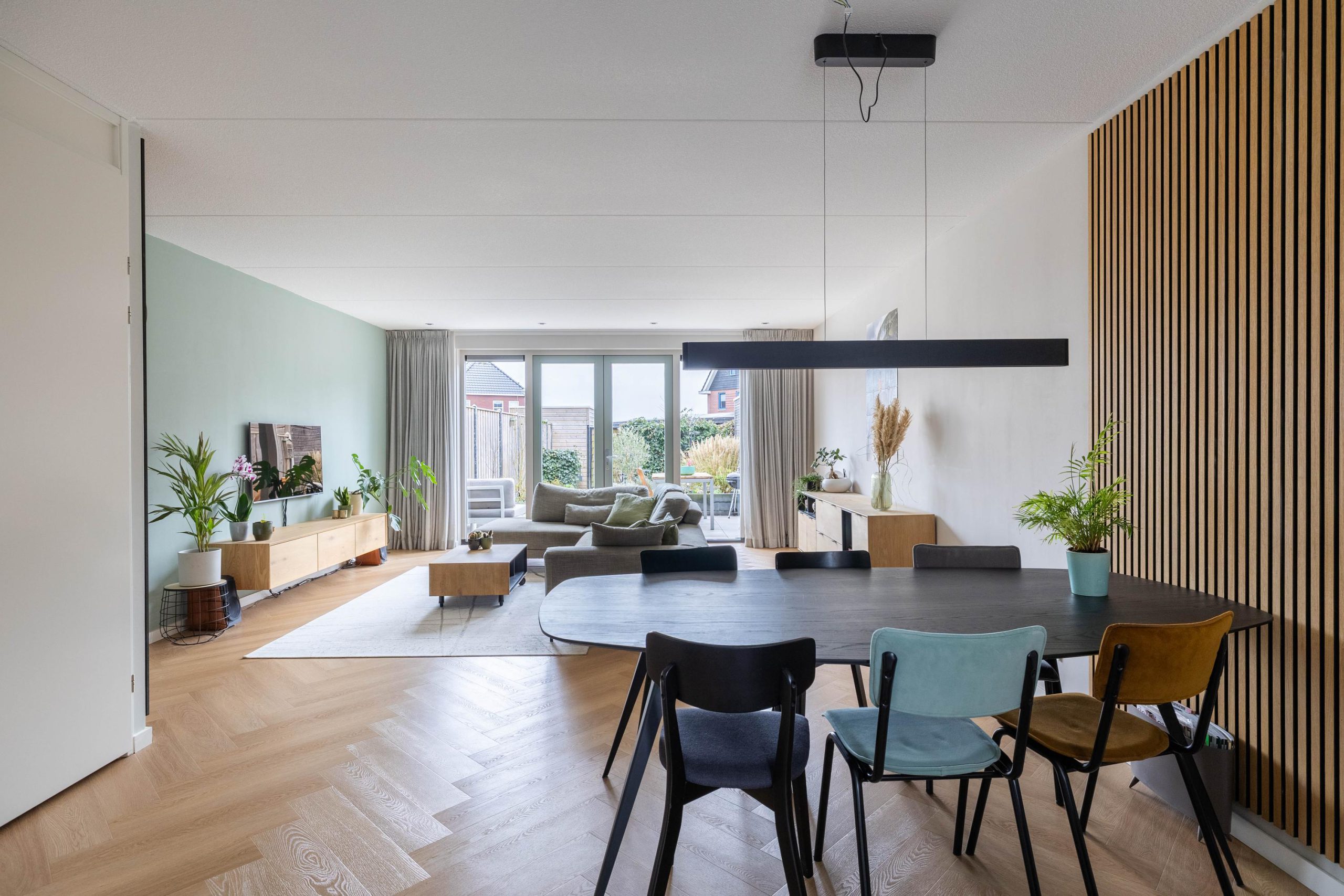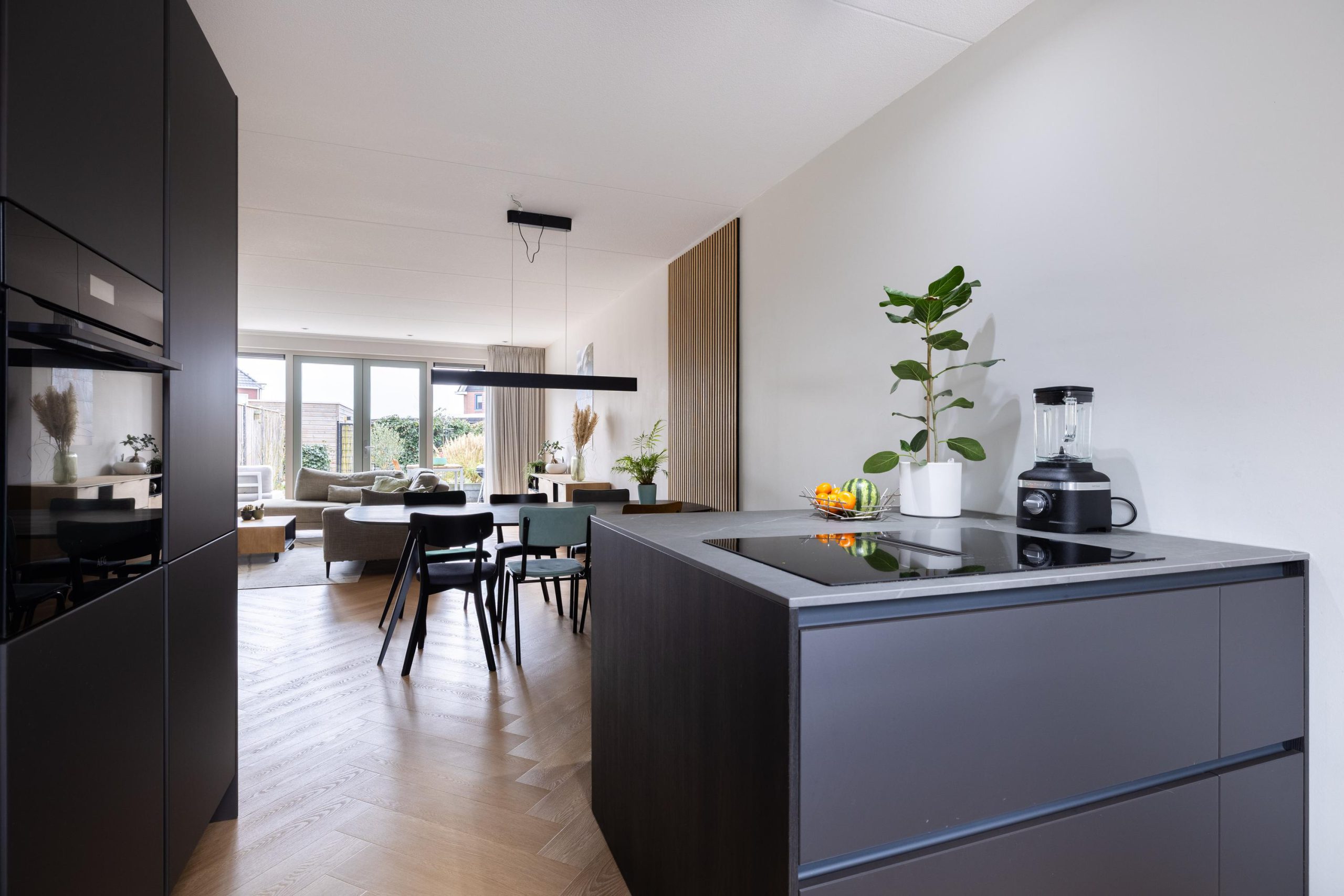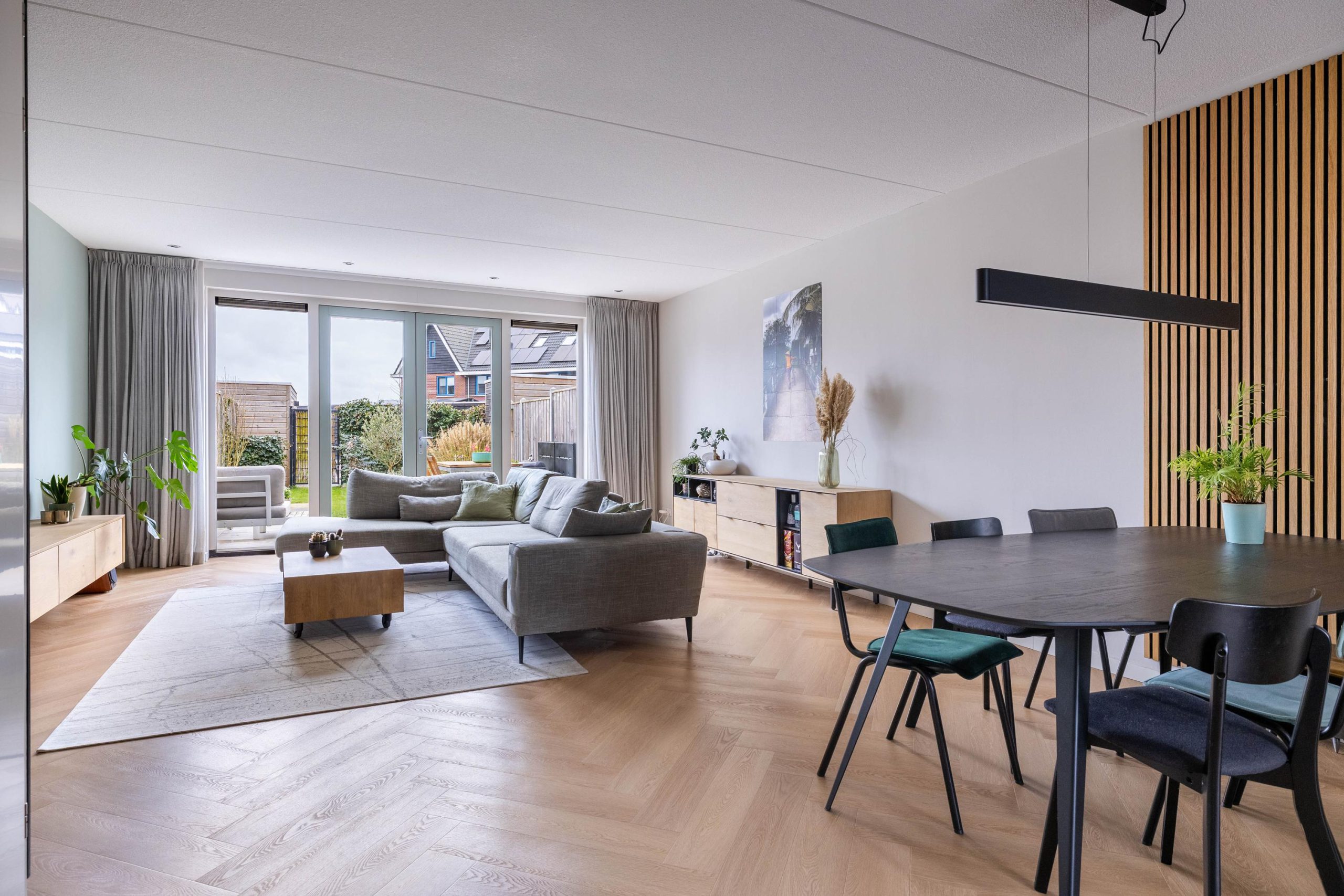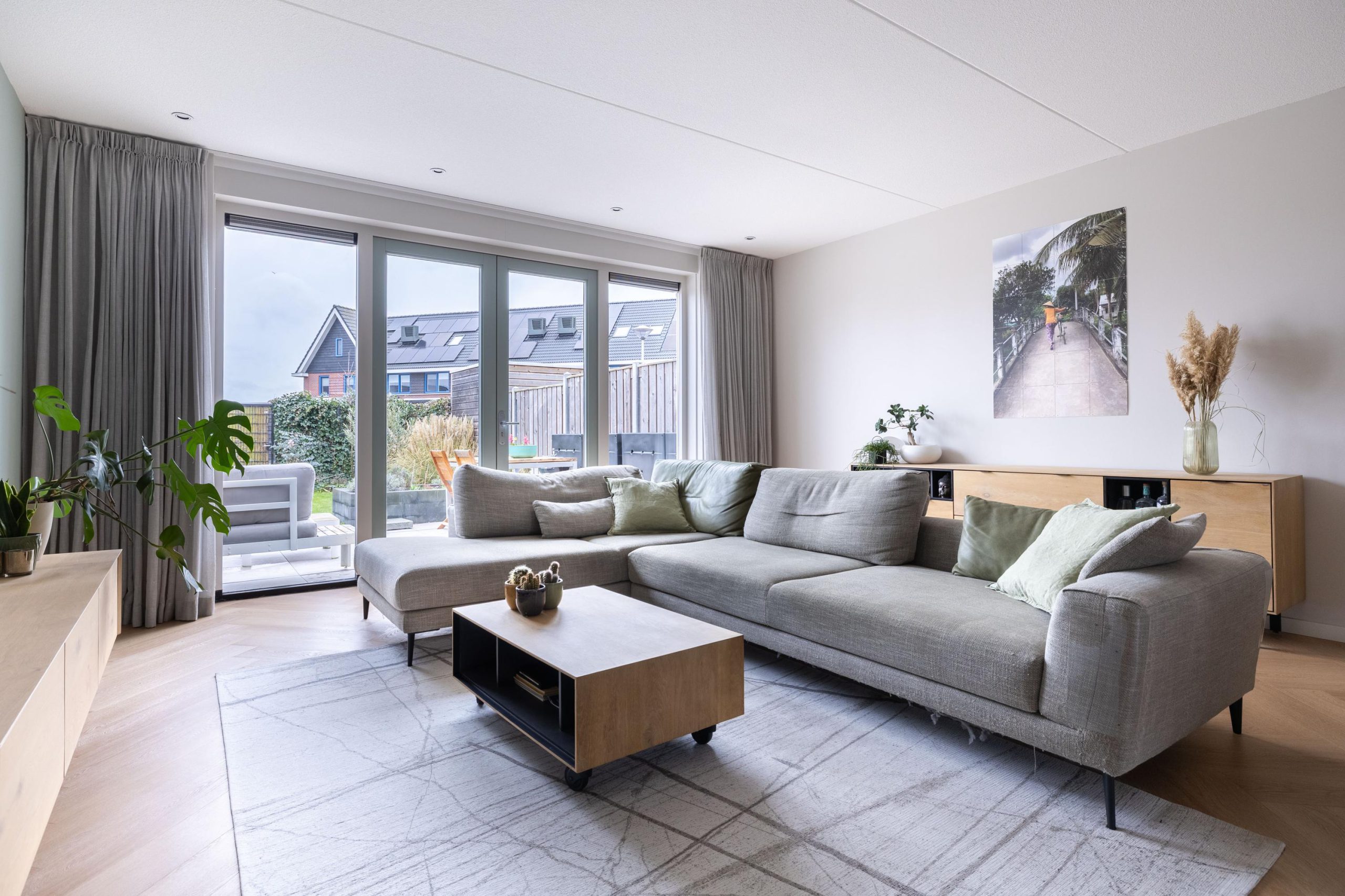 Bij binnenkomst stap je in een lichte hal die toegang geeft tot de leefruimte. De woonkamer is tuingericht en voelt direct ruim en open aan, mede dankzij de openslaande tuindeuren die zorgen voor een mooie verbinding met buiten. De vloerverwarming op de begane grond draagt bij aan het comfort en de strakke afwerking. Hier is het heerlijk wonen, met volop lichtinval en een prettige indeling.