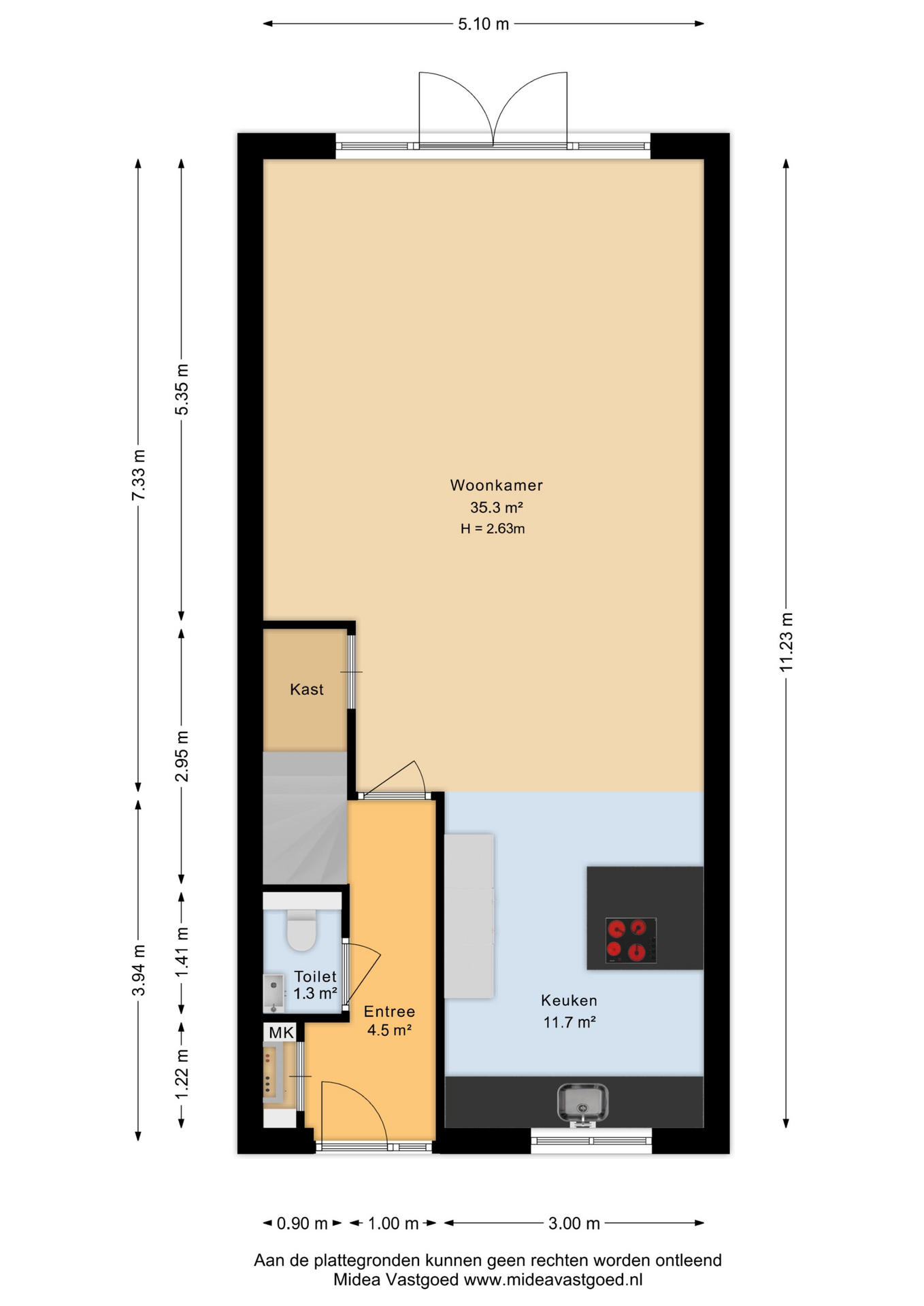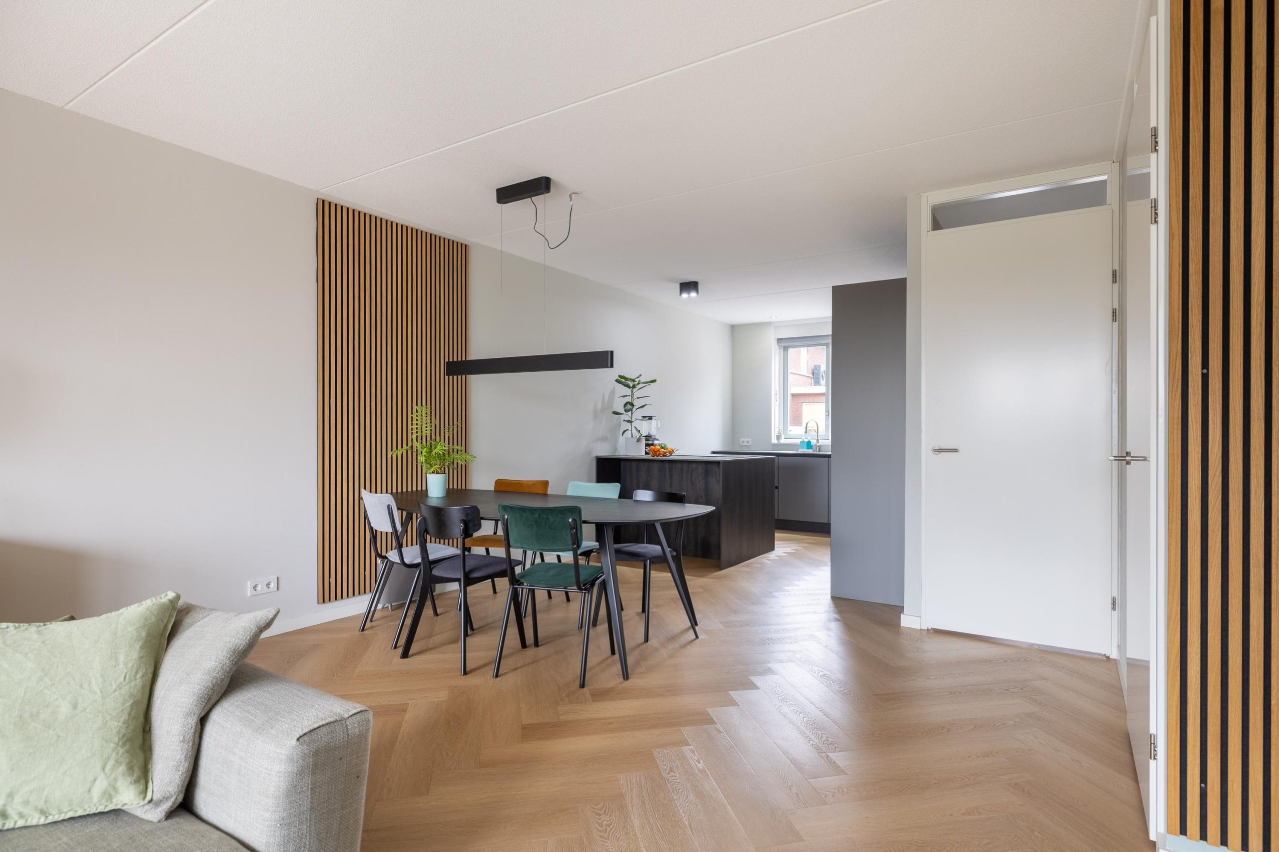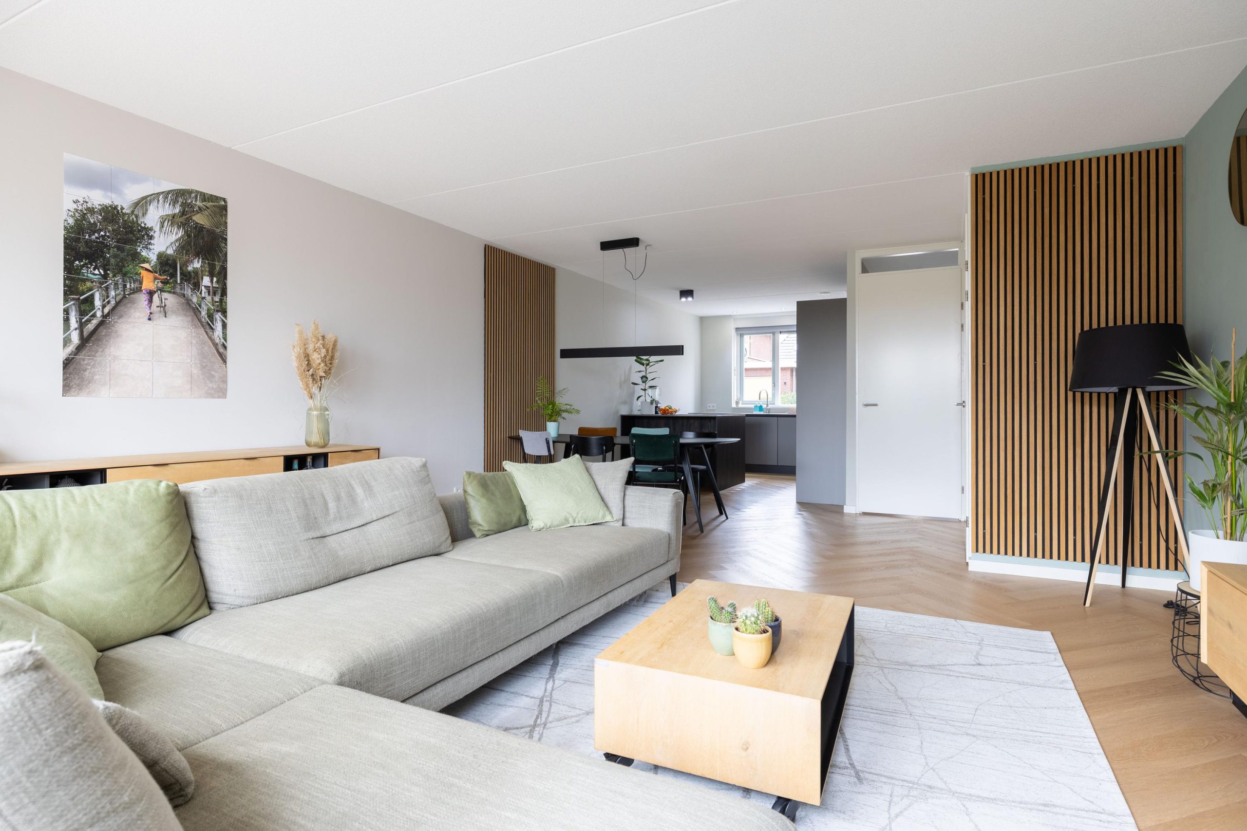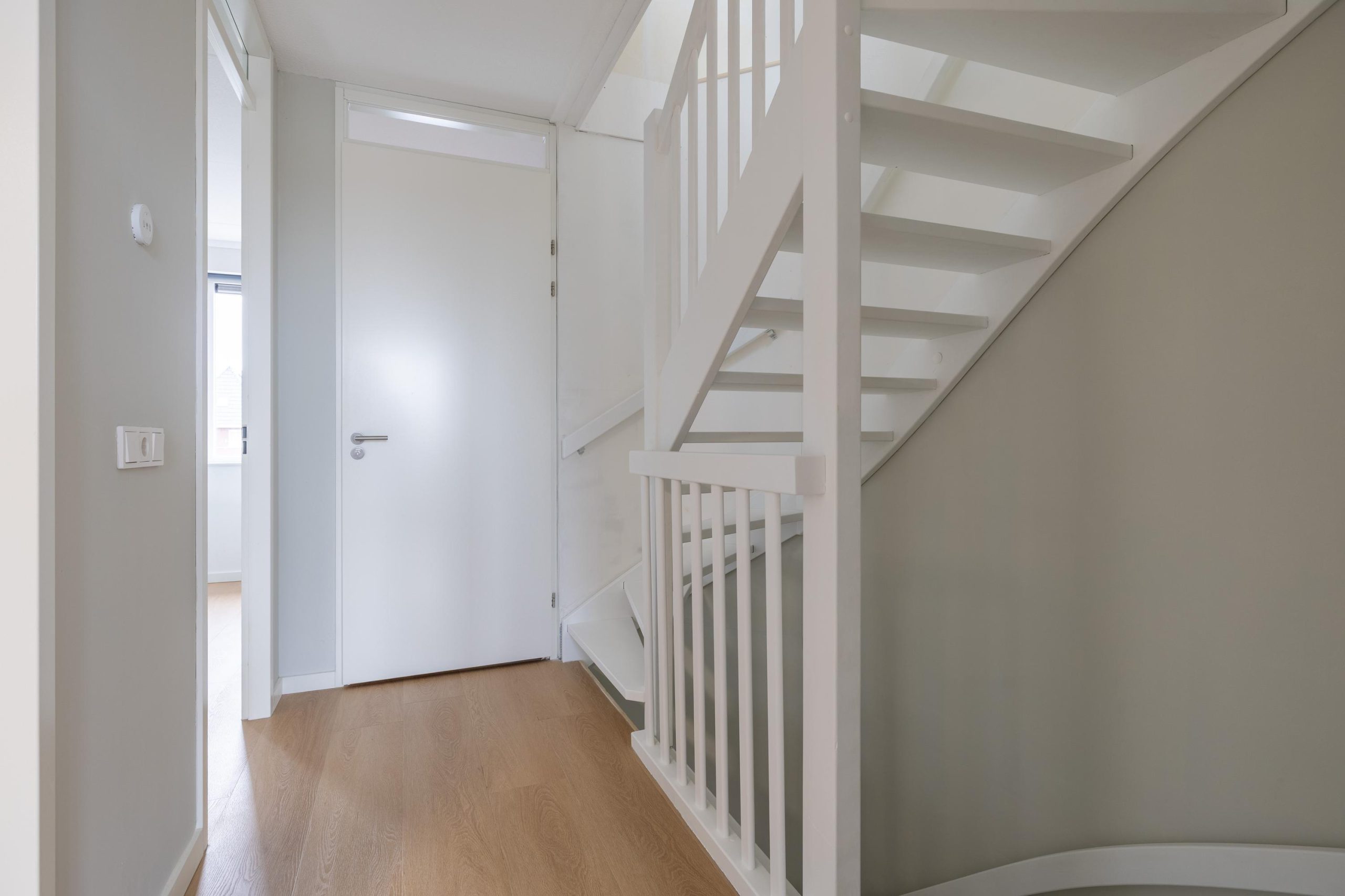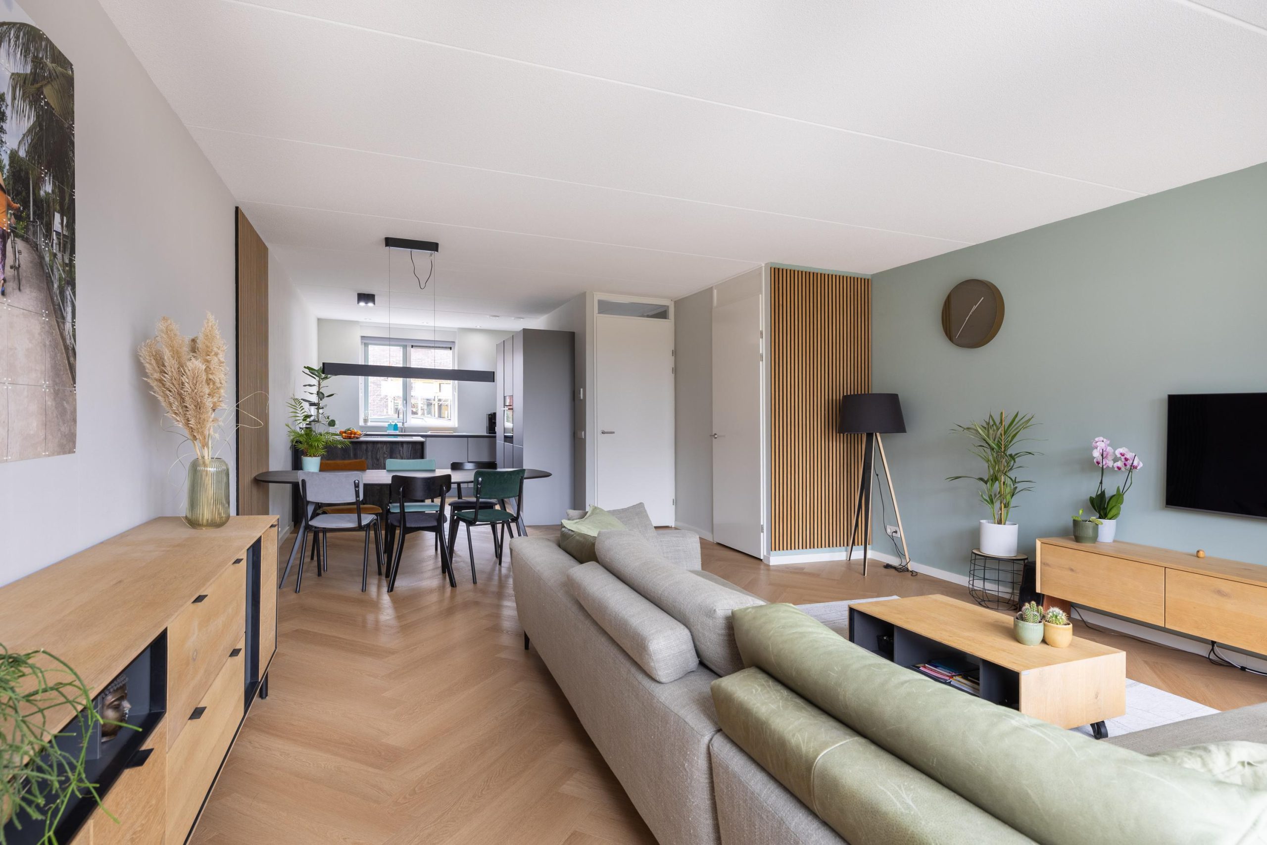 Bij binnenkomst stap je in een lichte hal die toegang geeft tot de leefruimte. De woonkamer is tuingericht en voelt direct ruim en open aan, mede dankzij de openslaande tuindeuren die zorgen voor een mooie verbinding met buiten. De vloerverwarming op de begane grond draagt bij aan het comfort en de strakke afwerking. Hier is het heerlijk wonen, met volop lichtinval en een prettige indeling.
