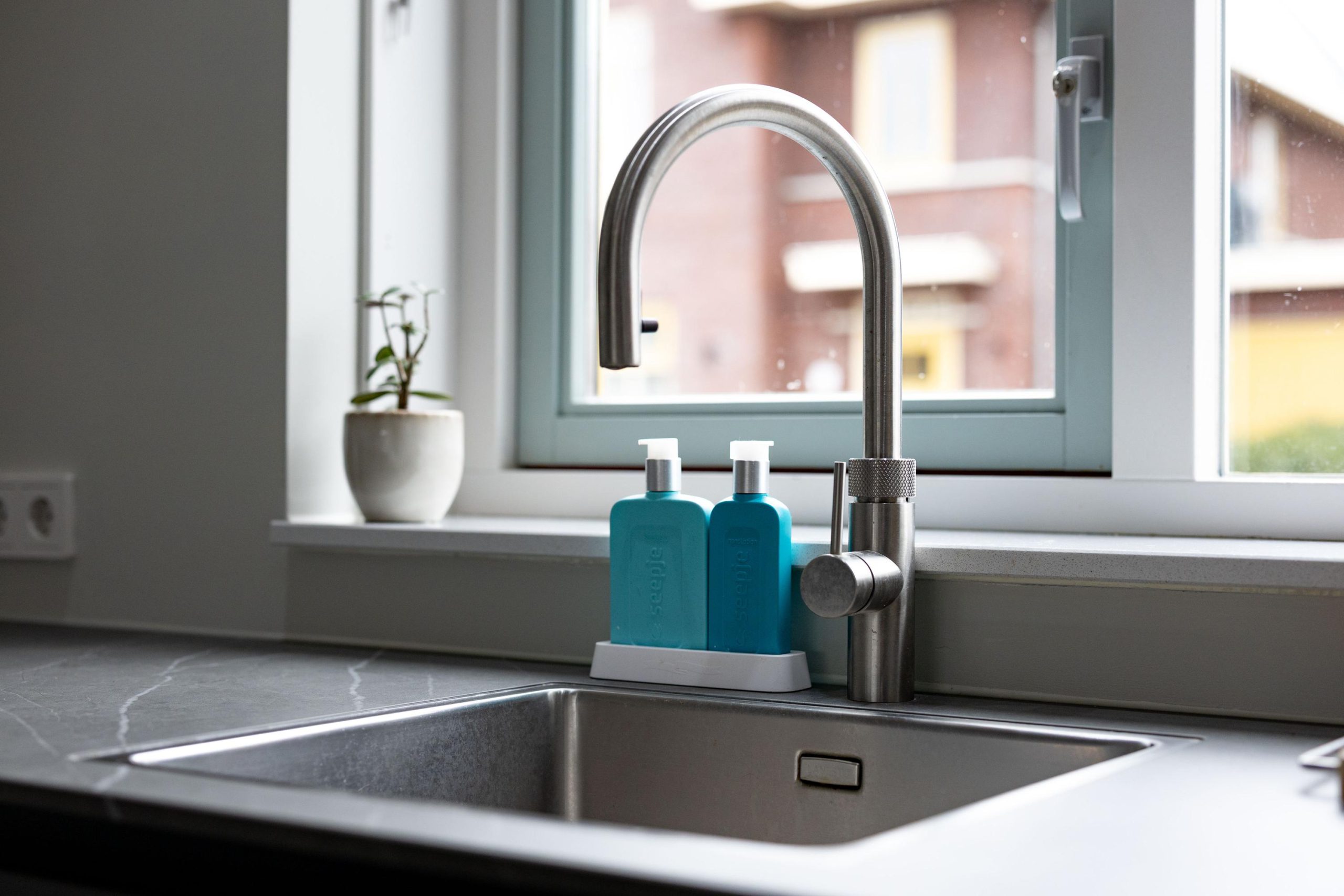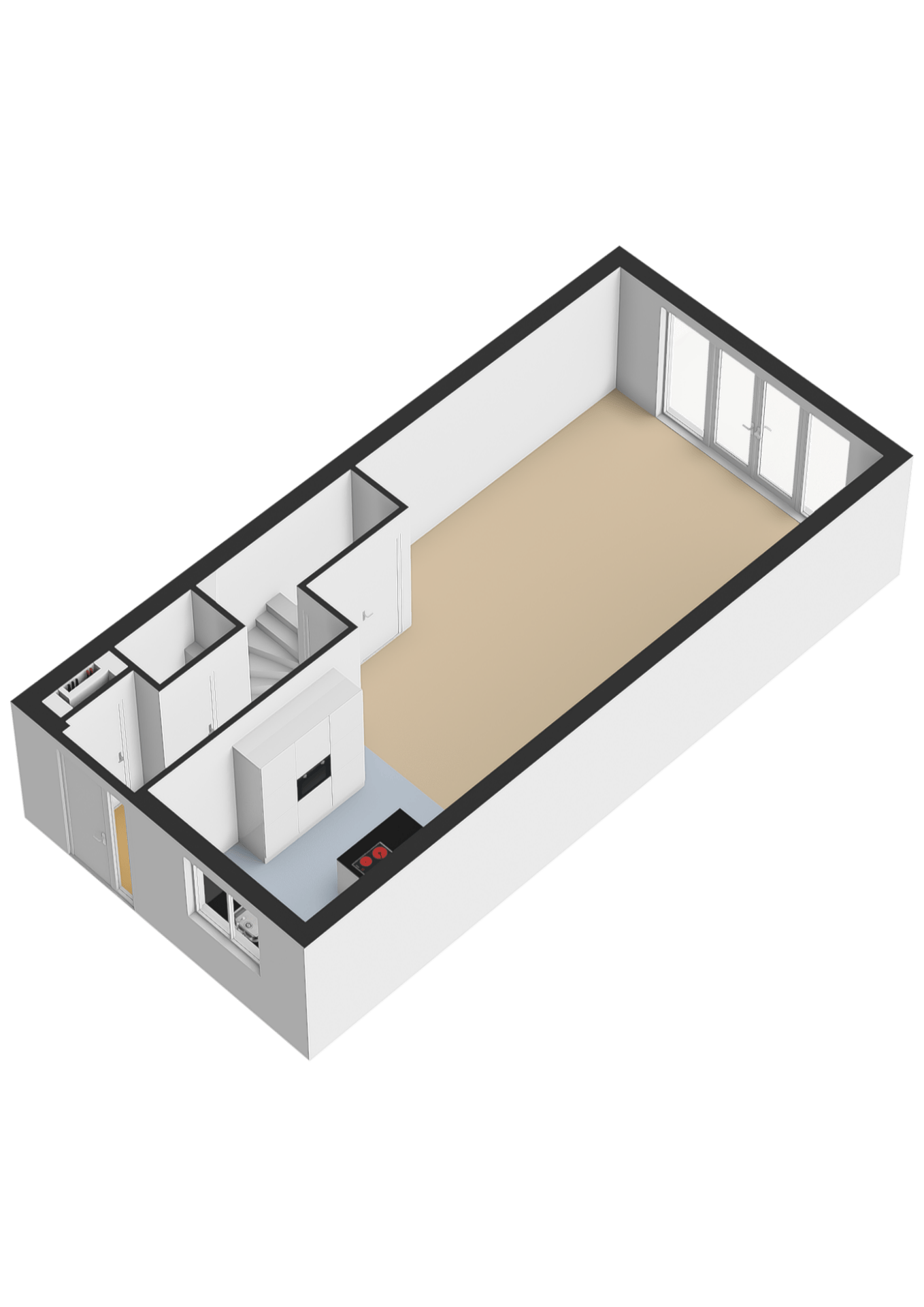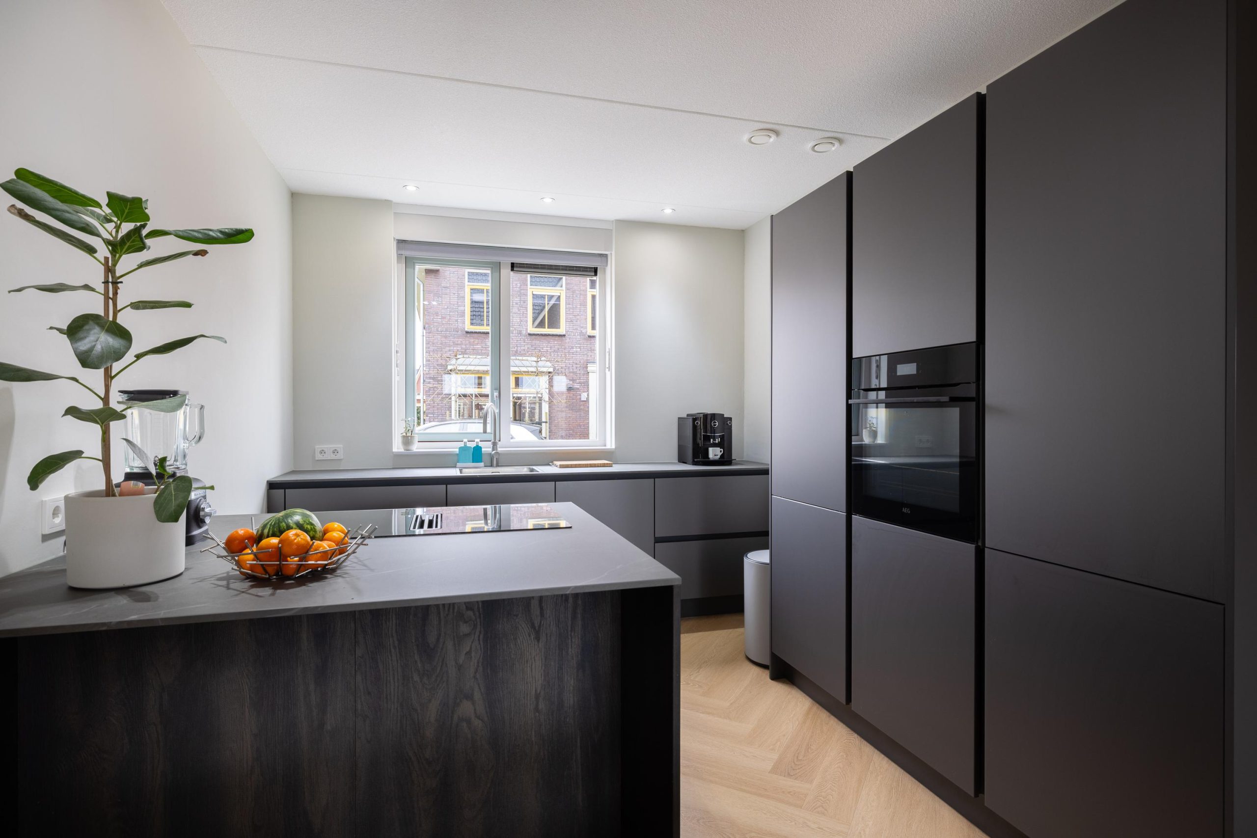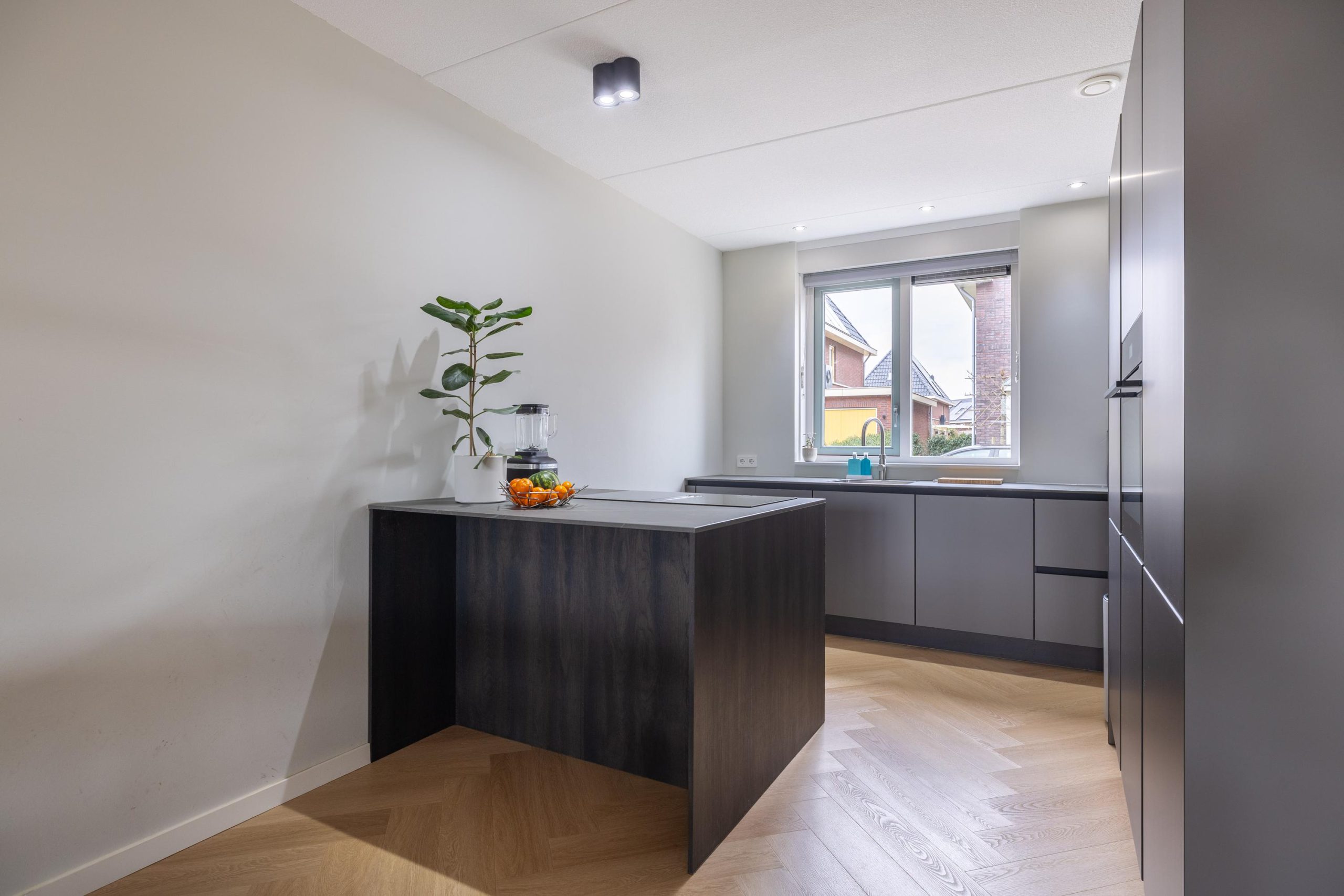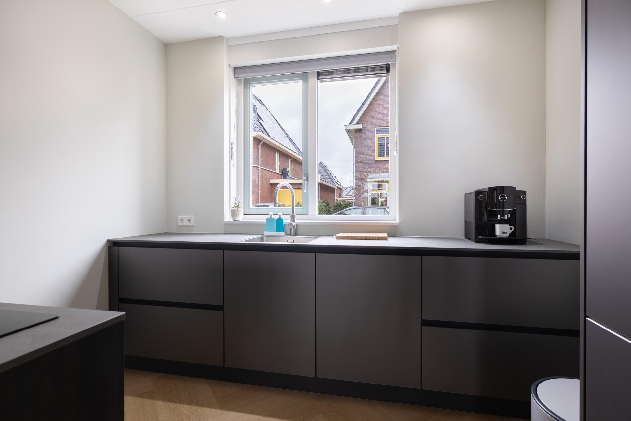 Aan de voorzijde bevindt zich de luxe keuken, uitgevoerd met hoogwaardige materialen en moderne inbouwapparatuur. De ruimte is strak vormgegeven en biedt alles wat je nodig hebt om uitgebreid te koken en te genieten. De aanwezigheid van een waterontharder maakt het comfort hier compleet.