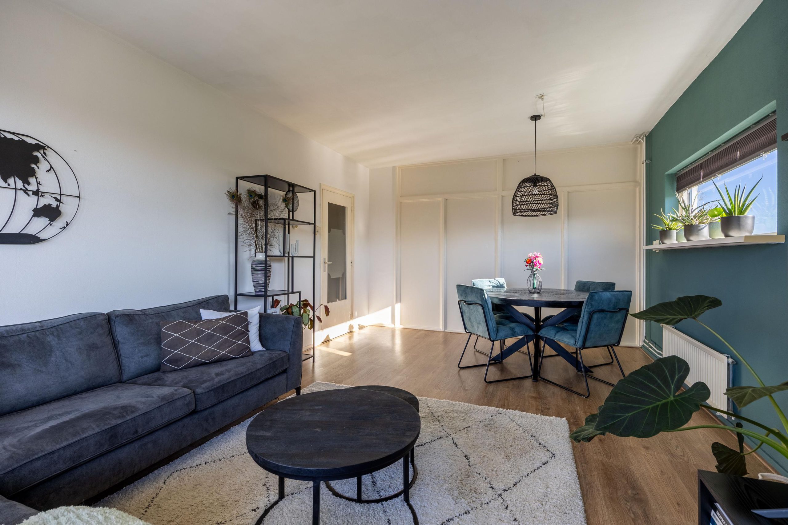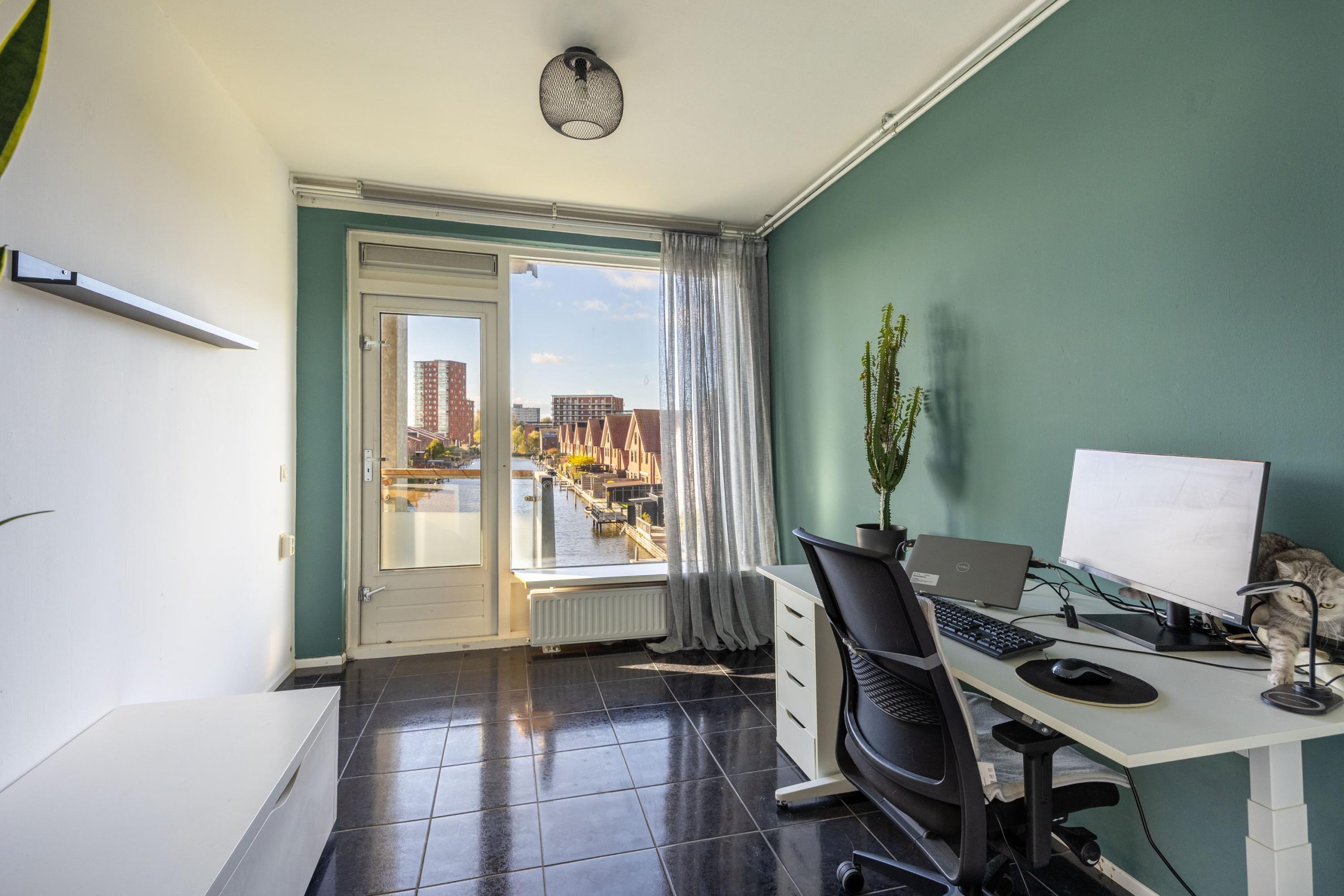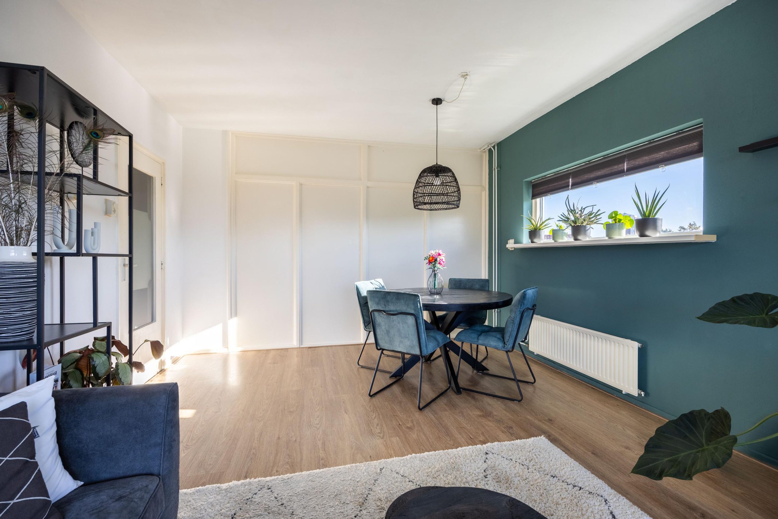 De woonkamer is een fijne, lichte ruimte met een verzorgde laminaatvloer en kunststof kozijnen. Het uitzicht over het water zorgt voor rust en ruimte – elke dag opnieuw een prachtig plaatje om naar te kijken.