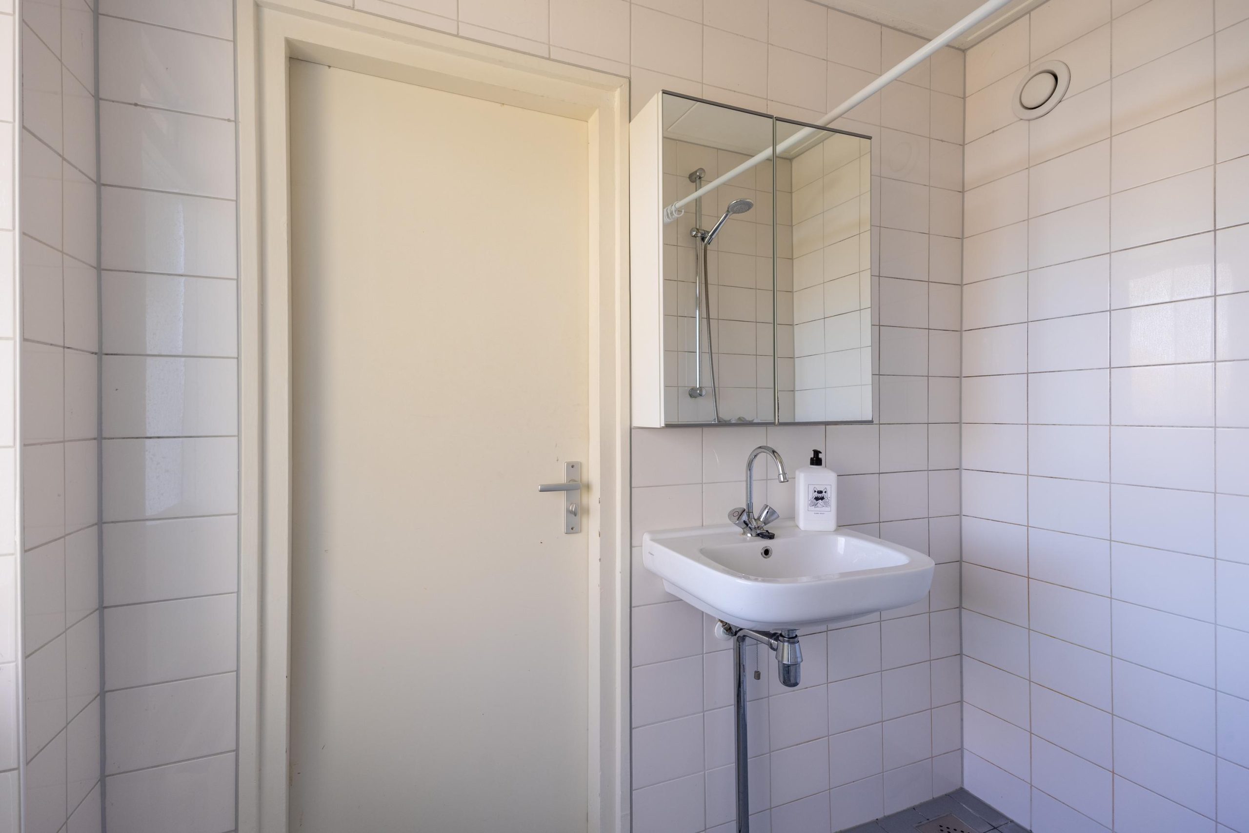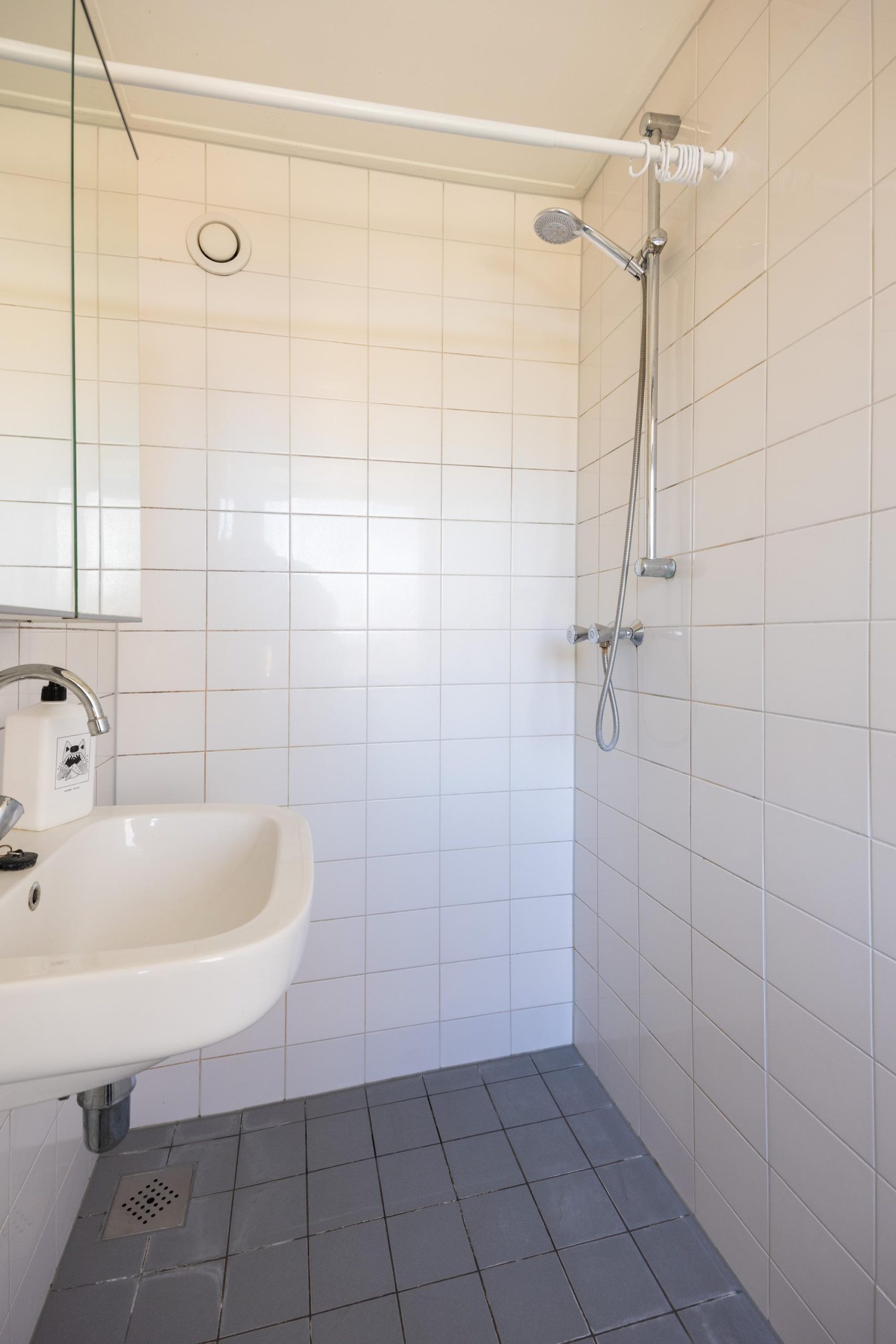 De badkamer is eenvoudig maar netjes, voorzien van een douche en wastafel – overzichtelijk en praktisch ingericht.