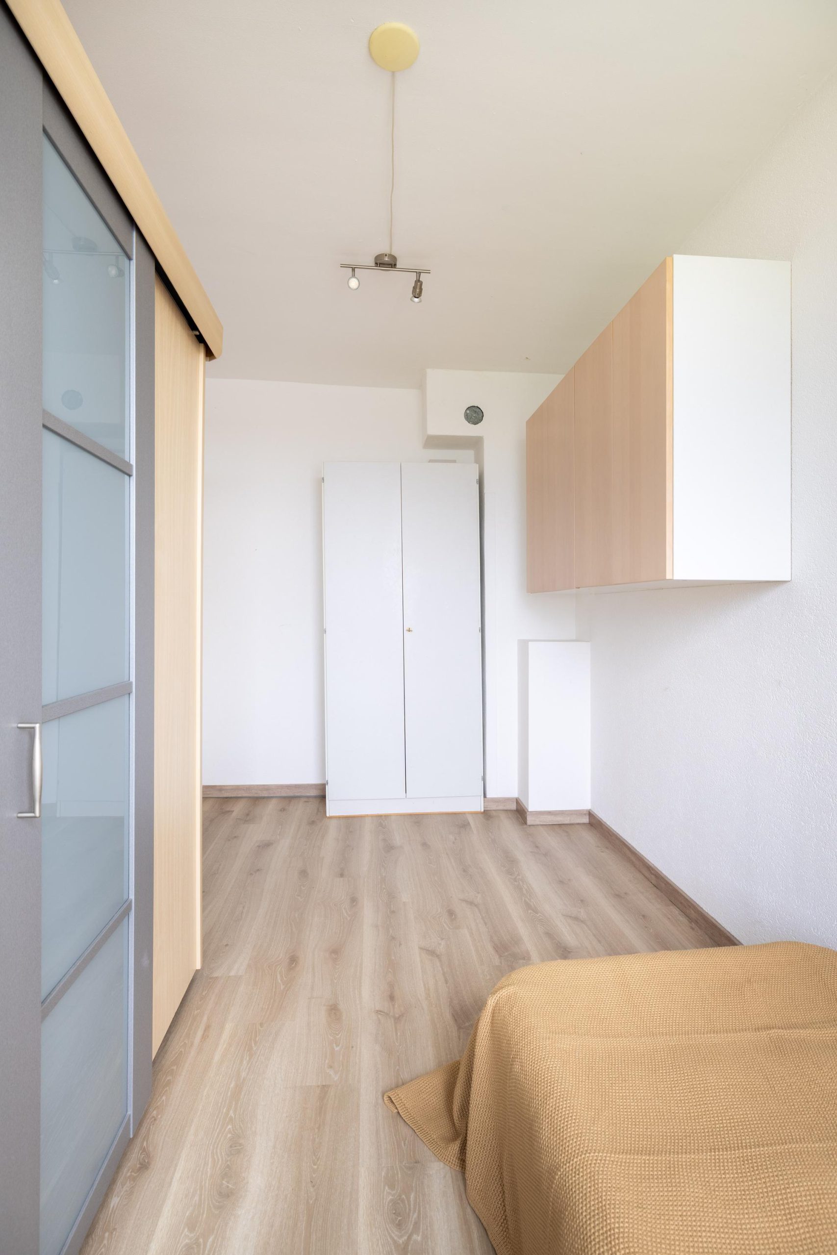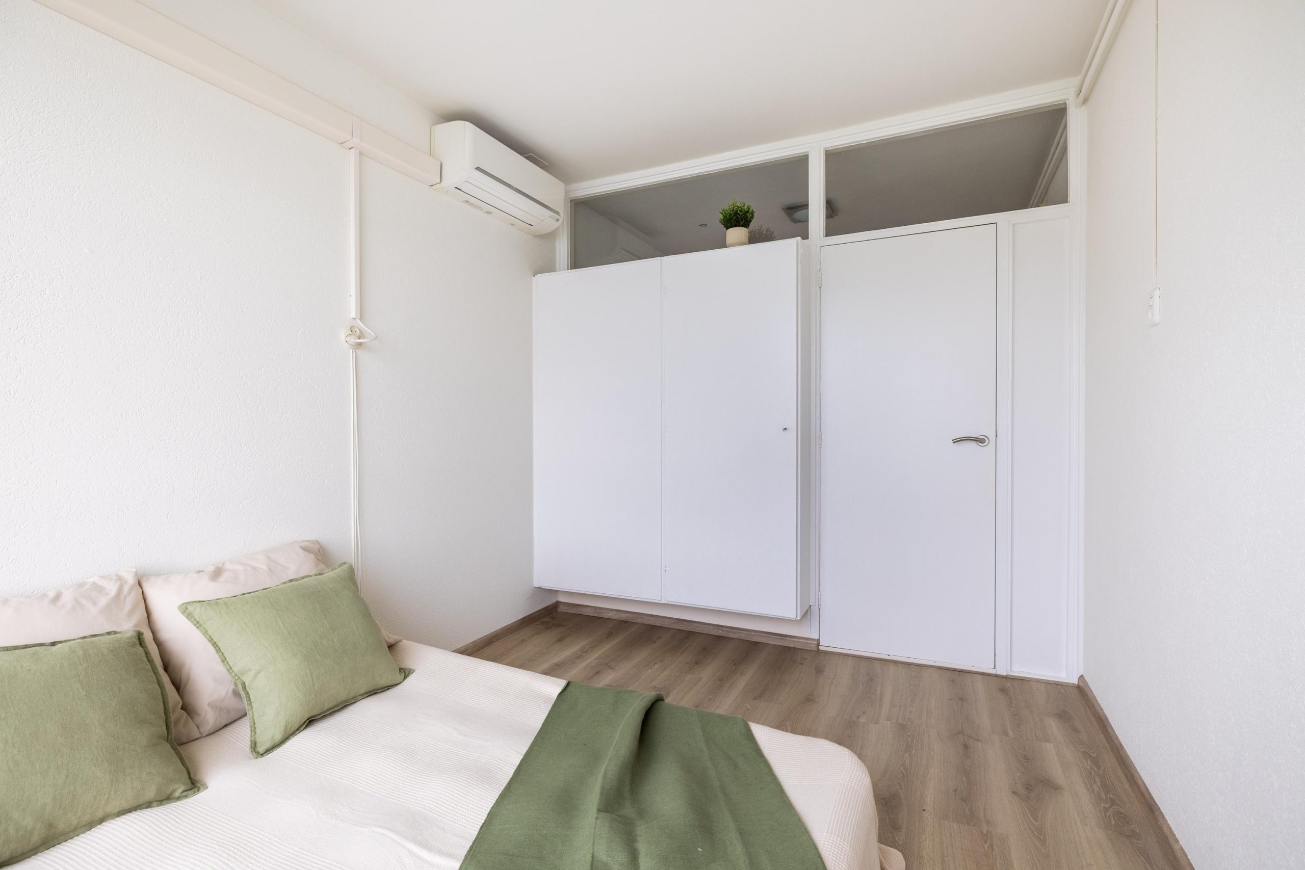 Aan de rustige achterzijde liggen twee slaapkamers. De hoofdslaapkamer heeft toegang tot het balkon en is uitgerust met airco, waardoor het hier in elk seizoen comfortabel is. De tweede slaapkamer is licht en compact en geschikt als werkkamer, logeerplek of hobbyruimte.