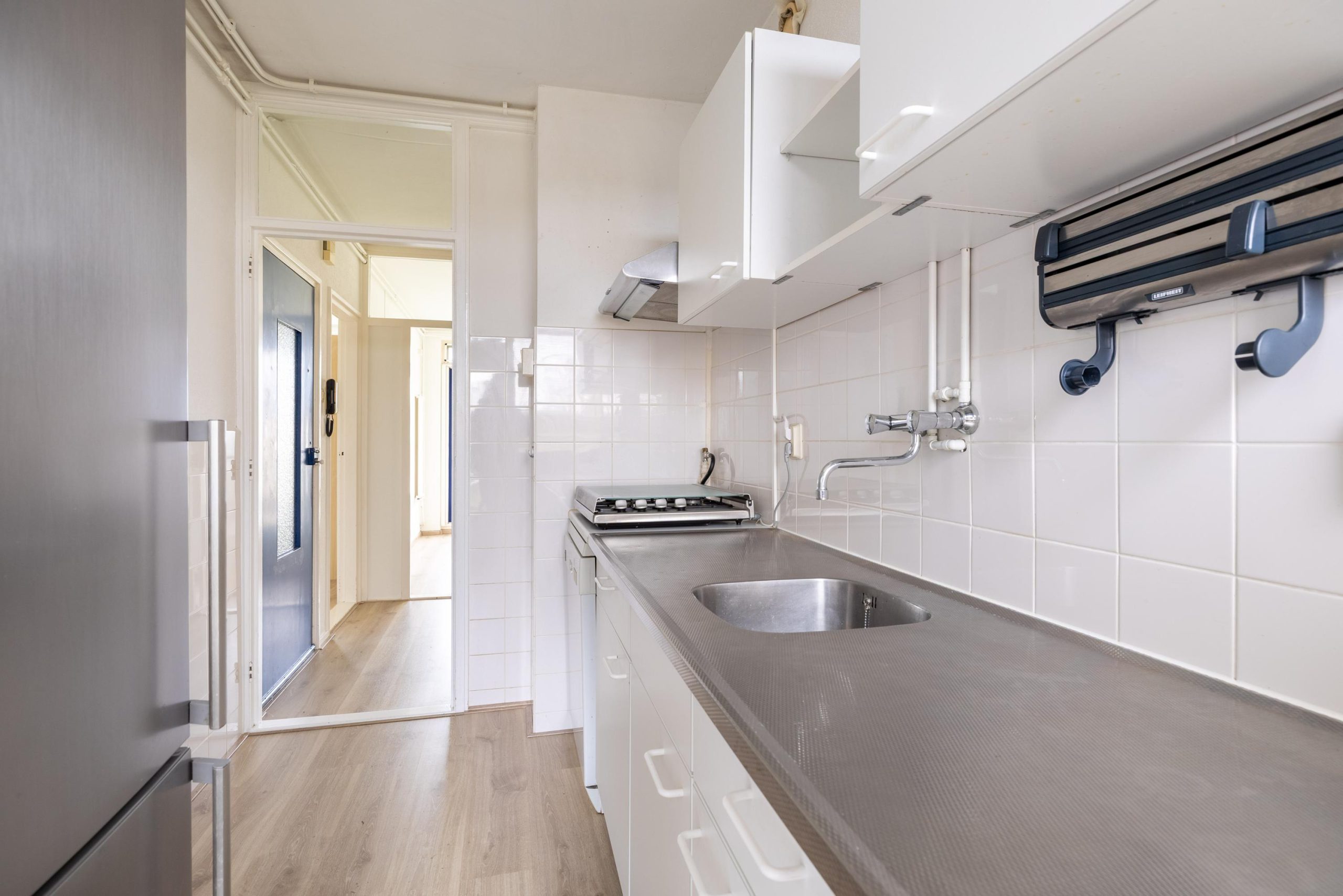 De keuken ligt eveneens aan de rechterzijde. Eenvoudig maar praktisch, voorzien van een afzuigkap, losse vaatwasser, los gastoestel en ruimte voor een wasmachine. Vanuit hier stap je direct het balkon op, ideaal voor een frisse start van de dag of een momentje buiten tijdens het koken.