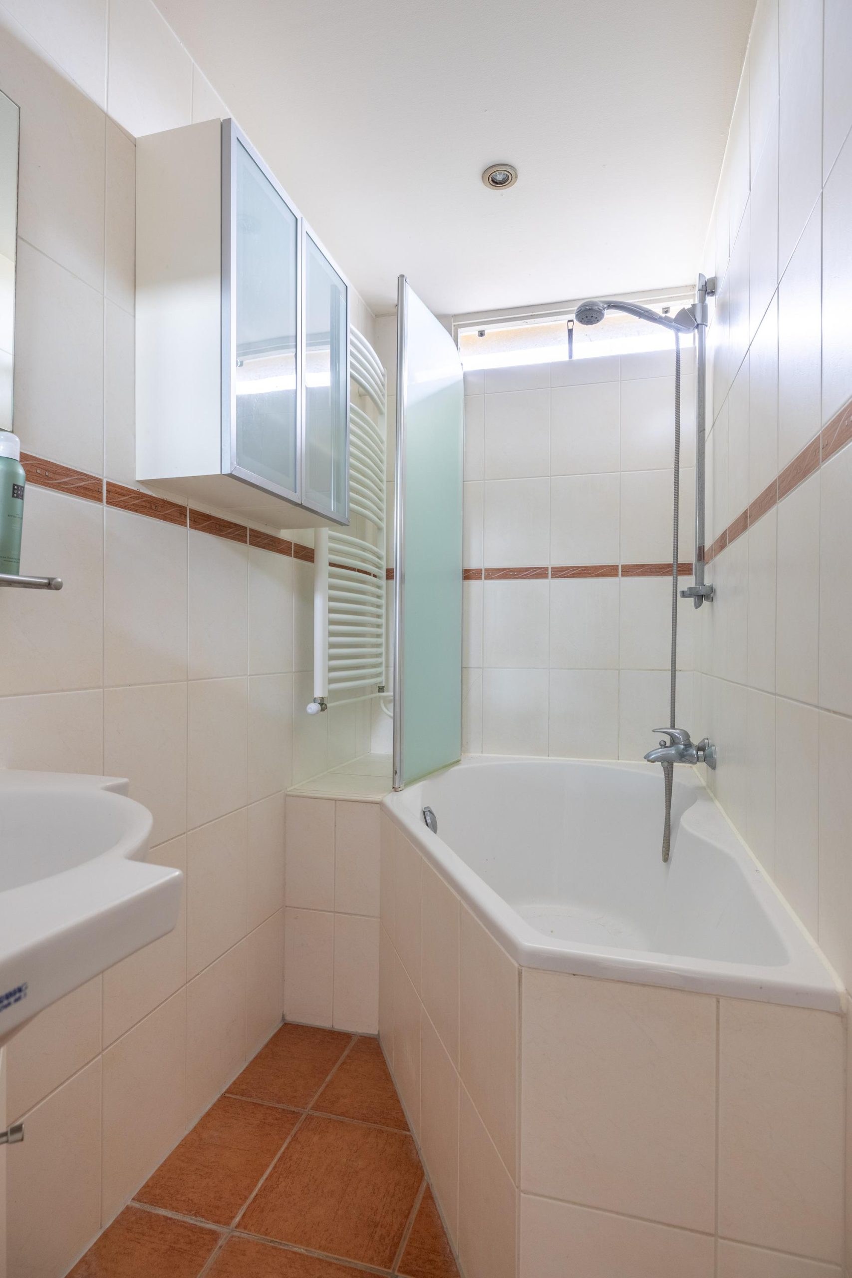 De badkamer is functioneel en compleet ingericht met een ligbad, toilet en wastafel. Overzichtelijk, praktisch en alles bij de hand.