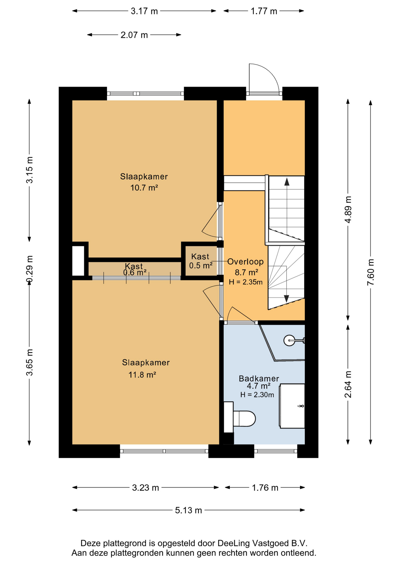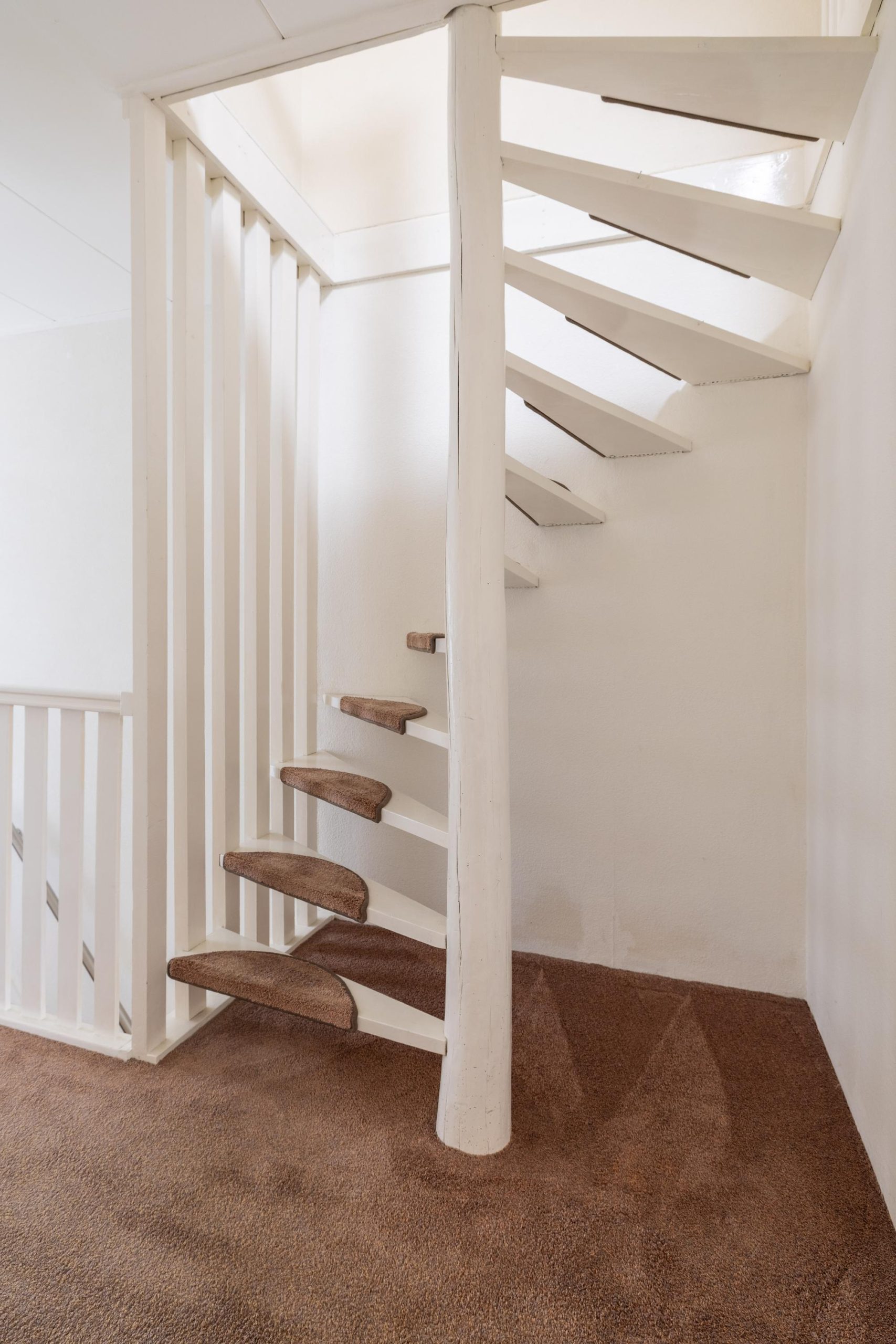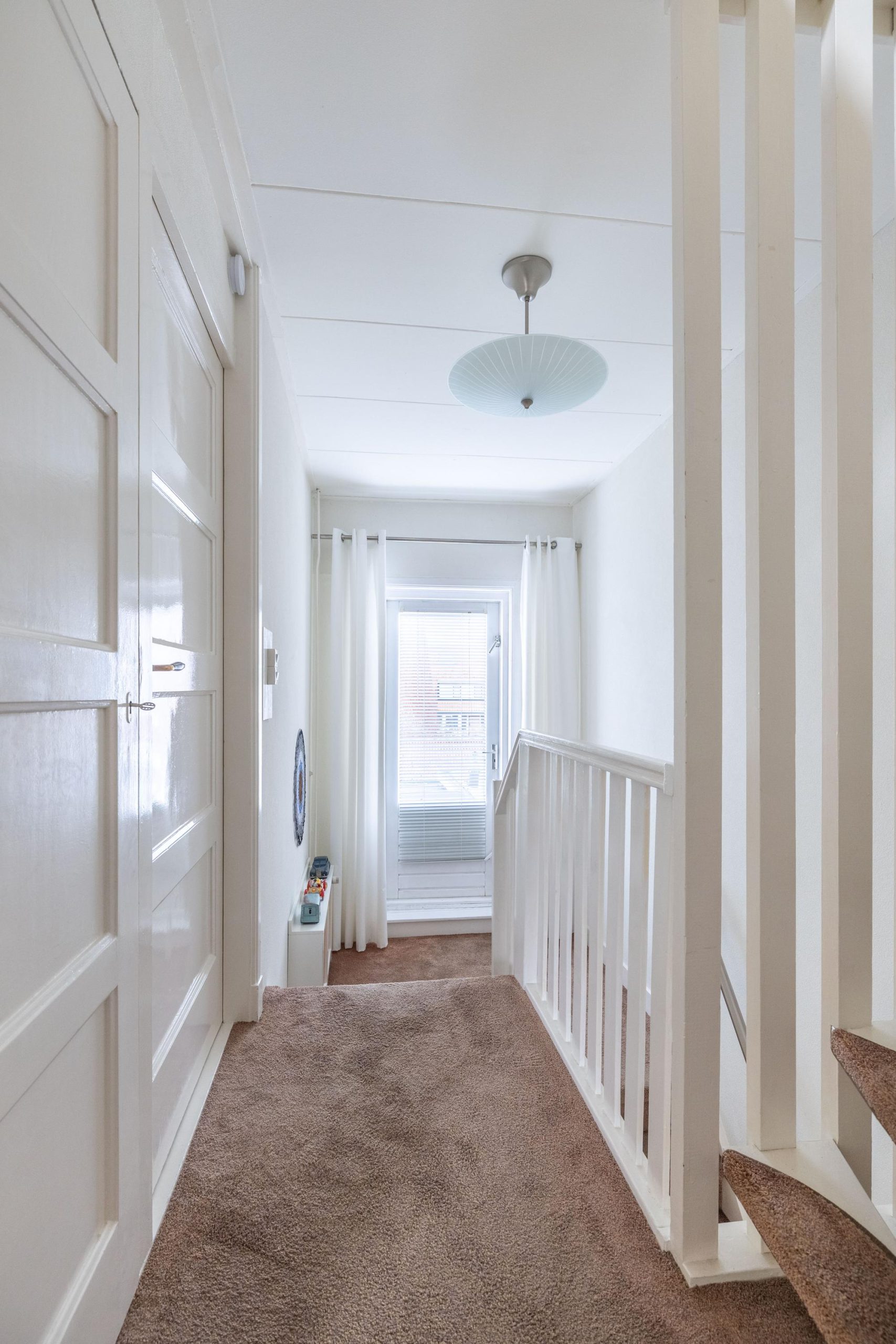 Via de trap gaan we naar de eerste verdieping, waar de speelse indeling direct opvalt. Vanaf de overloop zijn twee slaapkamers toegankelijk, waarvan één met vaste kast. Ook is er nog een extra vaste kast op de overloop. De badkamer is modern uitgevoerd en voorzien van een douche, wastafel met meubel en een tweede toilet.