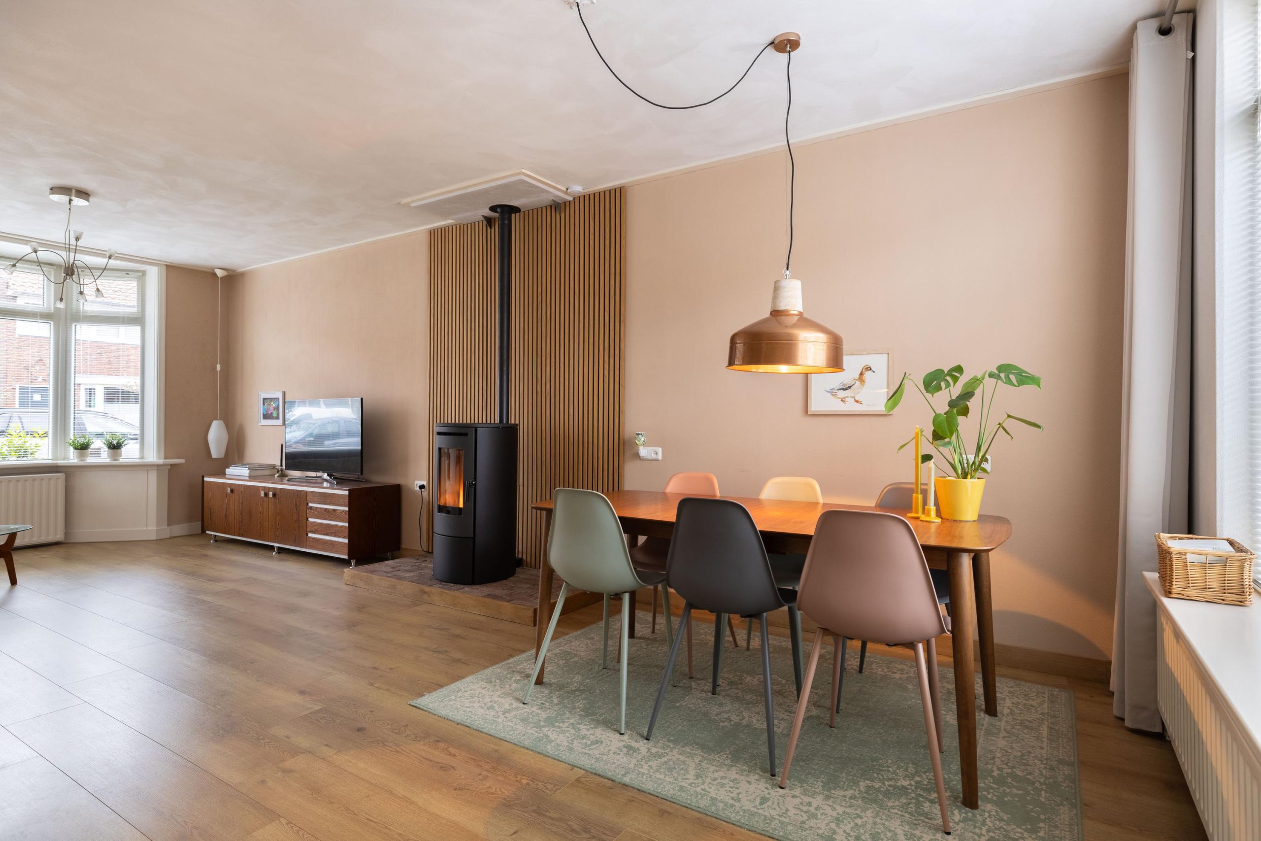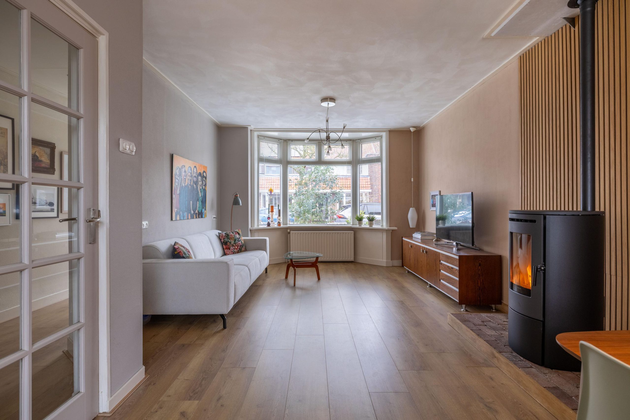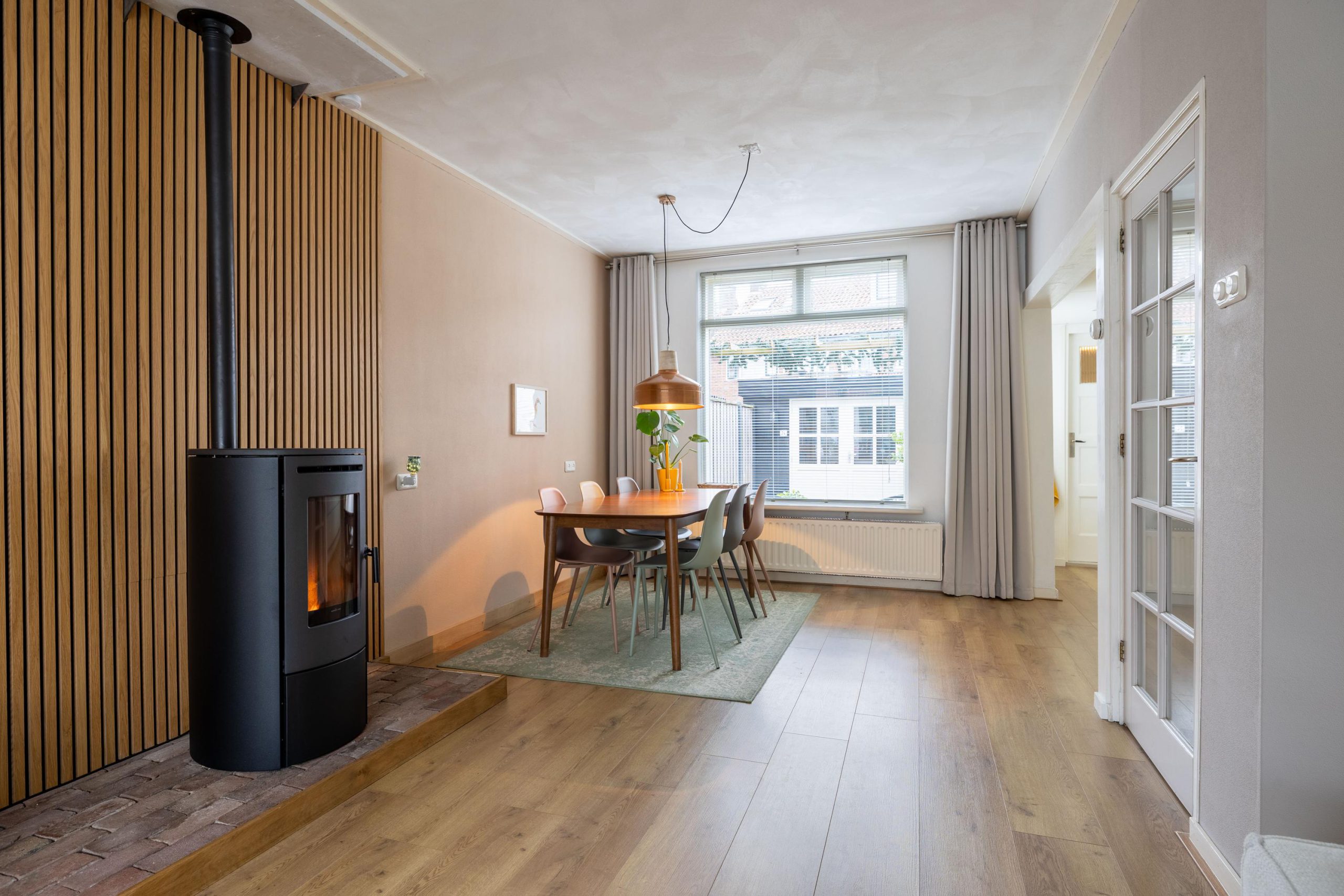 Achter deze voordeur komen we in een diepe, lichte hal met open trapopgang en toegang tot de meterkast. De ruimte voelt direct uitnodigend aan. Zodra we de woonkamer binnenlopen, valt het oog meteen op de stijlvolle pelletkachel met daarachter een modern houten wandpaneel. Een echte sfeermaker, die perfect past bij het karakter van het huis. De erker aan de voorzijde zorgt voor veel licht en die typische jaren ’30 charme. Aan de achterzijde is ruimte voor een gezellige eethoek met uitzicht op de tuin. Een heerlijke plek om samen te komen.
