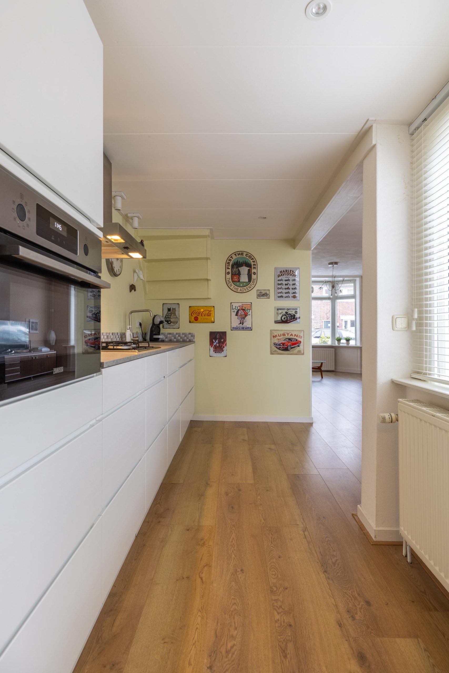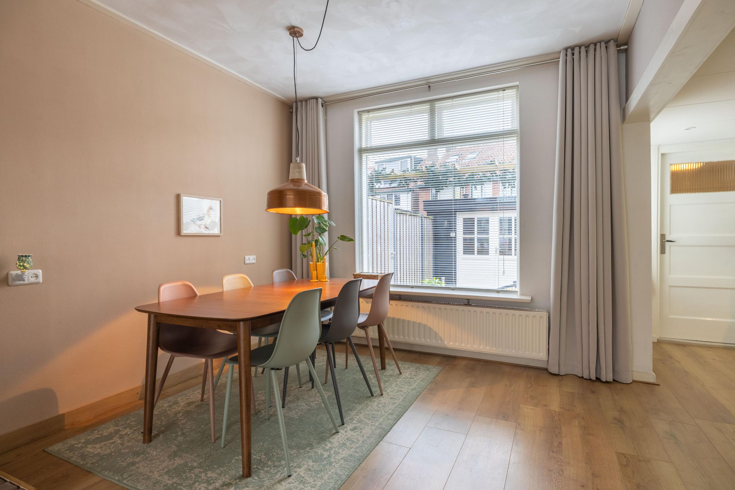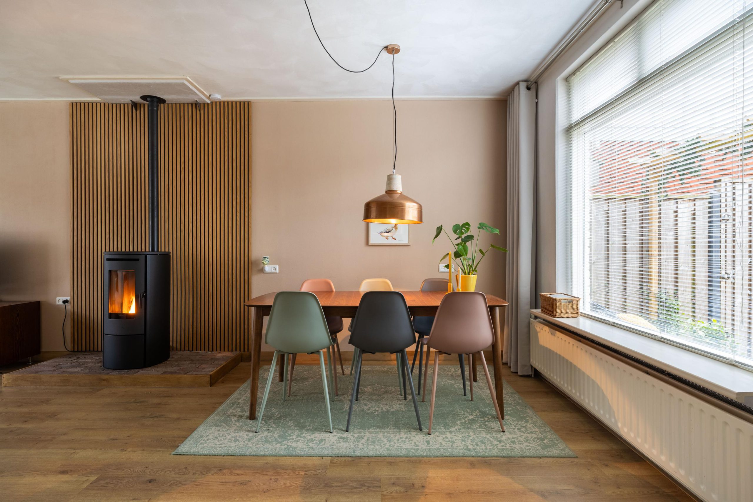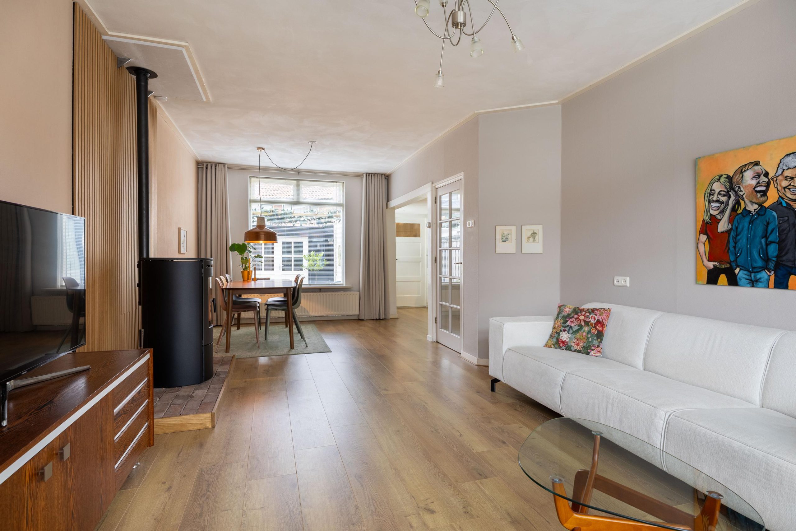 Achter deze voordeur komen we in een diepe, lichte hal met open trapopgang en toegang tot de meterkast. De ruimte voelt direct uitnodigend aan. Zodra we de woonkamer binnenlopen, valt het oog meteen op de stijlvolle pelletkachel met daarachter een modern houten wandpaneel. Een echte sfeermaker, die perfect past bij het karakter van het huis. De erker aan de voorzijde zorgt voor veel licht en die typische jaren ’30 charme. Aan de achterzijde is ruimte voor een gezellige eethoek met uitzicht op de tuin. Een heerlijke plek om samen te komen.