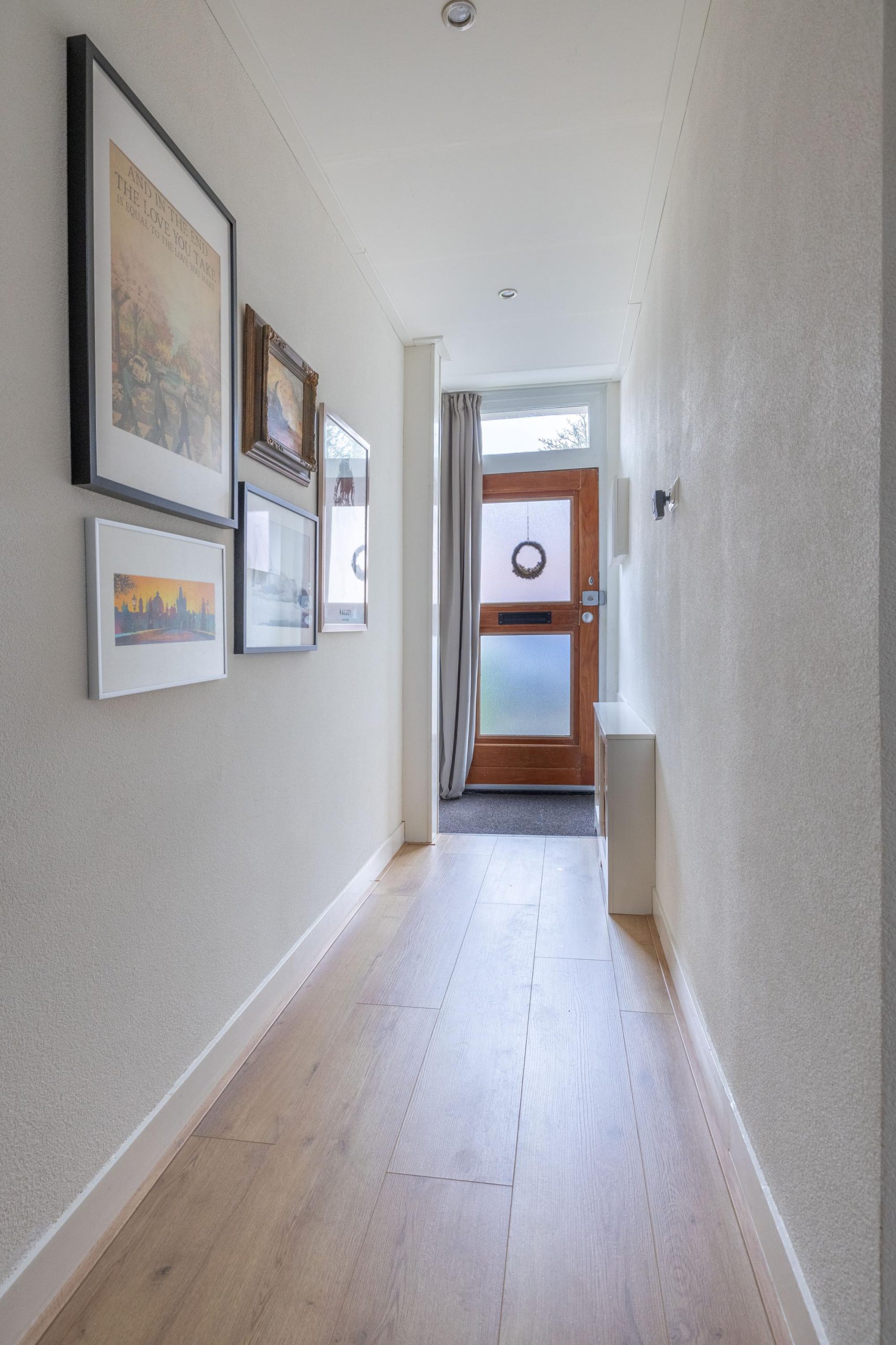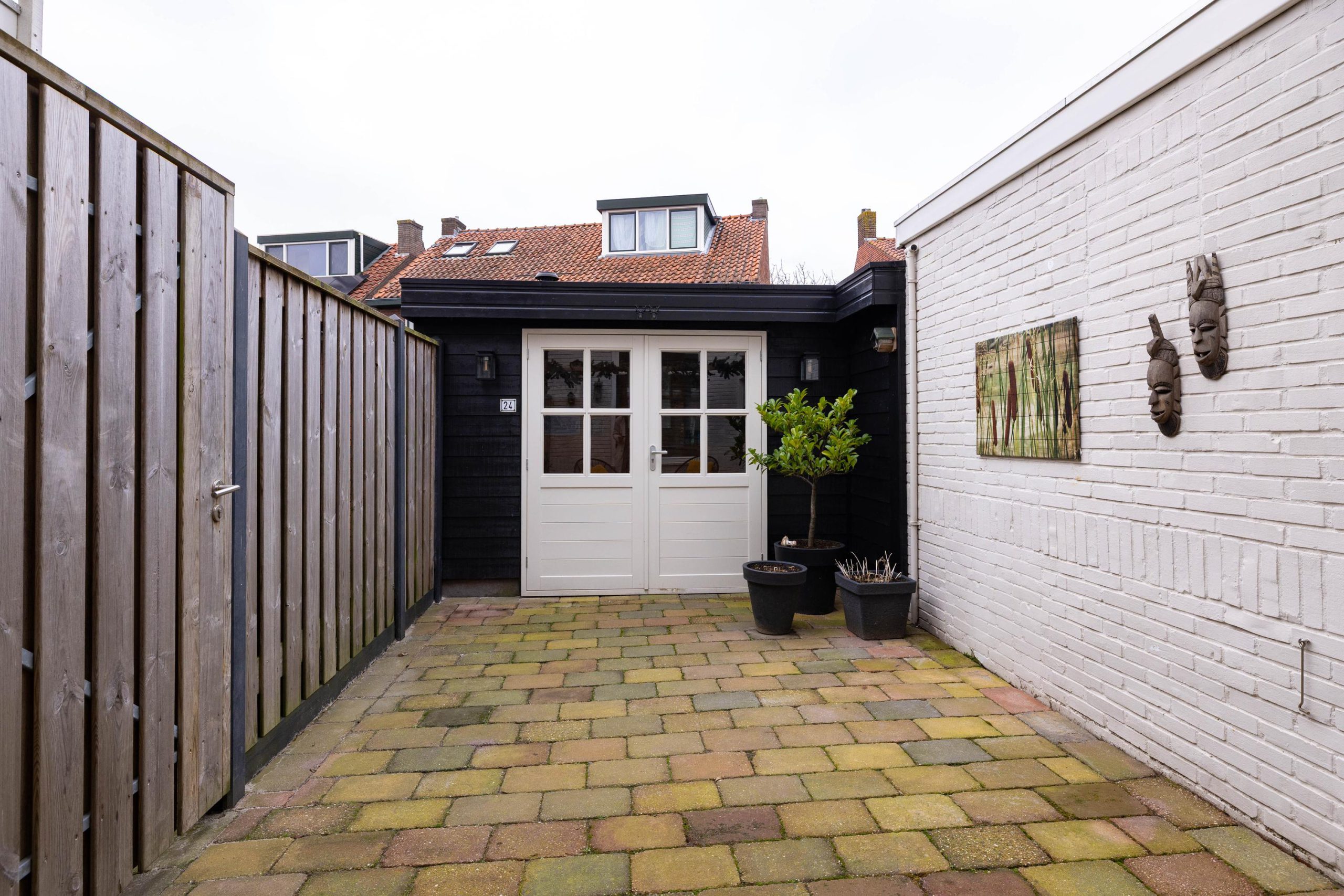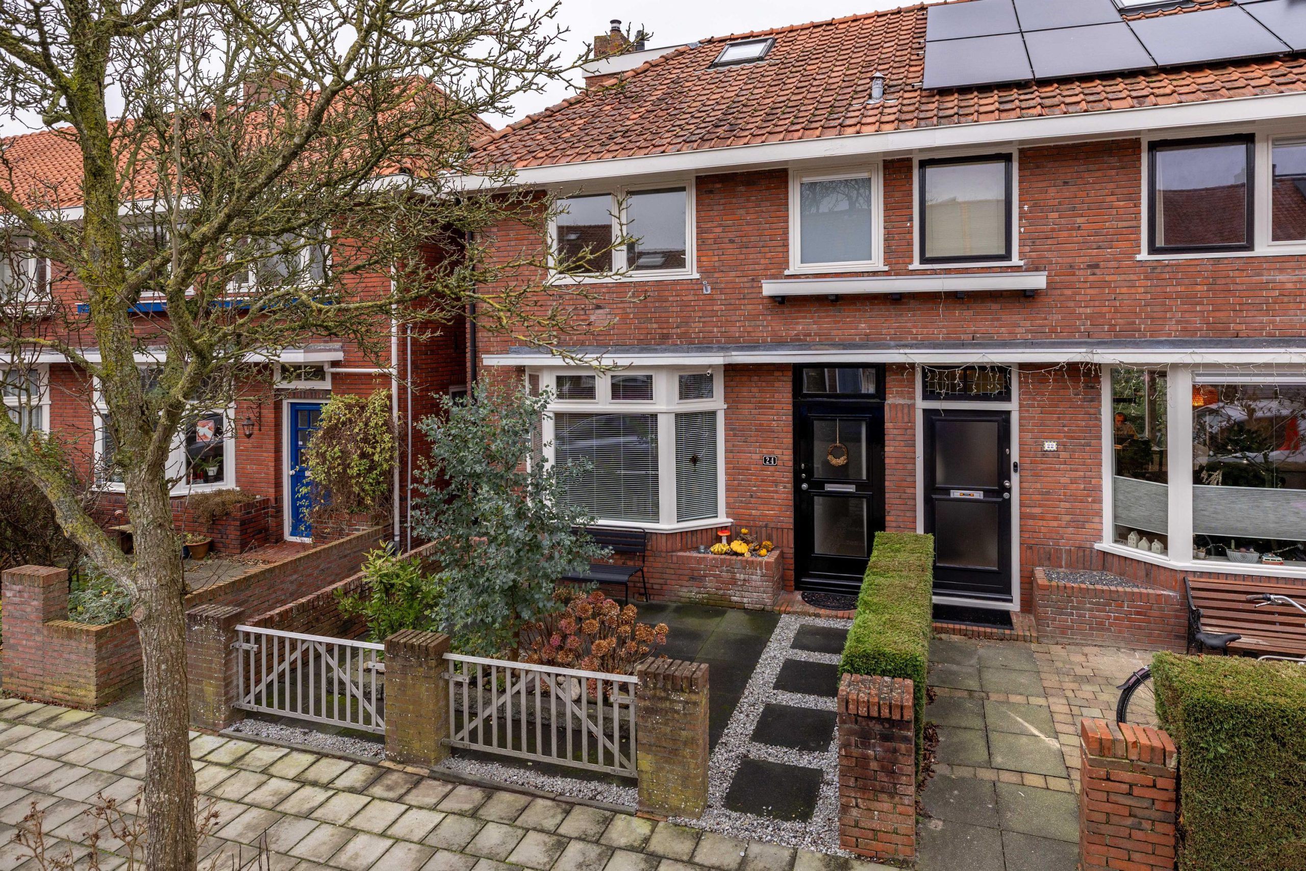 De Pieter de Hooghstraat zelf ademt de sfeer van de jaren ’30. Een fijne straat met karakter, waar nummer 24 direct opvalt dankzij de nette gevel, de verzorgde voortuin met een combinatie van bestrating en groen en natuurlijk de erker die de woning een karakteristieke uitstraling geeft. Via de steeg aan de zijkant bereiken we de achtertuin, maar eerst stappen we naar binnen via de voordeur.