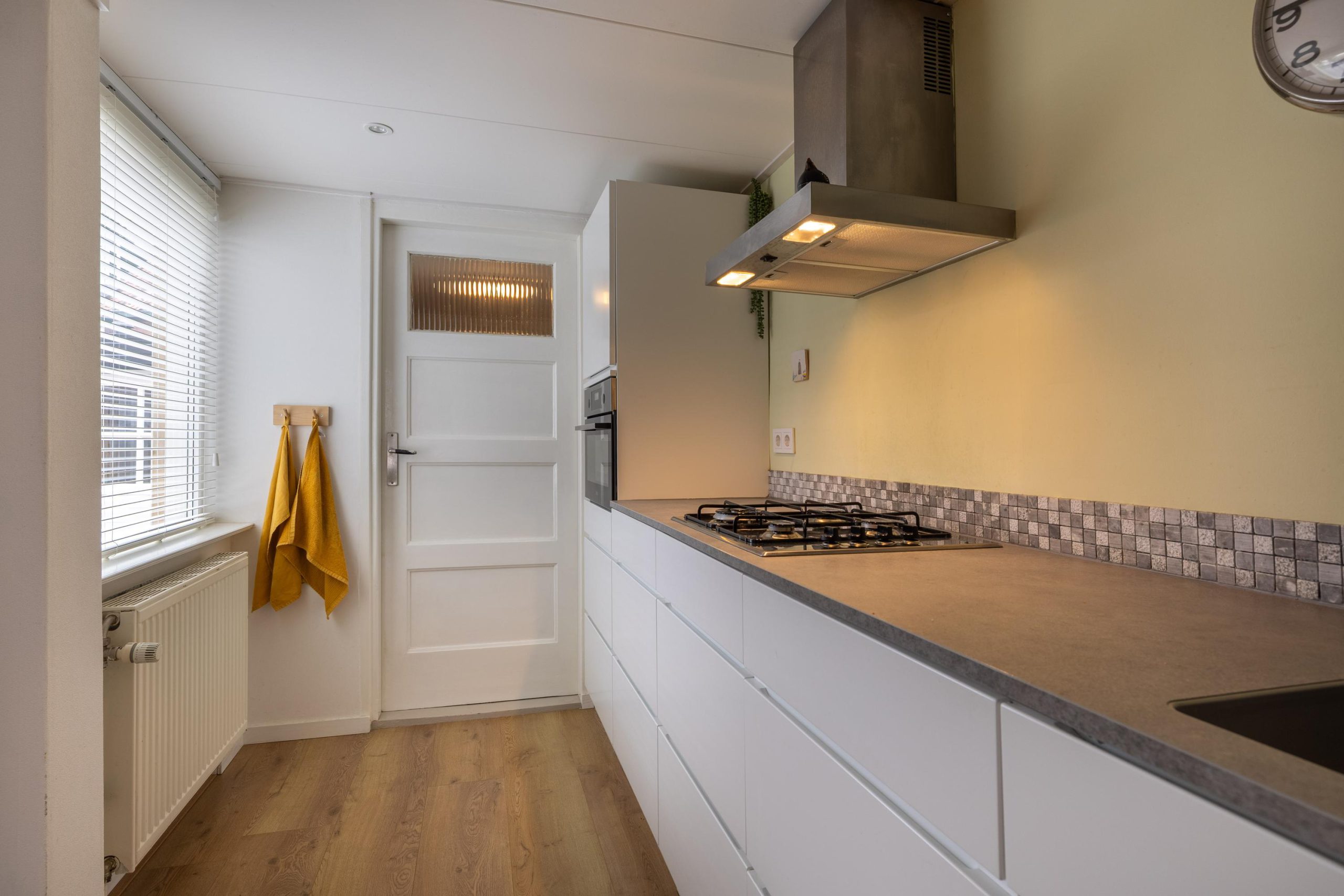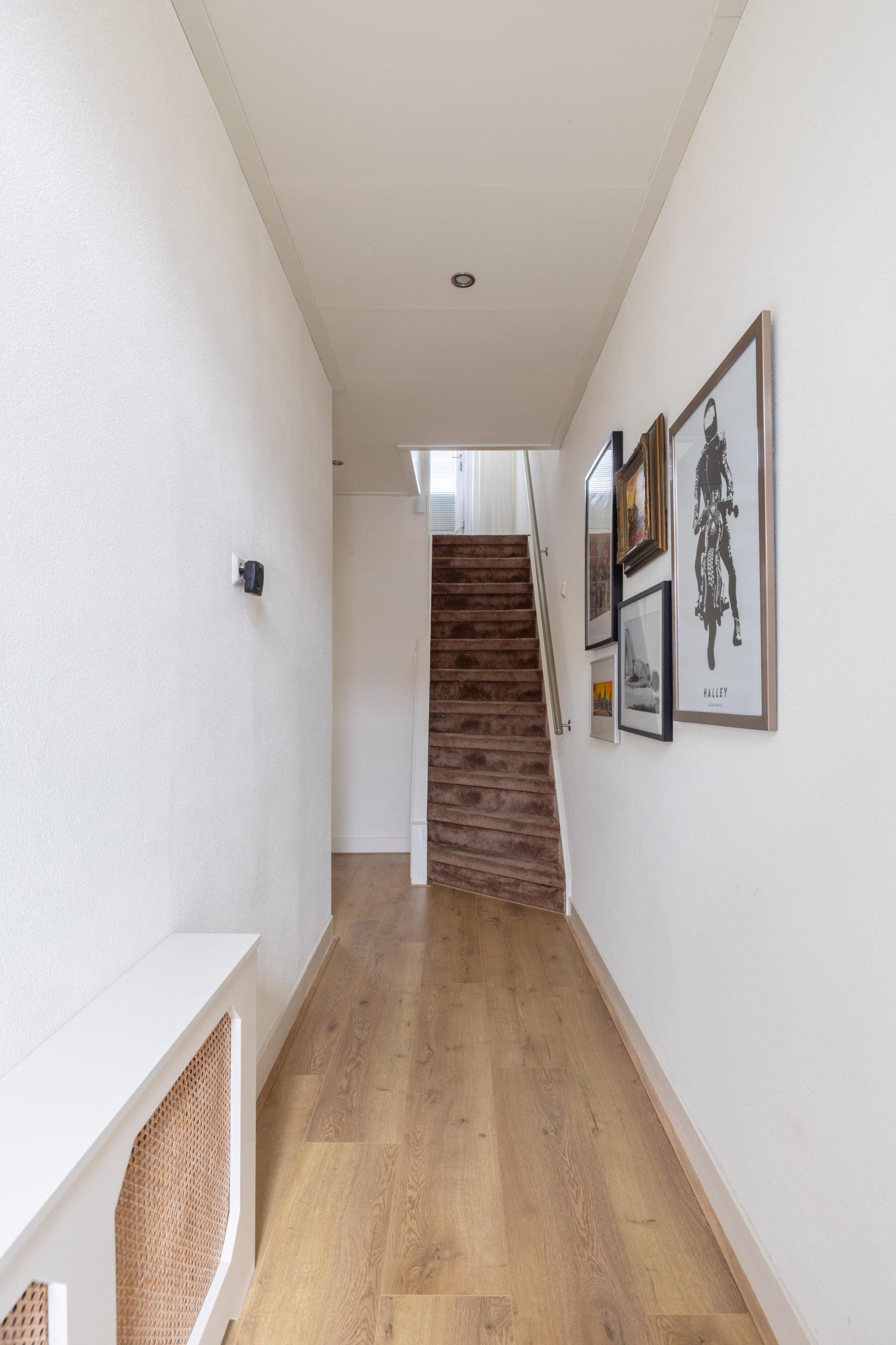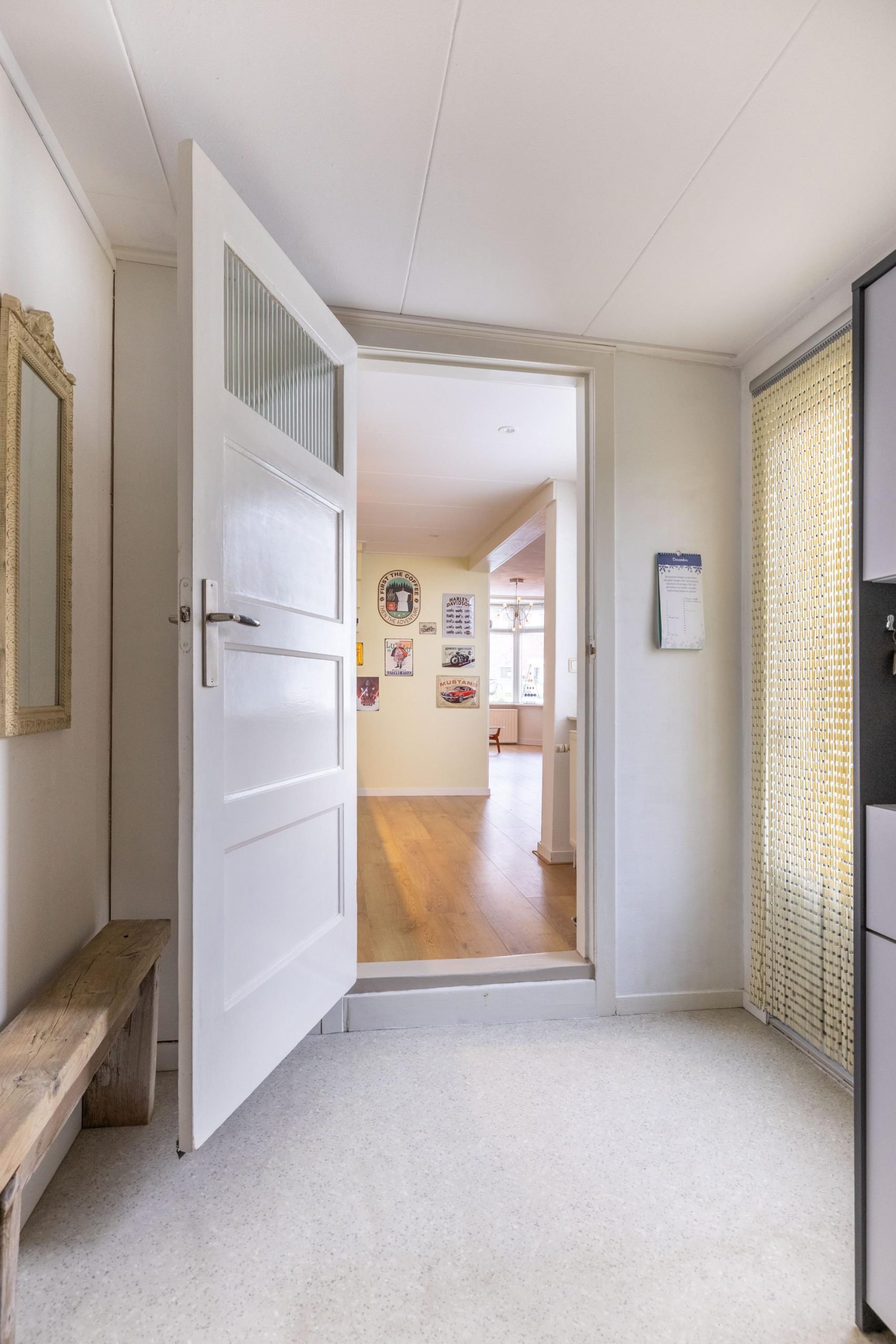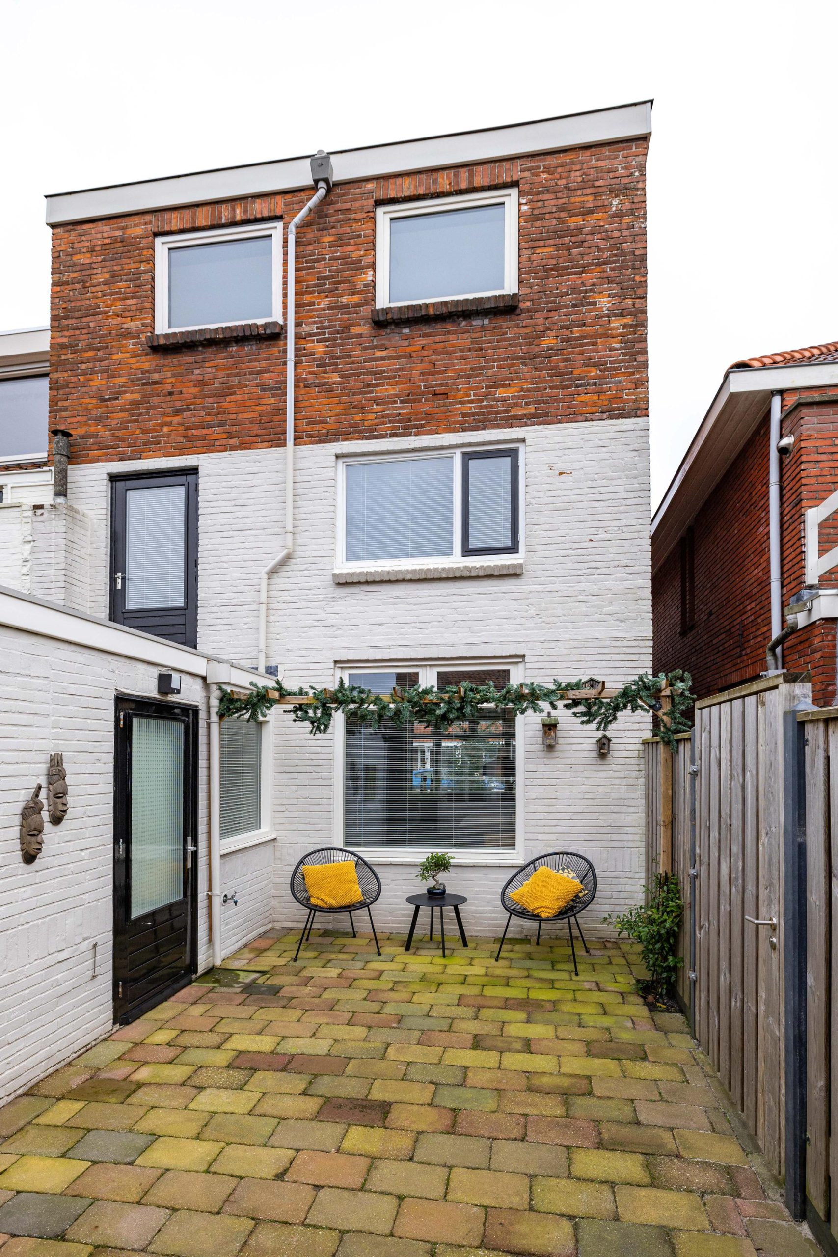 De Pieter de Hooghstraat zelf ademt de sfeer van de jaren ’30. Een fijne straat met karakter, waar nummer 24 direct opvalt dankzij de nette gevel, de verzorgde voortuin met een combinatie van bestrating en groen en natuurlijk de erker die de woning een karakteristieke uitstraling geeft. Via de steeg aan de zijkant bereiken we de achtertuin, maar eerst stappen we naar binnen via de voordeur.