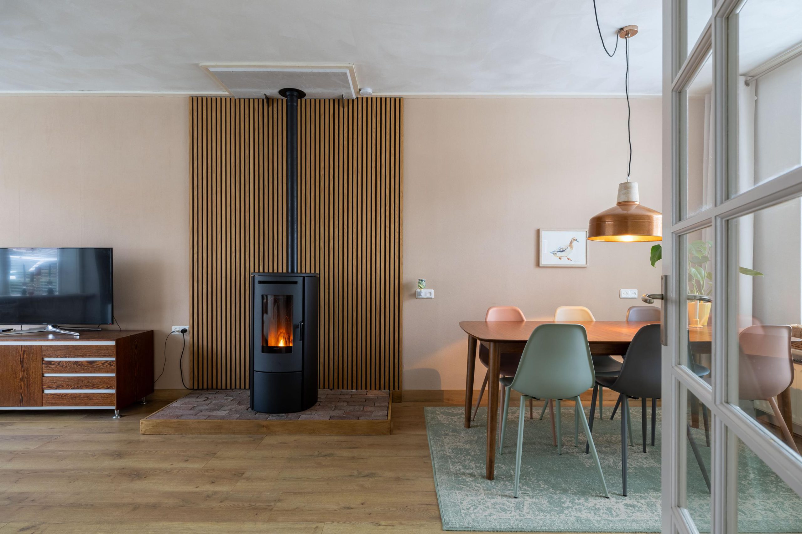 - Sfeervolle pelletkachel (ter overname) met modern wandpaneel