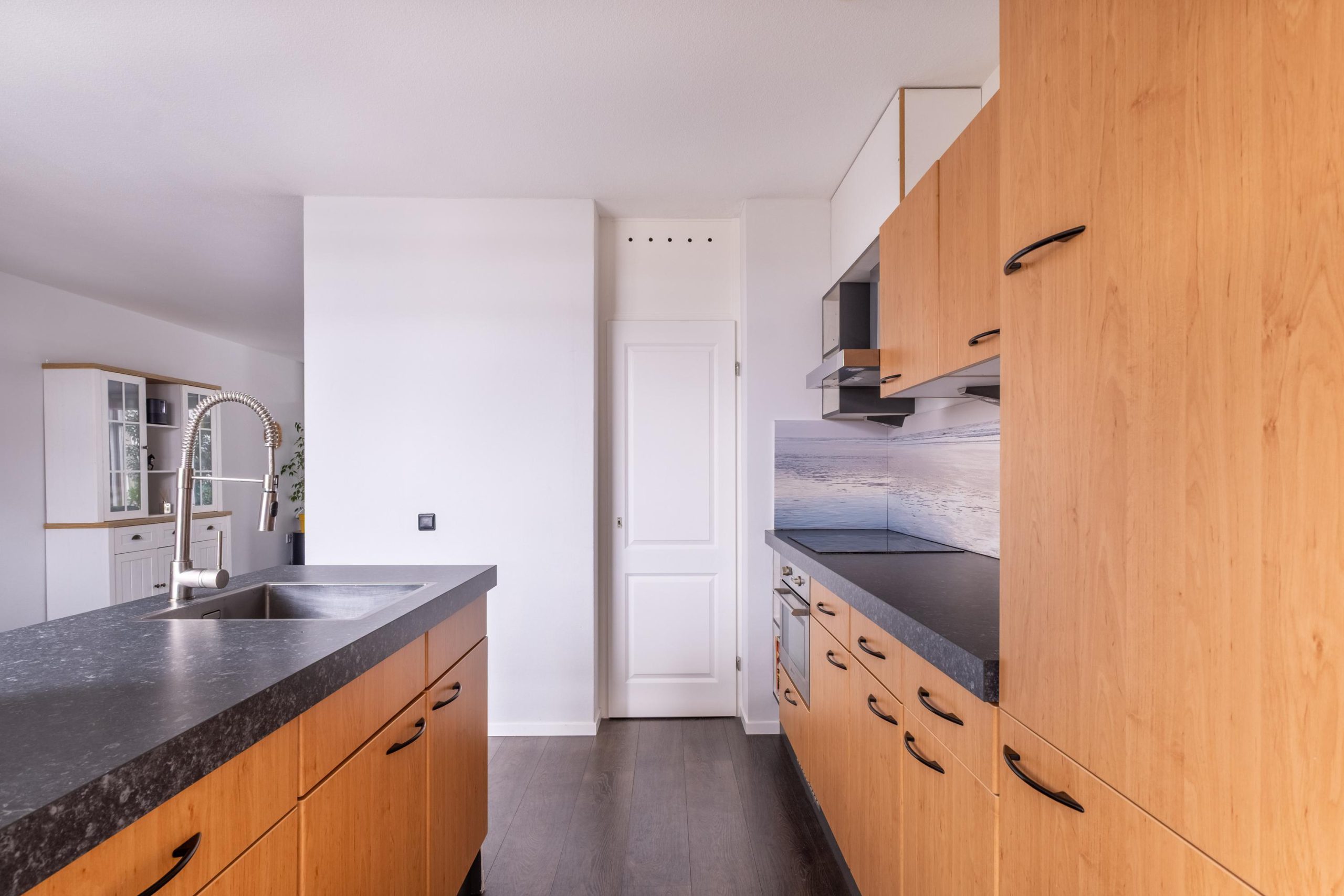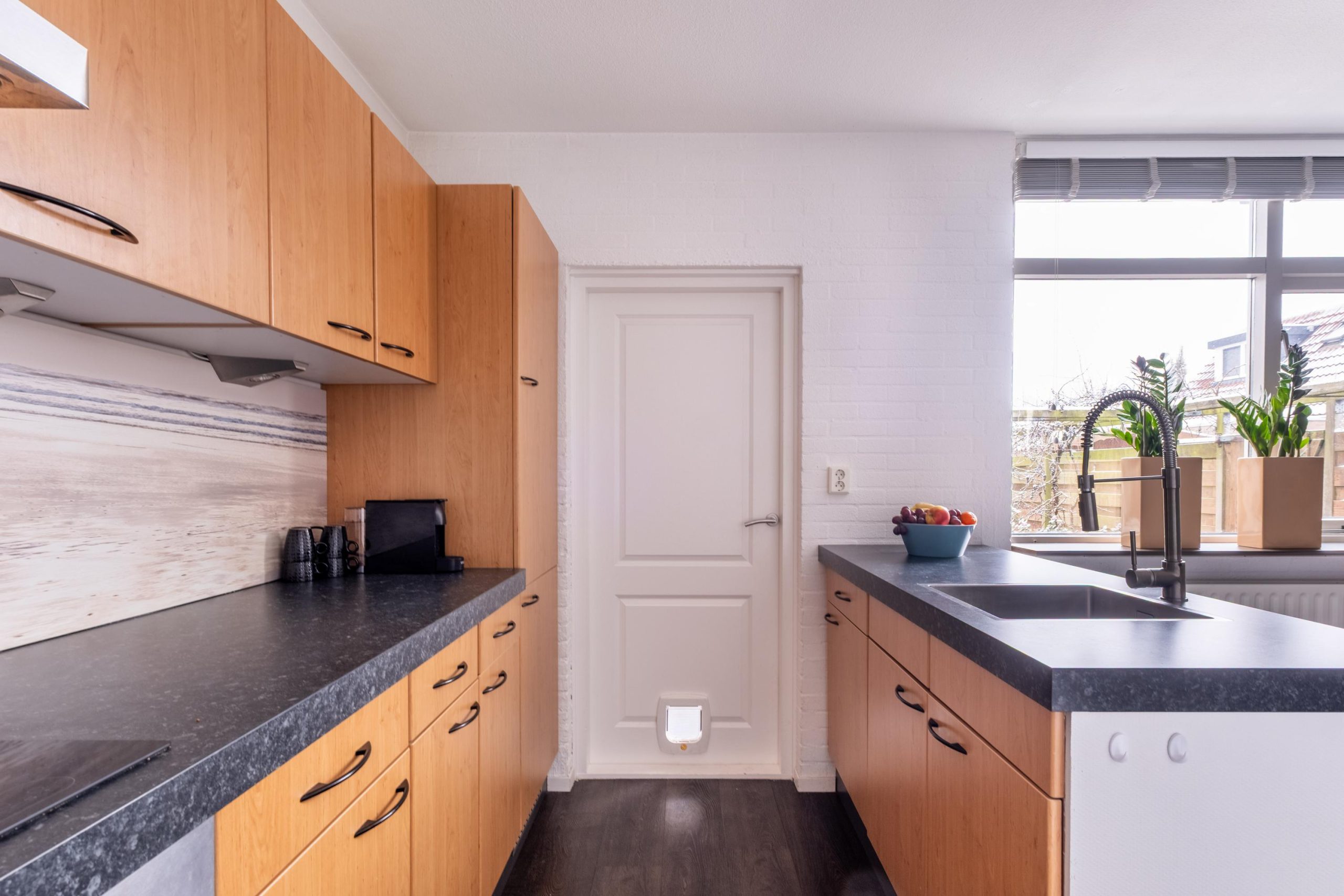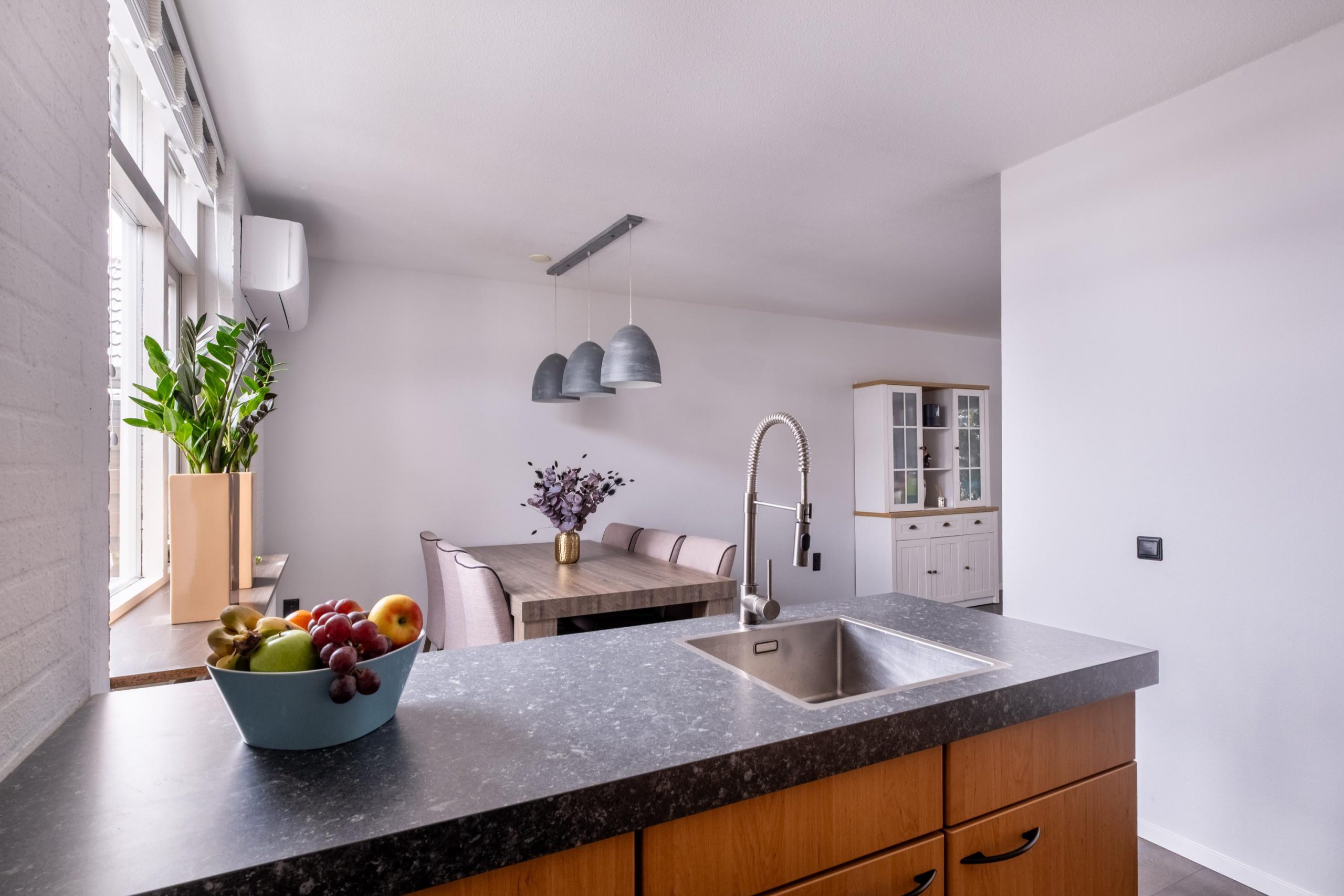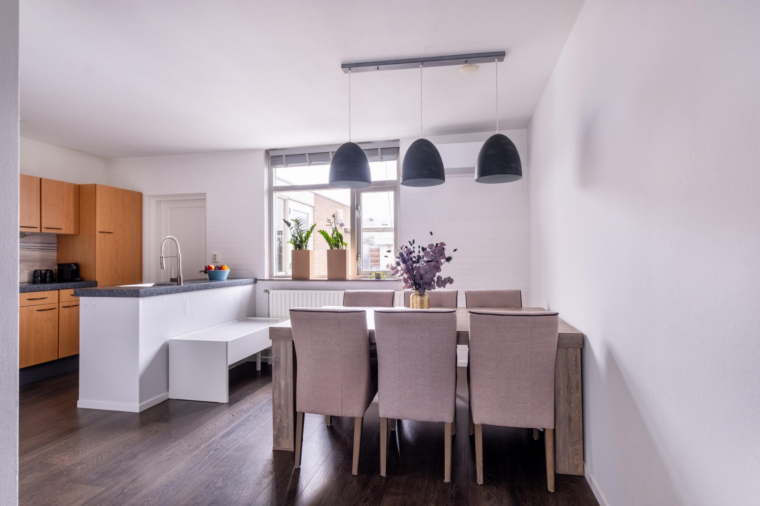 Aan de achterzijde van de woning bevinden zicht de keuken en het eetgedeelte. Vanuit de eethoek is er zicht op de tuin, wat zorgt voor een fijne verbindingen tussen binnen en buiten en maakt dit tot een centrale plek in huis.