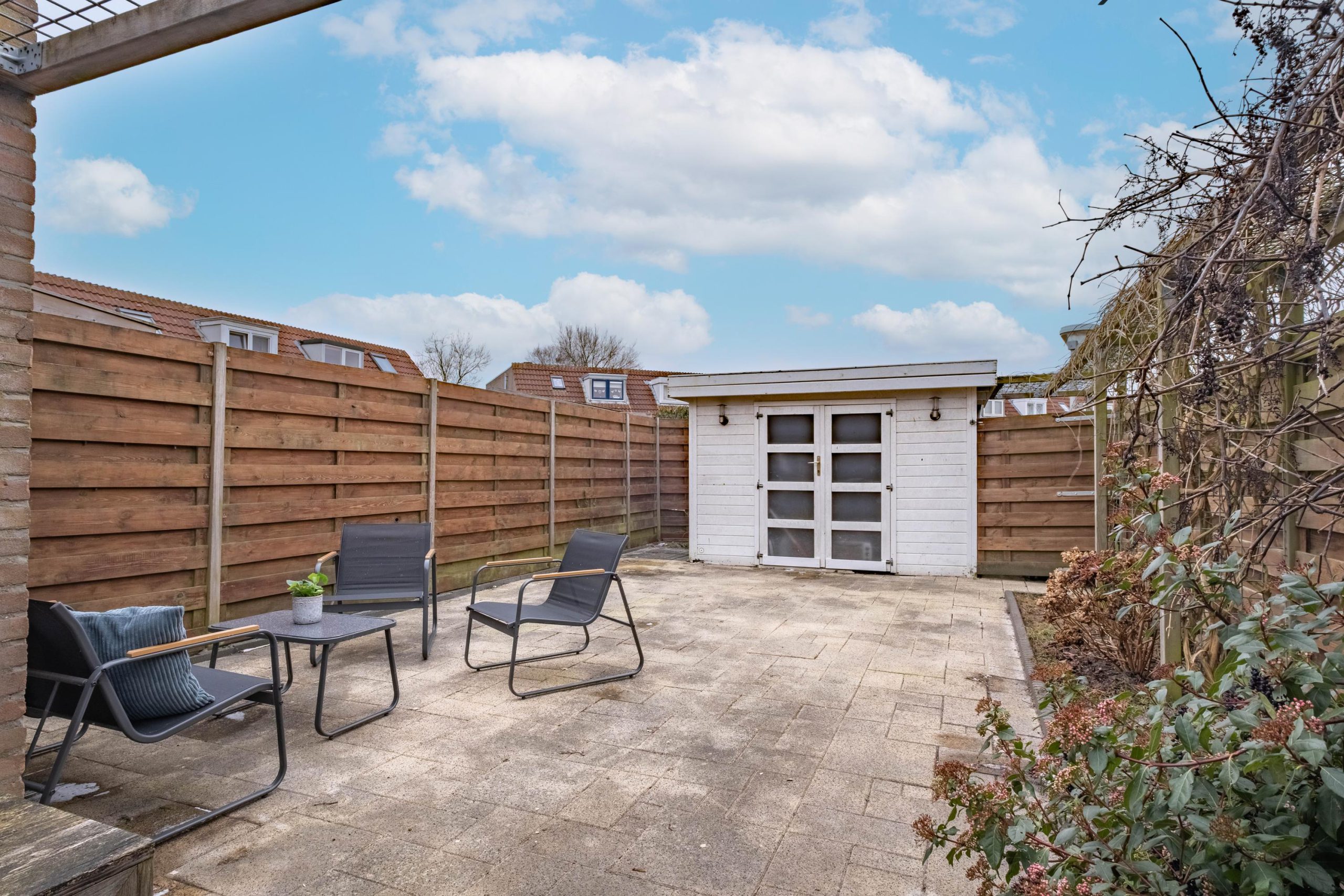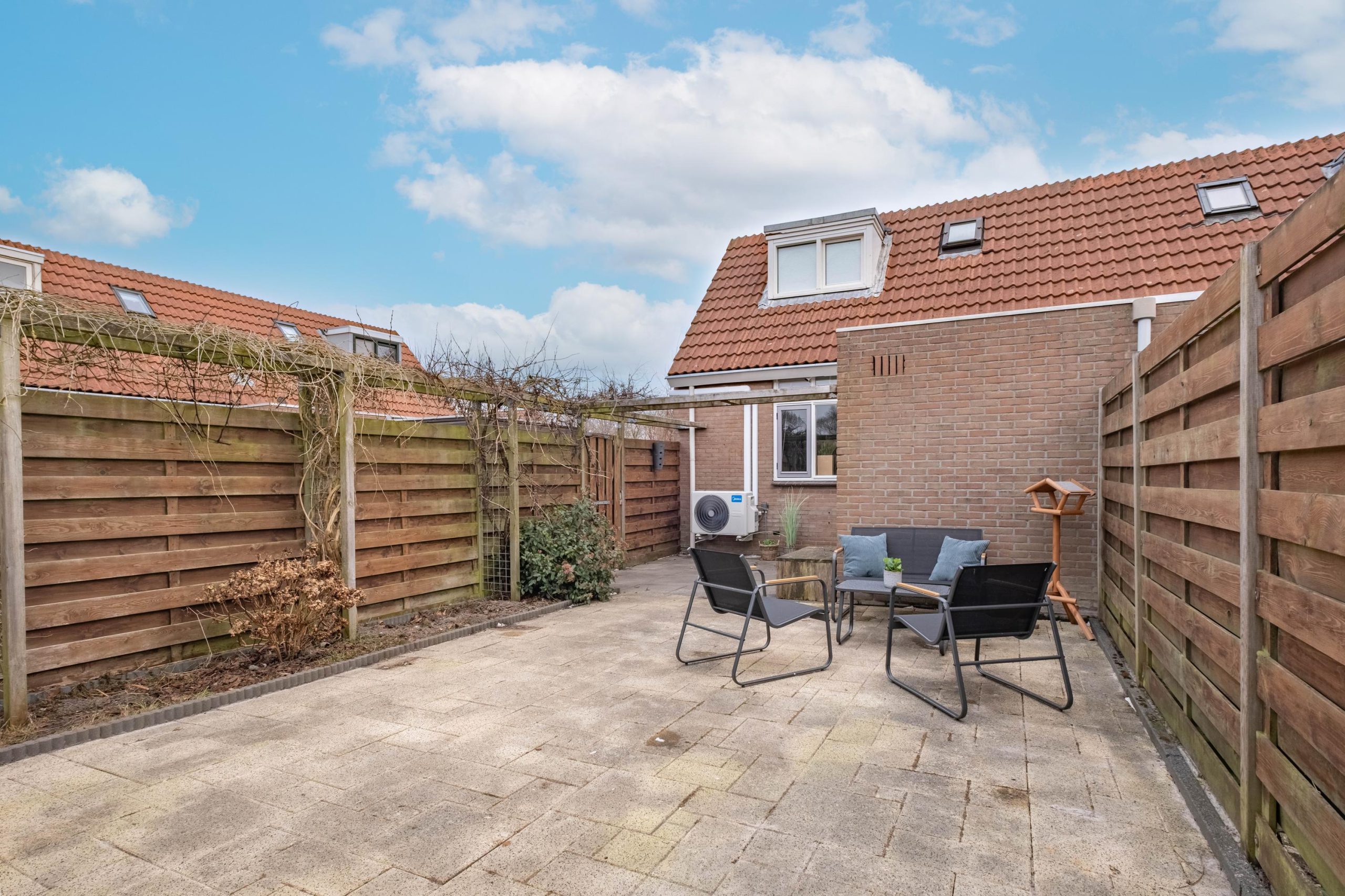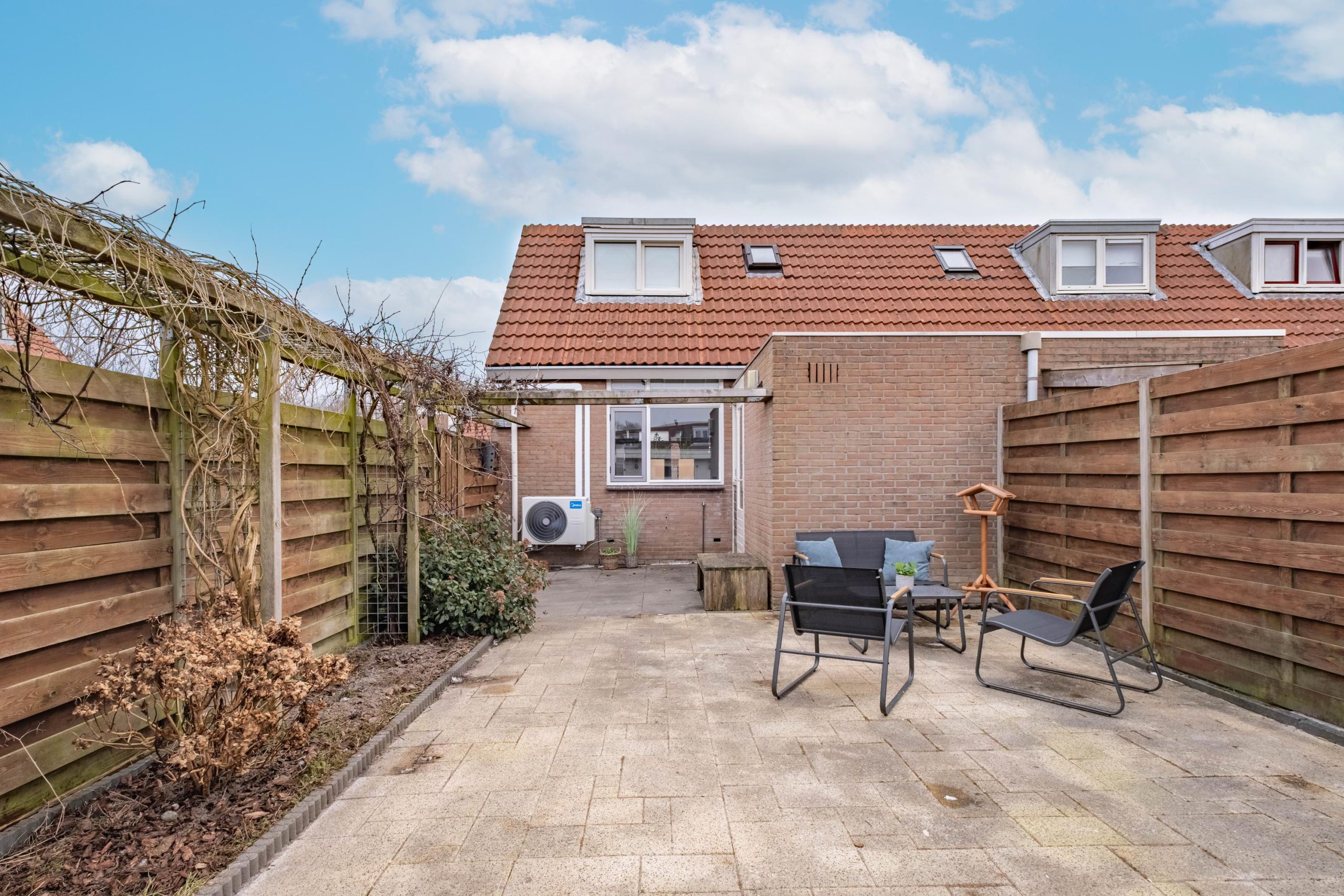 De achtertuin ligt op het westen en is onderhoudsvriendelijk aangelegd. Een fijne plek om na het werk nog even van de zon te genieten of 's avonds buiten te zitten, met voldoende privacy en ruimte.