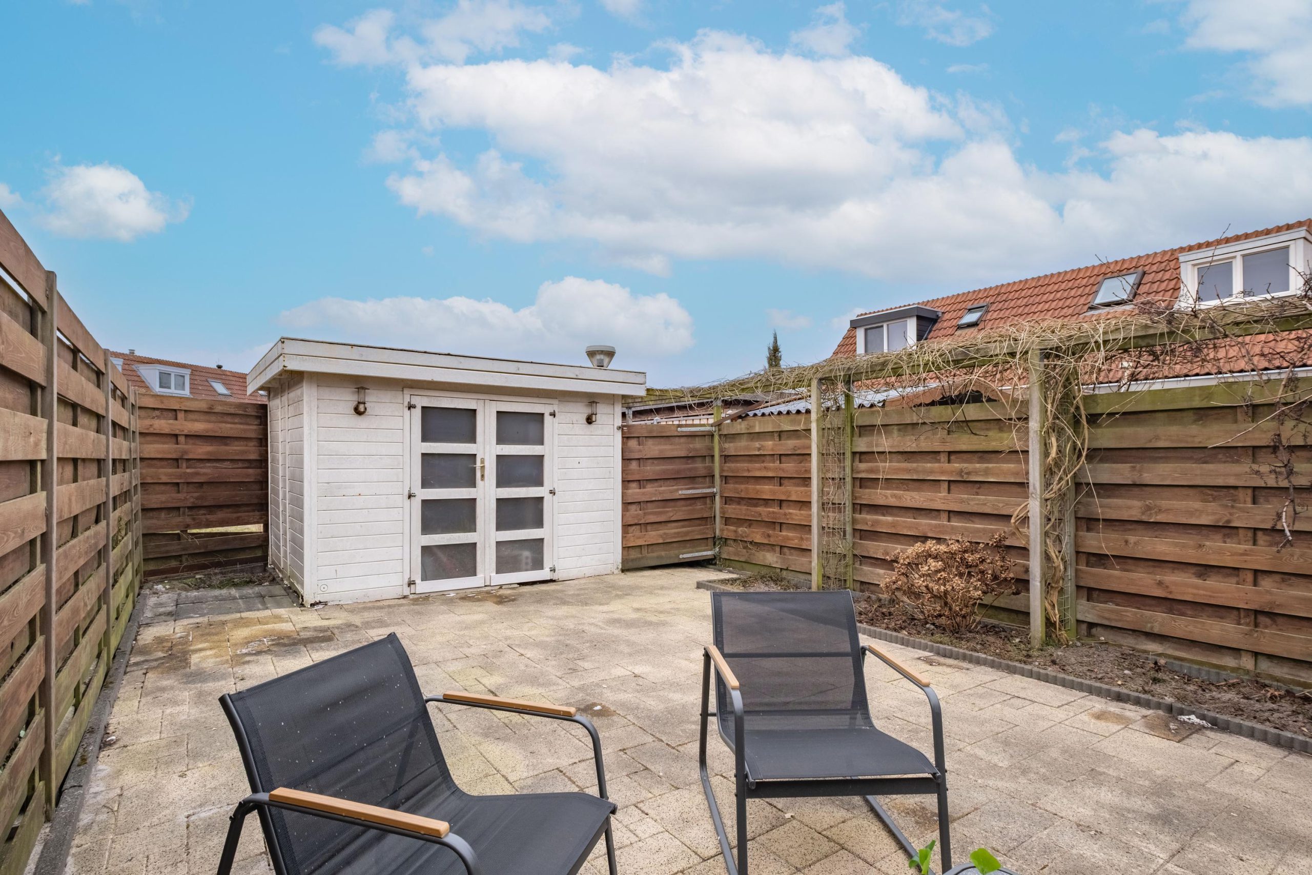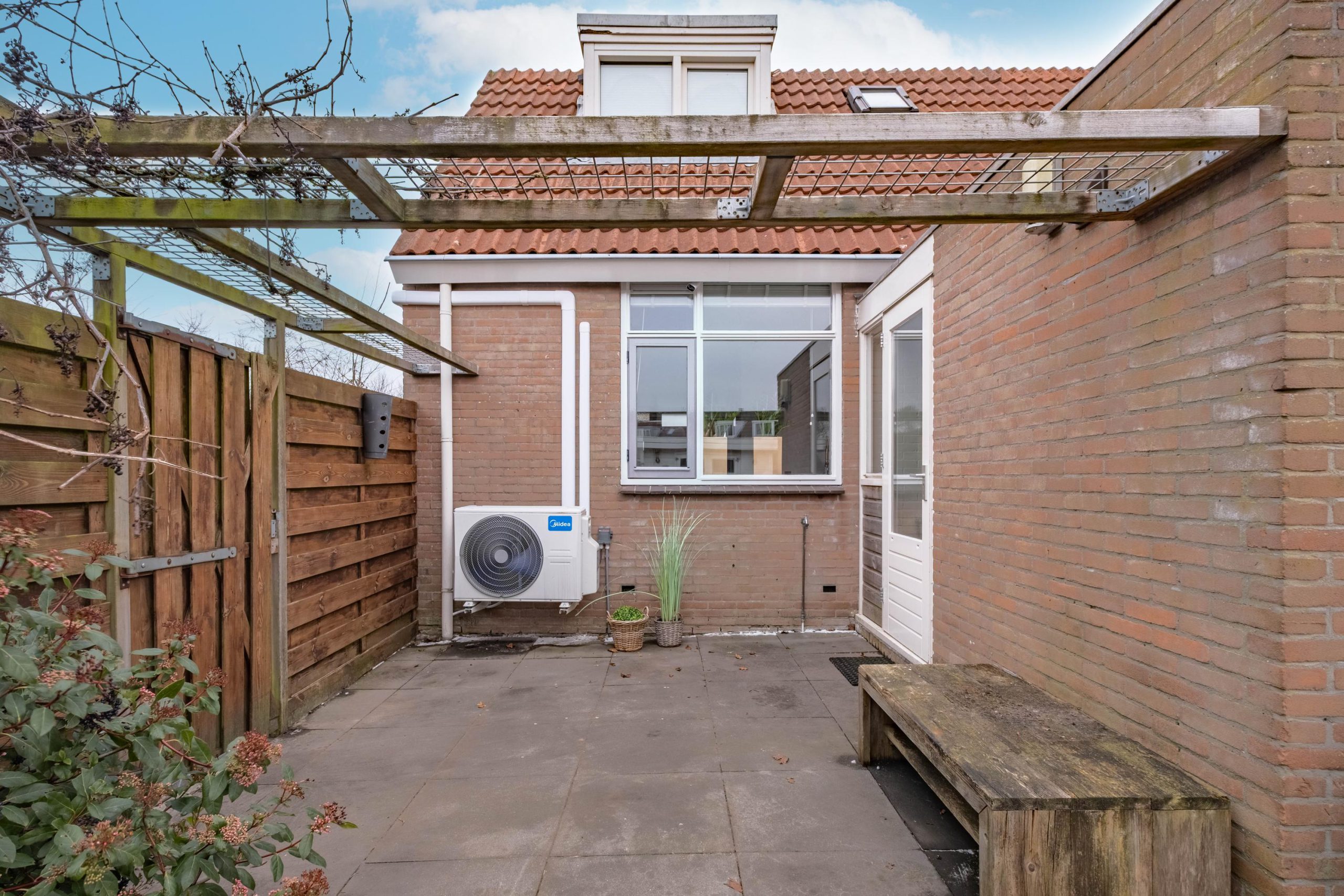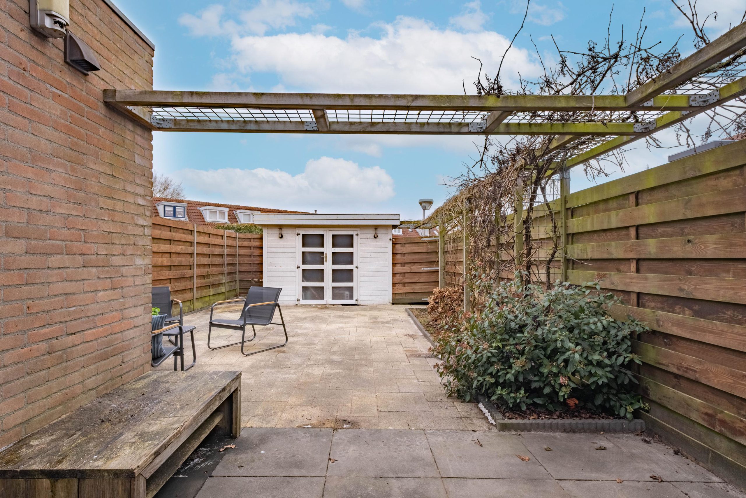De achtertuin ligt op het westen en is onderhoudsvriendelijk aangelegd. Een fijne plek om na het werk nog even van de zon te genieten of 's avonds buiten te zitten, met voldoende privacy en ruimte.