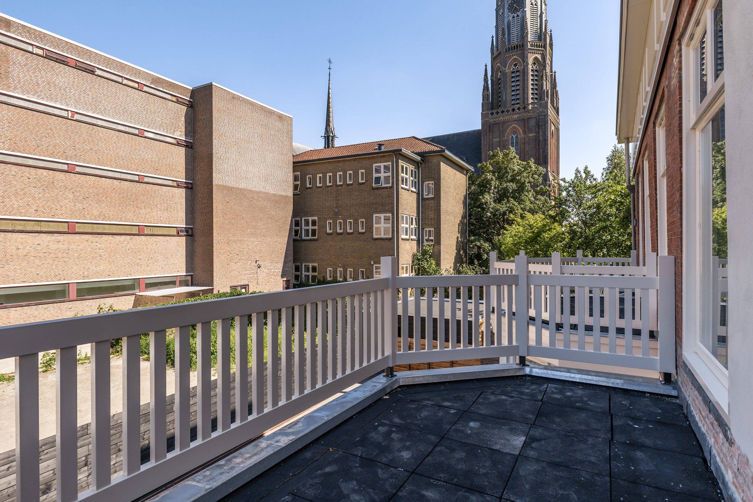 Uniek aan dit appartement is het ruime terras aan de voorzijde, met uitzicht op de statige kerk aan de overkant. Een perfecte plek voor je eerste koffie in de ochtendzon of een borrel aan het einde van de dag. Dankzij de ligging op de eerste verdieping heb je hier zowel privacy als contact met de stad om je heen.
