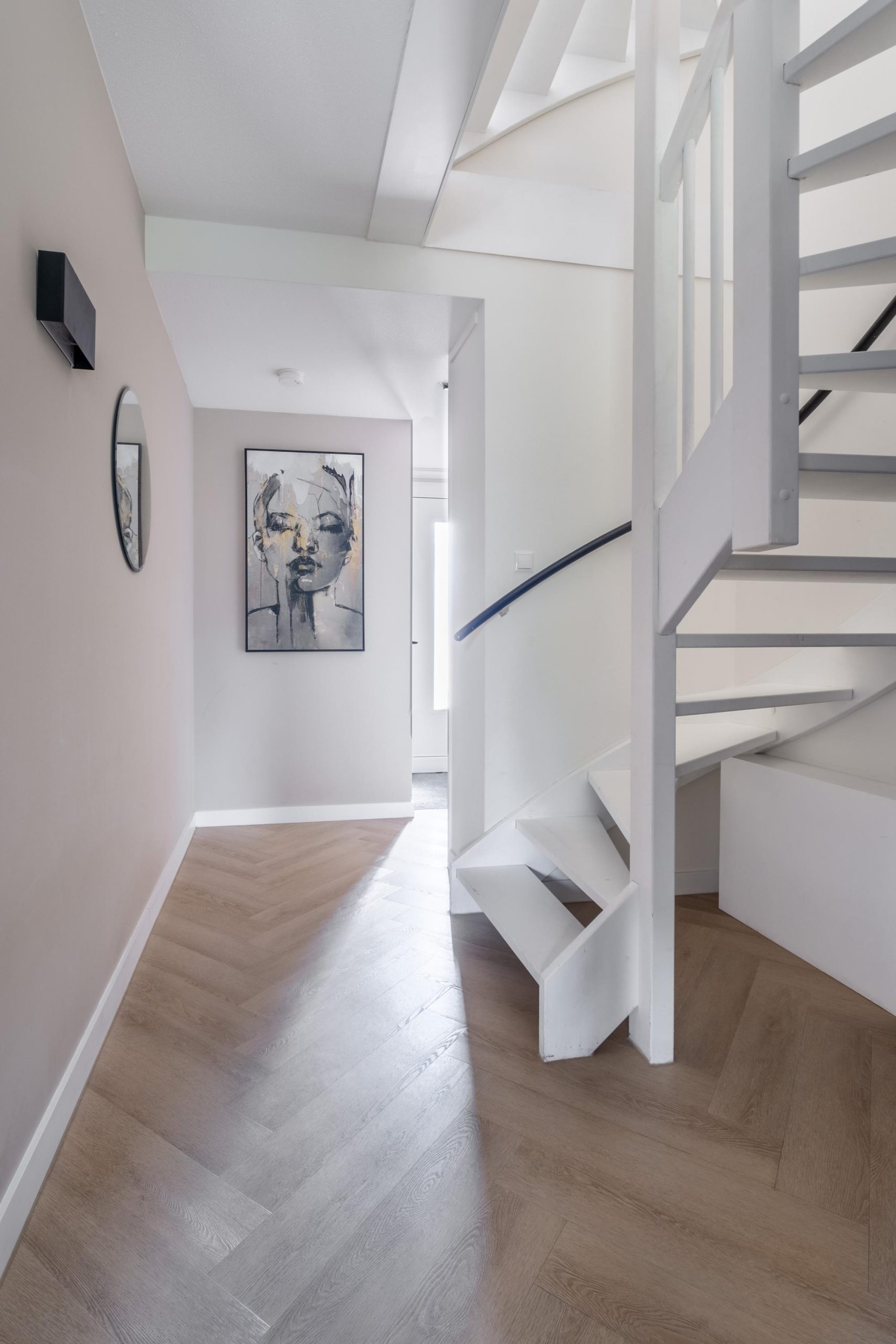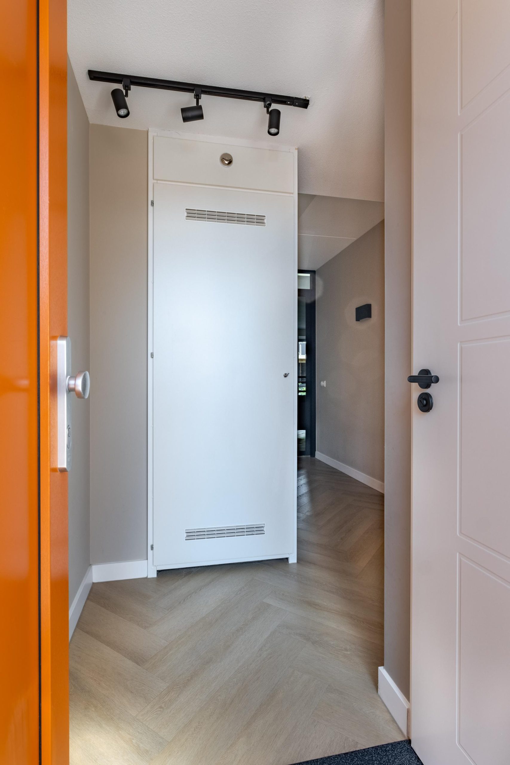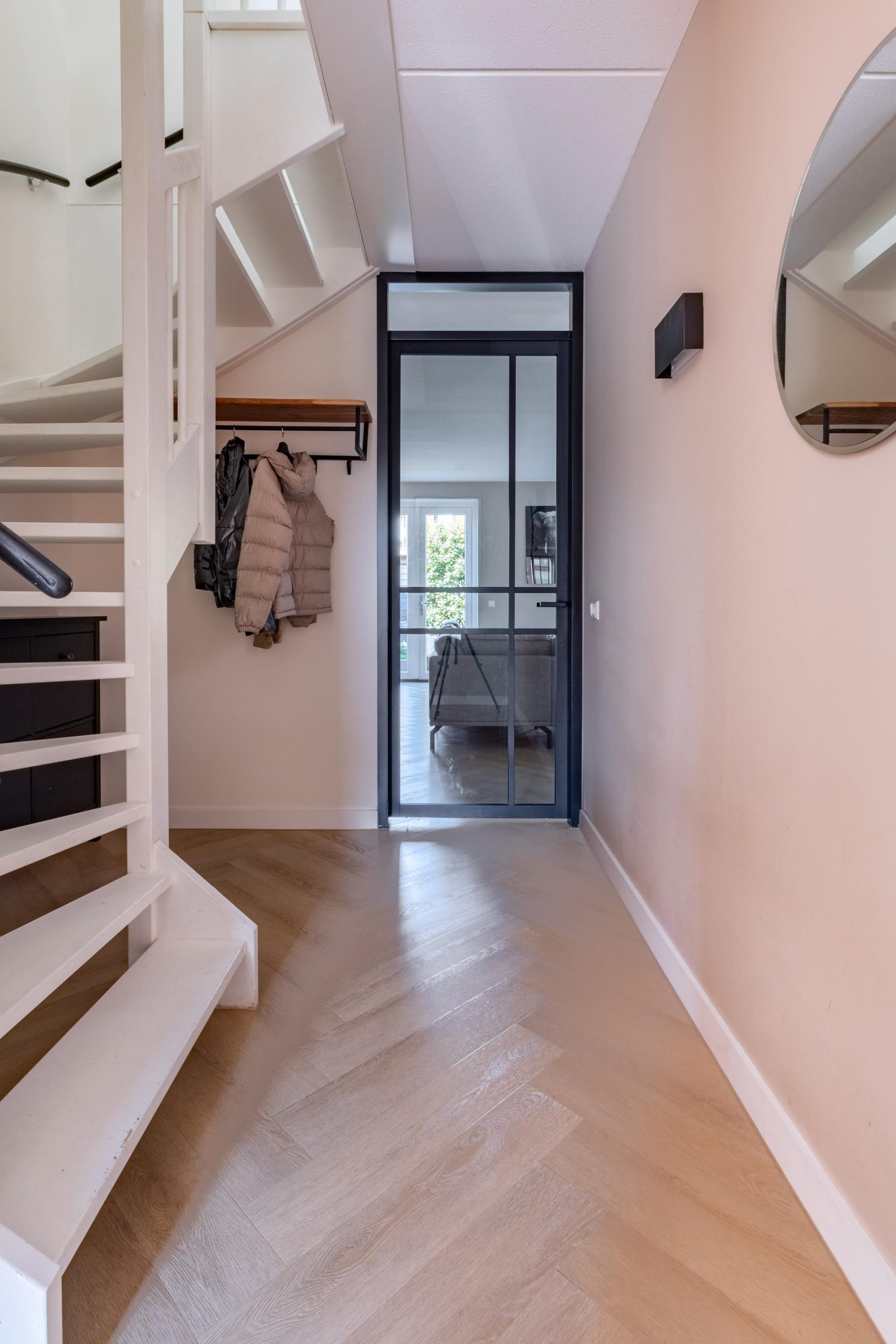 Je stapt binnen in de hal met modern toilet en uitgebreide meterkast, helemaal zoals je mag verwachten bij nieuwbouw. Via de glazen deur bereik je de woonkamer: een lichte, open ruimte met grote raampartijen die zorgen voor een fijne sfeer. De PVC-visgraatvloer geeft een stijlvolle uitstraling.