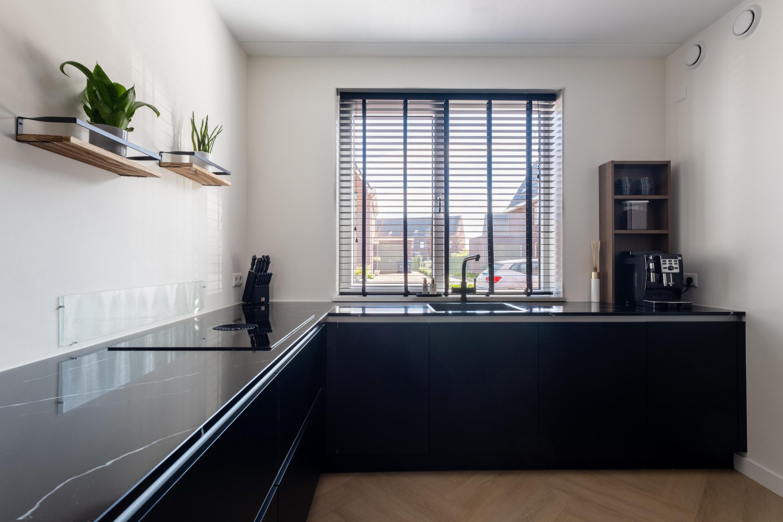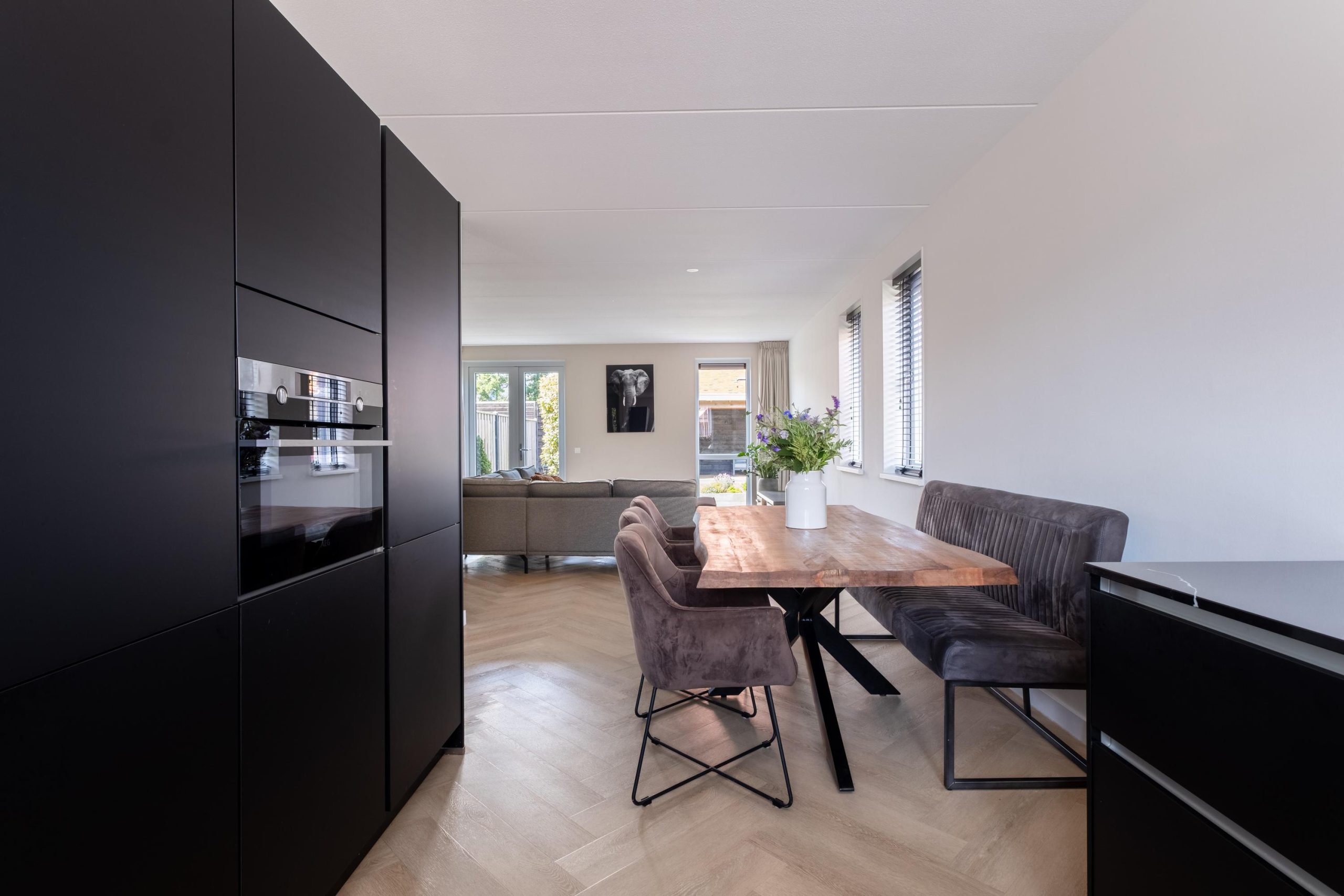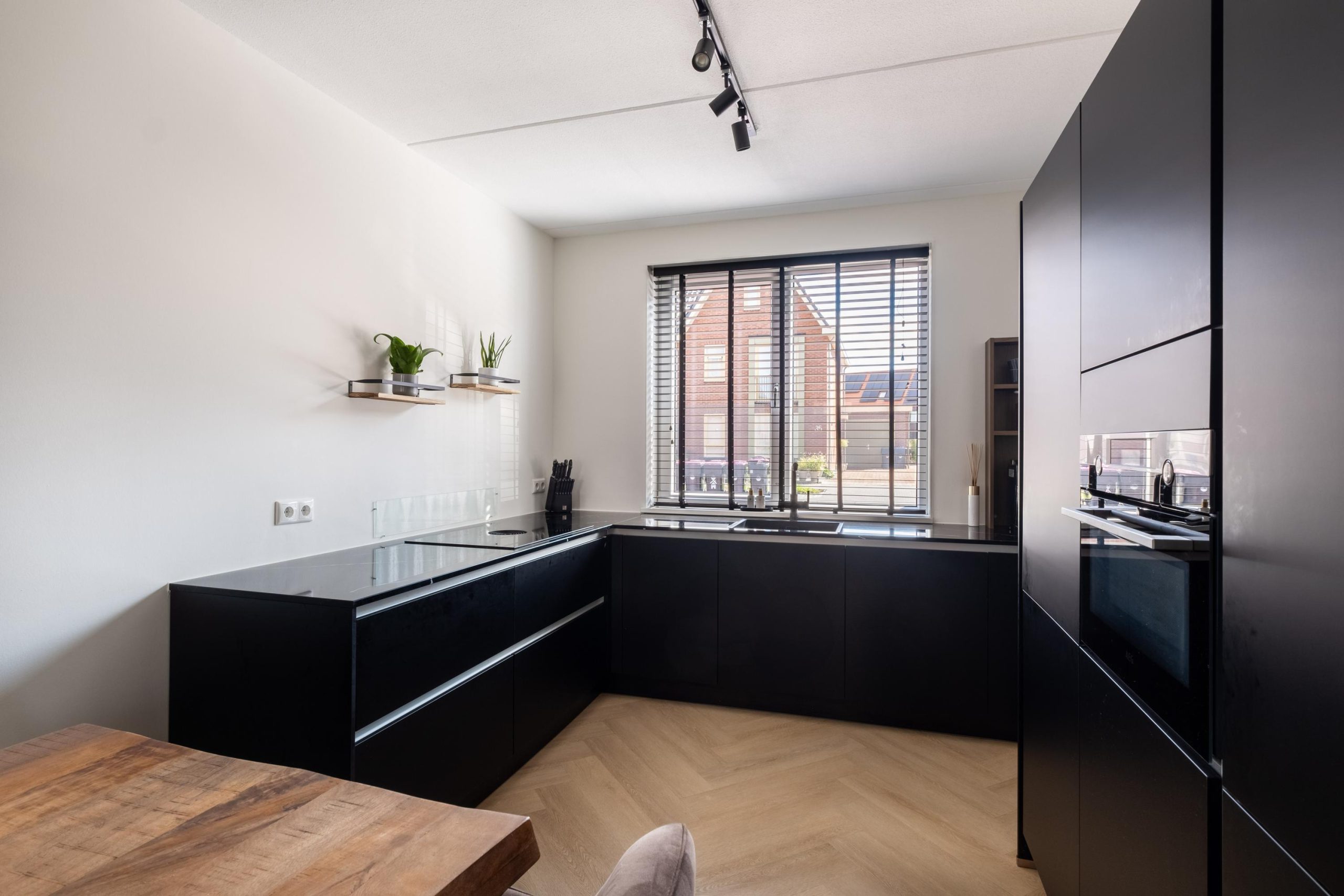 • PVC-visgraatvloer en luxe zwarte keuken met inbouwapparatuur