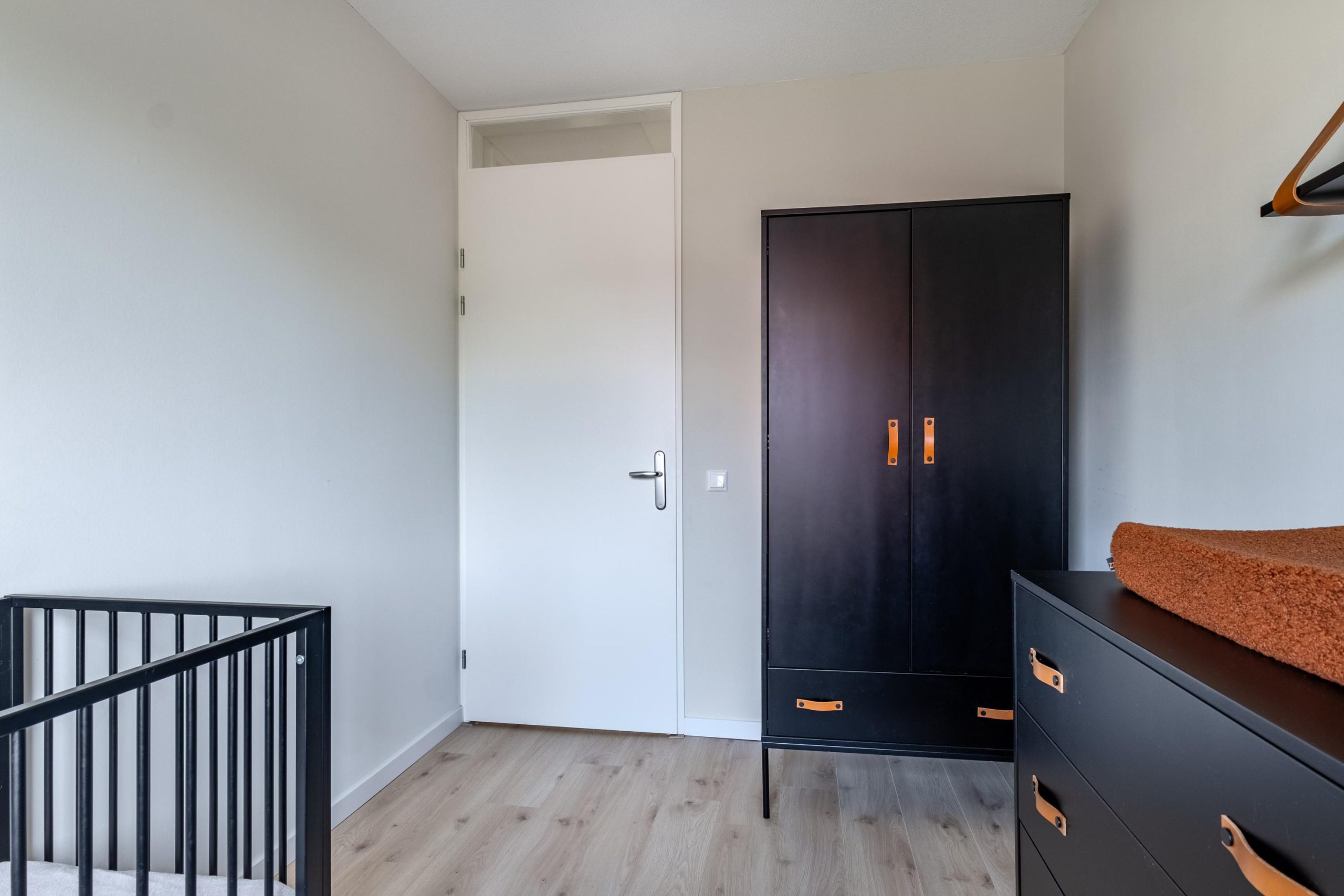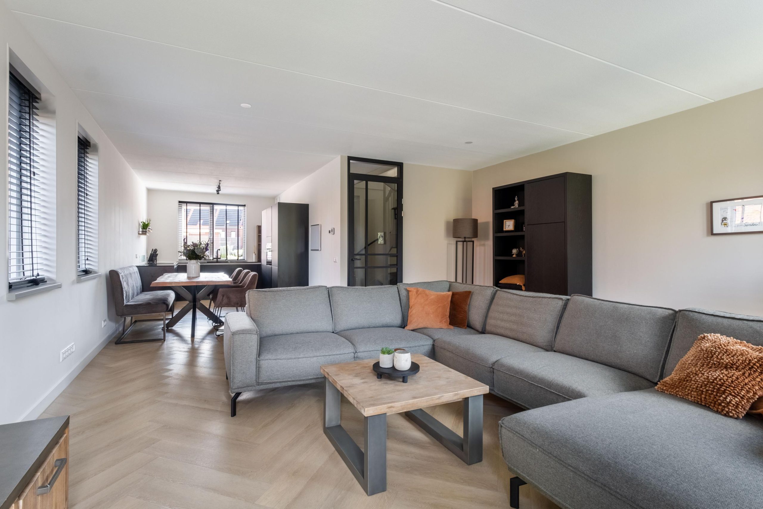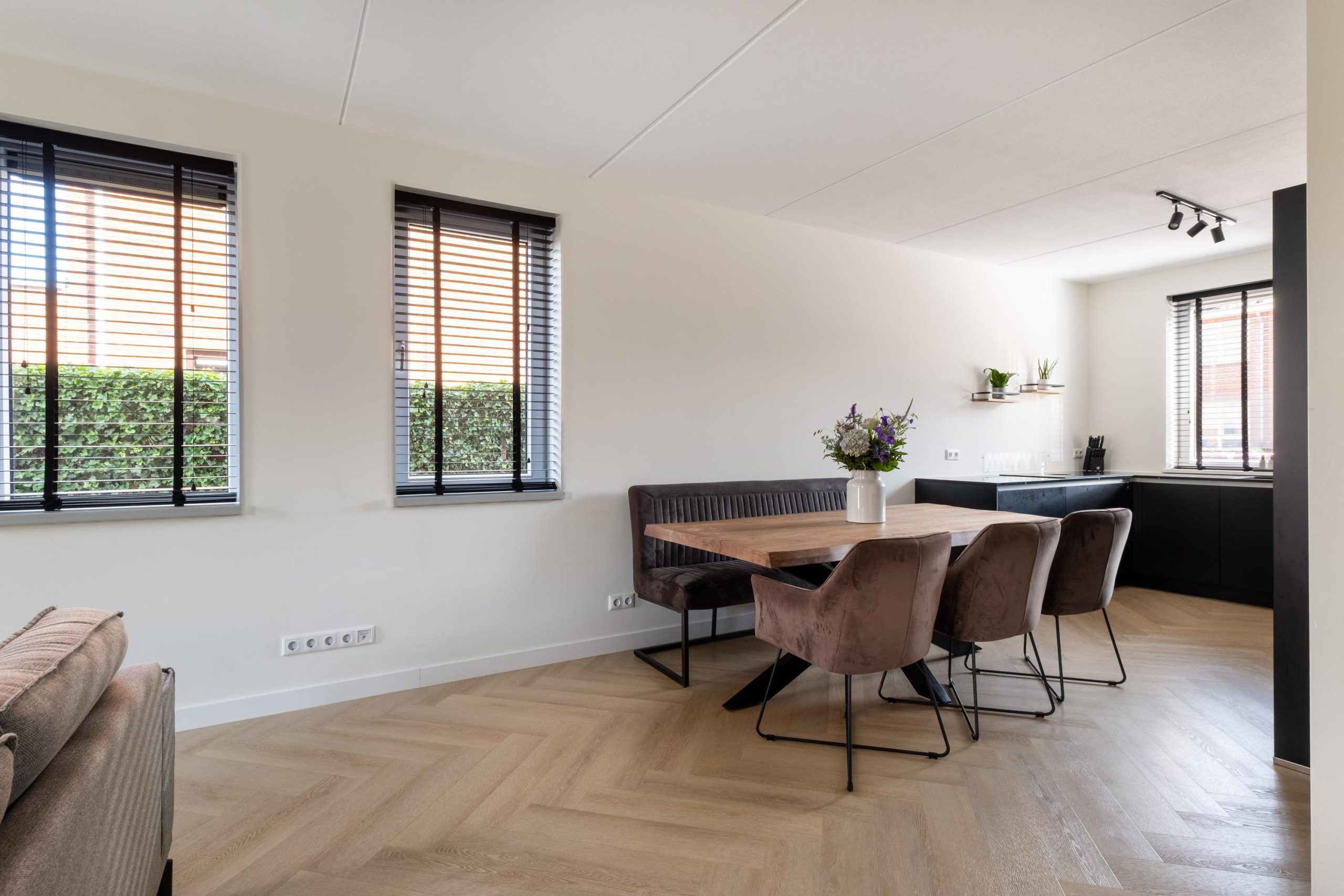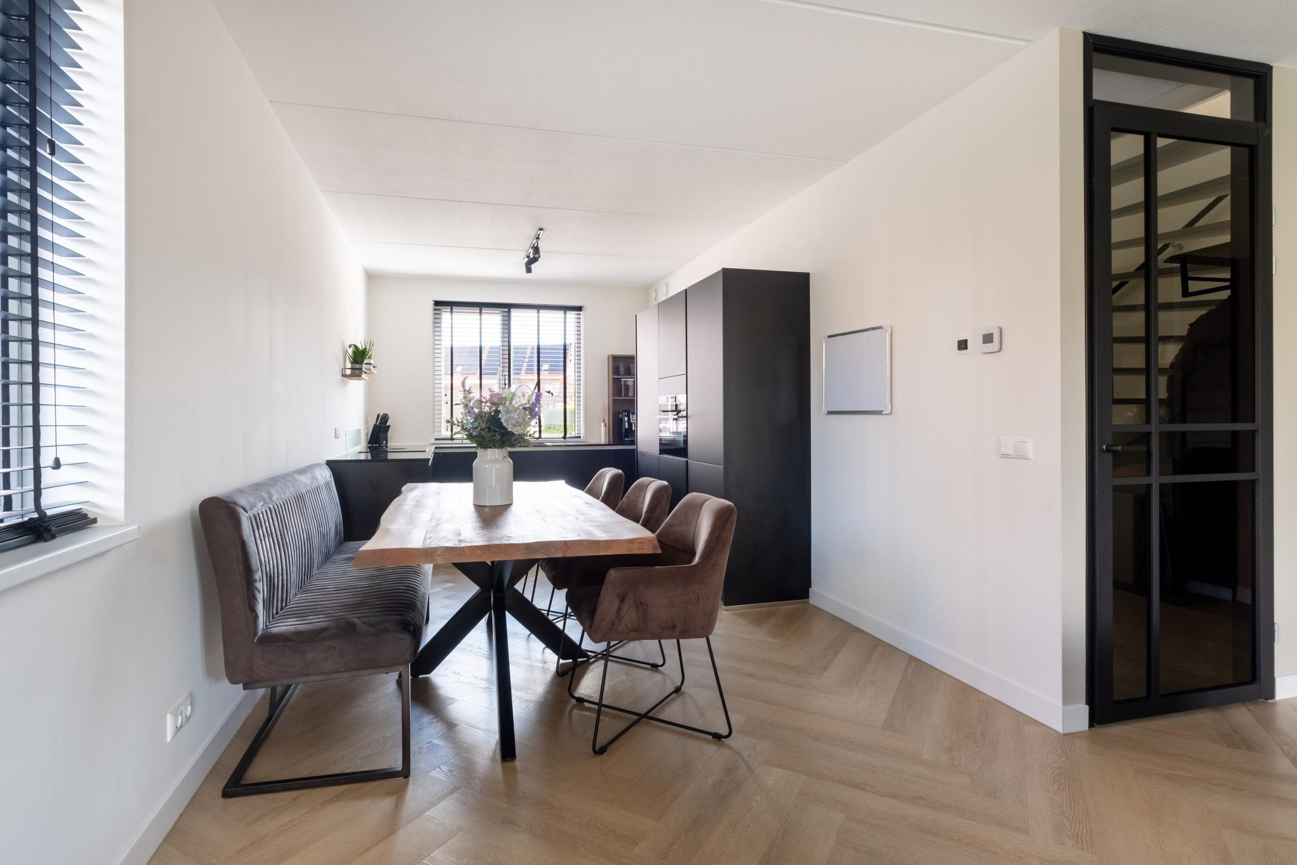• PVC-visgraatvloer en luxe zwarte keuken met inbouwapparatuur