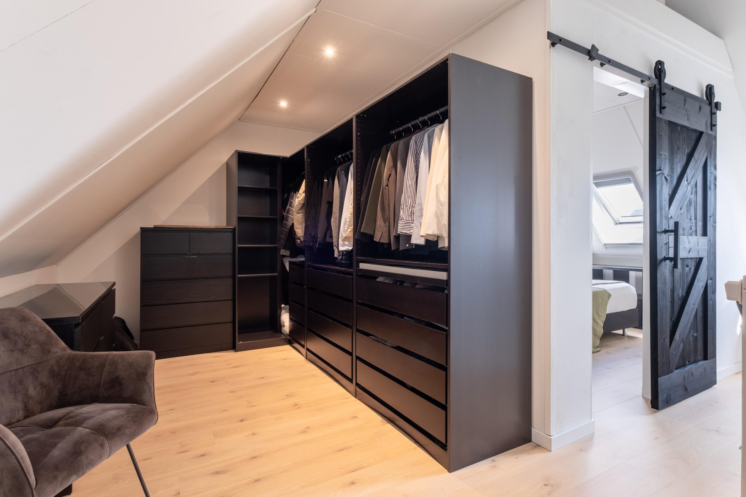 Aan de voorzijde bevindt zich de moderne zwarte keuken, volledig uitgerust met inductiekookplaat met geïntegreerde afzuiging, koelkast, vriezer, vaatwasser en oven. Een plek waar koken en gezelligheid samenkomen.