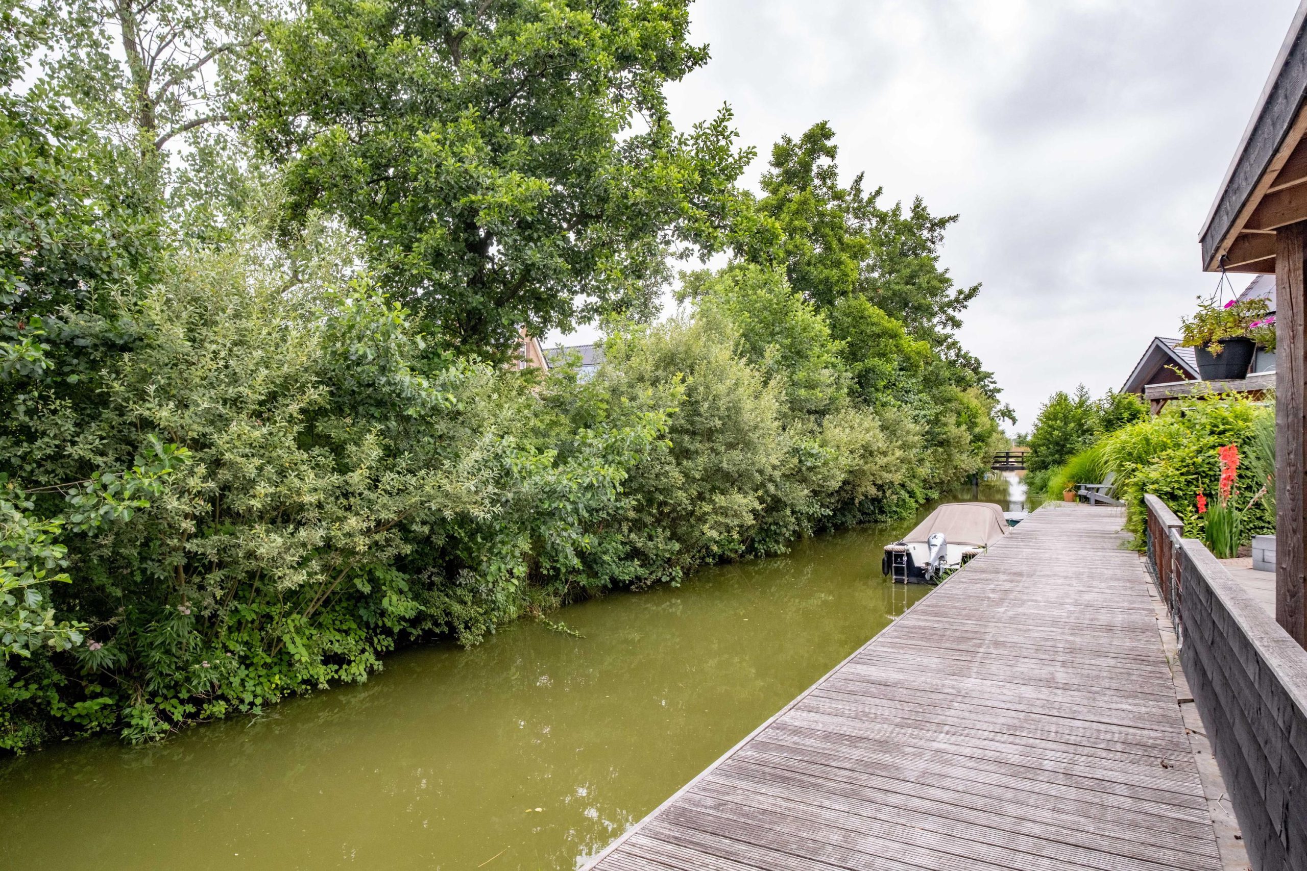 De tuin is praktisch en slim ingericht. De berging is verplaatst naar achteren en voorzien van een overkapping, waardoor je hier een fijne plek hebt om beschut buiten te zitten. Dankzij de ligging geniet je volop van de zon. Naast de woning bevindt zich een achterom, en via de gezamenlijke eigendom van 1/9e deel kun je eenvoudig naar de steiger lopen – ideaal voor waterliefhebbers.