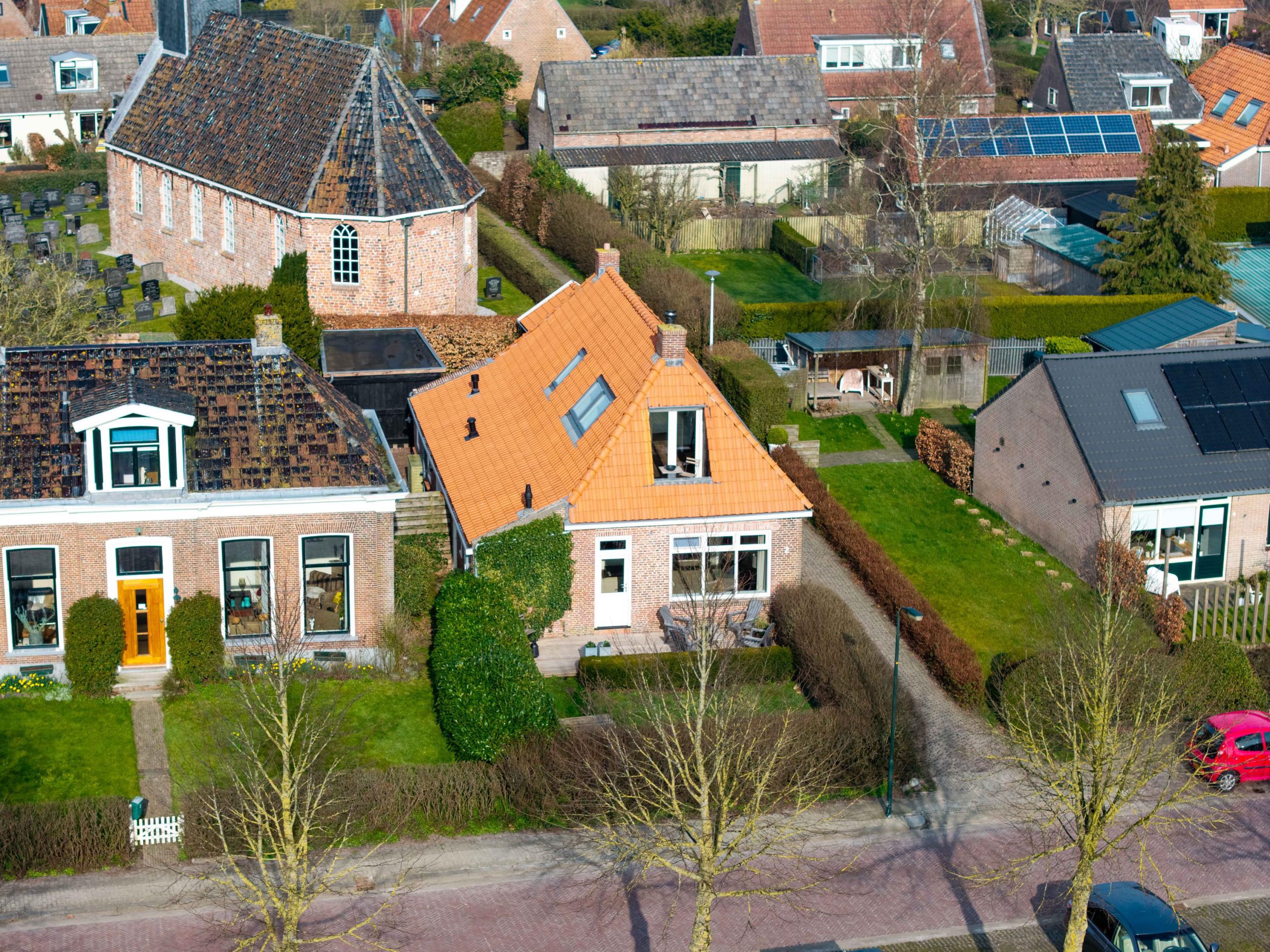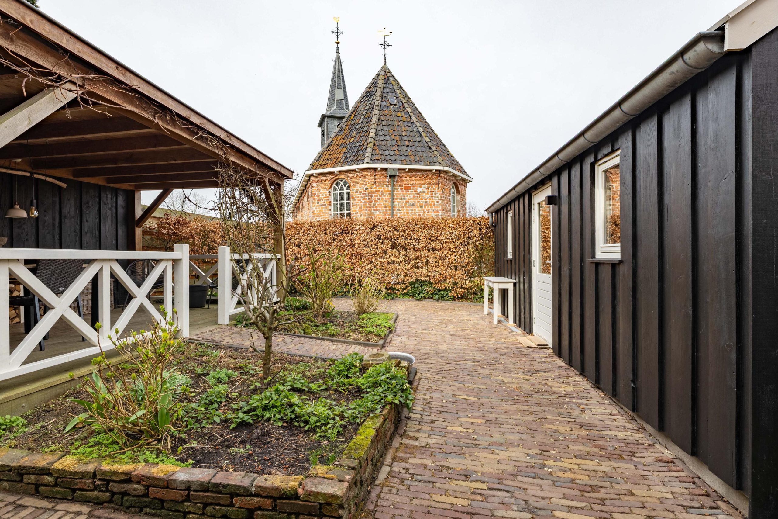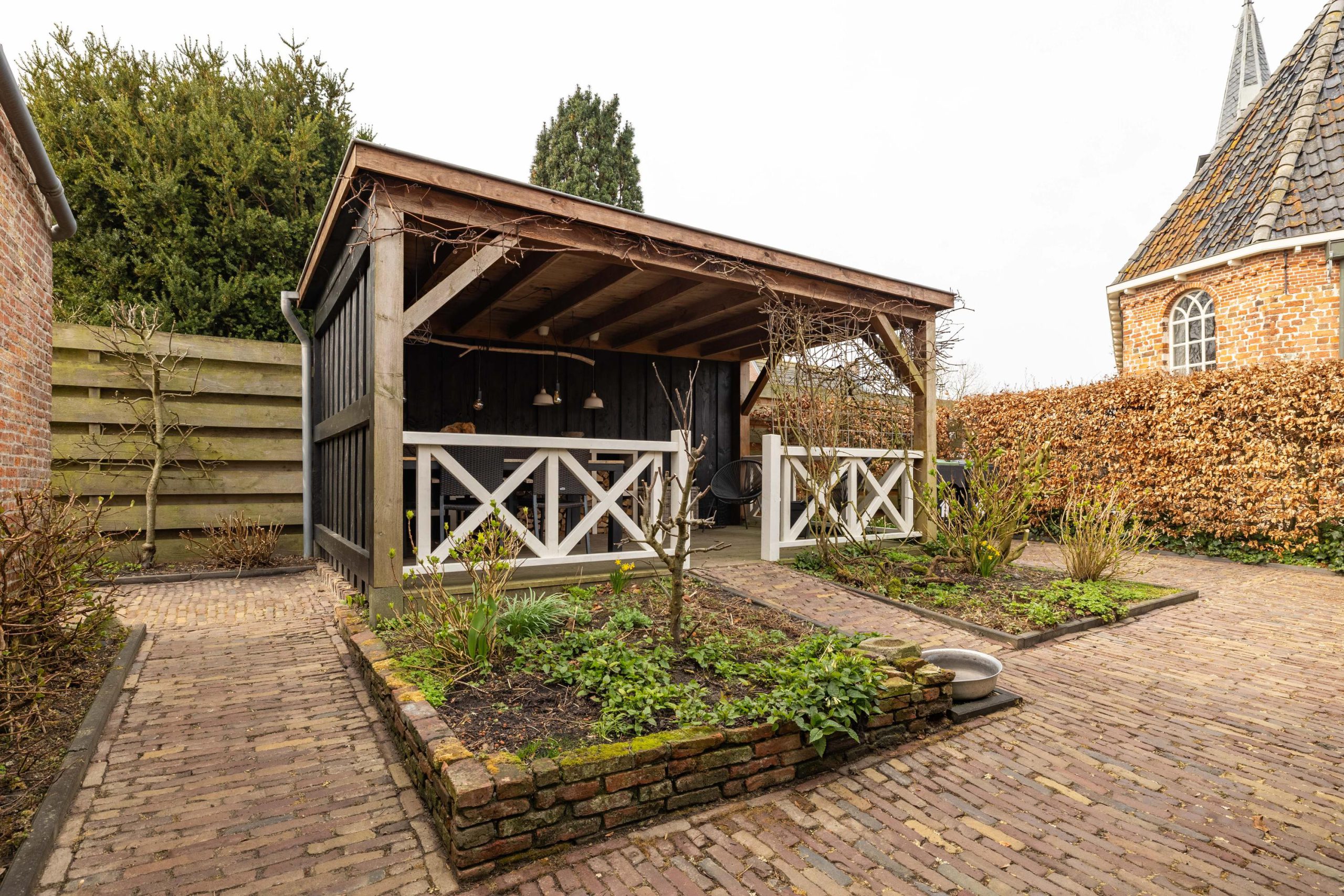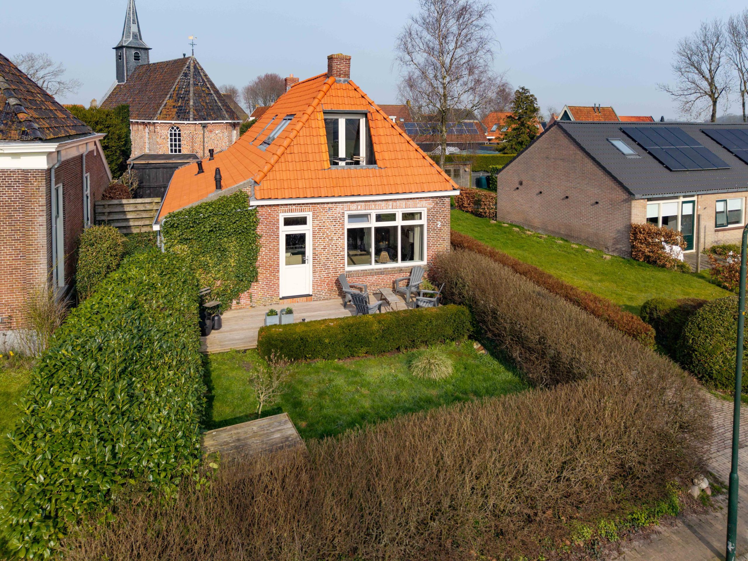 De achtertuin is een plek om echt tot rust te komen, met een fijne veranda en een prachtig uitzicht op het kerkje. Hier geniet je in alle privacy van het buitenleven. Achterin de tuin staat een grote, recent geplaatste schuur die volop ruimte biedt voor opslag, hobby’s of werk. Bij de veranda, schuur en het terras is uitsluitend gebruikgemaakt van hoogwaardige, duurzame materialen, waaronder onverwoestbaar hardhout. De afwerking is tot in detail verzorgd.