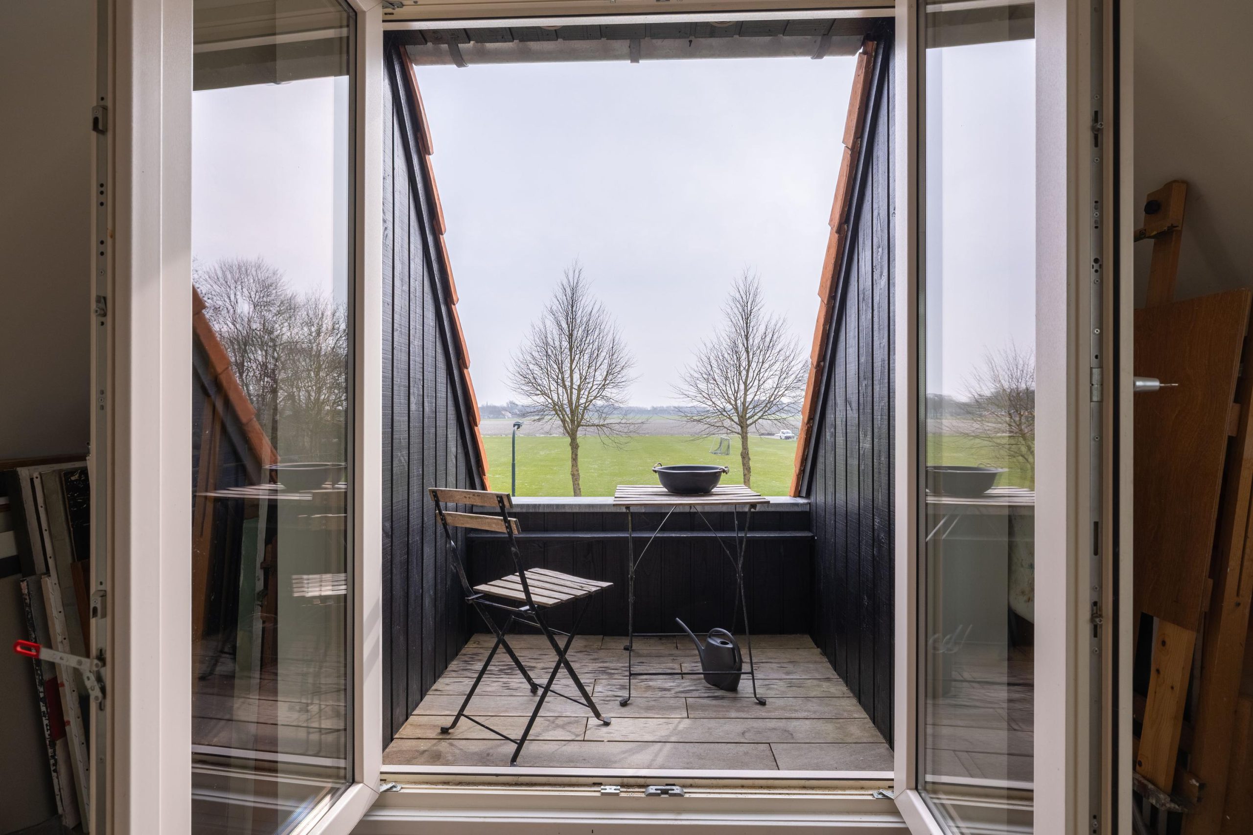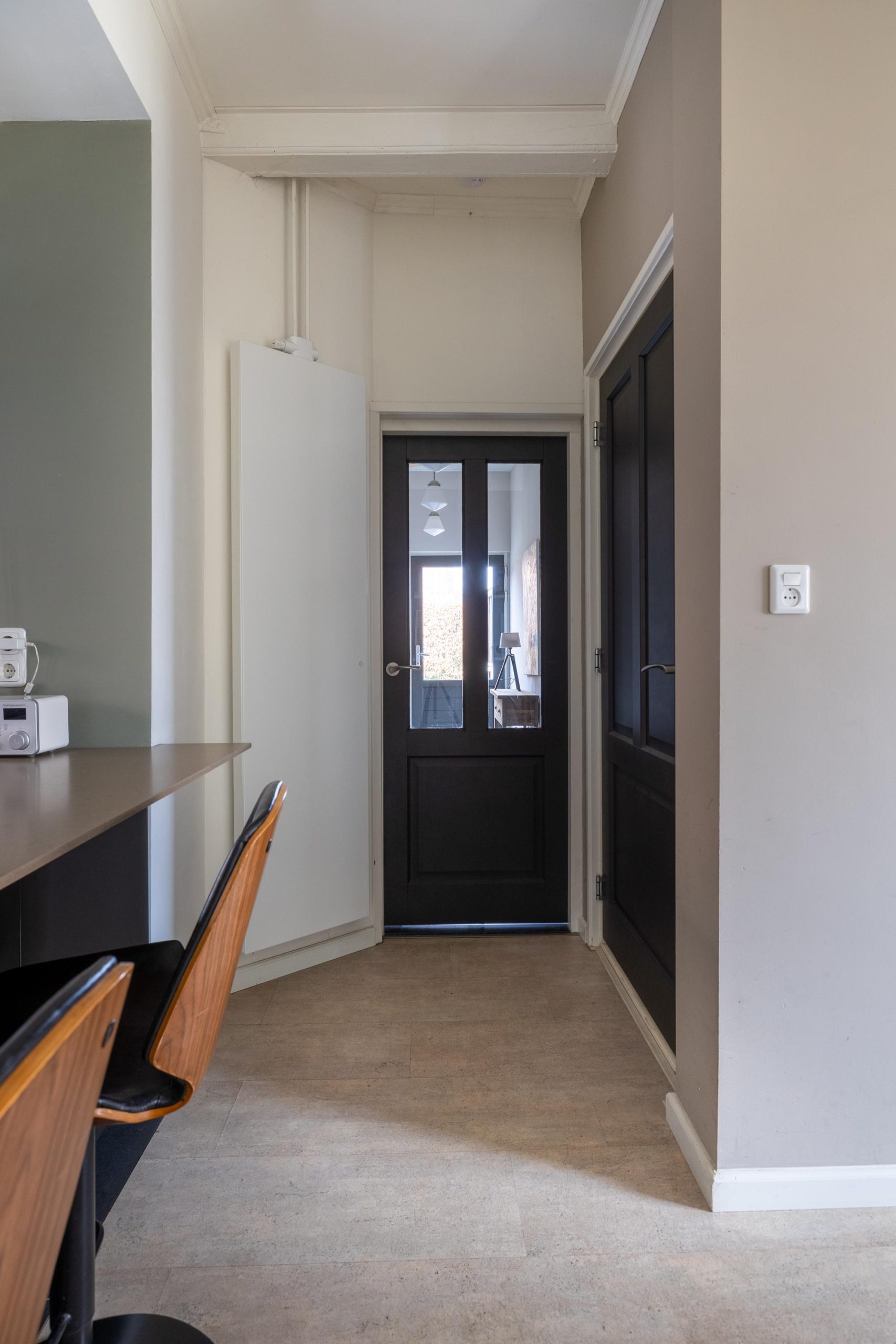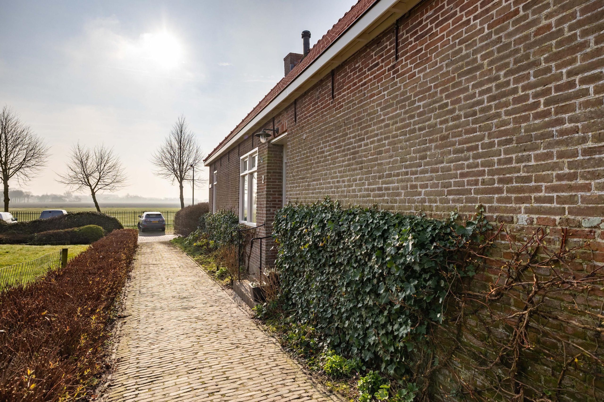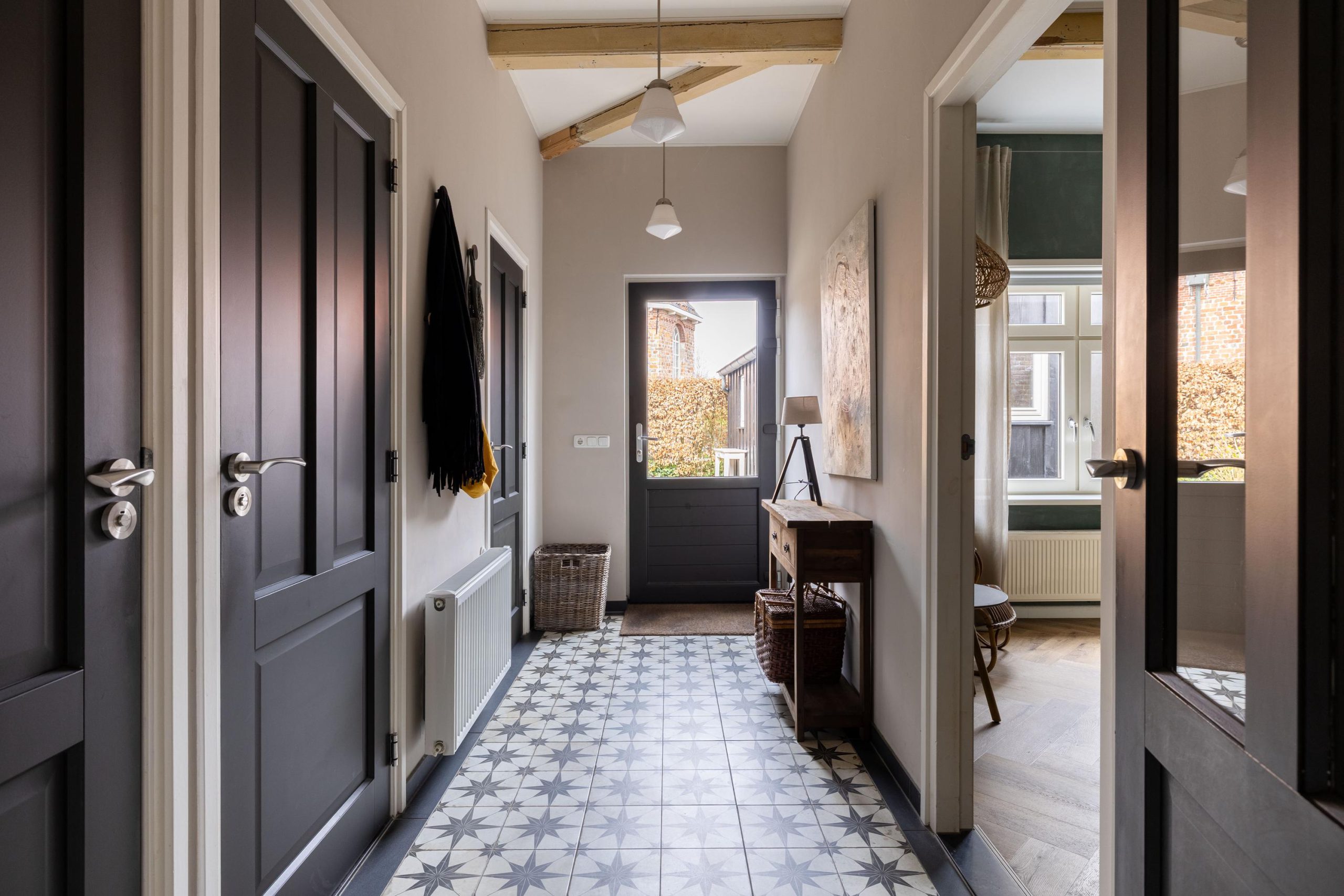 Aan de voorzijde word je direct verwelkomd door het vrije uitzicht en het verzorgde terras, een heerlijke plek om te zitten en te genieten van de rust en ruimte. Via de zijentree stap je vervolgens de woning binnen, waar de warme en stijlvolle afwerking je meteen opvalt. De zichtbare balken geven karakter, terwijl de en suite deuren zorgen voor een mooie, open verbinding tussen de verschillende leefruimtes.