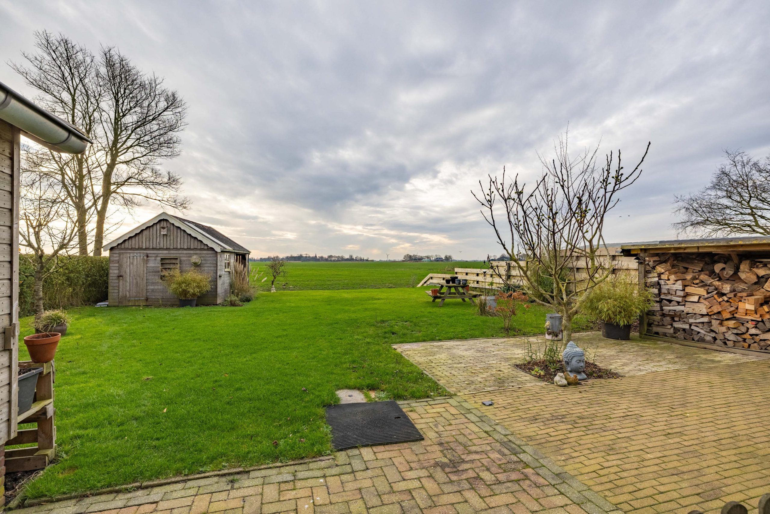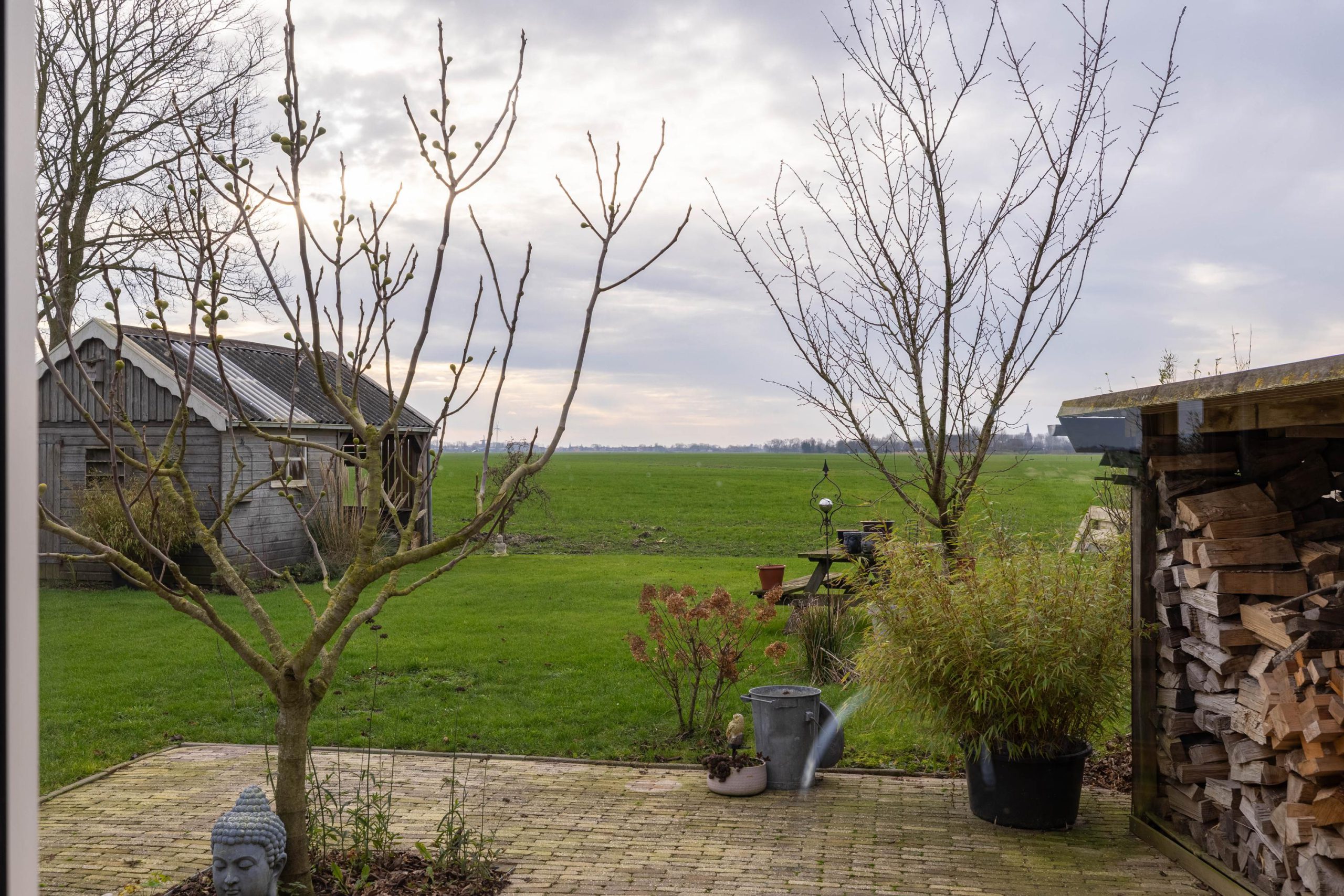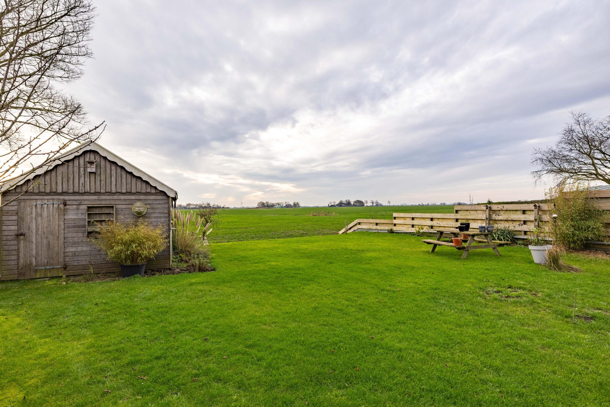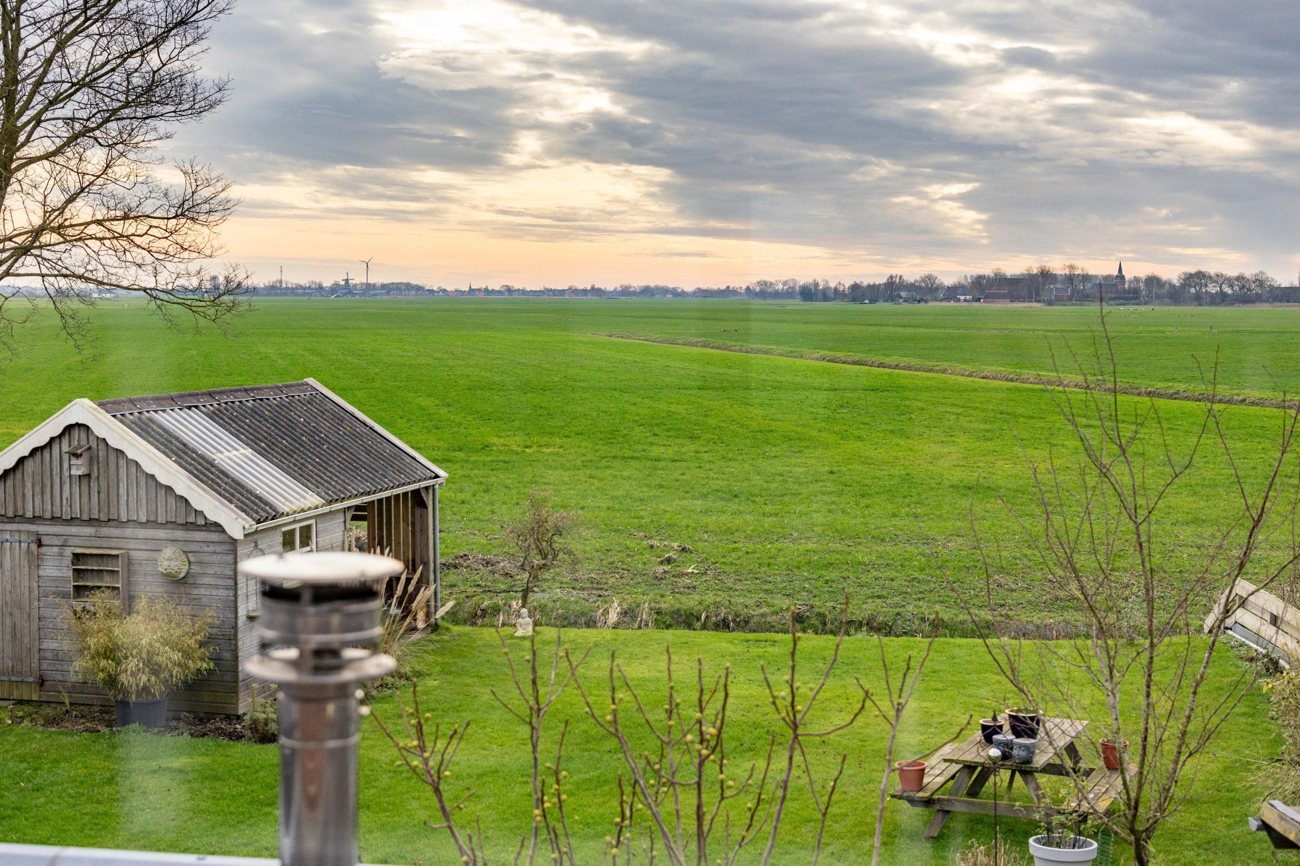 De tuin ligt rondom de woning, waardoor je op elk moment van de dag een zonnig plekje kunt vinden. Voor en achter kijk je vrij uit over de weilanden, een uitzicht dat nooit verveelt en elk seizoen weer anders is.