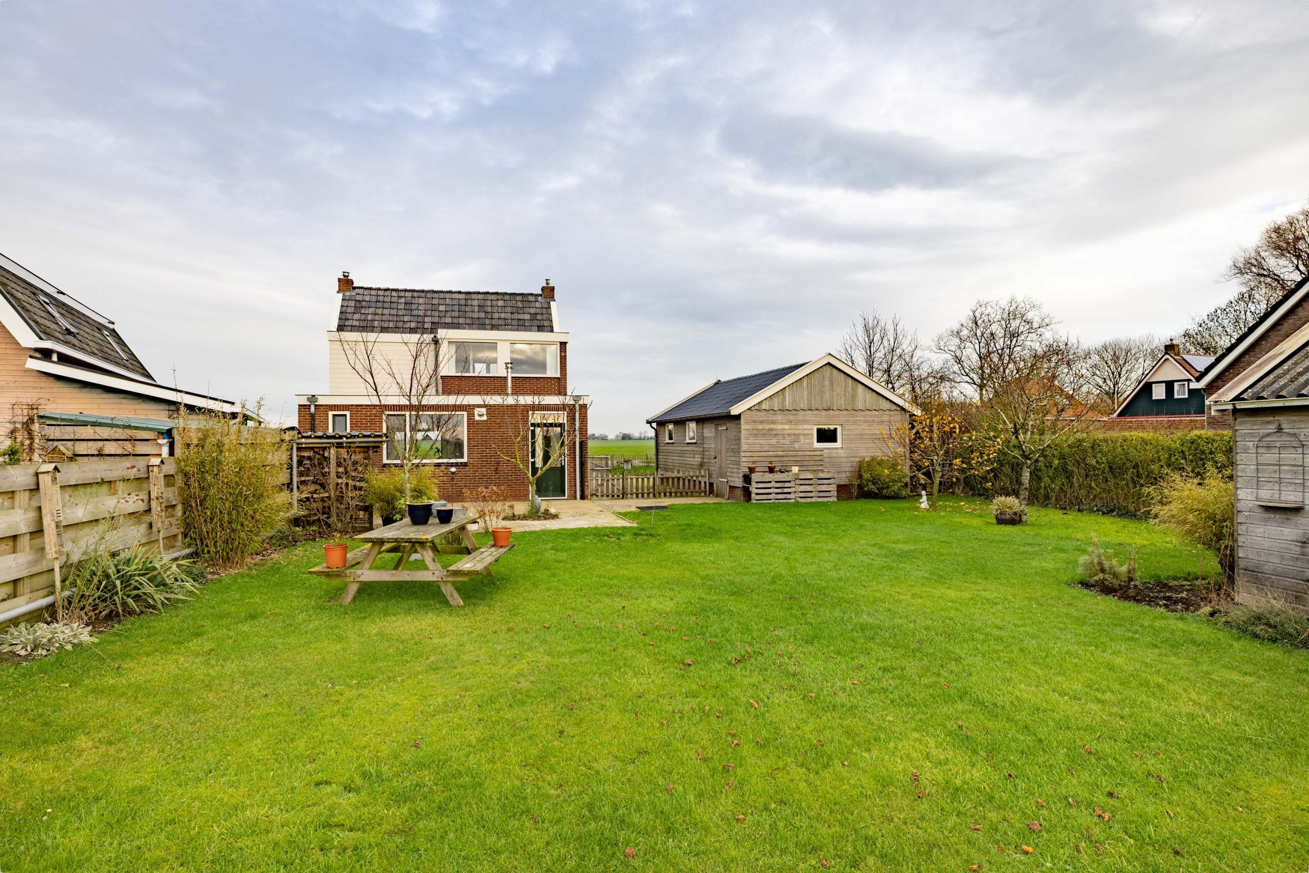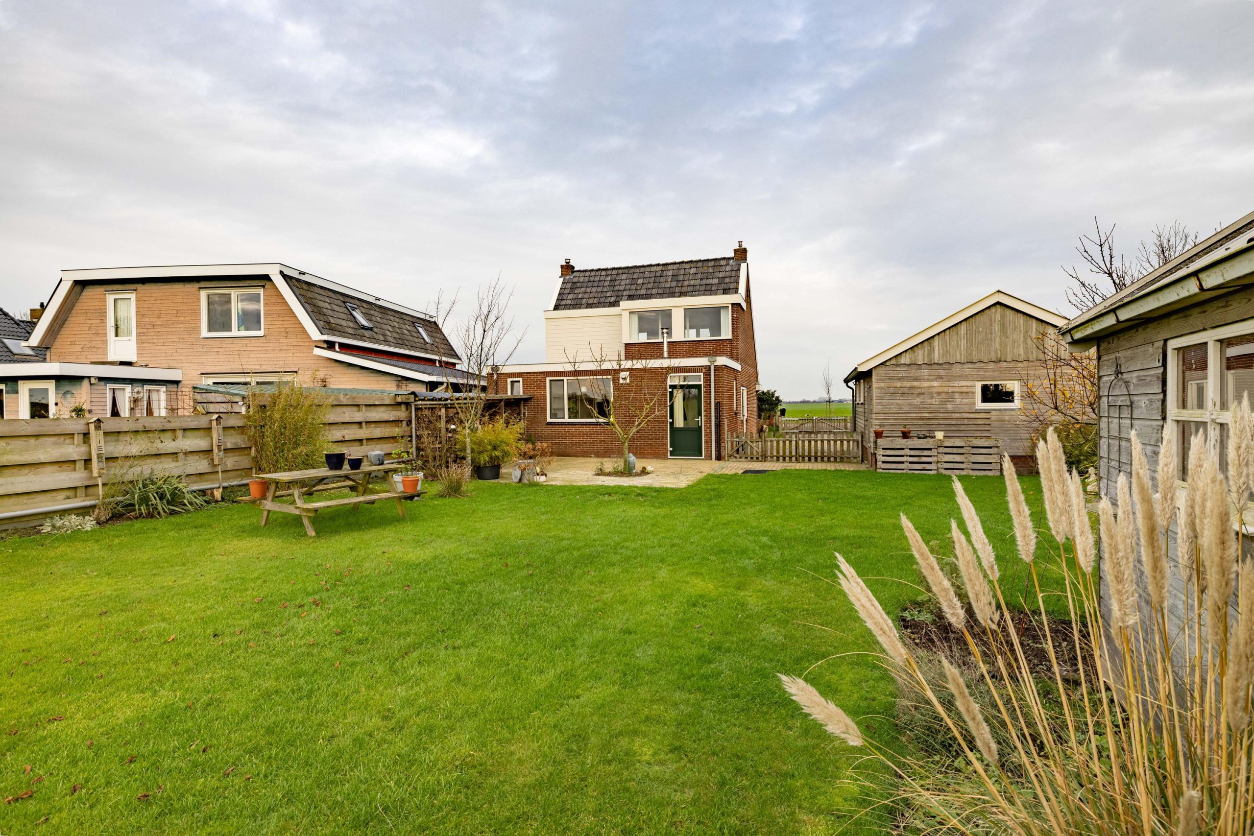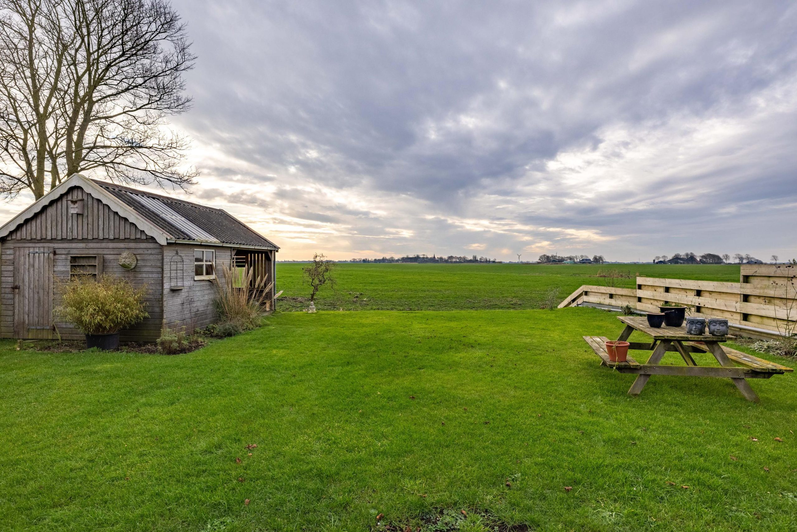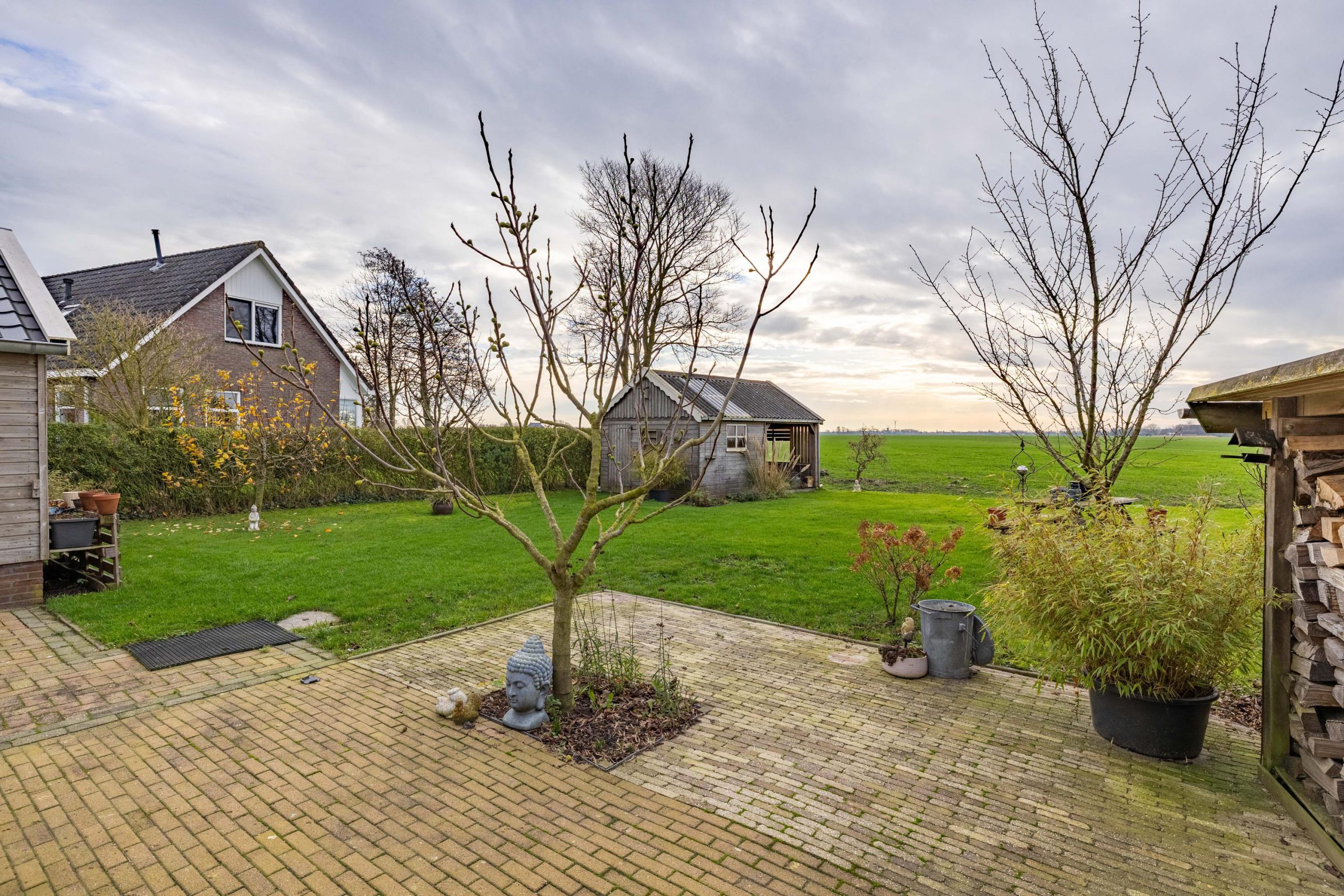 De tuin ligt rondom de woning, waardoor je op elk moment van de dag een zonnig plekje kunt vinden. Voor en achter kijk je vrij uit over de weilanden, een uitzicht dat nooit verveelt en elk seizoen weer anders is.