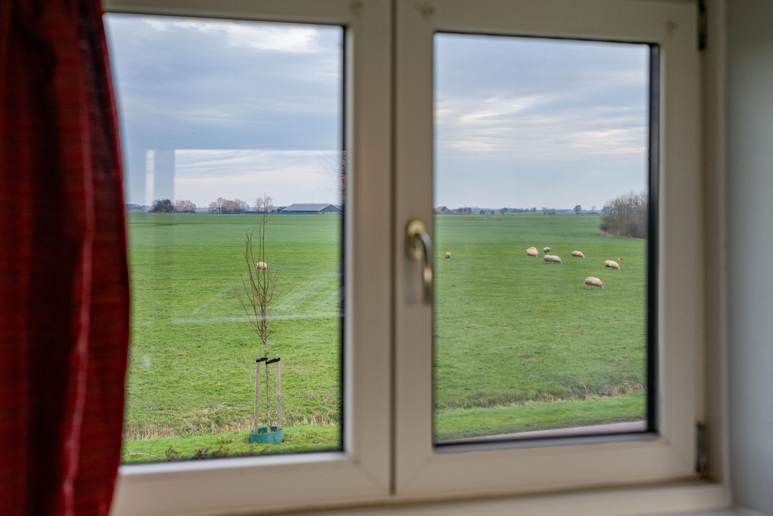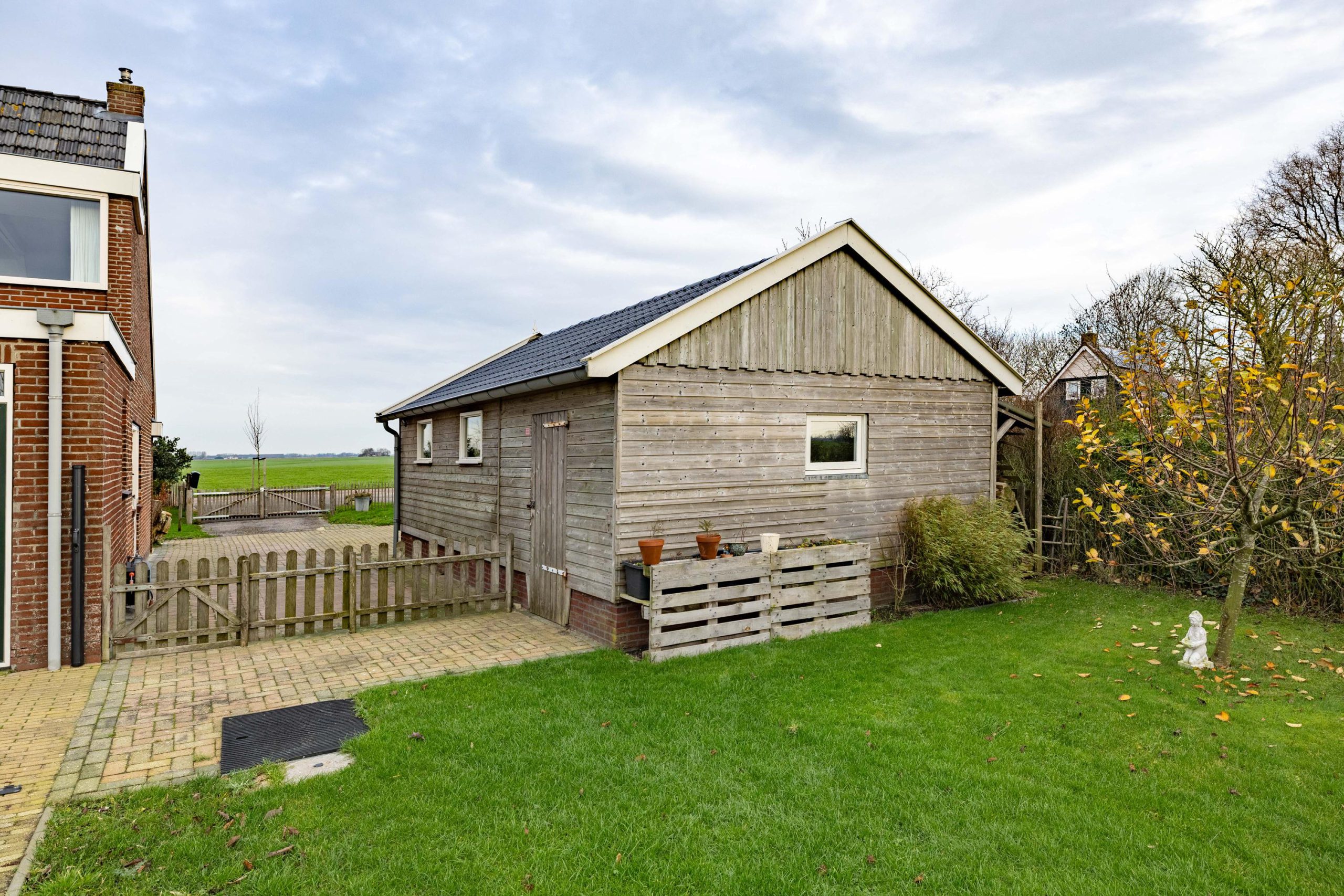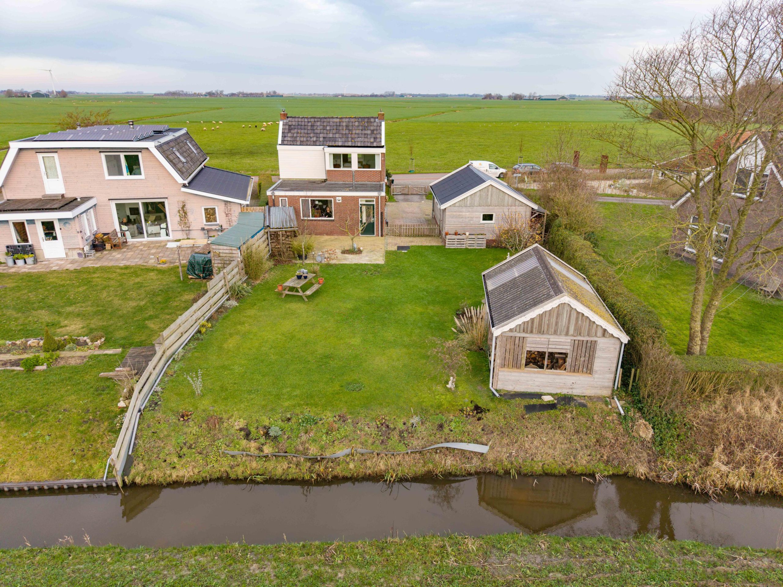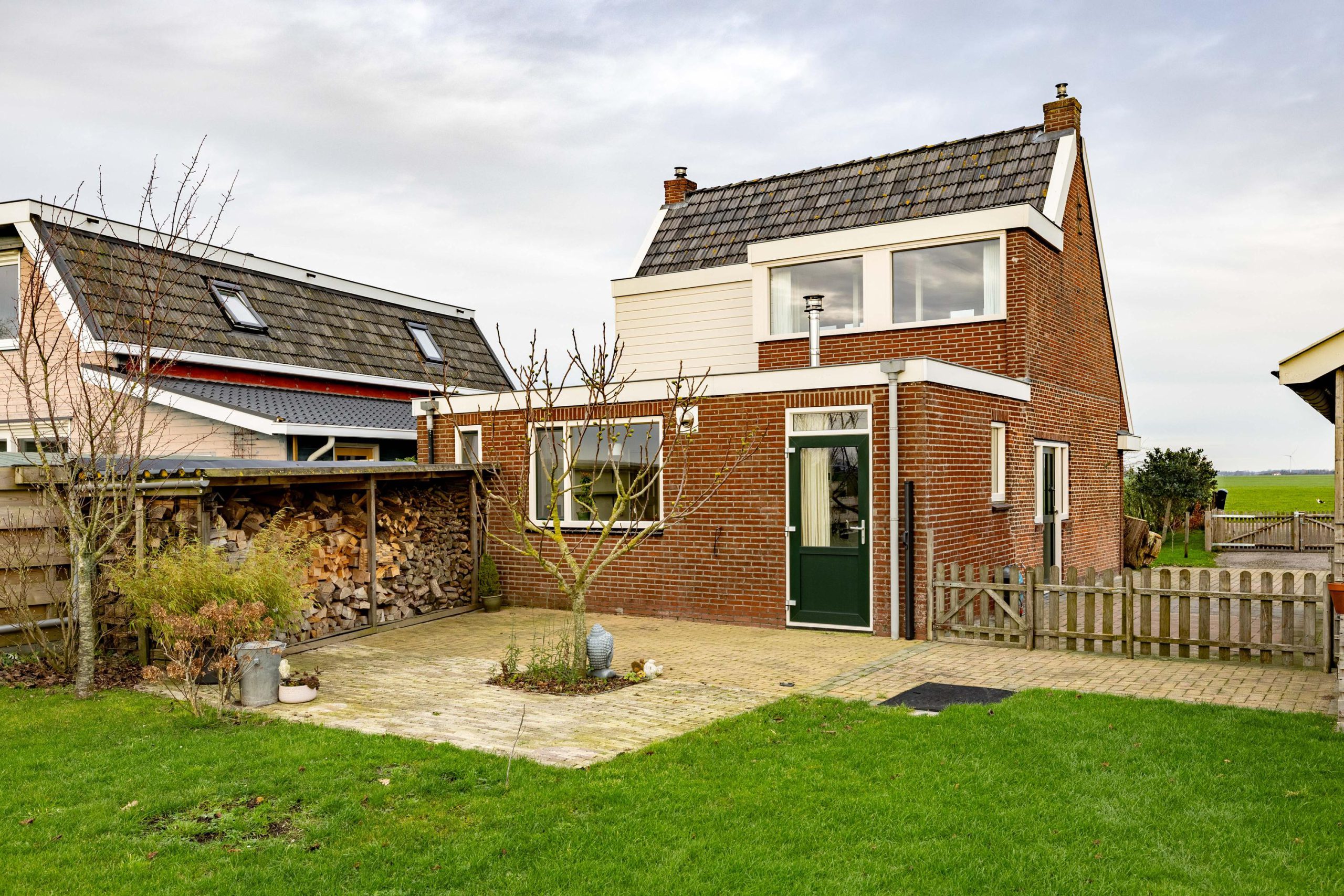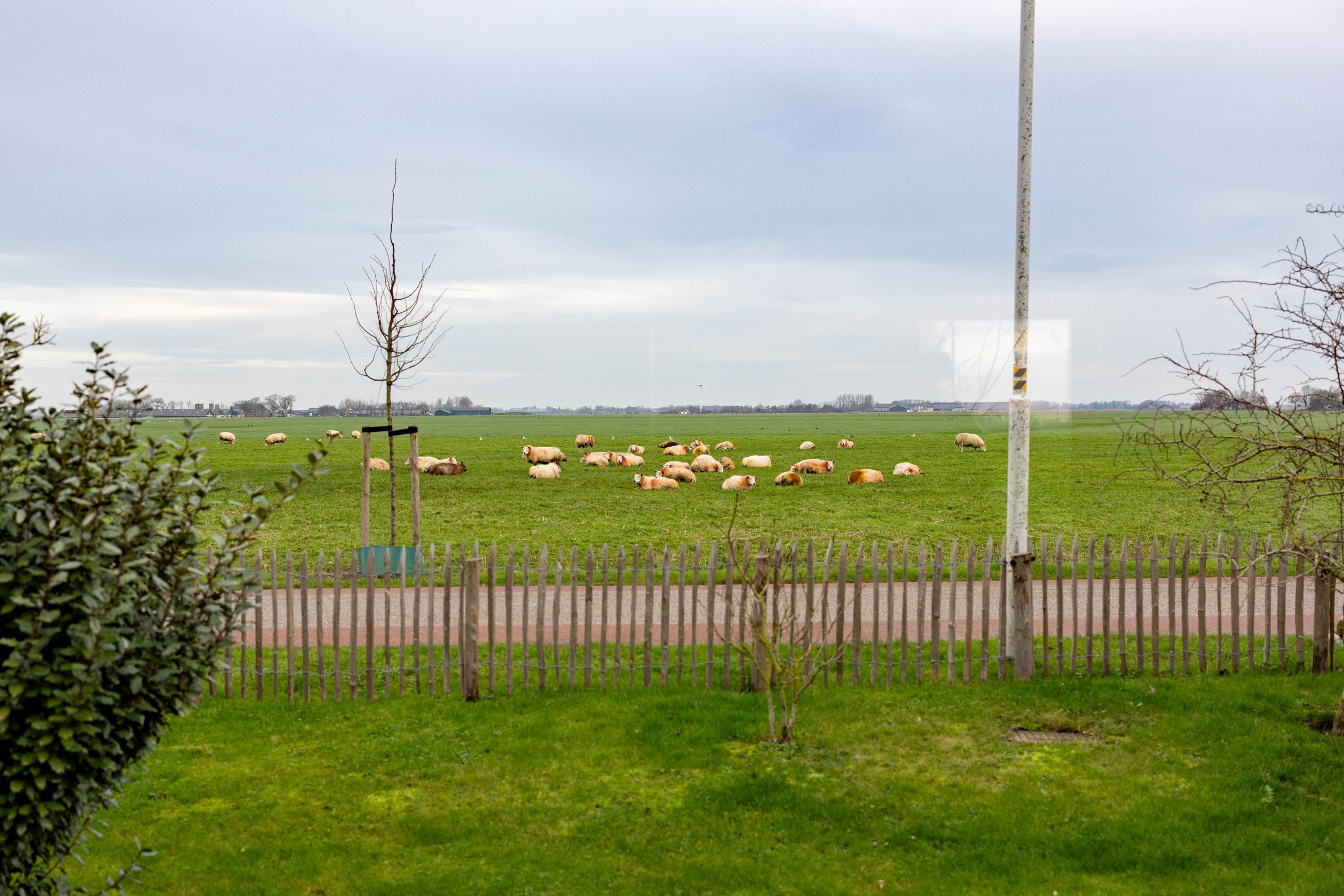 De tuin ligt rondom de woning, waardoor je op elk moment van de dag een zonnig plekje kunt vinden. Voor en achter kijk je vrij uit over de weilanden, een uitzicht dat nooit verveelt en elk seizoen weer anders is.