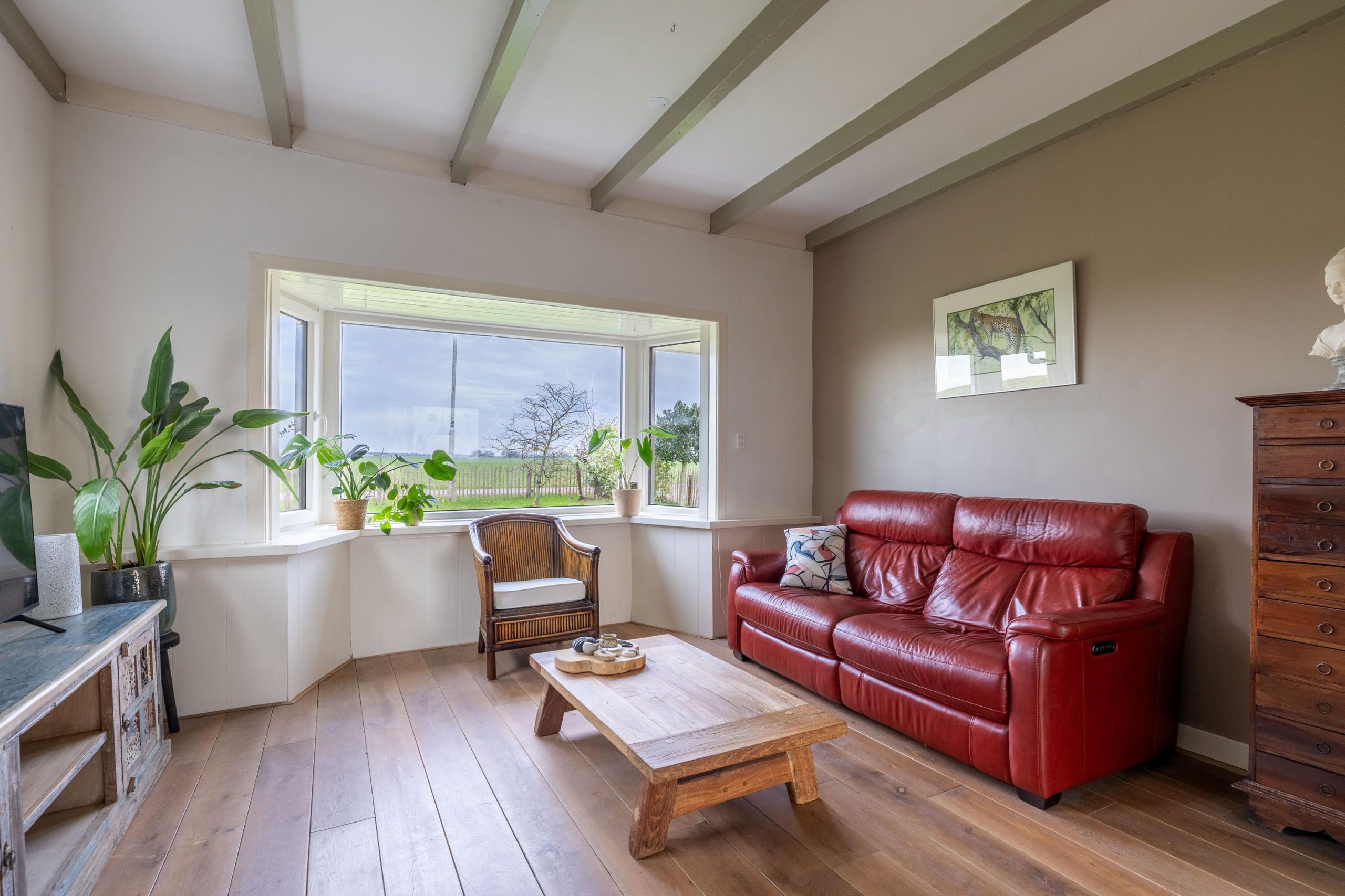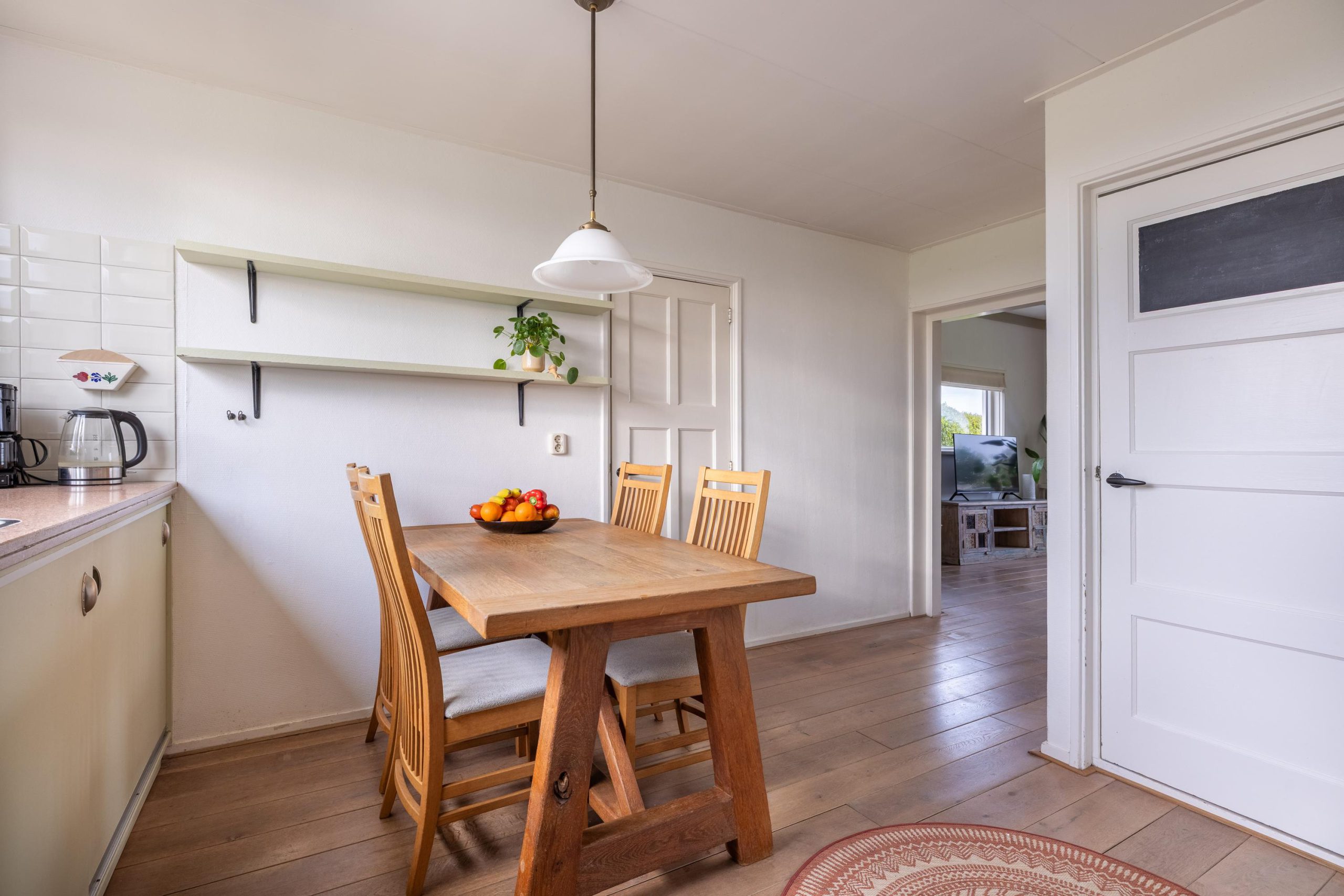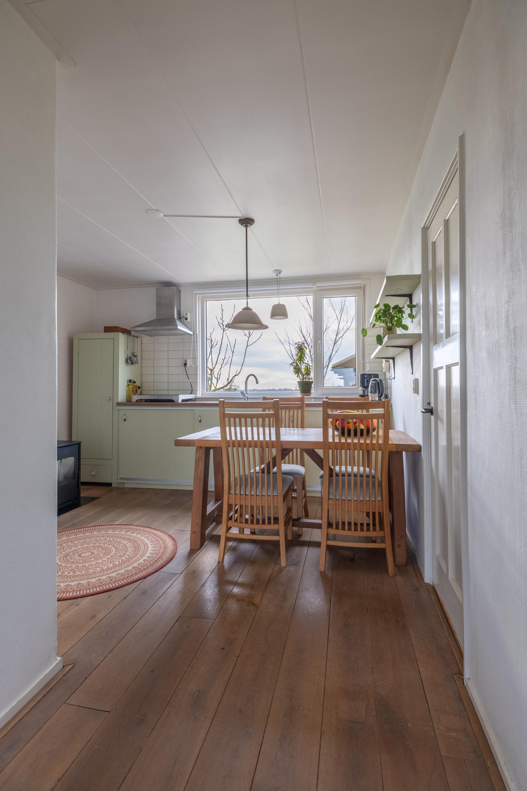 Bij binnenkomst voel je direct de ontspannen sfeer van het huis. De woonkamer en keuken vormen samen een fijne leefruimte waar het daglicht royaal naar binnen valt en waar je altijd contact hebt met buiten. Of je nu aan de keukentafel zit of op de bank, het uitzicht is altijd onderdeel van het wonen.