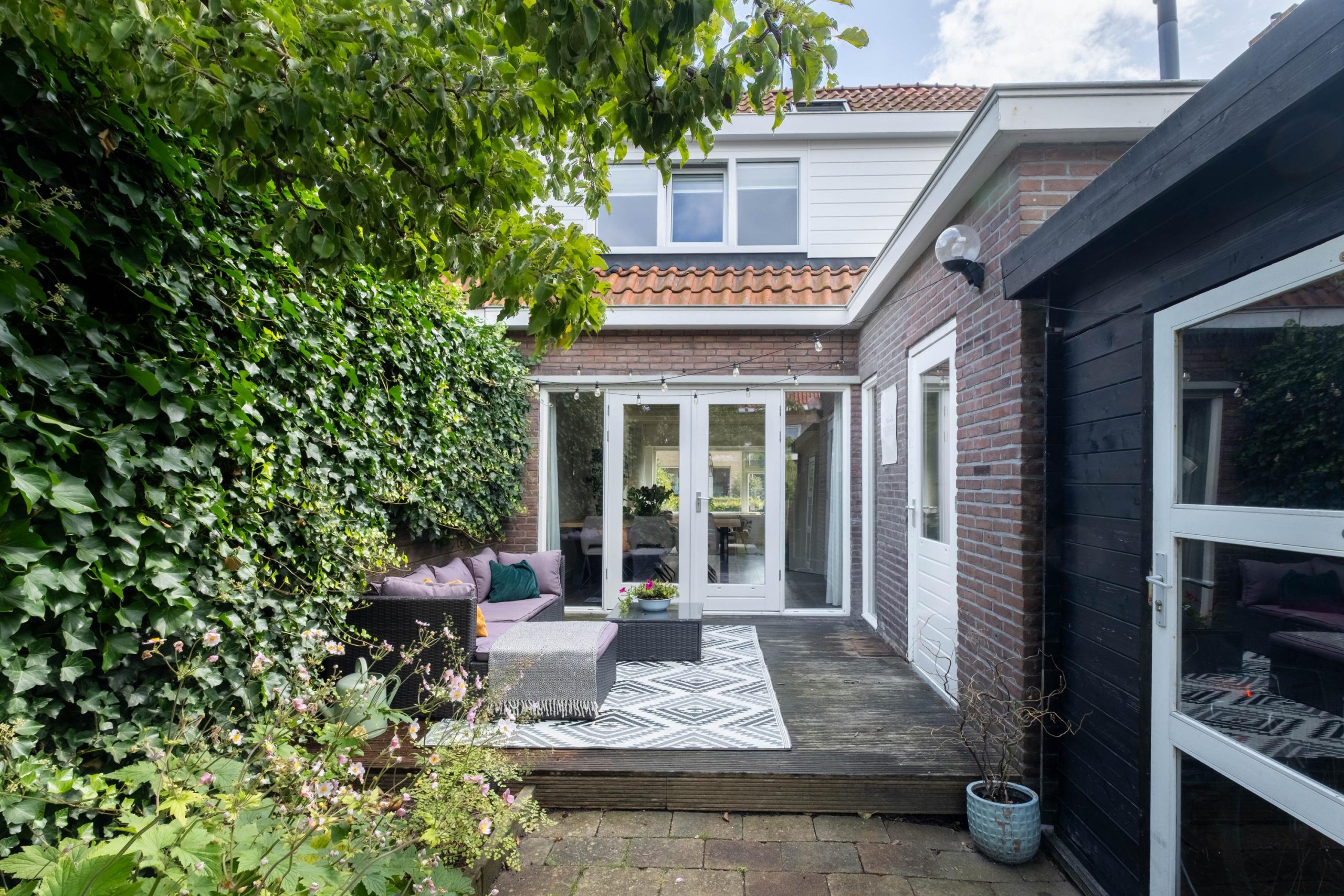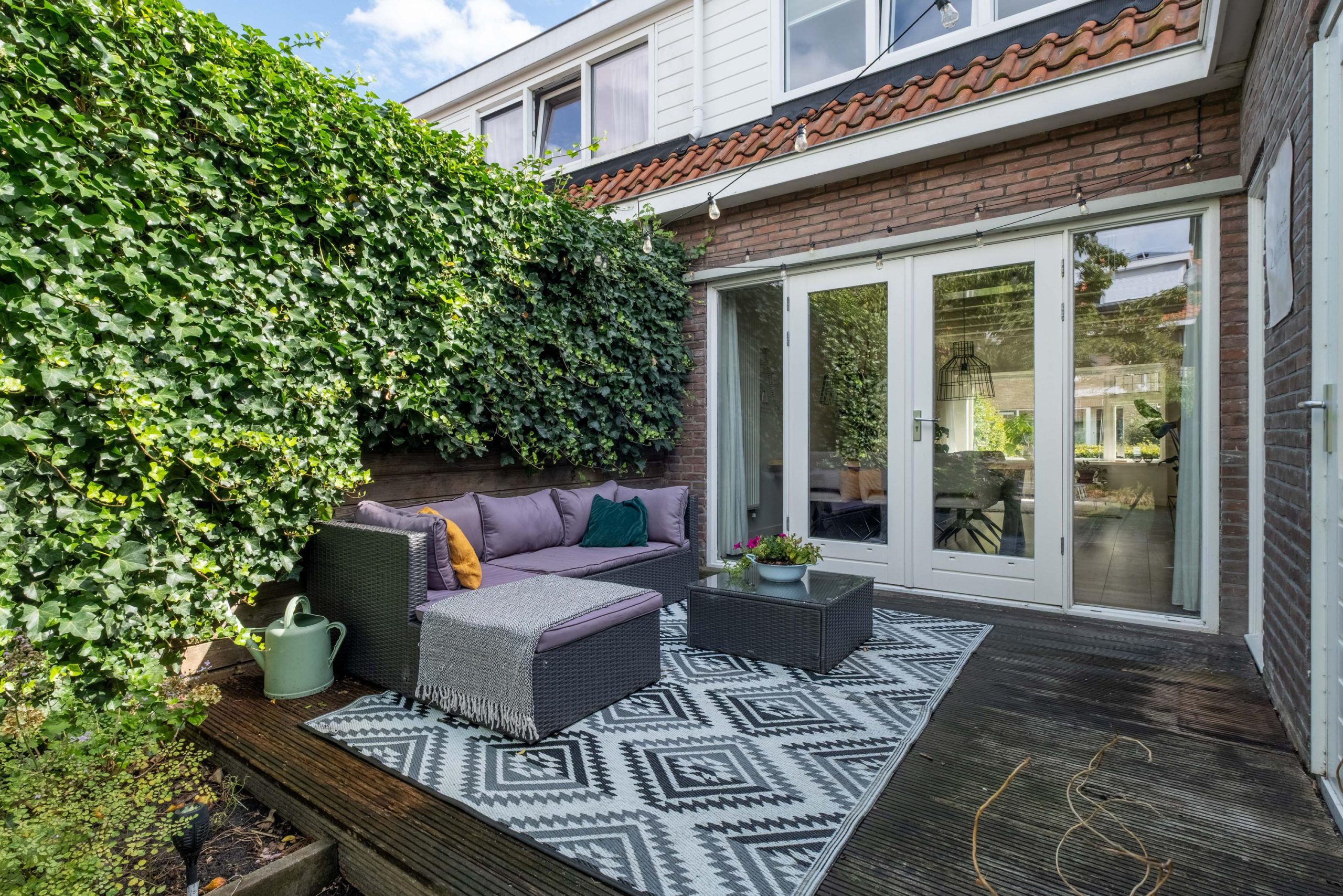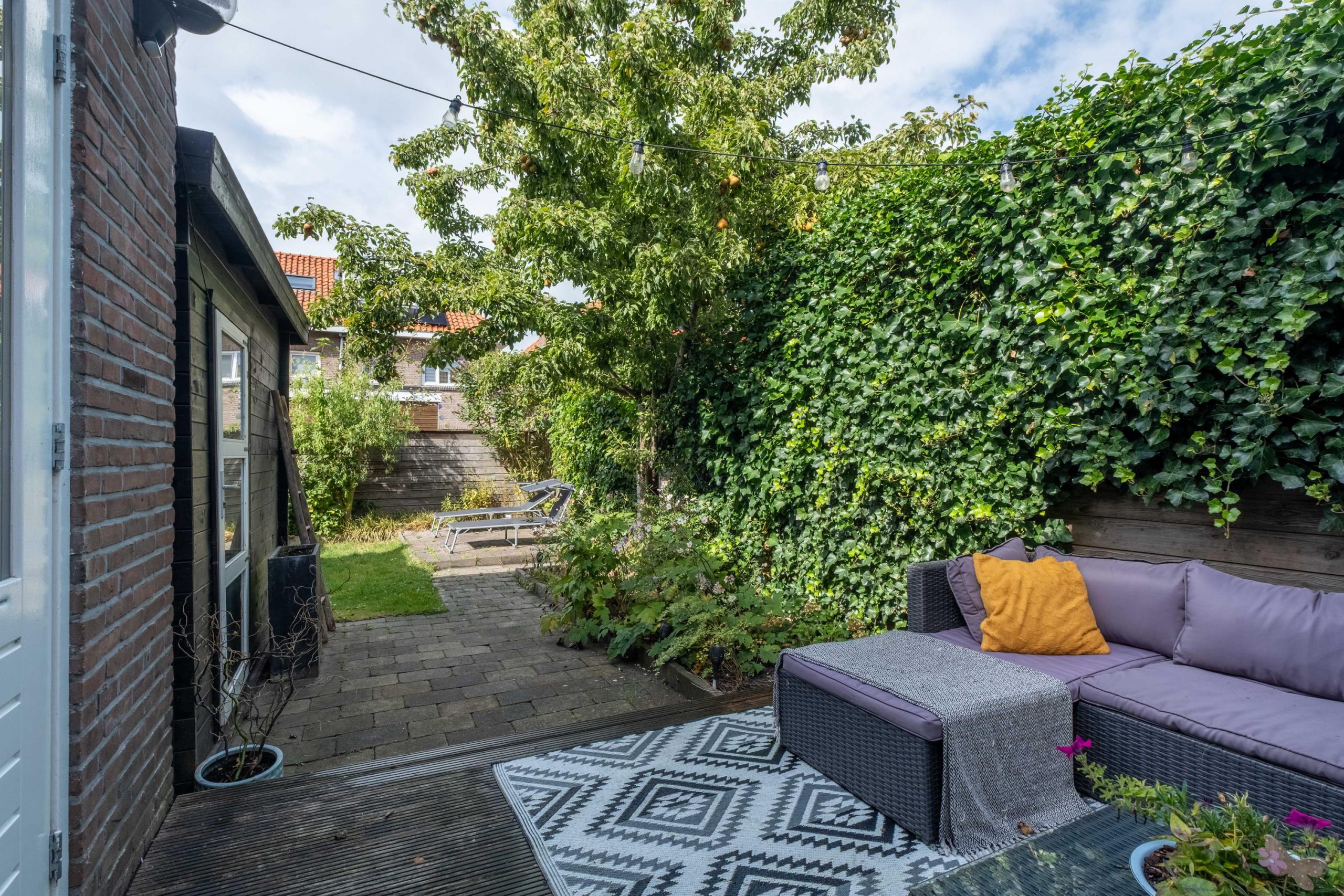 De tuin is overzichtelijk en gezellig ingericht. Dankzij de openslaande deuren loopt binnen en buiten hier heerlijk in elkaar over. Een fijne plek om te tafelen of gewoon te ontspannen in de zon.