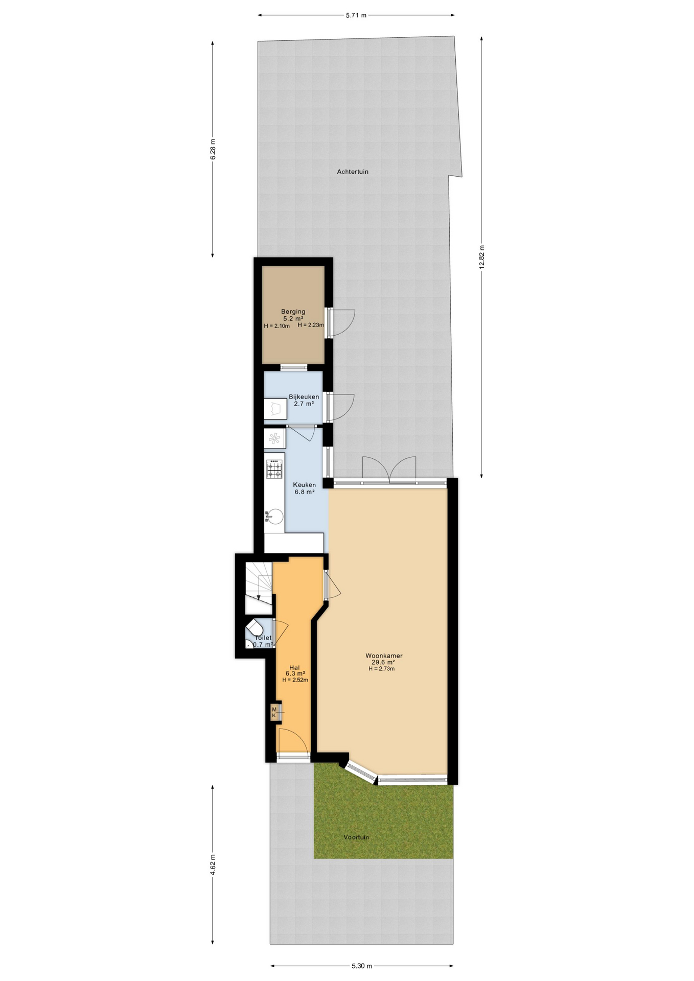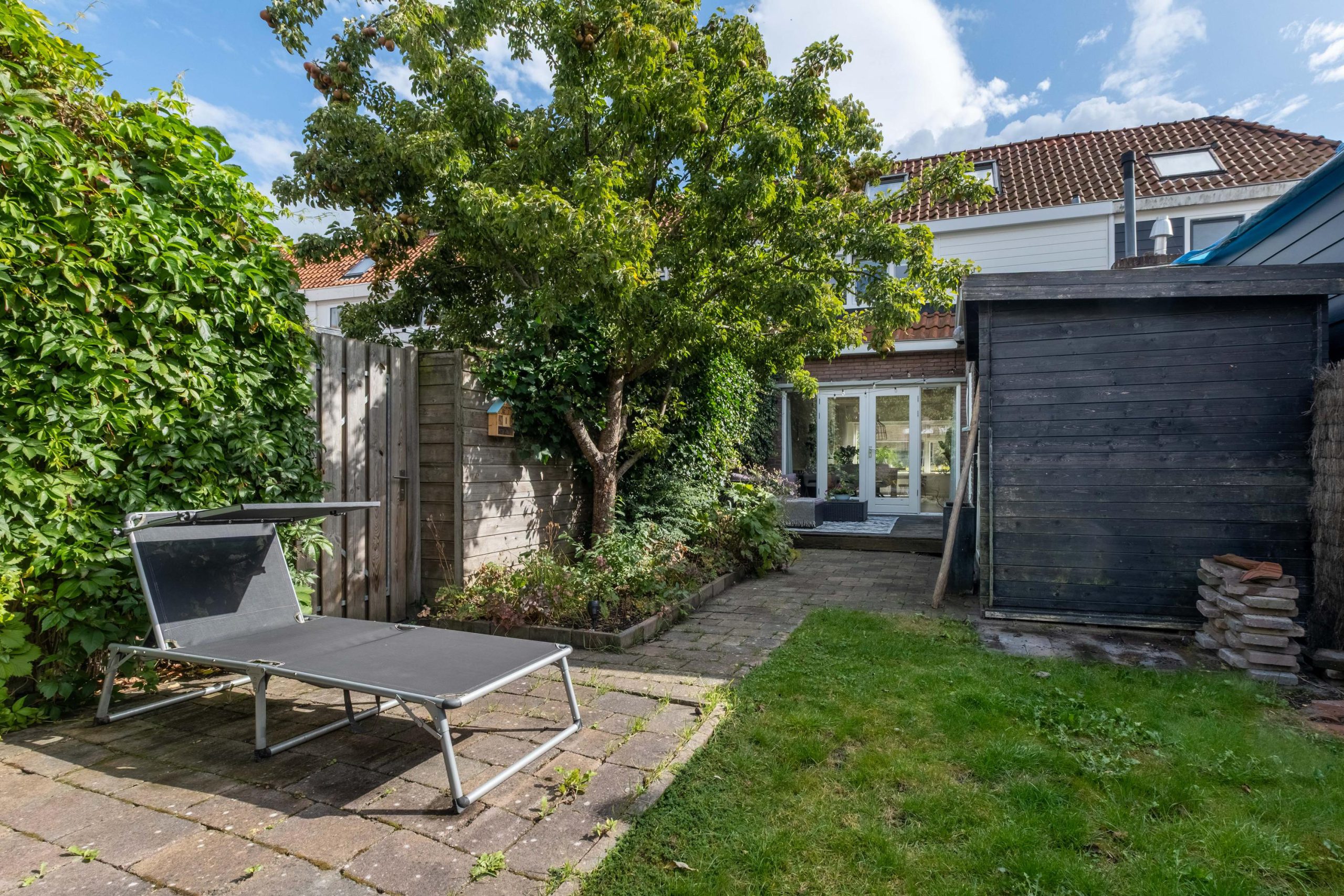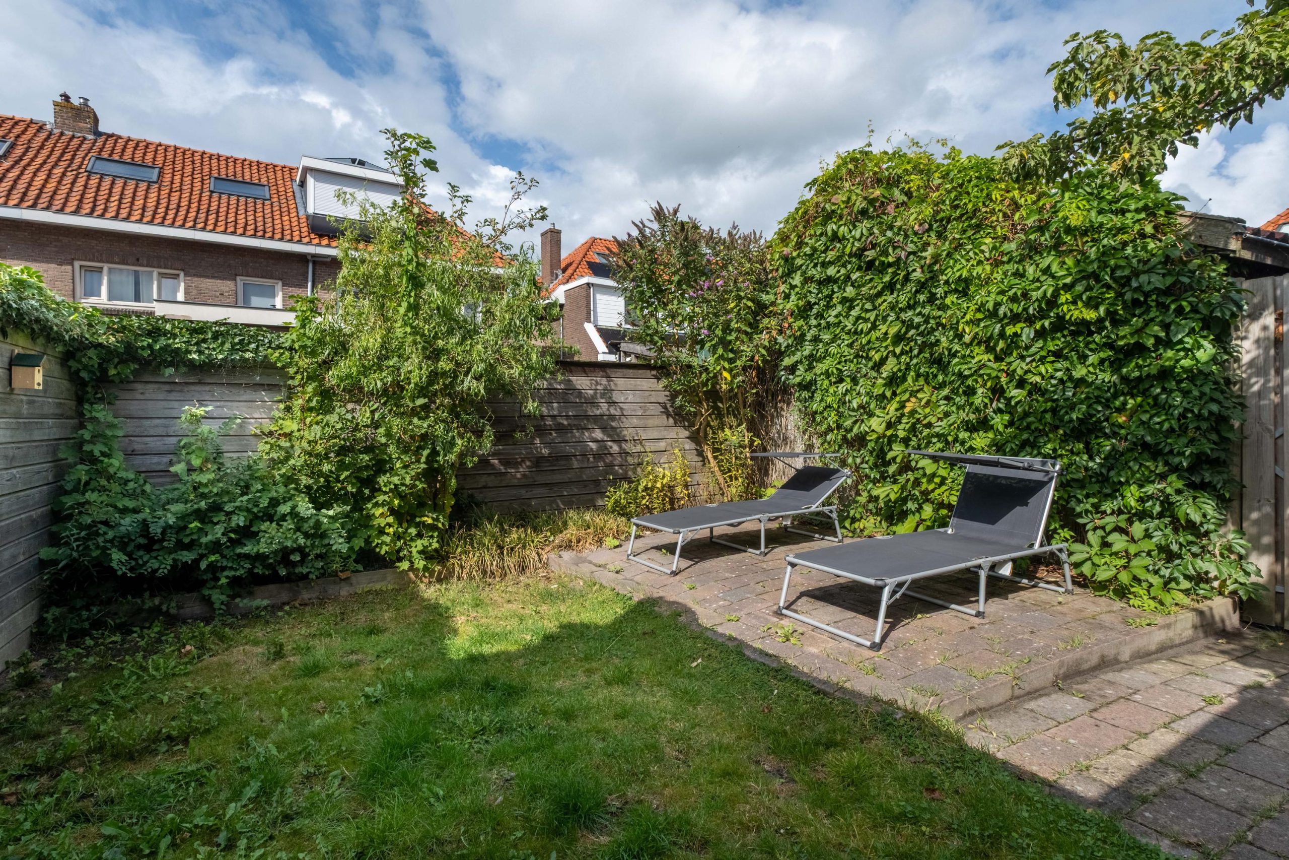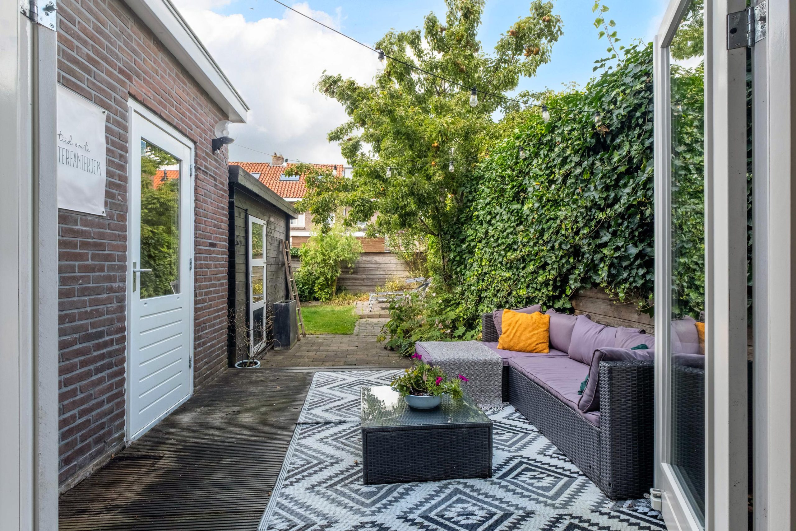 De tuin is overzichtelijk en gezellig ingericht. Dankzij de openslaande deuren loopt binnen en buiten hier heerlijk in elkaar over. Een fijne plek om te tafelen of gewoon te ontspannen in de zon.