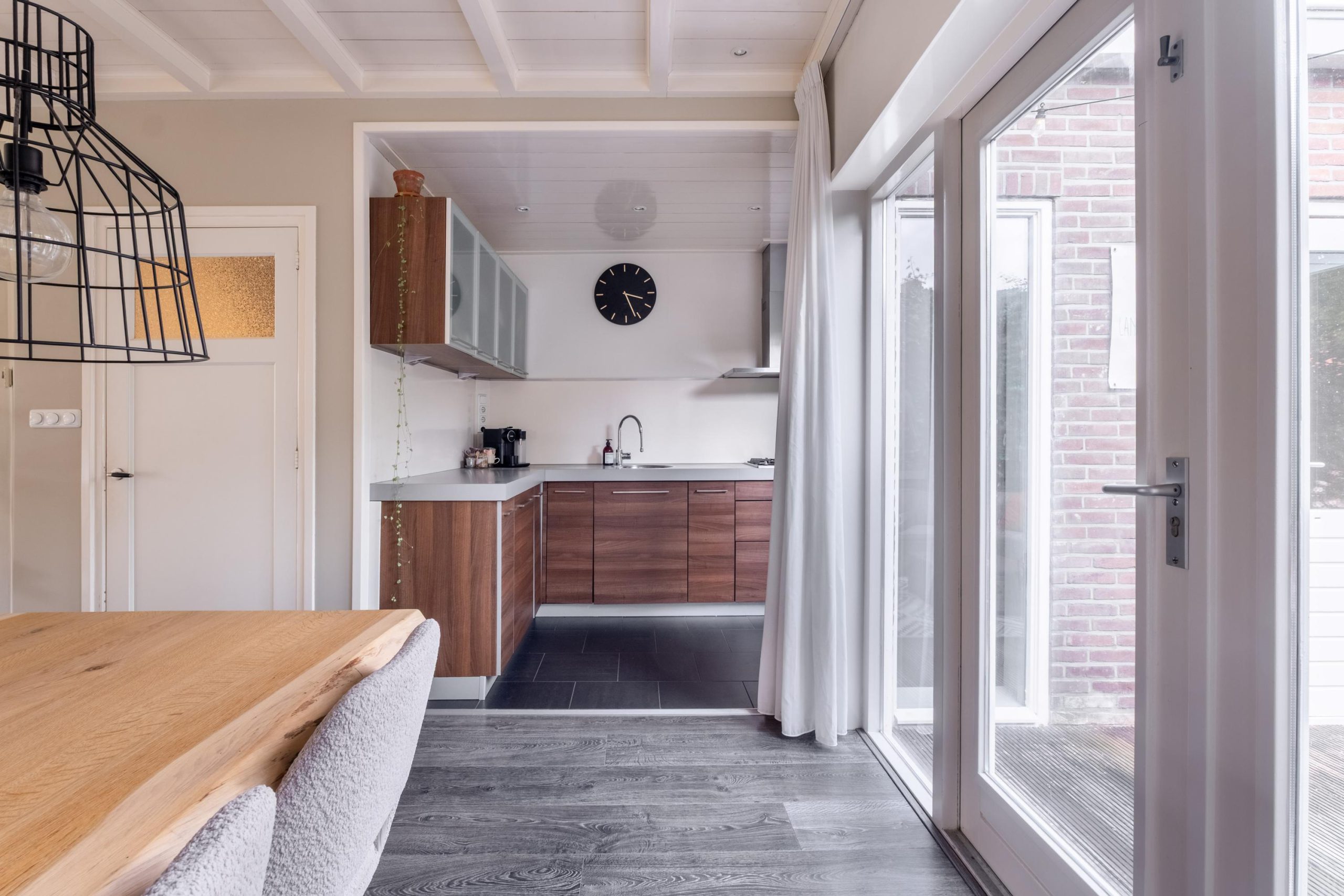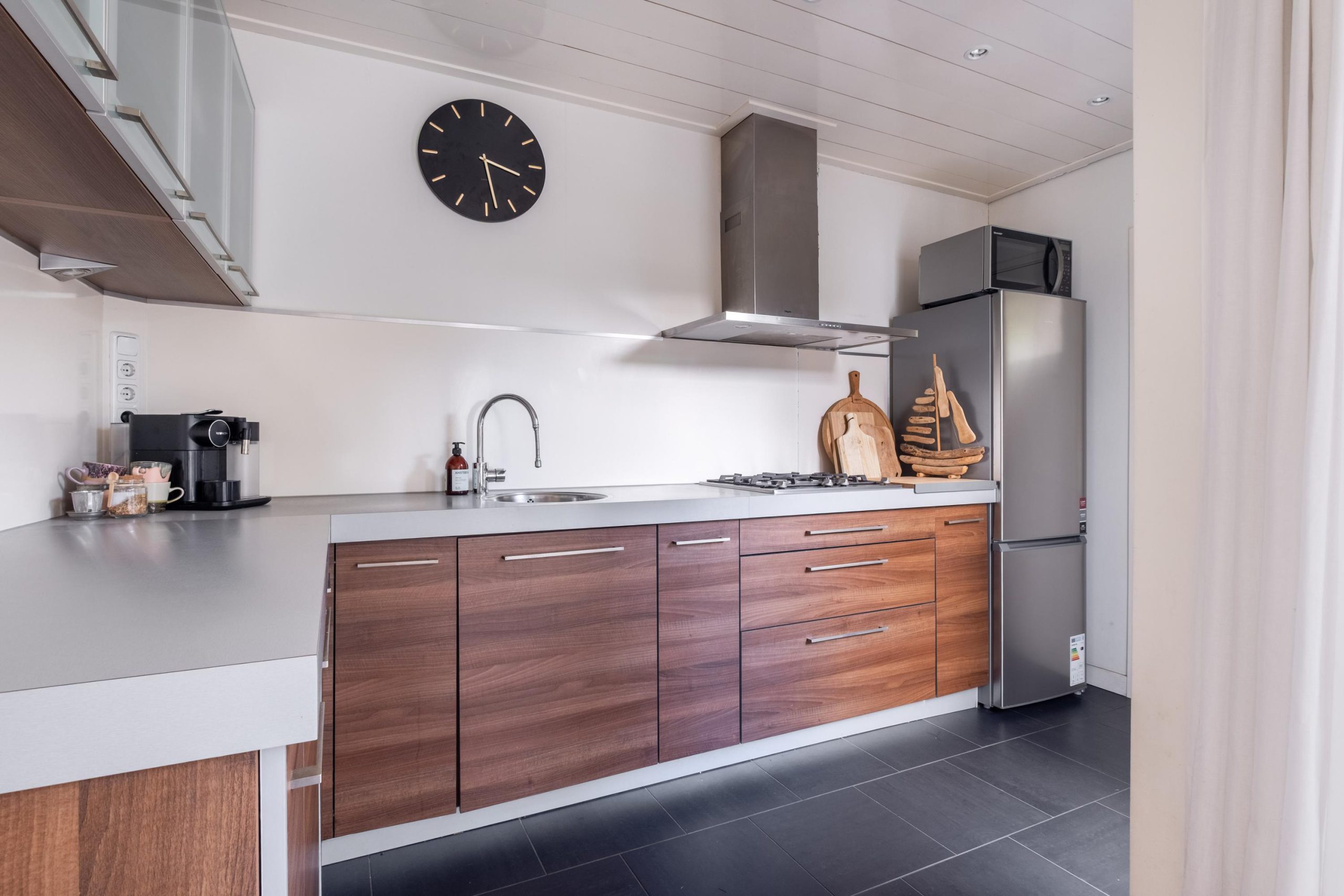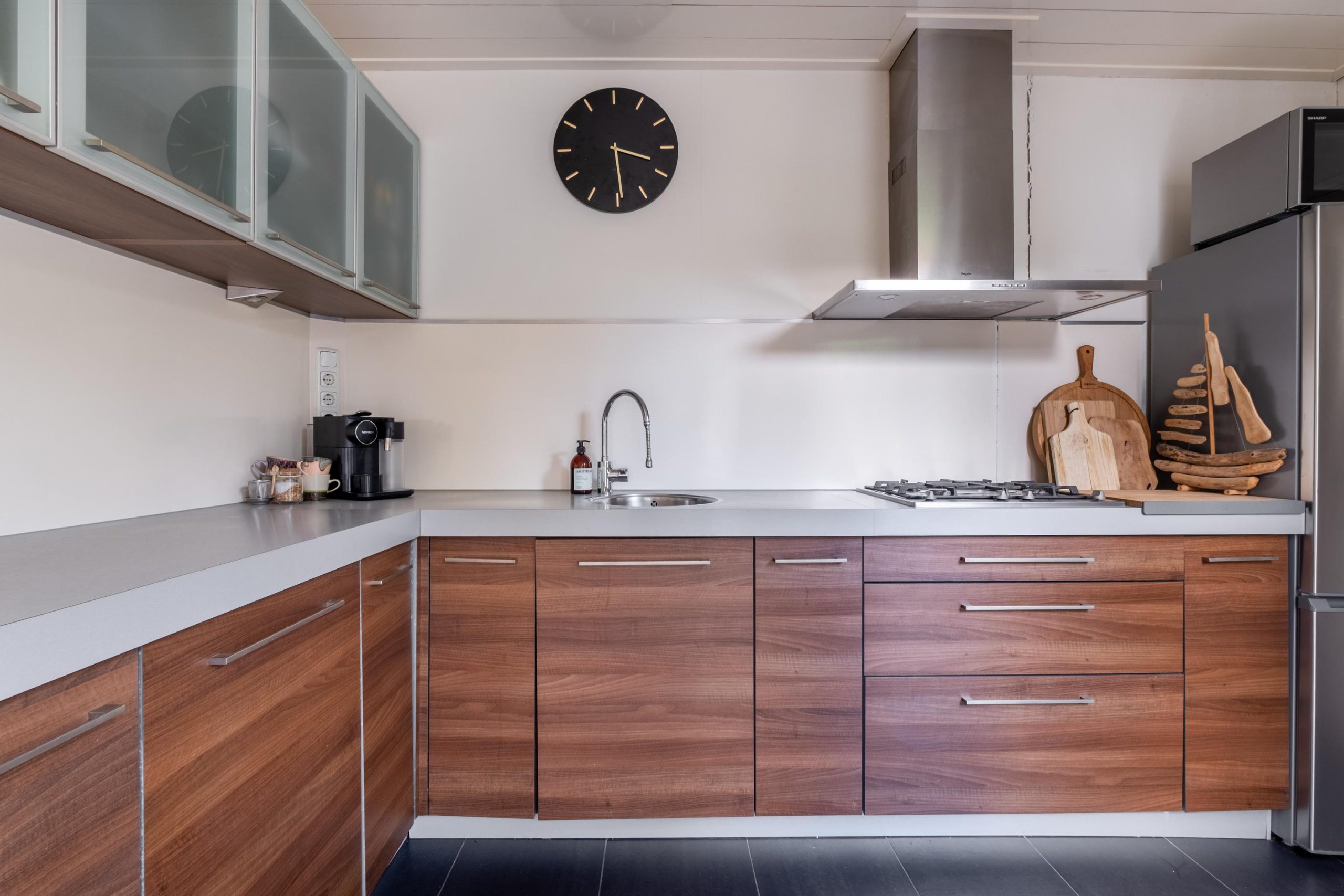De keuken is praktisch en behaaglijk. Met de elektrische vloerverwarming is het hier altijd aangenaam, zelfs op koude dagen. De openstaande deuren verbinden de keuken op een mooie manier met de achtertuin- perfect om 's zomers met een kop koffie of glas wijn buiten te genieten.